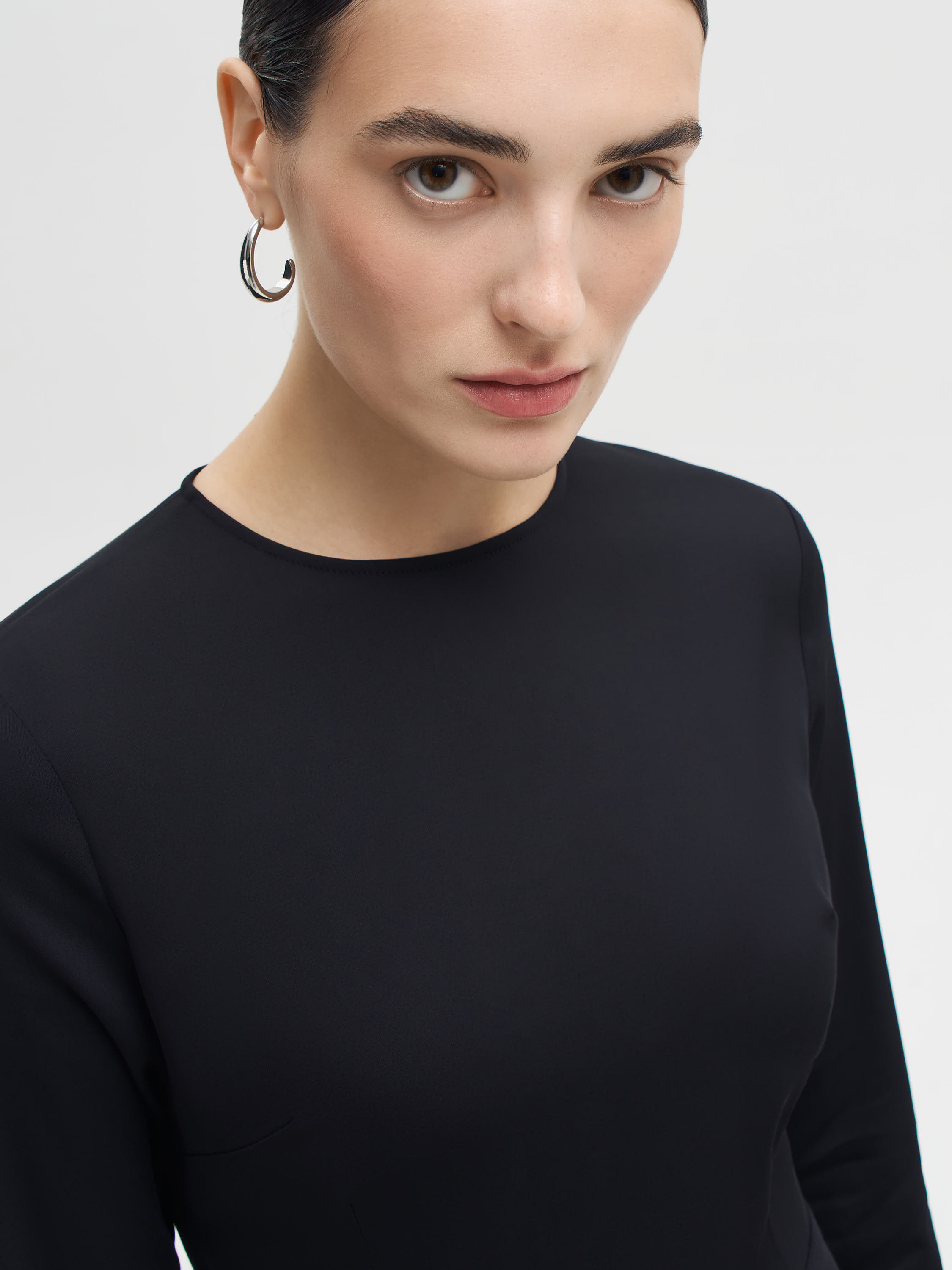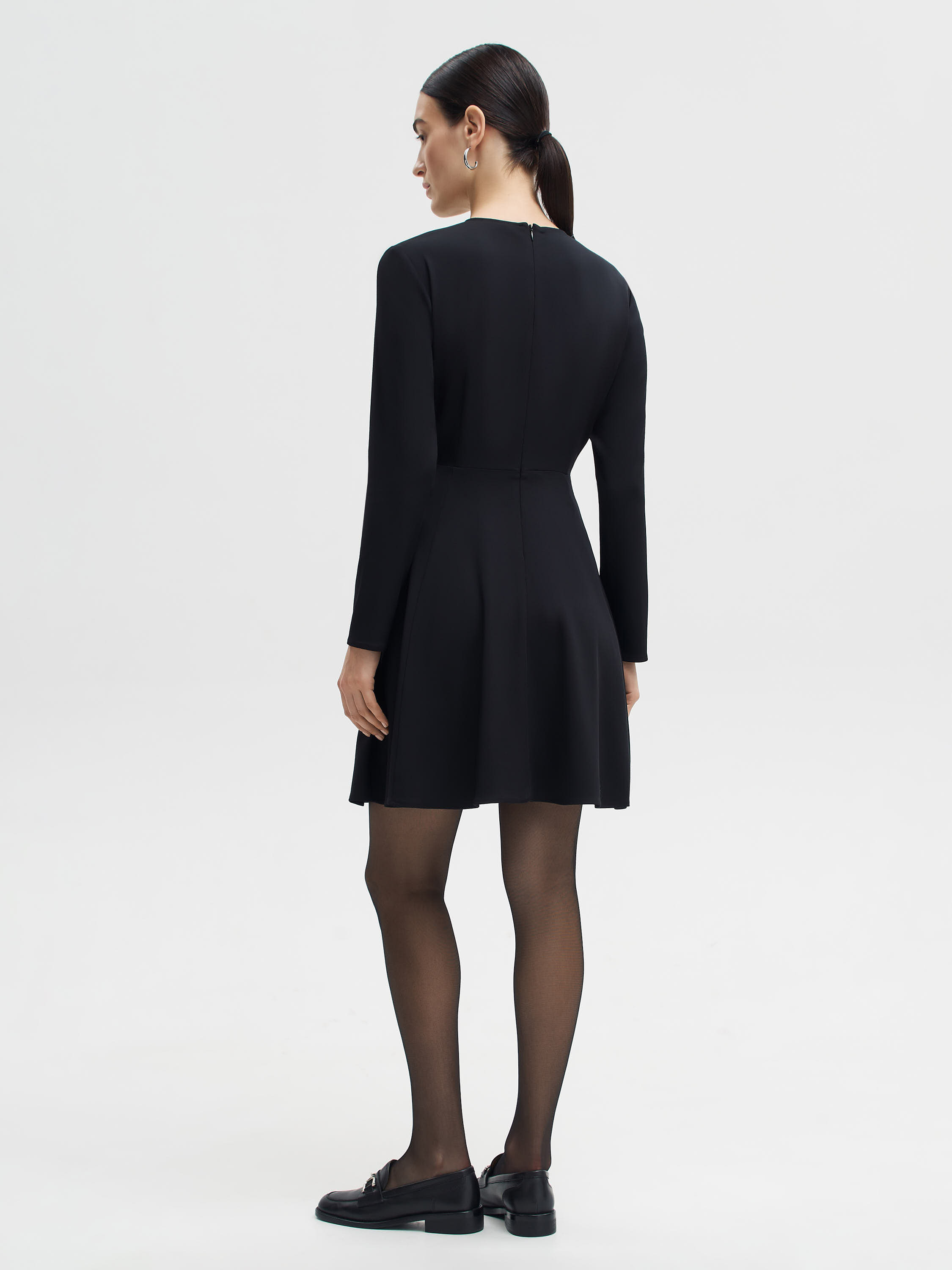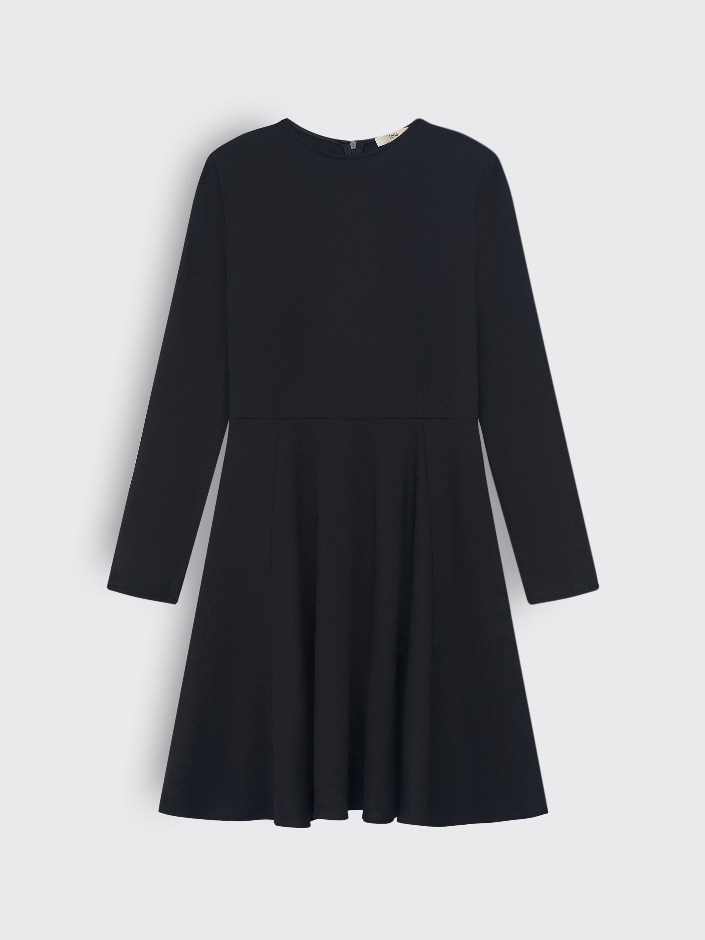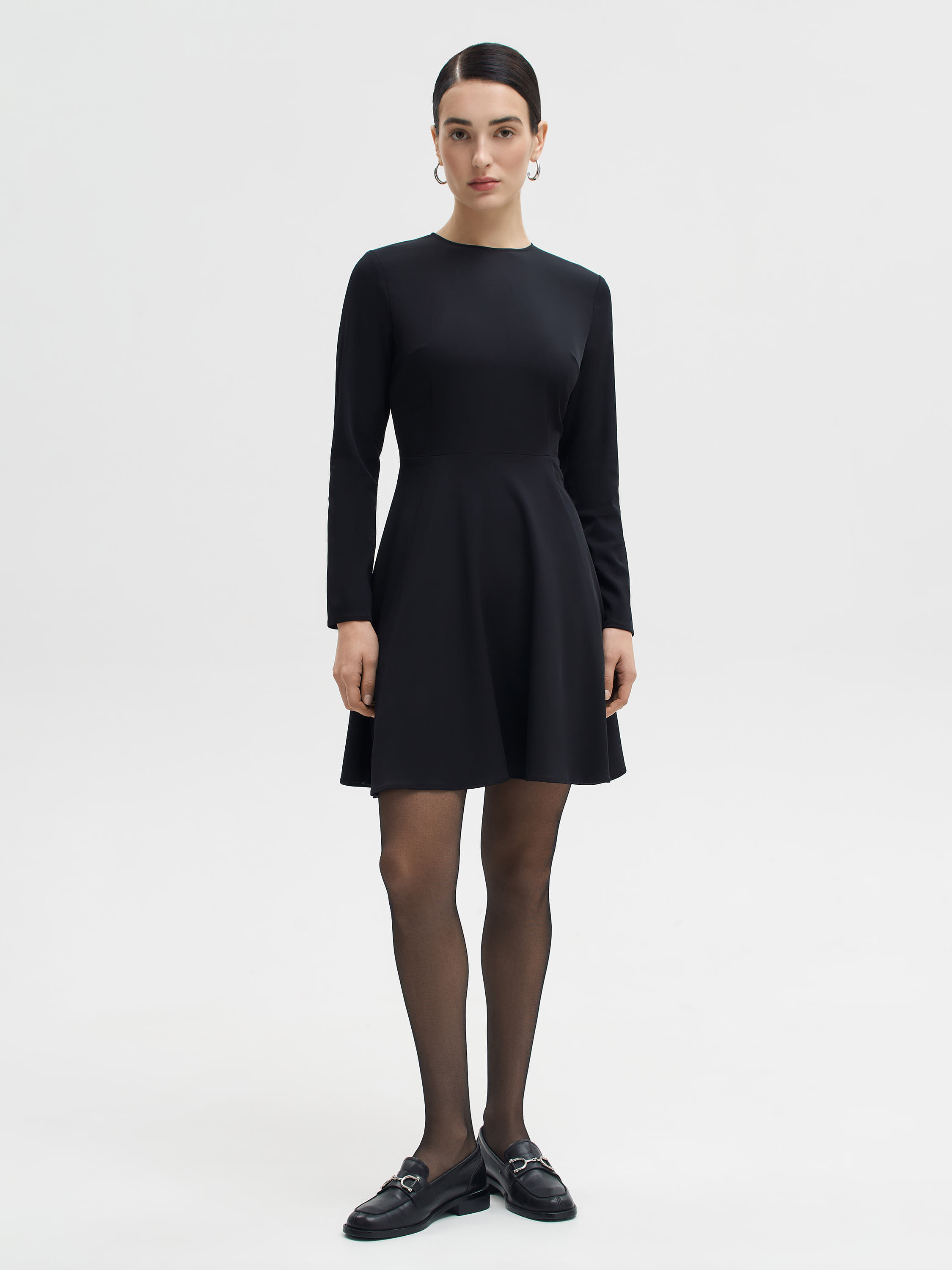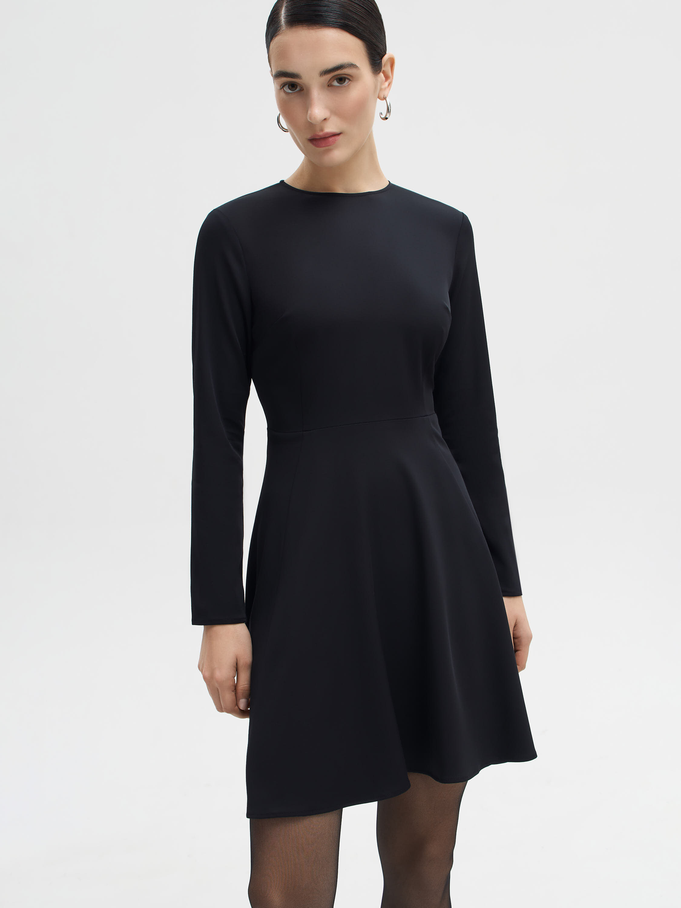 Платье мини из смесового полотна с добавлением шерсти. Модель выполнена в лаконичном силуэте с длинными рукавами и круглым вырезом, мягко подчеркивающим линию плеч. Благодаря пластичной ткани платье комфортно в движении, сохраняет форму и тактильное тепло. Легкий расклешенный низ создает чистый, женственный силуэт, который можно адаптировать под разный характер образа — от повседневного с лоферами до более собранного с жакетом или высоким сапогом.