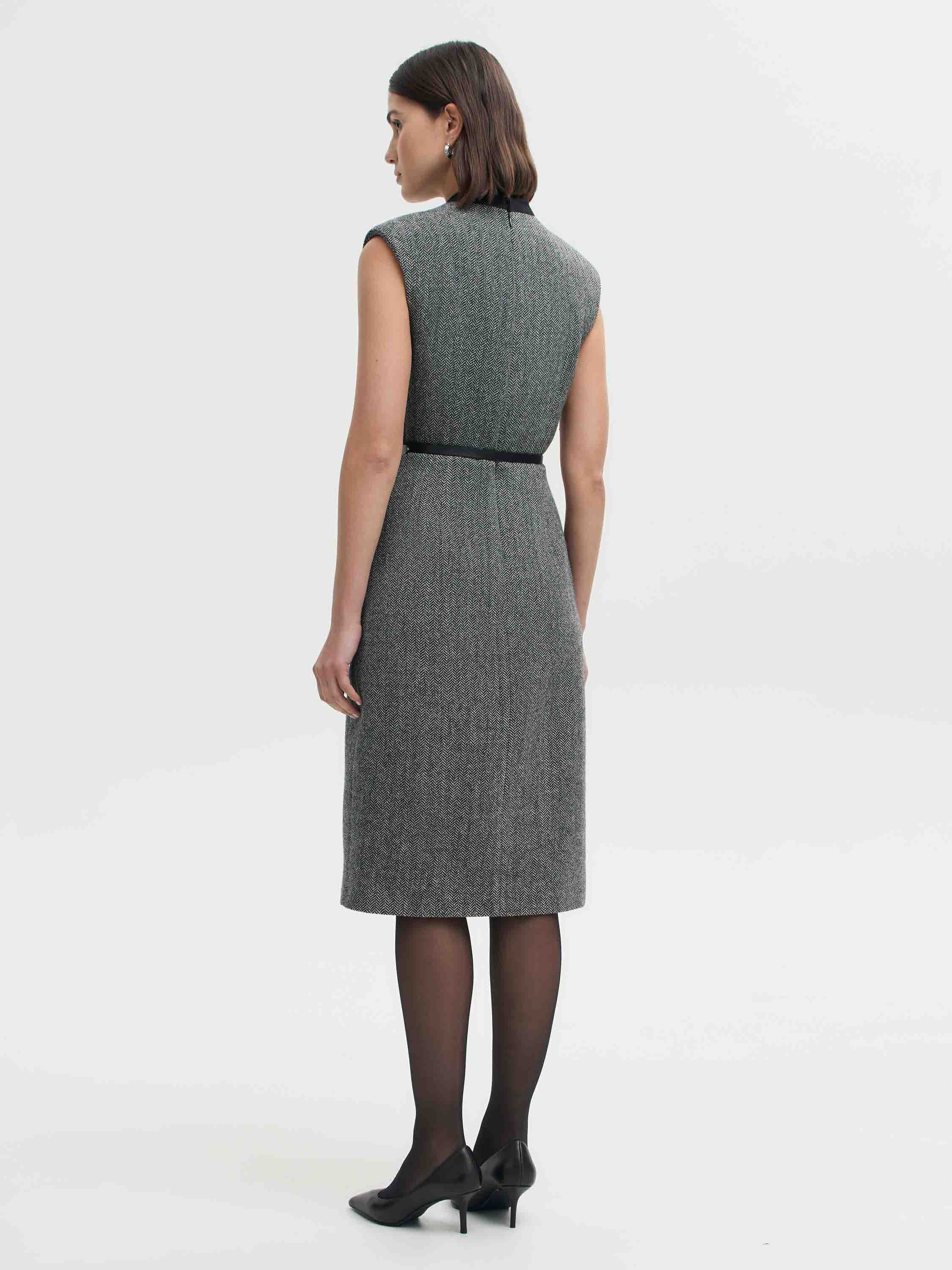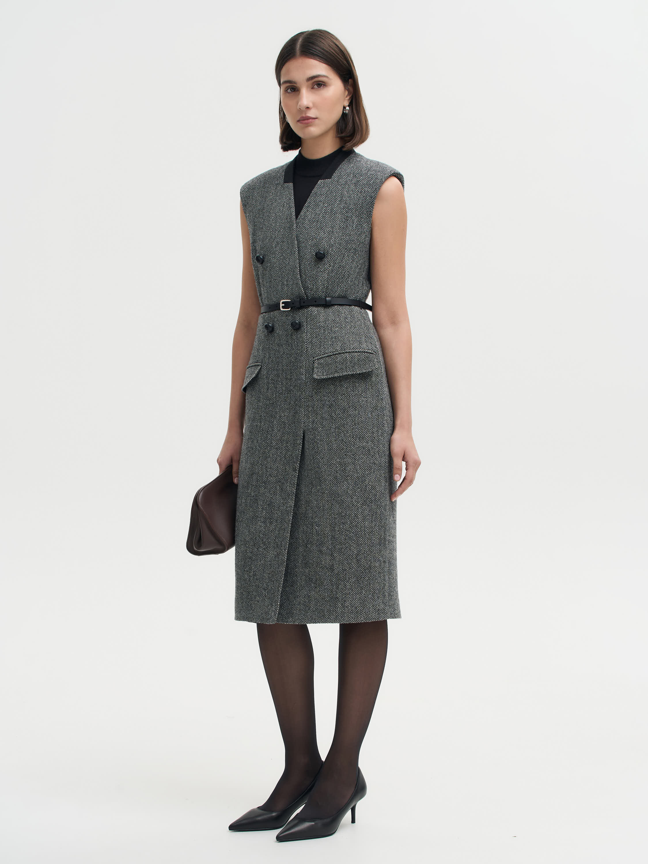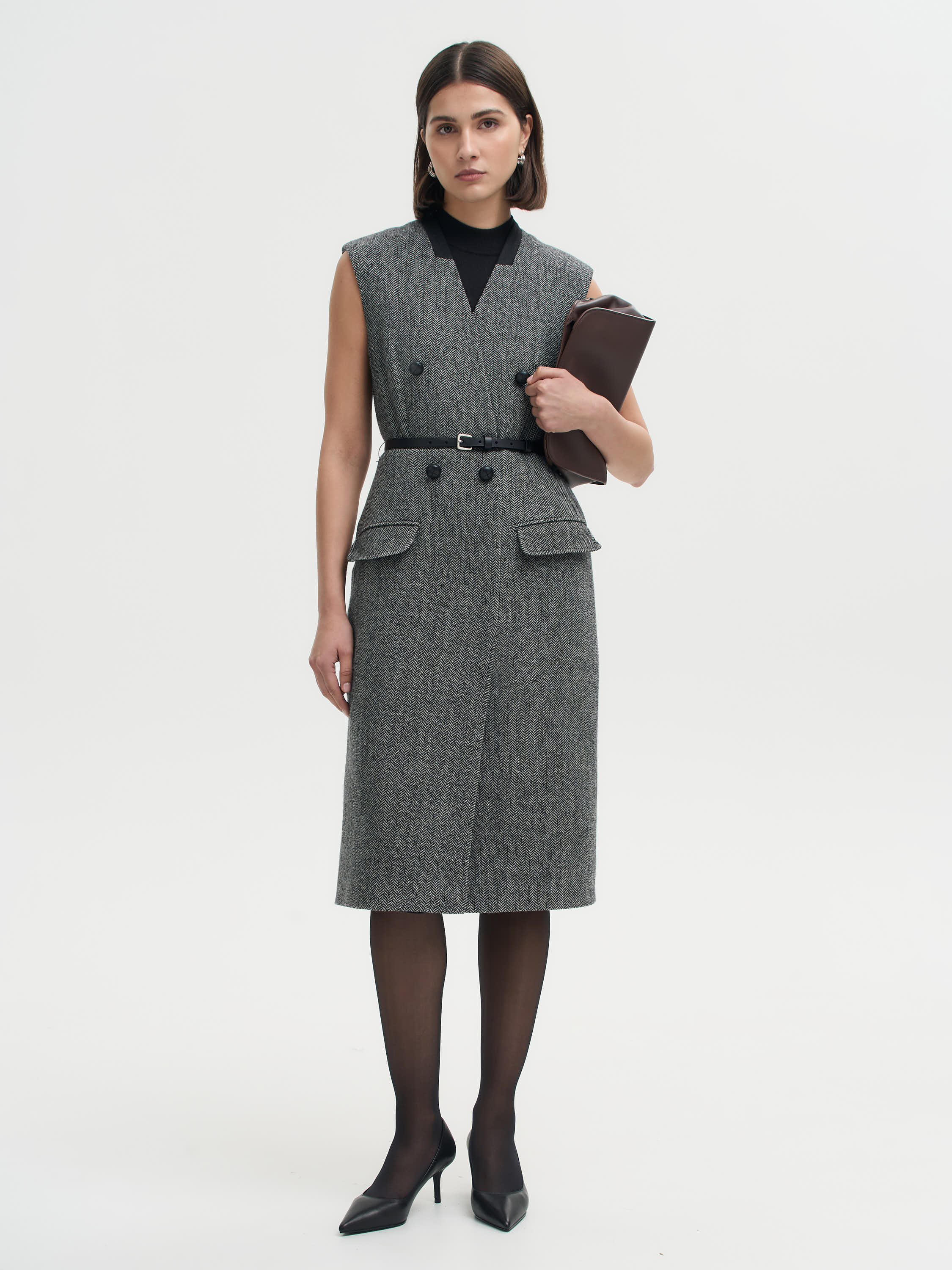 Платье выполнено из 100% шерсти с выразительной фактурой елочки. Прямой крой миди дополнен двубортной застежкой и акцентными клапанами на бедрах, создающими графичность силуэта. Съемный тонкий ремень подчеркивает талию и добавляет женственности, а глубокий V-образный вырез формирует чистую линию верха. Модель универсальна: ее можно носить как самостоятельный образ или в сочетании с базовой водолазкой для более собранного комплекта.