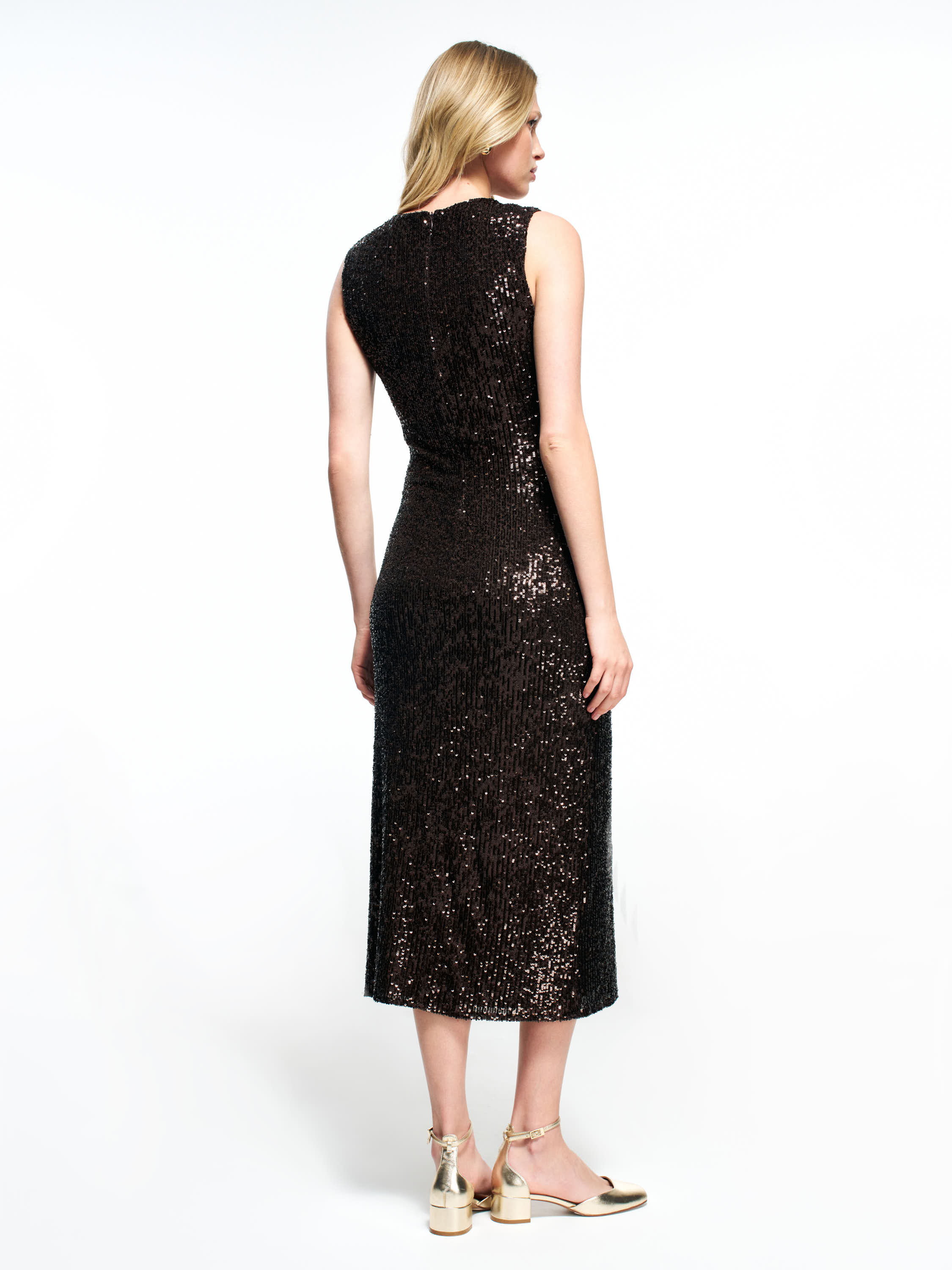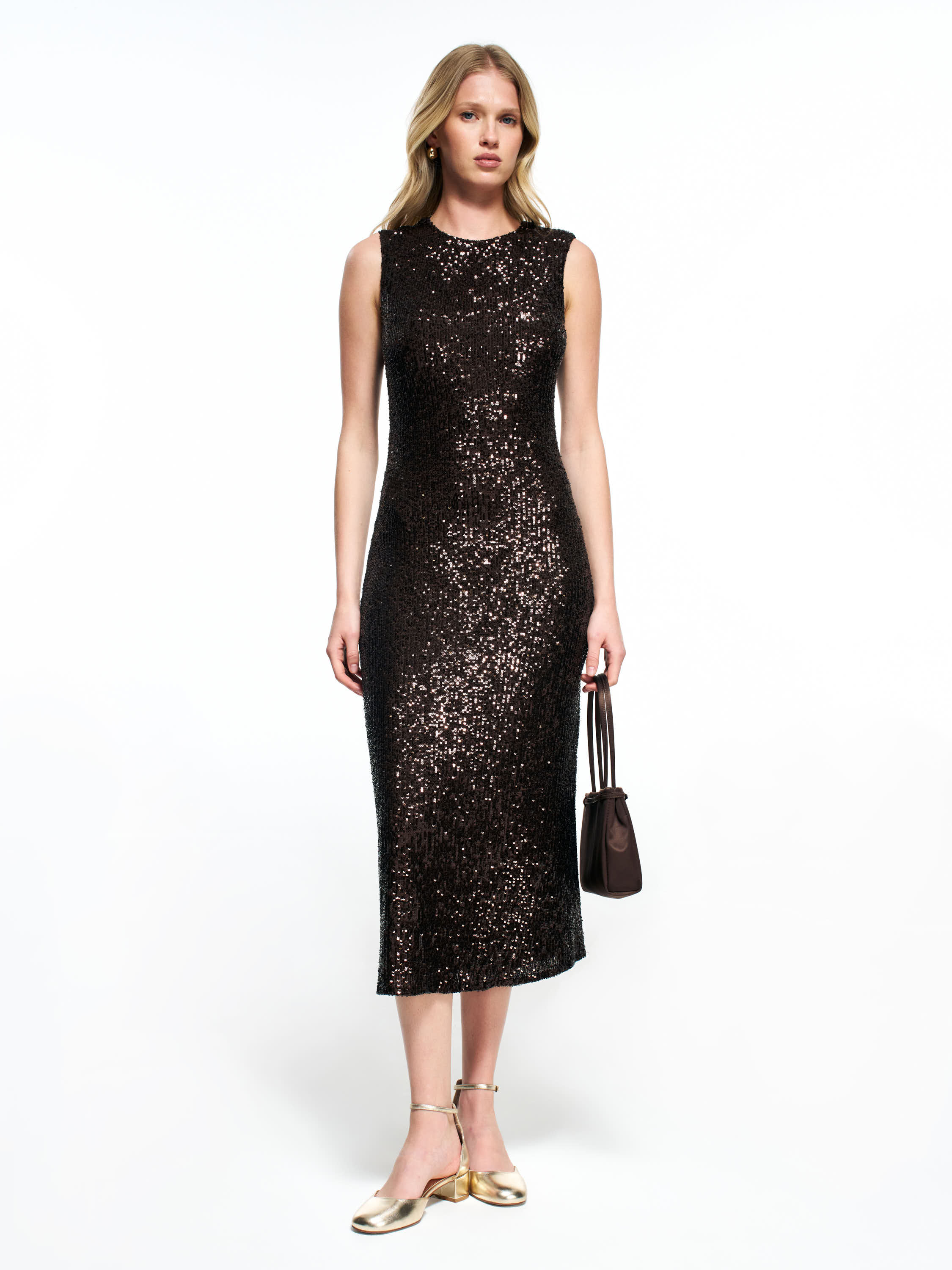 Платье миди с полной вышивкой пайетками — лаконичная модель с прямым силуэтом и аккуратным верхом без излишних конструкций. Полотно плотное, эластичное, дает чистый контур по фигуре и создает выразительную игру блеска при движении. Посадка мягко повторяет линию корпуса, длина миди сохраняет вертикаль и делает образ собранным. Застежка по спинке выполнена скрыто, не нарушает чистоту кроя. Модель подойдет для вечерних выходов и формальных комплектов с лаконичными аксессуарами.
