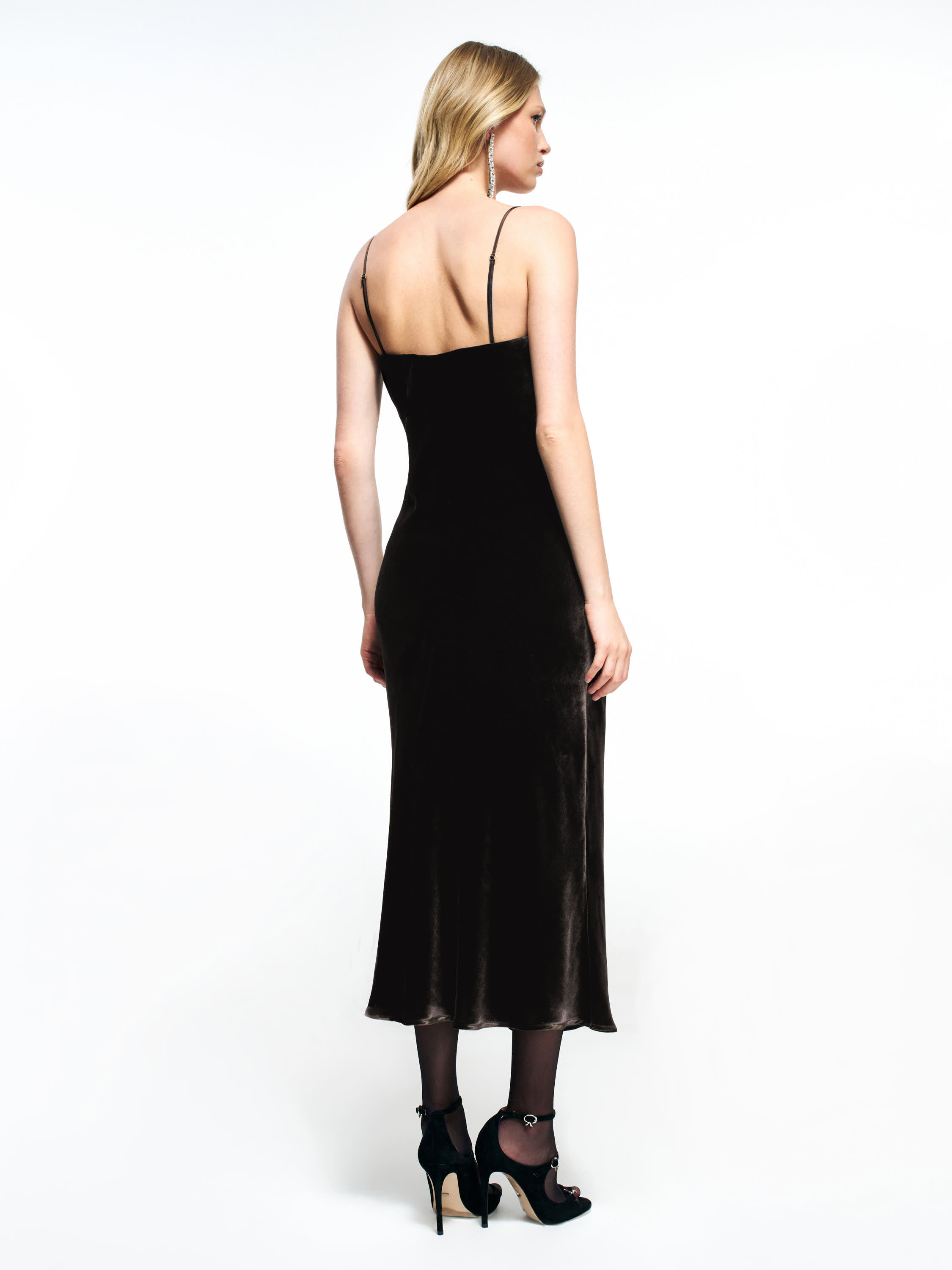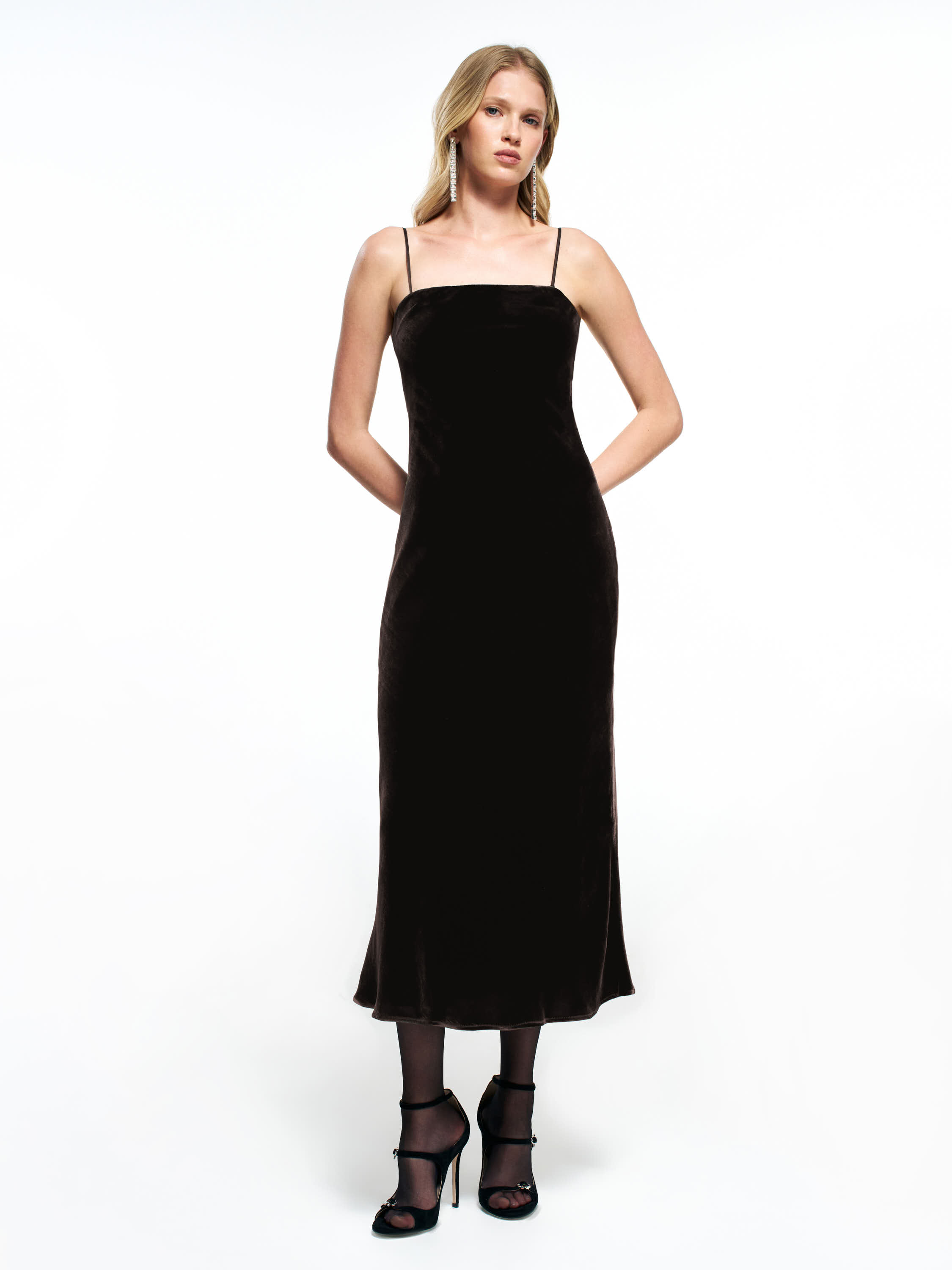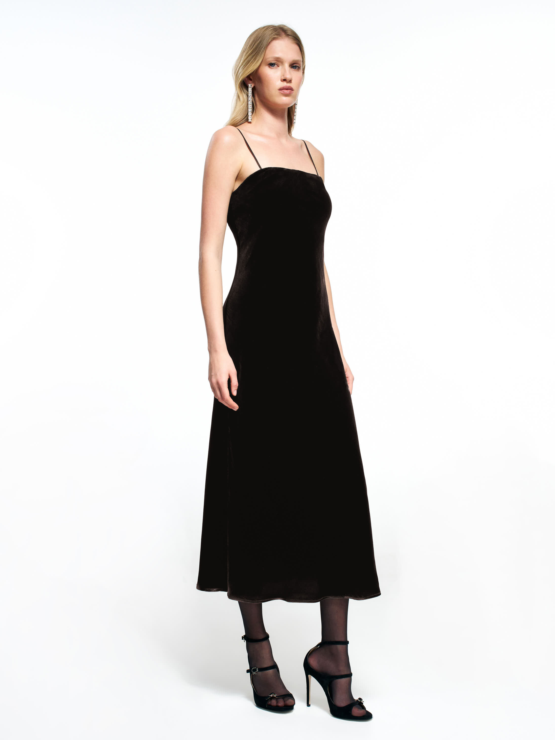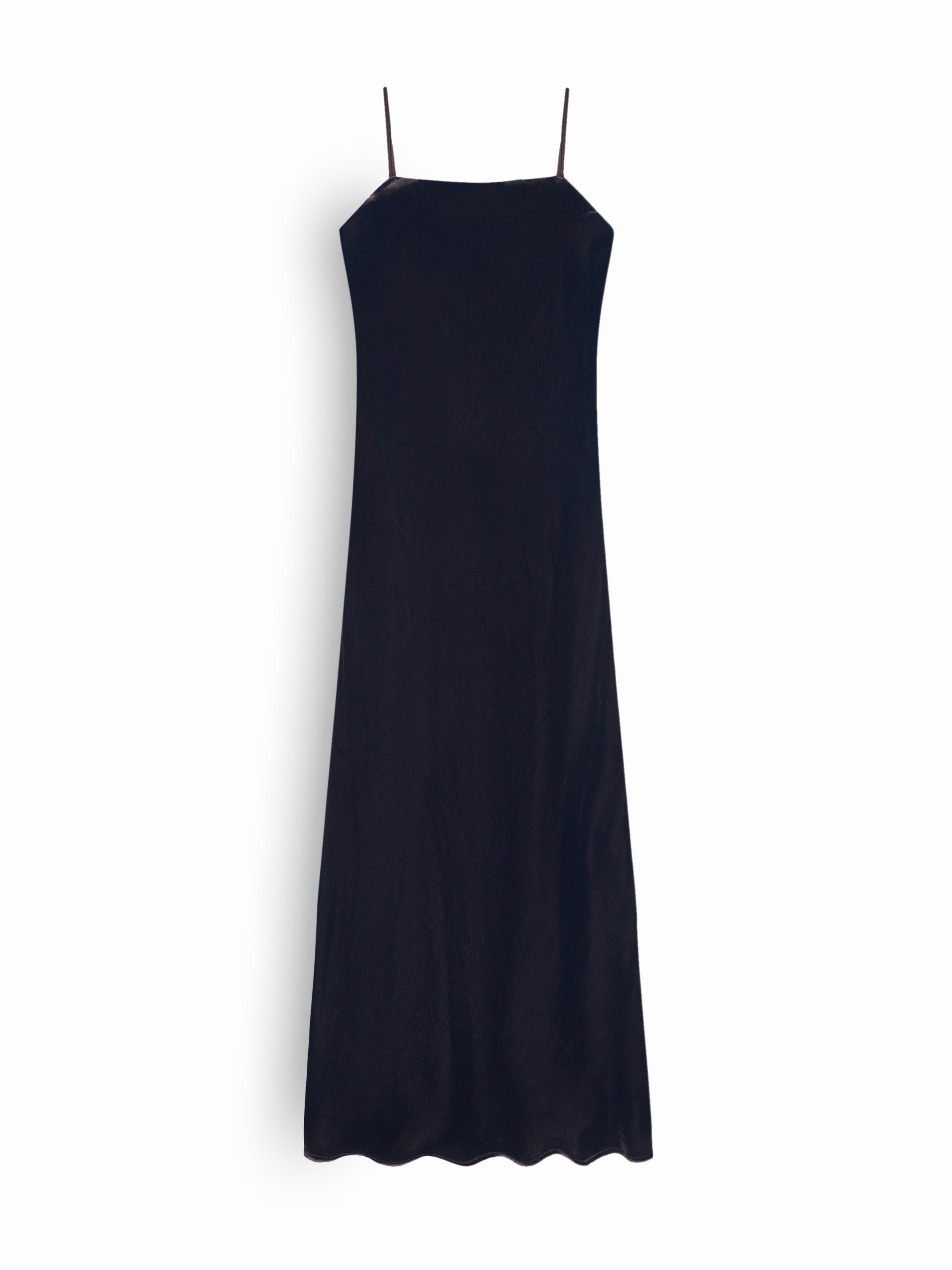 Платье из района с добавлением шелка — лаконичная модель миди длины с мягким прилеганием и вытянутым контуром. Полотно гладкое, пластичное, с деликатным шелковистым блеском. Посадка полуприлегающая, линия груди аккуратная, без жестких конструкций. Тонкие бретели формируют чистый верхний край, а открытая спина поддерживает минималистичную архитектуру переда. Легкое расклешение к низу создает мягкое движение ткани и визуально облегчает силуэт. Длина миди уместна для вечерних комплектов с босоножками или закрытой обувью, а также для сочетаний с жакетами и строгими аксессуарами.