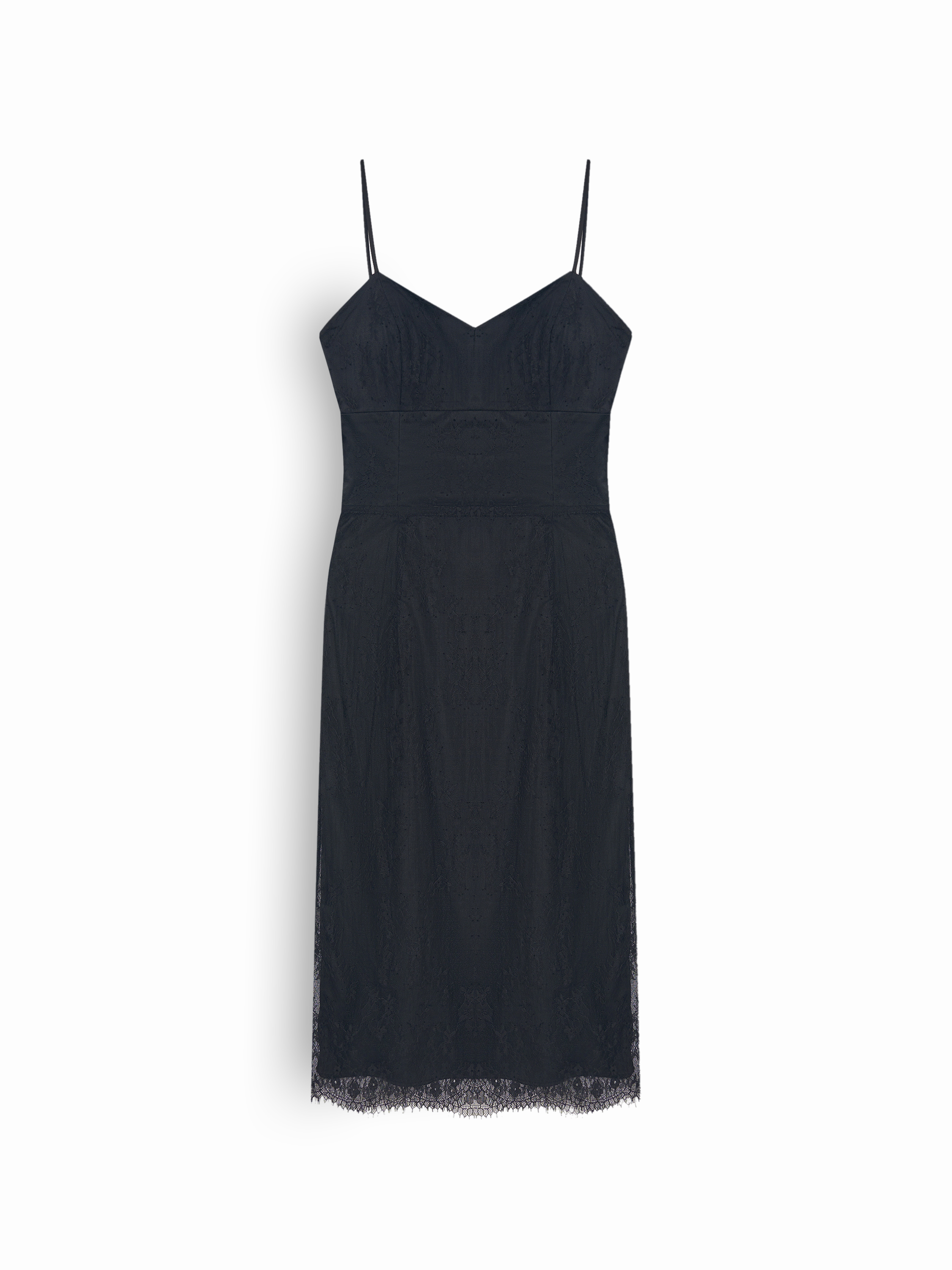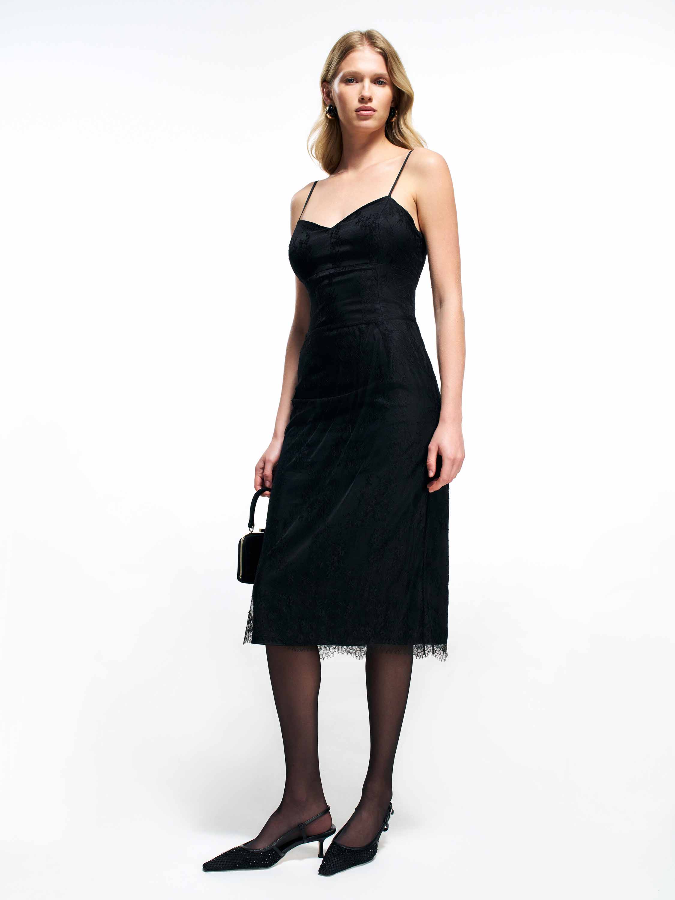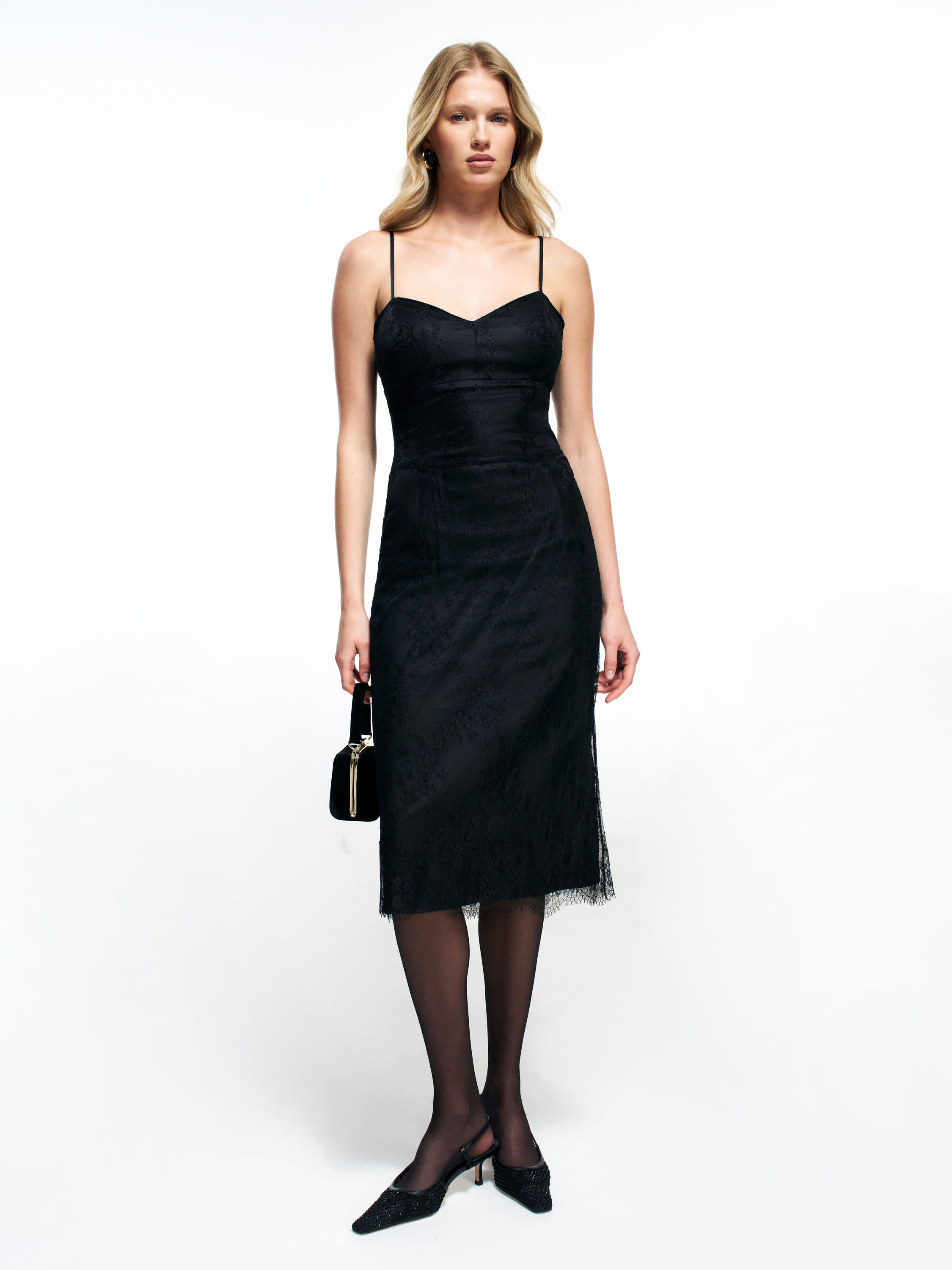 Платье выполнено в лаконичном приталенном силуэте с тонкими бретелями и аккуратно оформленной линией декольте. Ткань обладает деликатной текстурой, которая добавляет глубину и делает поверхность выразительнее. Лиф мягко подчеркивает верхнюю линию корпуса, юбка миди создает стройный и собранный образ. Кружевное кантование по нижнему краю придает модели легкость и завершенность. Модель вписывается в современные образы для торжественных случаев и может сочетаться со структурными жакетами, компактными сумками и лаконичной обувью.