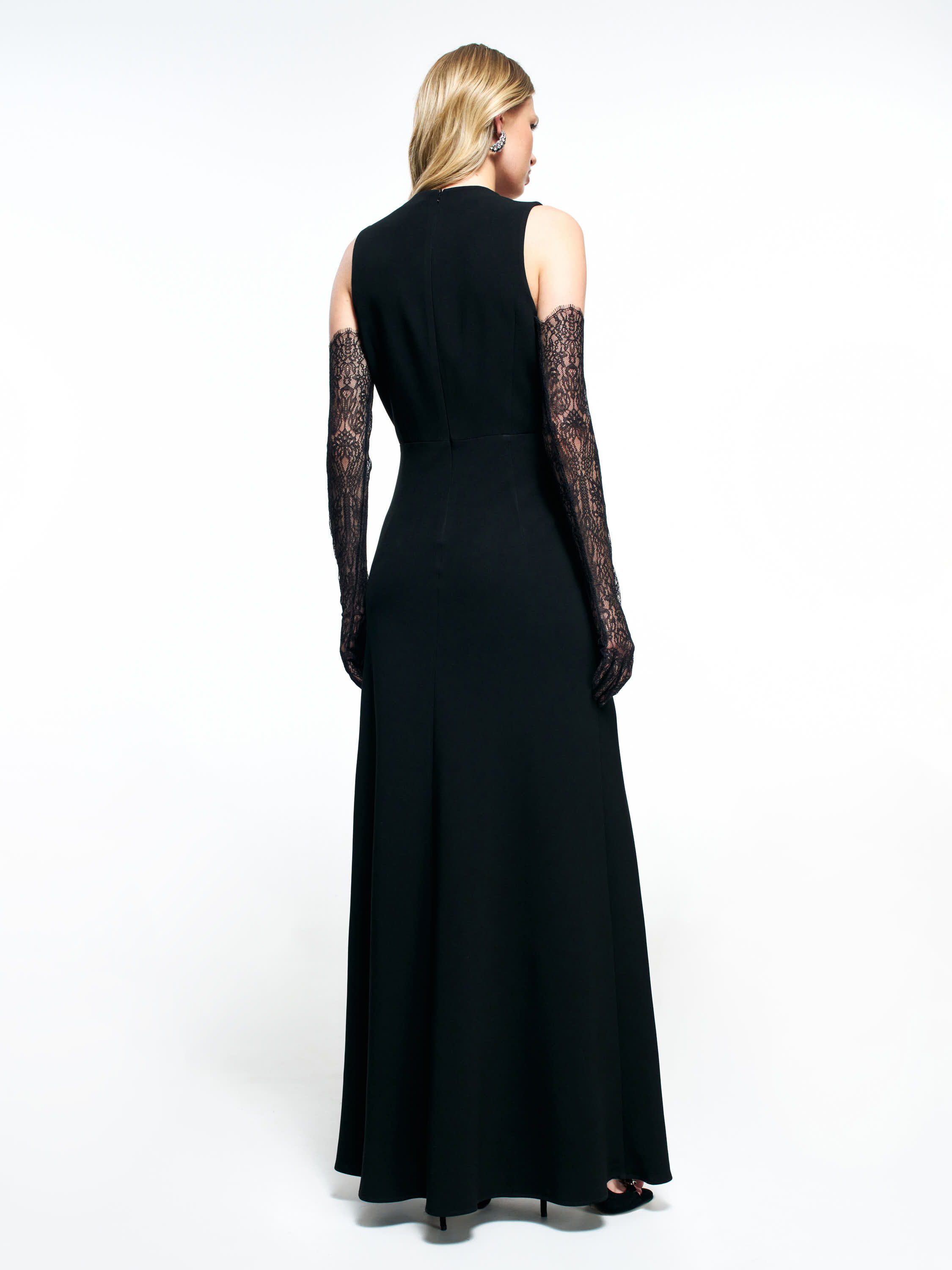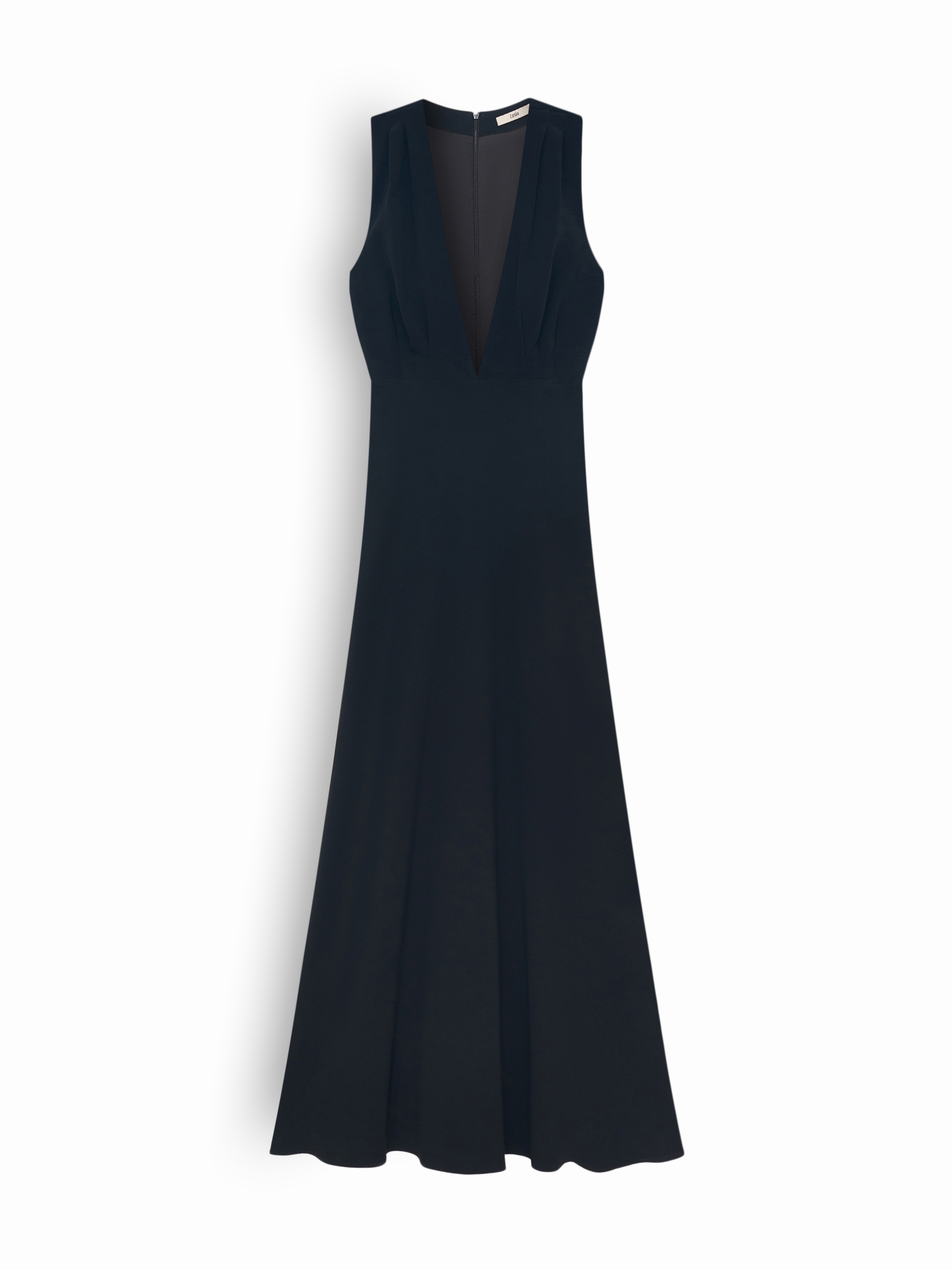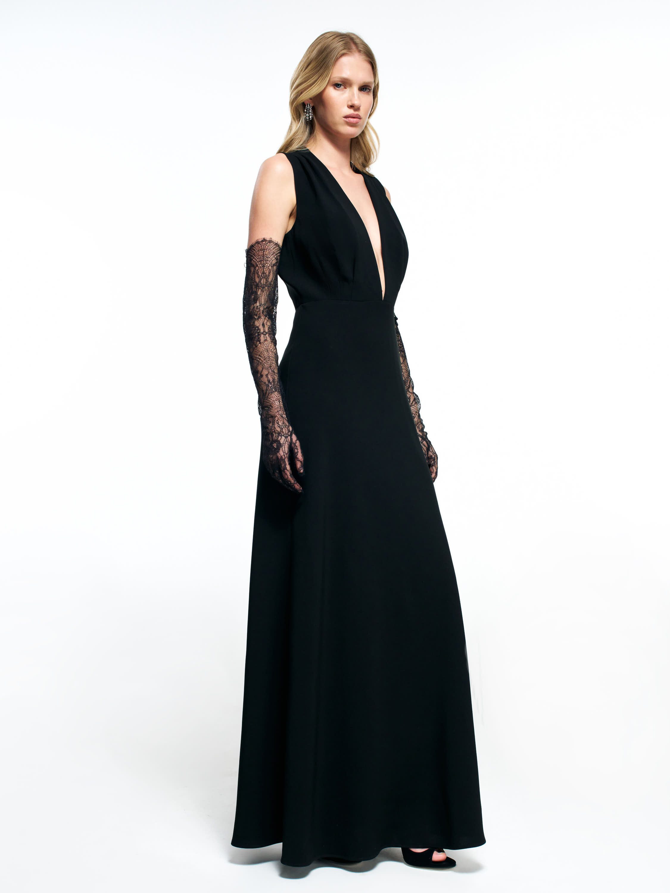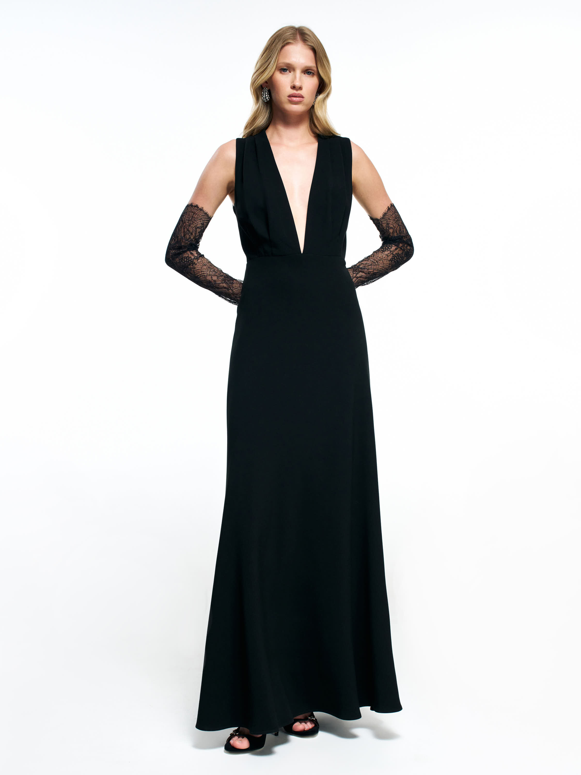 Платье из смесового ацетата — лаконичная модель в пол с выразительным V-вырезом и чистой линией кроя. Полотно плотное, пластичное, мягко драпируется и формирует вытянутый силуэт без утяжеления. Посадка прилегающая в верхней части и более свободная к низу, создавая аккуратный, собранный контур. Глубокий вырез добавляет вертикали и делает образ вечерним, при этом линия плеч остается строгой и графичной. Длина до пола подчеркивает плавность движения и хорошо работает в сочетаниях с минималистичными украшениями, тонкими перчатками или лаконичными жакетами.