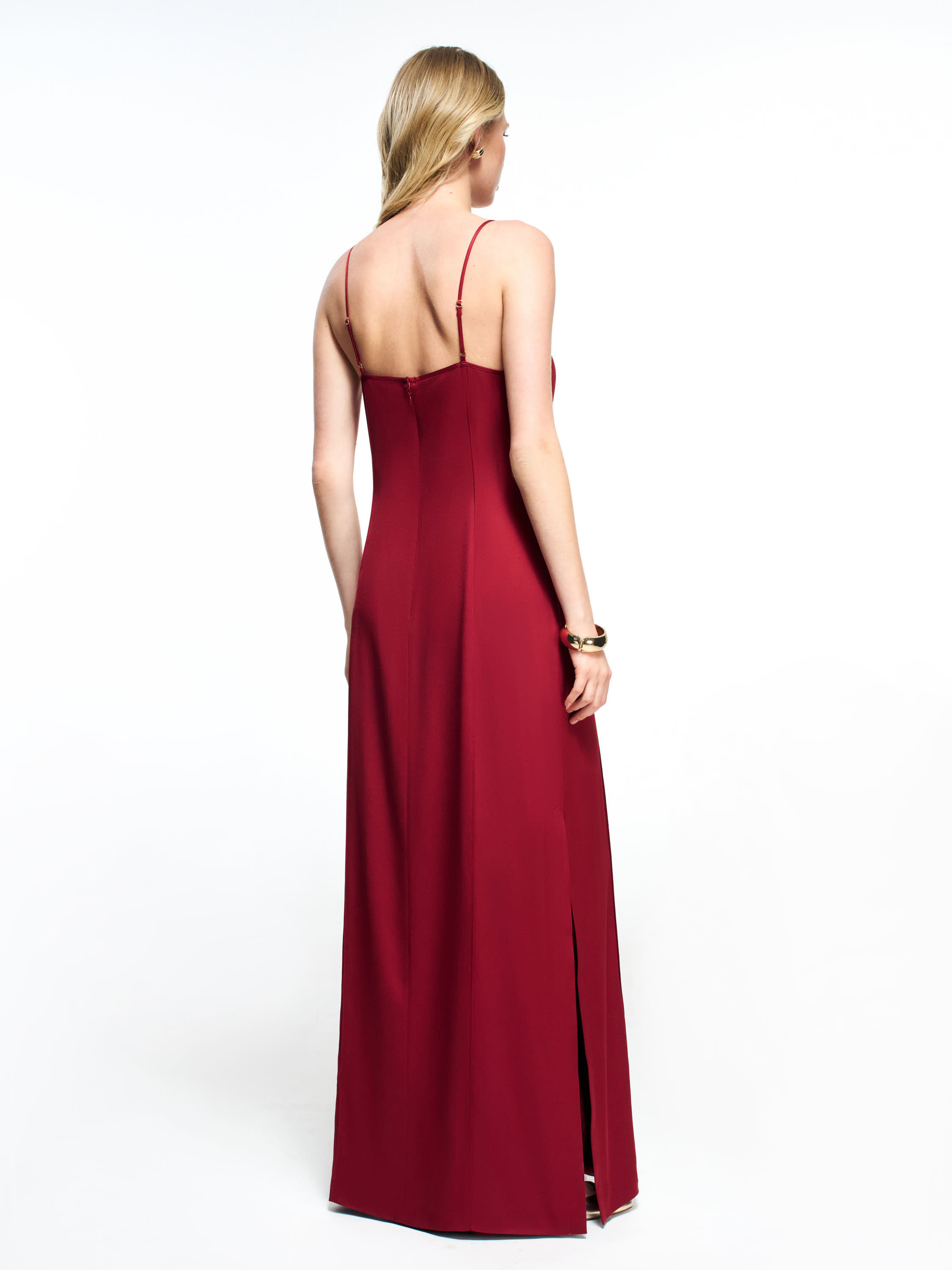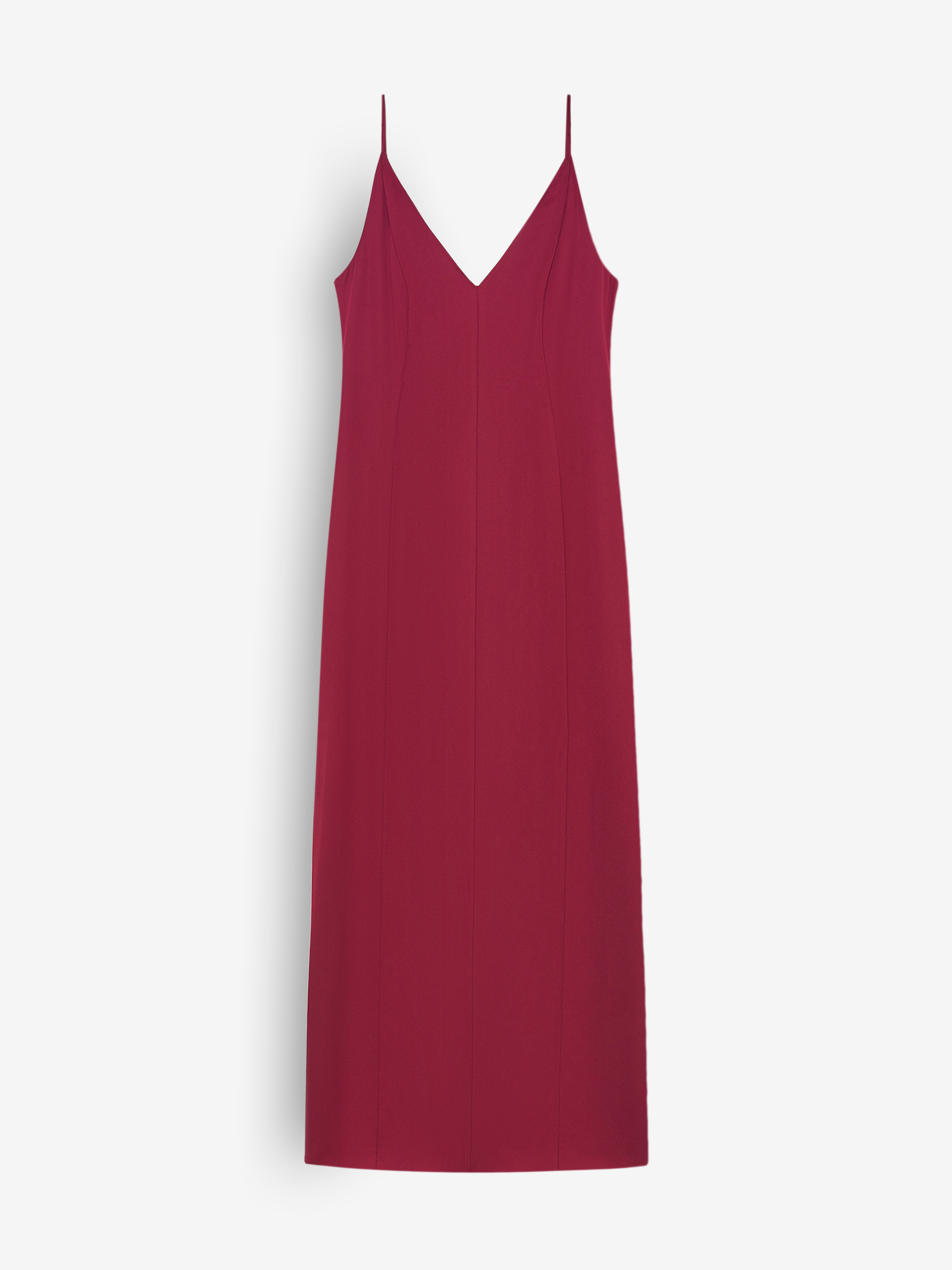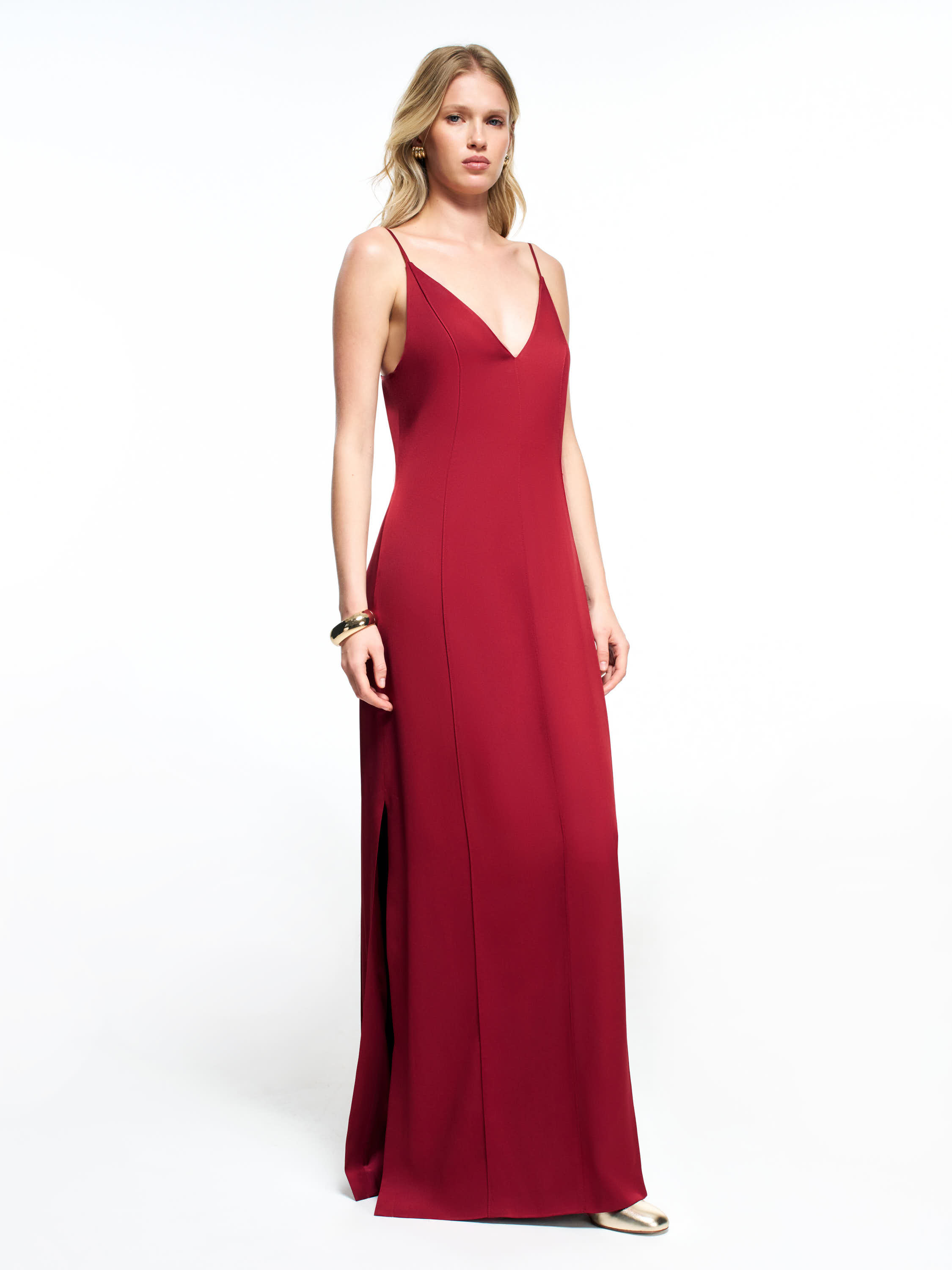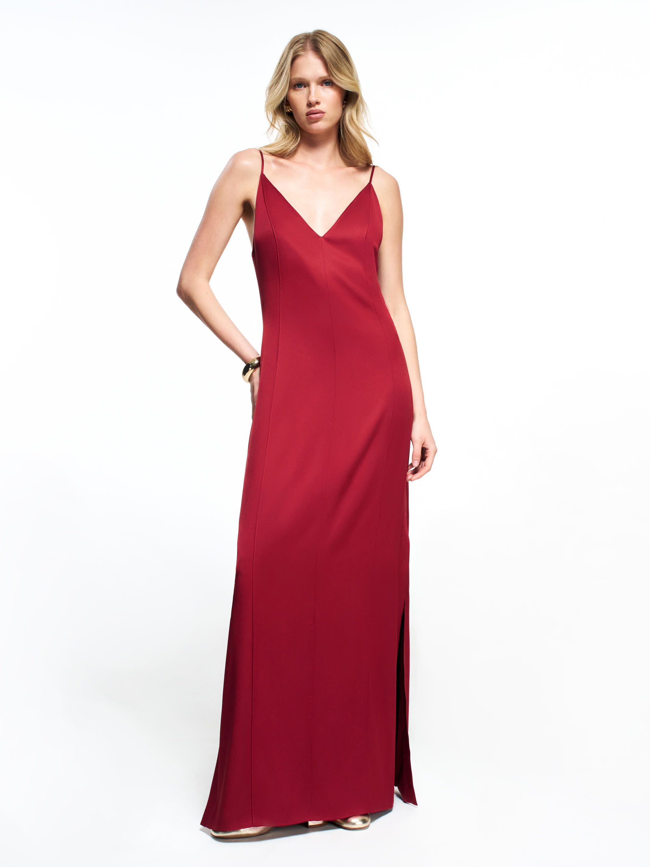 Платье из смесового ацетата построено на вытянутом, чистом силуэте в пол. Полотно плотное, гладкое, мягко драпируется и сохраняет графичную вертикаль. V-образный вырез оформлен деликатно, тонкие бретели подчеркивают линию верха. Посадка полуприлегающая, швы формируют аккуратный контур без лишнего объема. Разрез спереди добавляет динамики и обеспечивает свободу движения. Модель подходит для вечерних выходов и лаконичных комплектов с жакетами и обувью на каблуке.