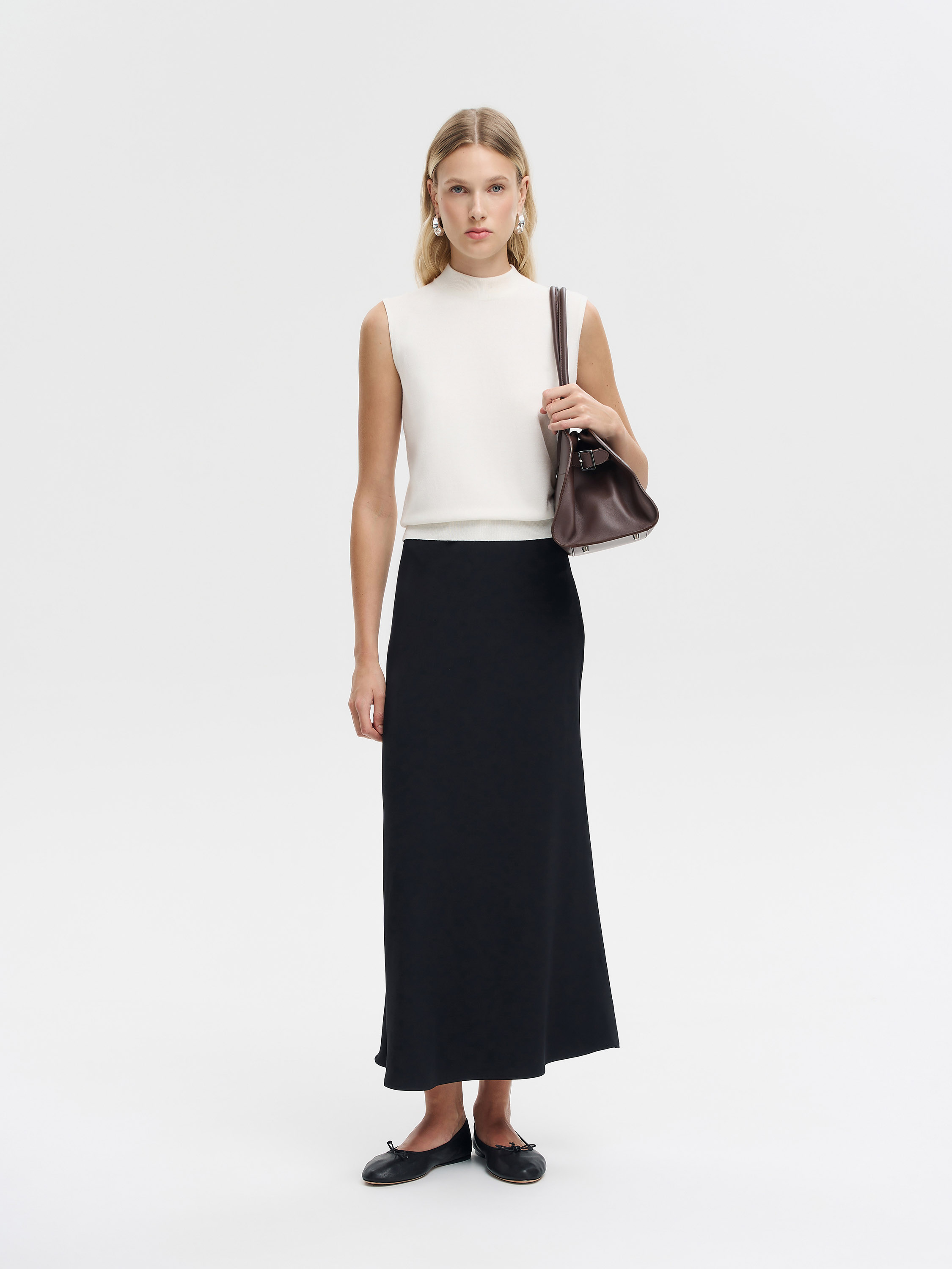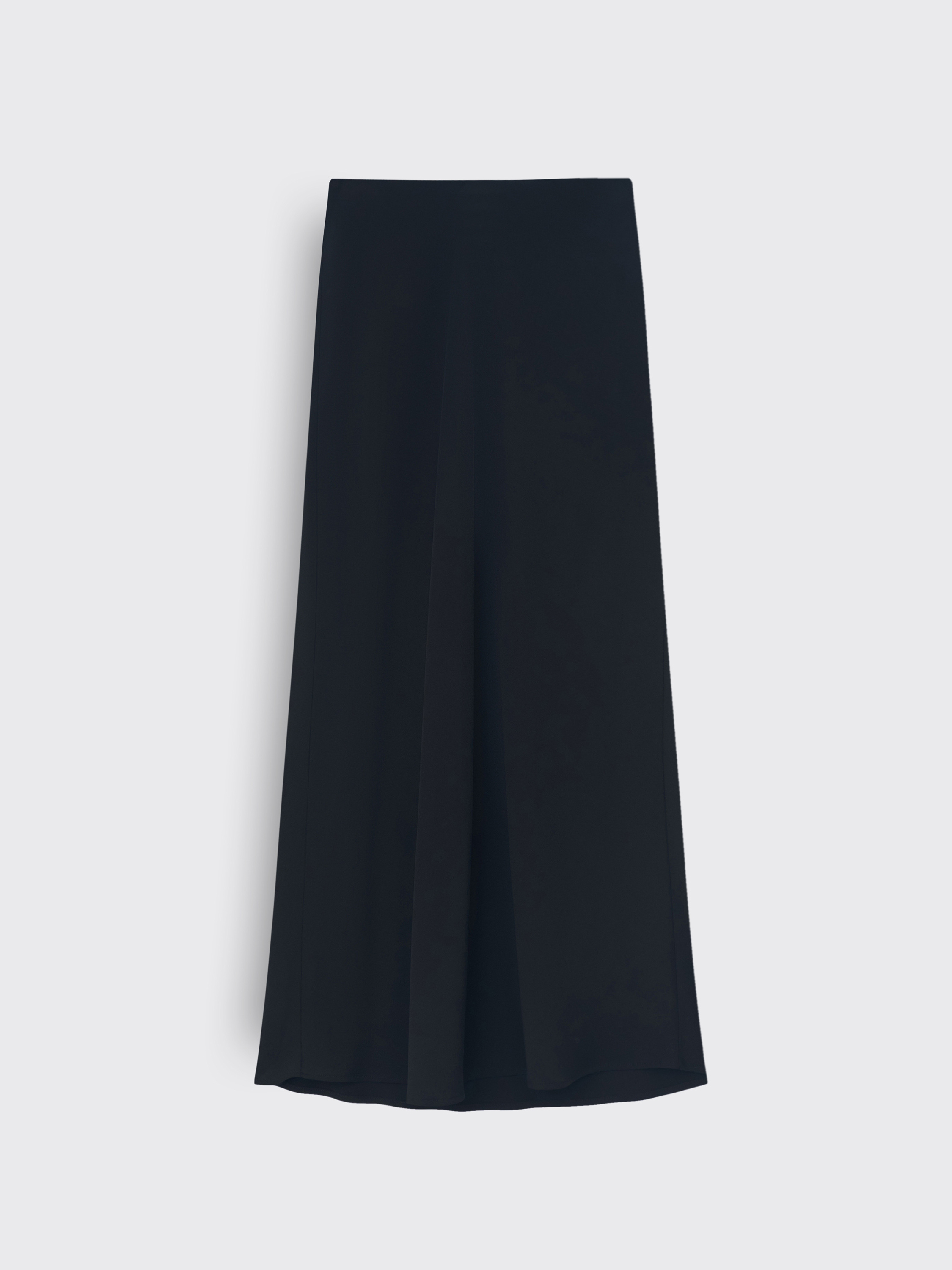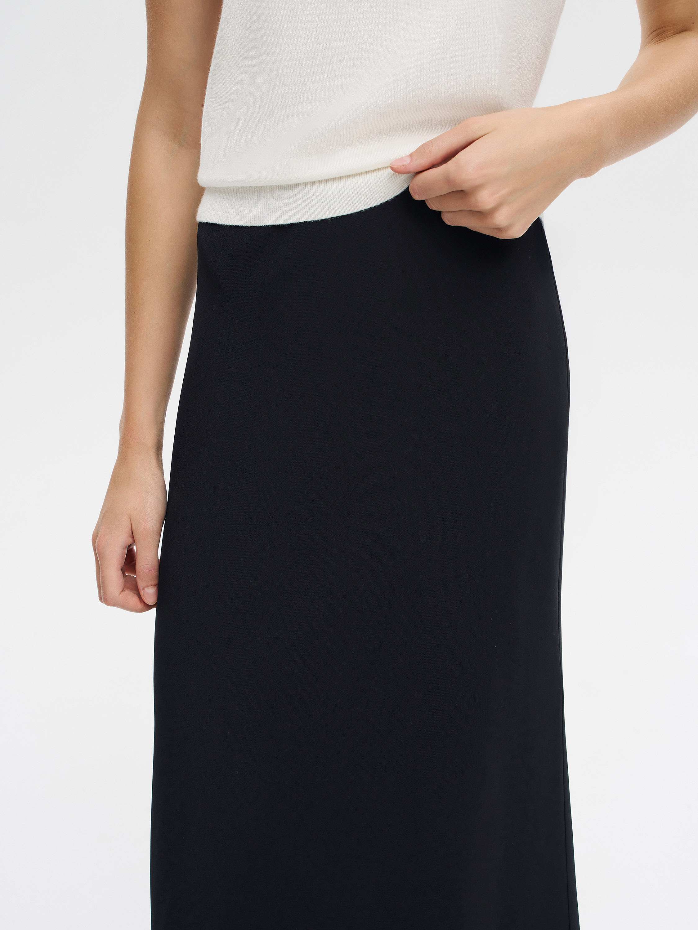 Юбка миди из мягкой ткани с высоким содержанием района и добавлением эластана. Материал пластичный, с гладкой фактурой и деликатным матовым блеском, комфортный в носке и устойчивый к деформации. Крой прямой, слегка расширяющийся к низу, формирует чистый и вытянутый силуэт. Линия пояса выполнена без лишних деталей, что подчеркивает минималистичность модели. Универсальная длина позволяет сочетать юбку как с лаконичными топами и водолазками, так и с жакетами или кардиганами, создавая элегантные образы в современном ключе.