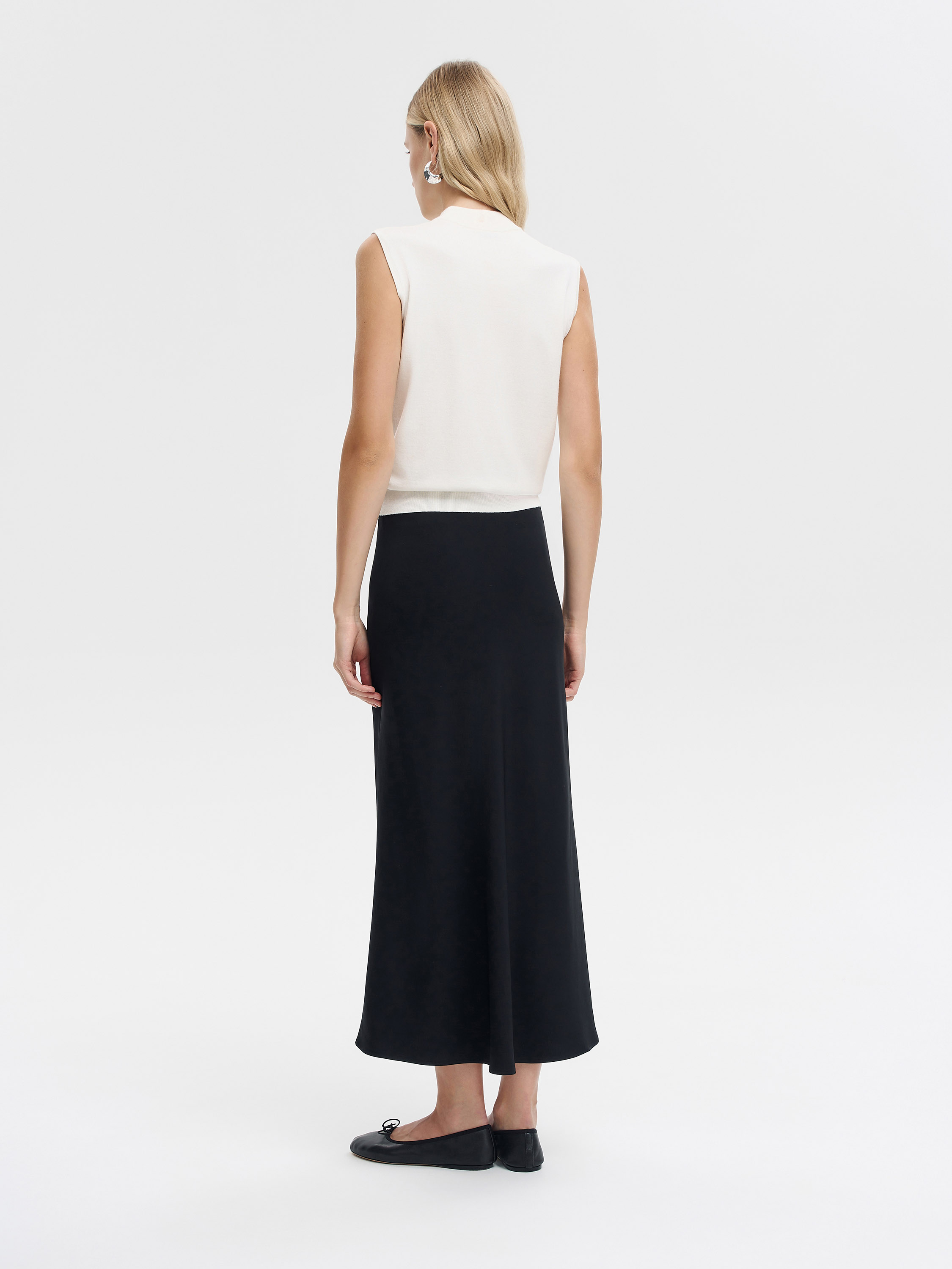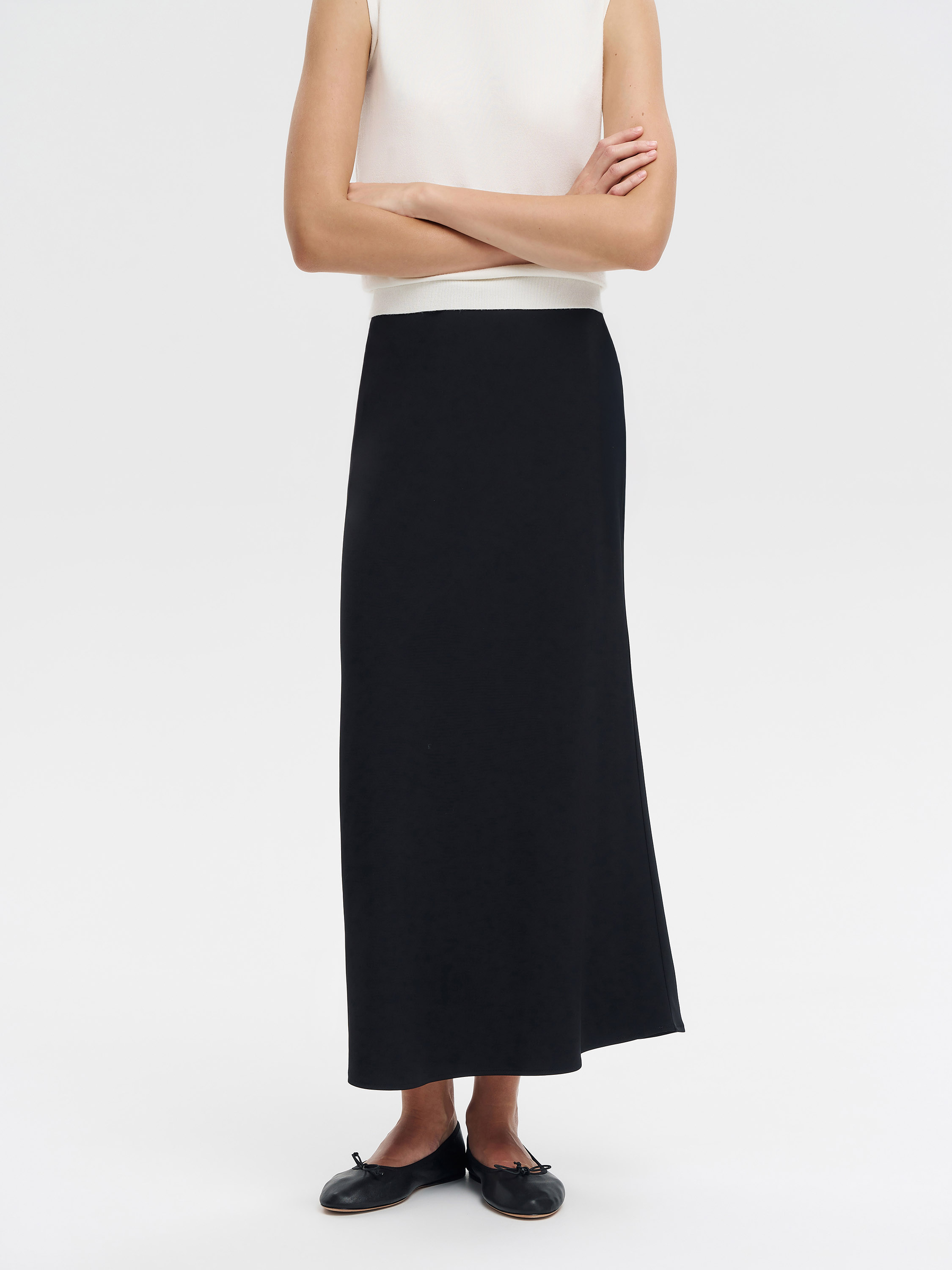 Юбка миди из мягкой ткани с высоким содержанием района и добавлением эластана. Материал пластичный, с гладкой фактурой и деликатным матовым блеском, комфортный в носке и устойчивый к деформации. Крой прямой, слегка расширяющийся к низу, формирует чистый и вытянутый силуэт. Линия пояса выполнена без лишних деталей, что подчеркивает минималистичность модели. Универсальная длина позволяет сочетать юбку как с лаконичными топами и водолазками, так и с жакетами или кардиганами, создавая элегантные образы в современном ключе.