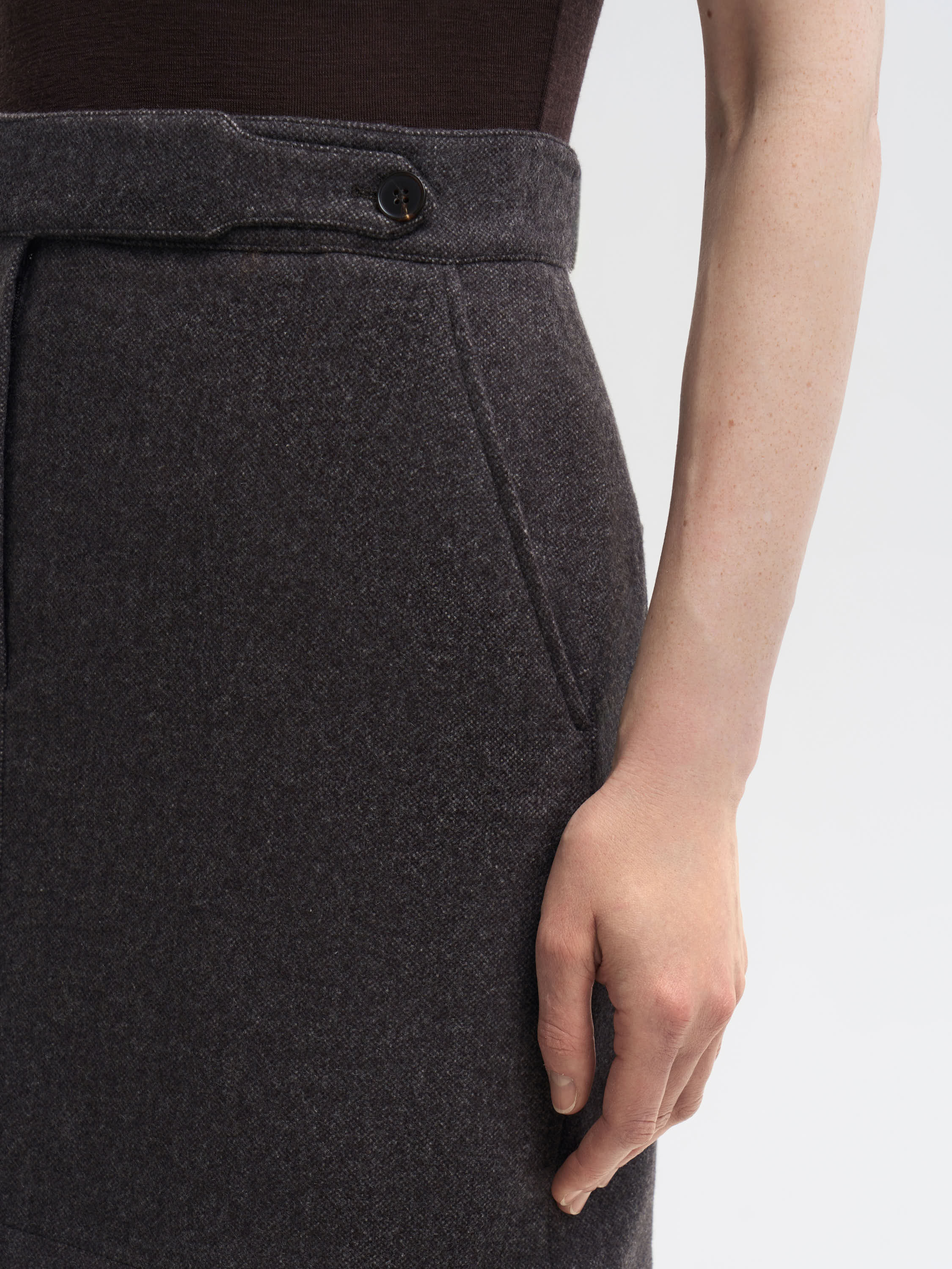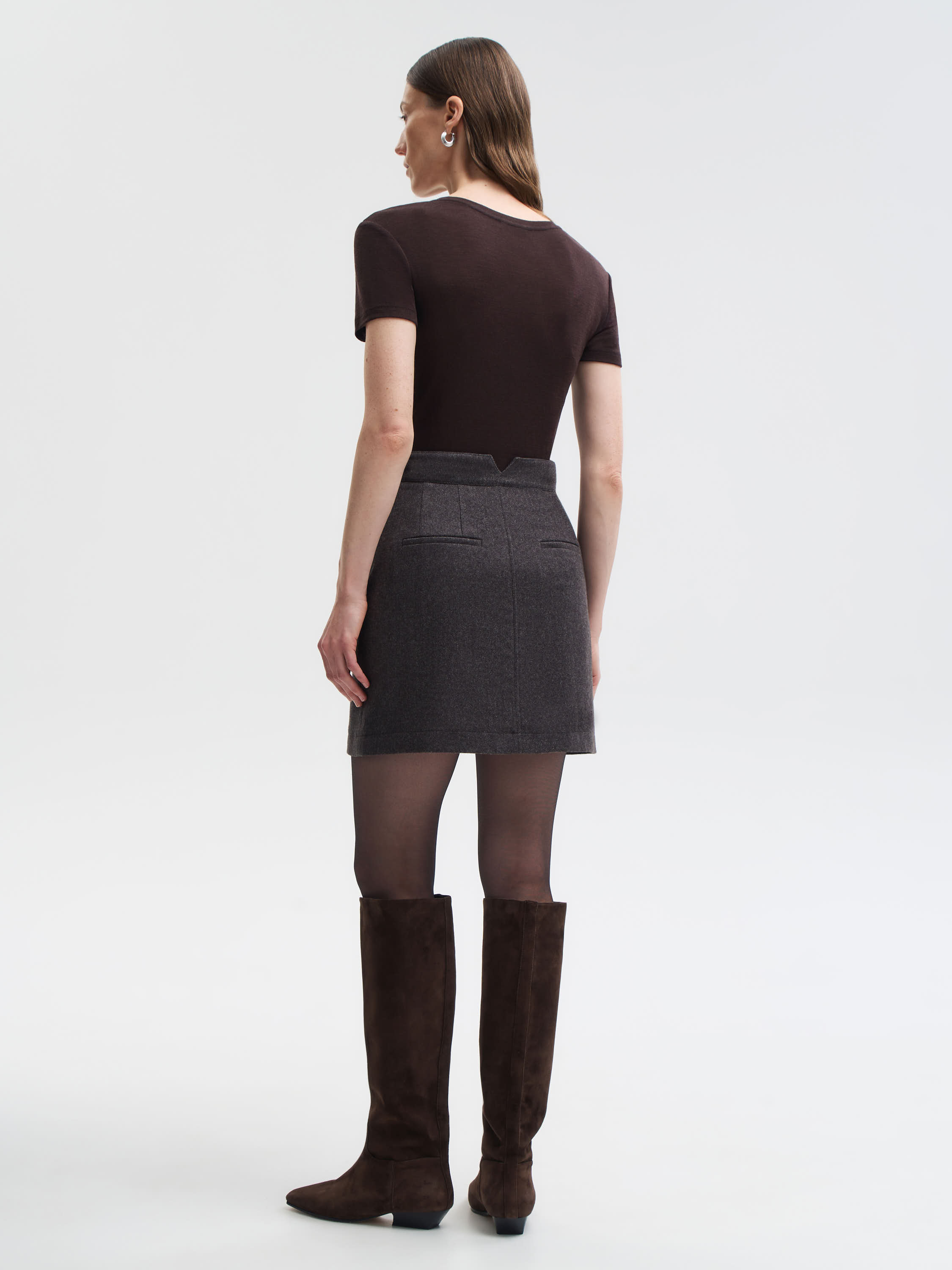 Мини-юбка из костюмной ткани с высоким содержанием шерсти и добавлением шелка. Материал плотный, но мягкий, с деликатным блеском, характерным для натуральных волокон. Прямой крой и аккуратная длина создают чистый, современный силуэт. Детали конструкции — застежка на потайную молнию и декоративные пуговицы на поясе — добавляют изделию завершенности. Универсальная модель, которая органично вписывается в повседневные и офисные образы.