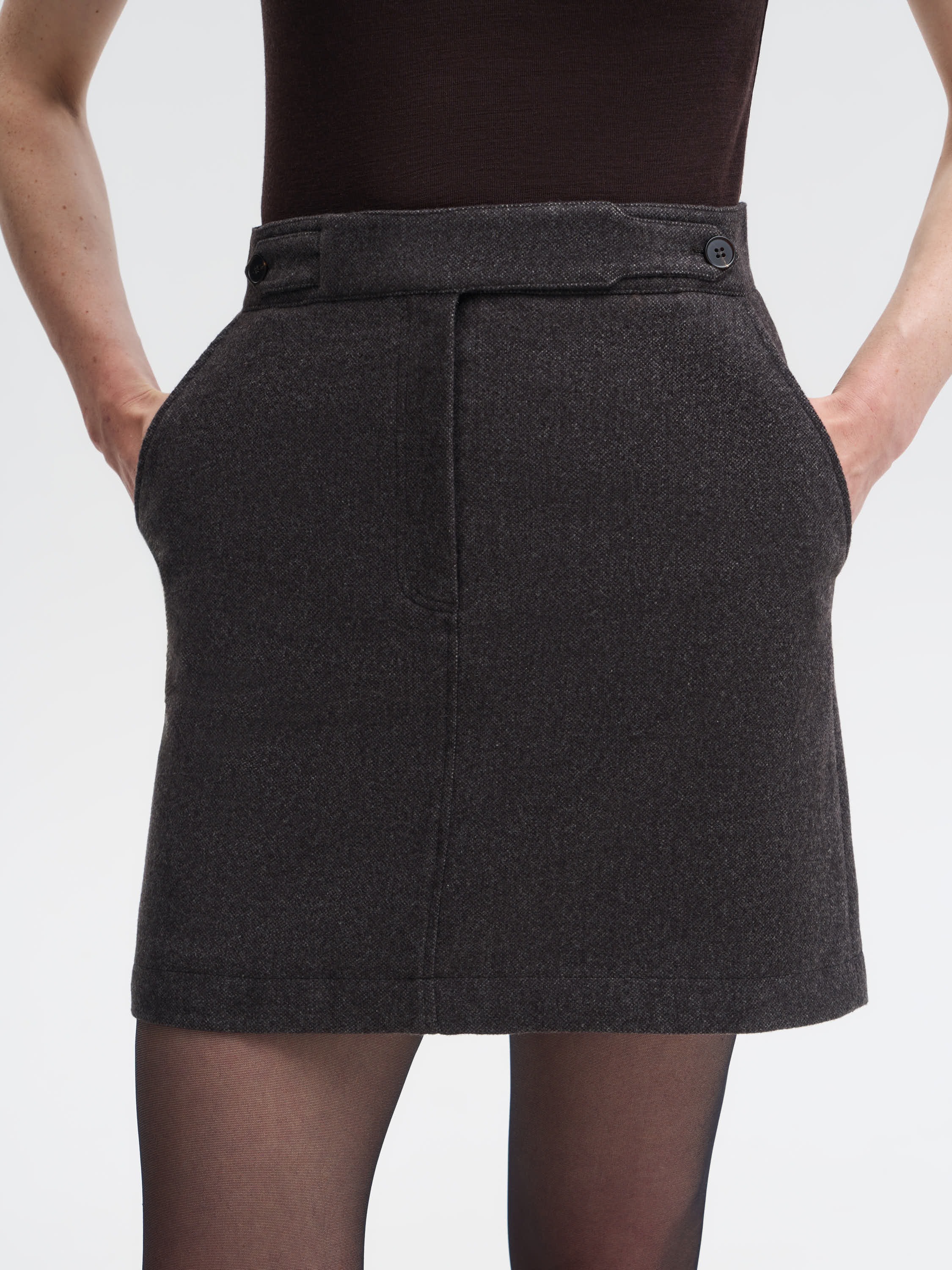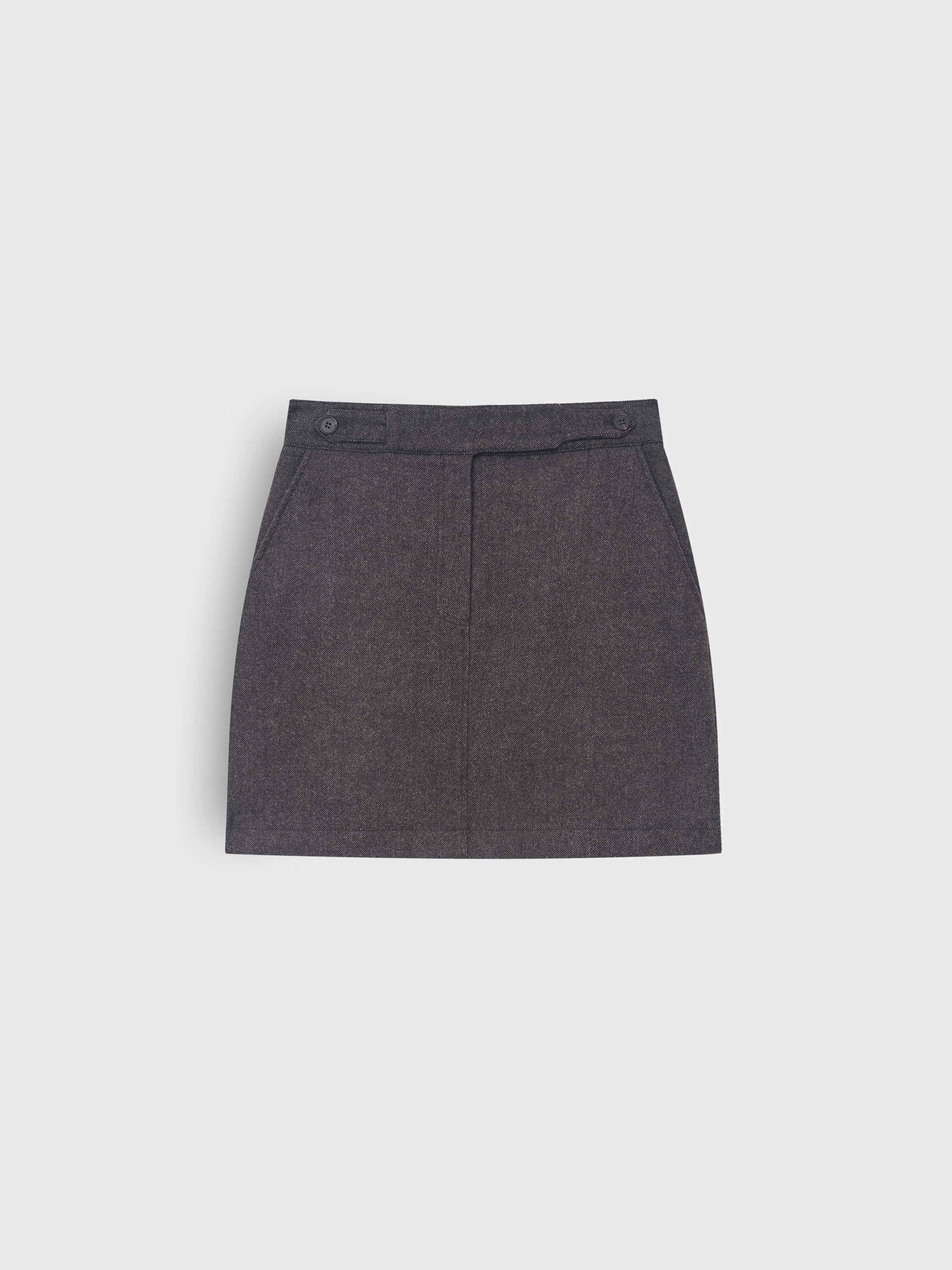 Мини-юбка из костюмной ткани с высоким содержанием шерсти и добавлением шелка. Материал плотный, но мягкий, с деликатным блеском, характерным для натуральных волокон. Прямой крой и аккуратная длина создают чистый, современный силуэт. Детали конструкции — застежка на потайную молнию и декоративные пуговицы на поясе — добавляют изделию завершенности. Универсальная модель, которая органично вписывается в повседневные и офисные образы.