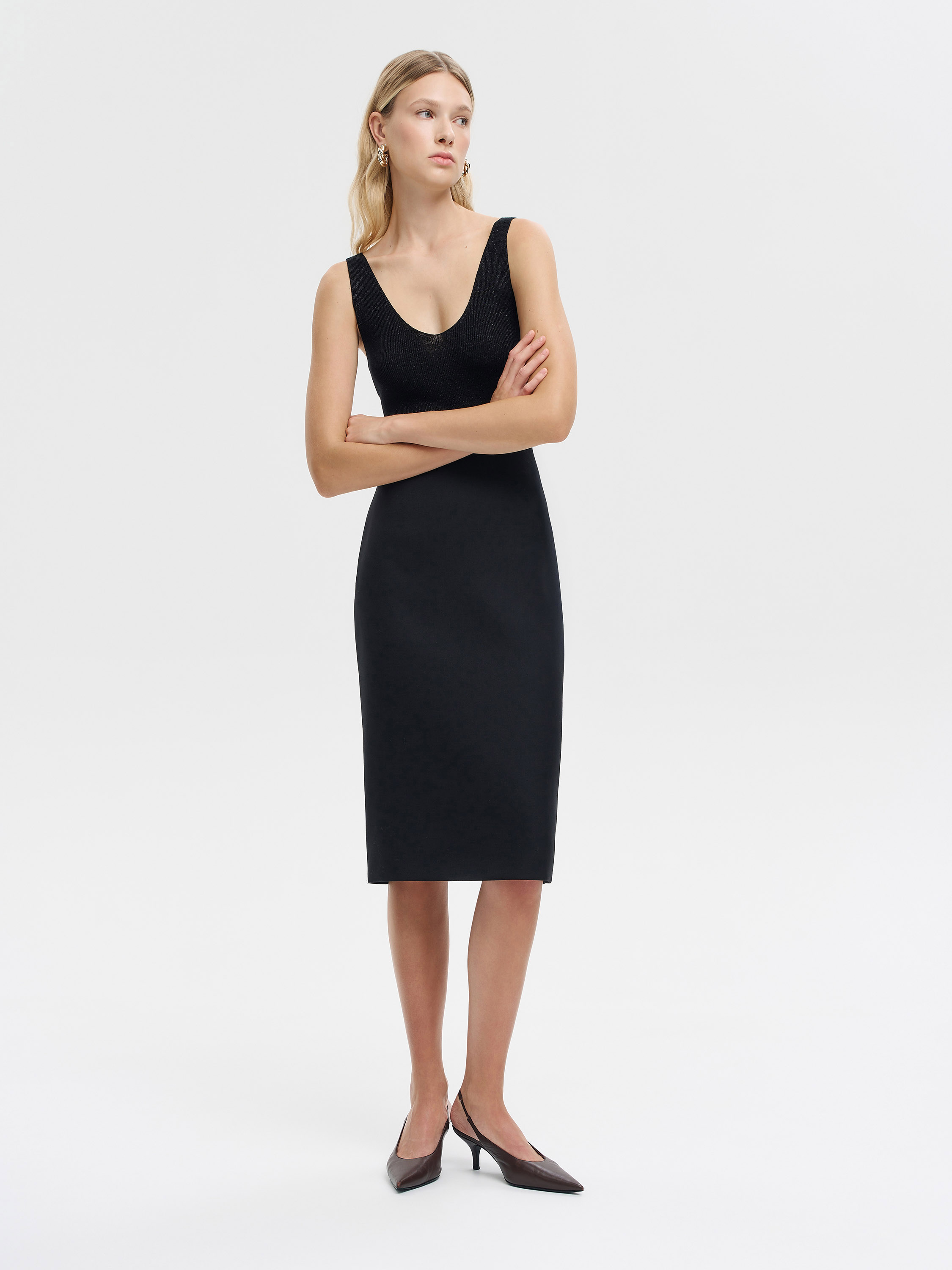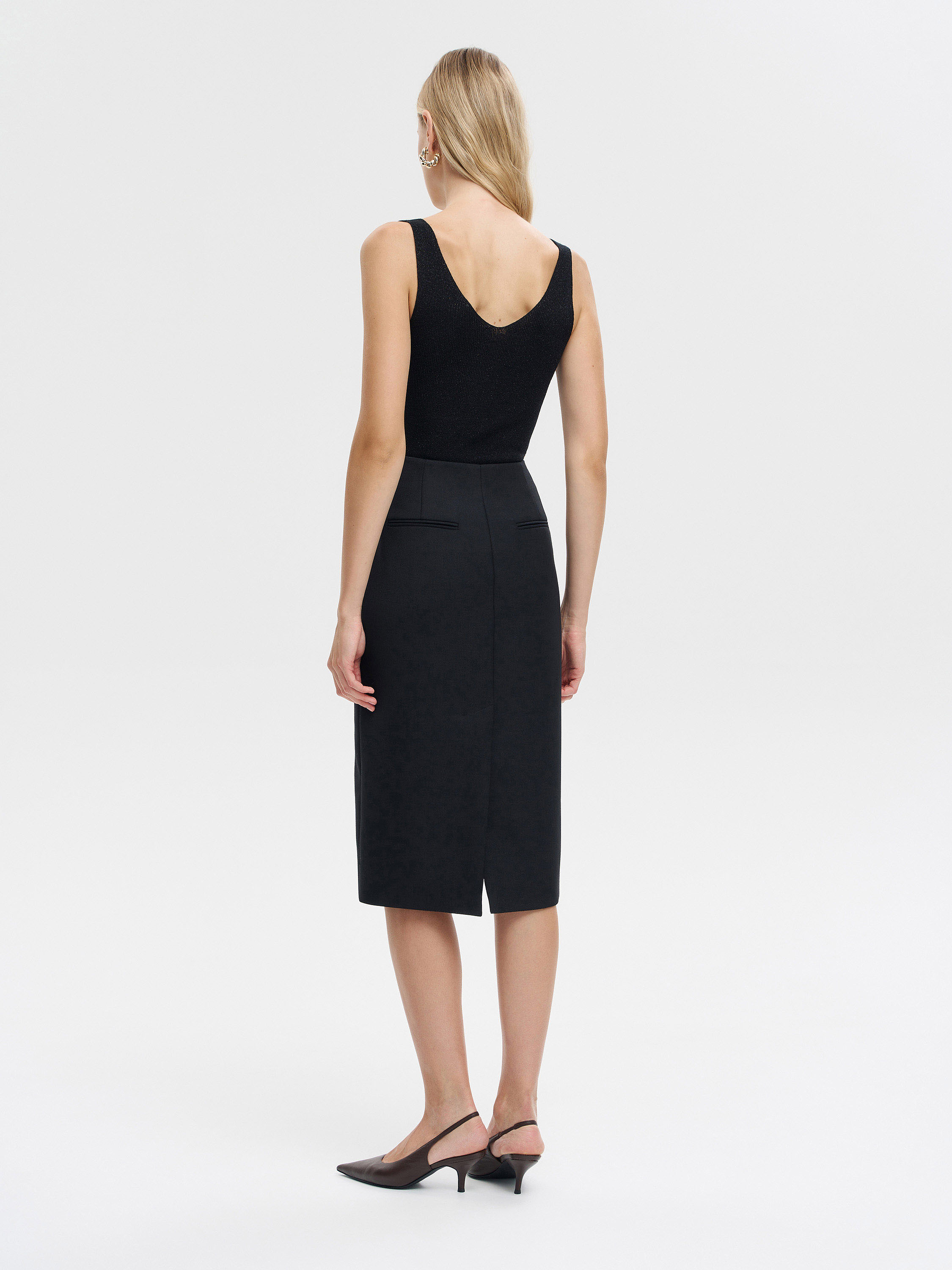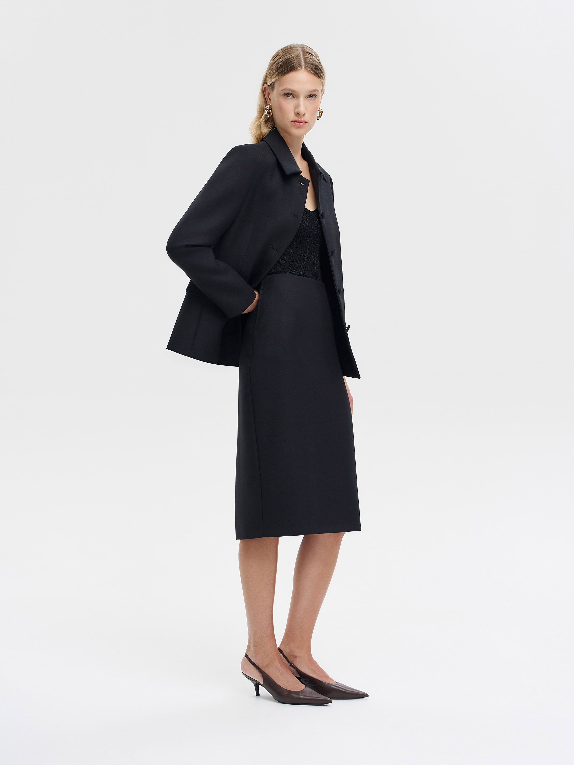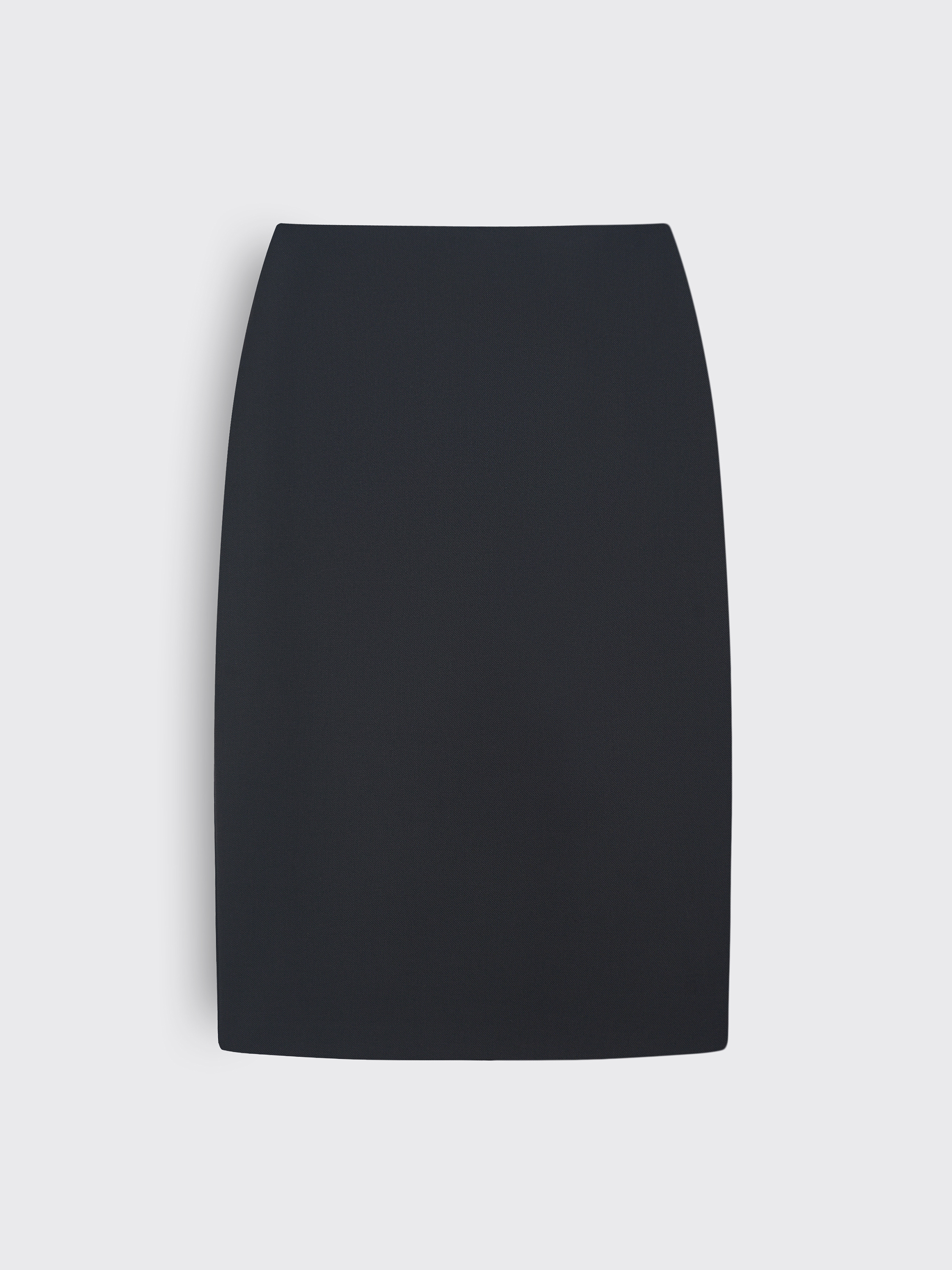Гладкое полотно с добавлением шерсти держит форму и визуально вытягивает силуэт, при этом остается комфортным на каждый день. Минималистичный крой с четкой линией талии создает чистую вертикаль, а потайная молния и декоративные прорезные карманы сзади поддерживают общий аккуратный ритм. Идеальна как в роли офисной базы, так и в контексте расслабленного образа с объемным трикотажем или рубашкой навыпуск.