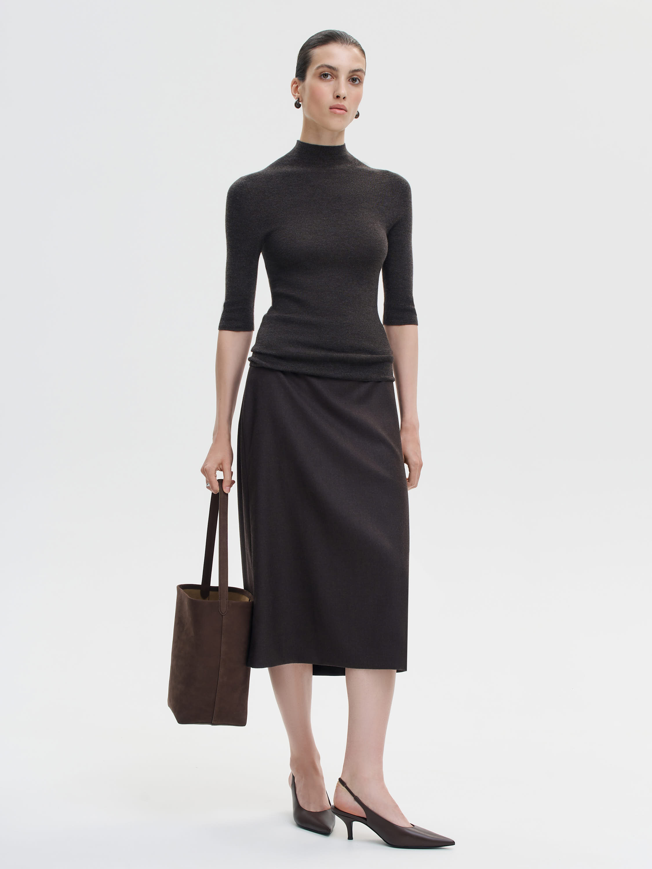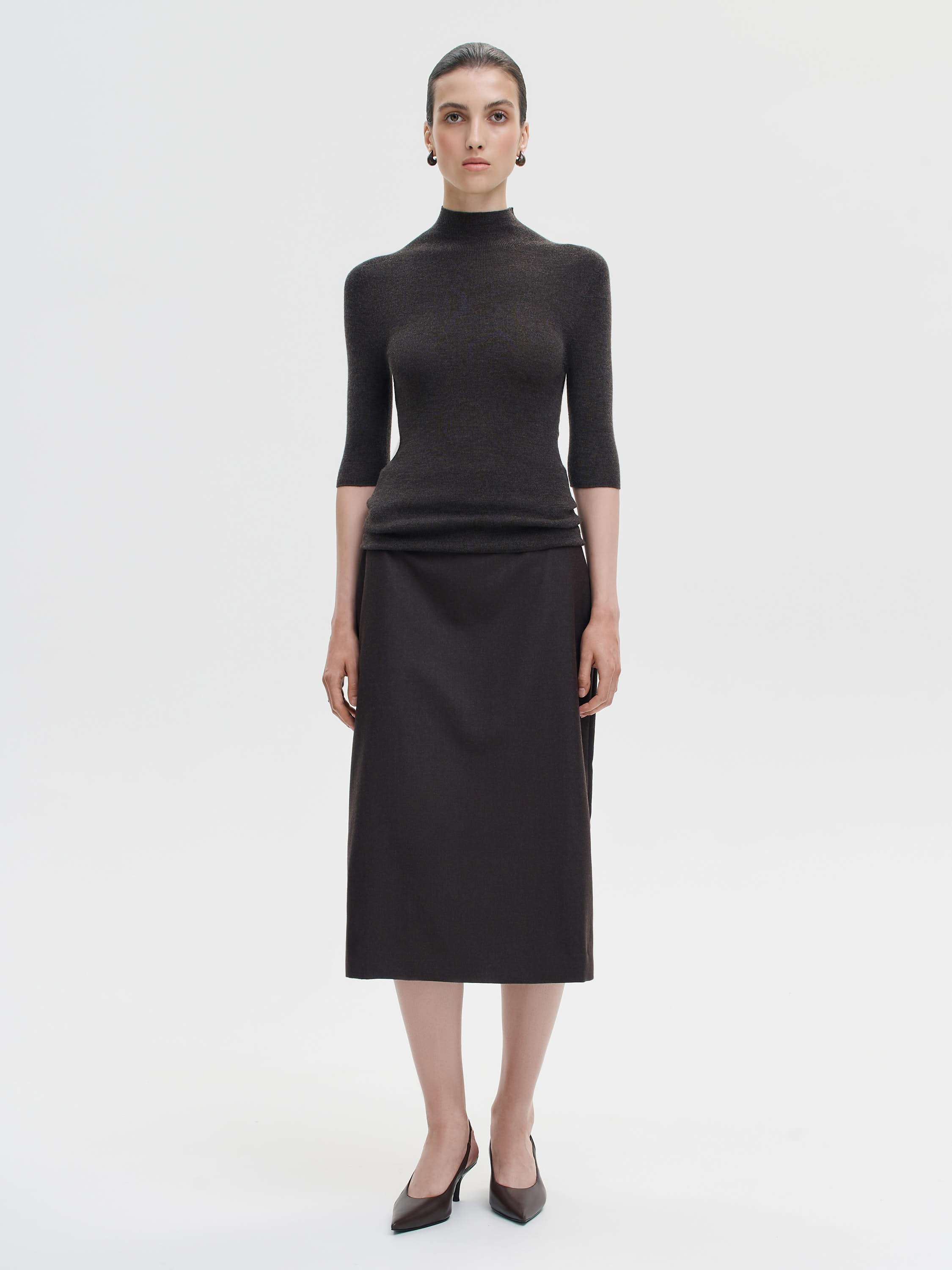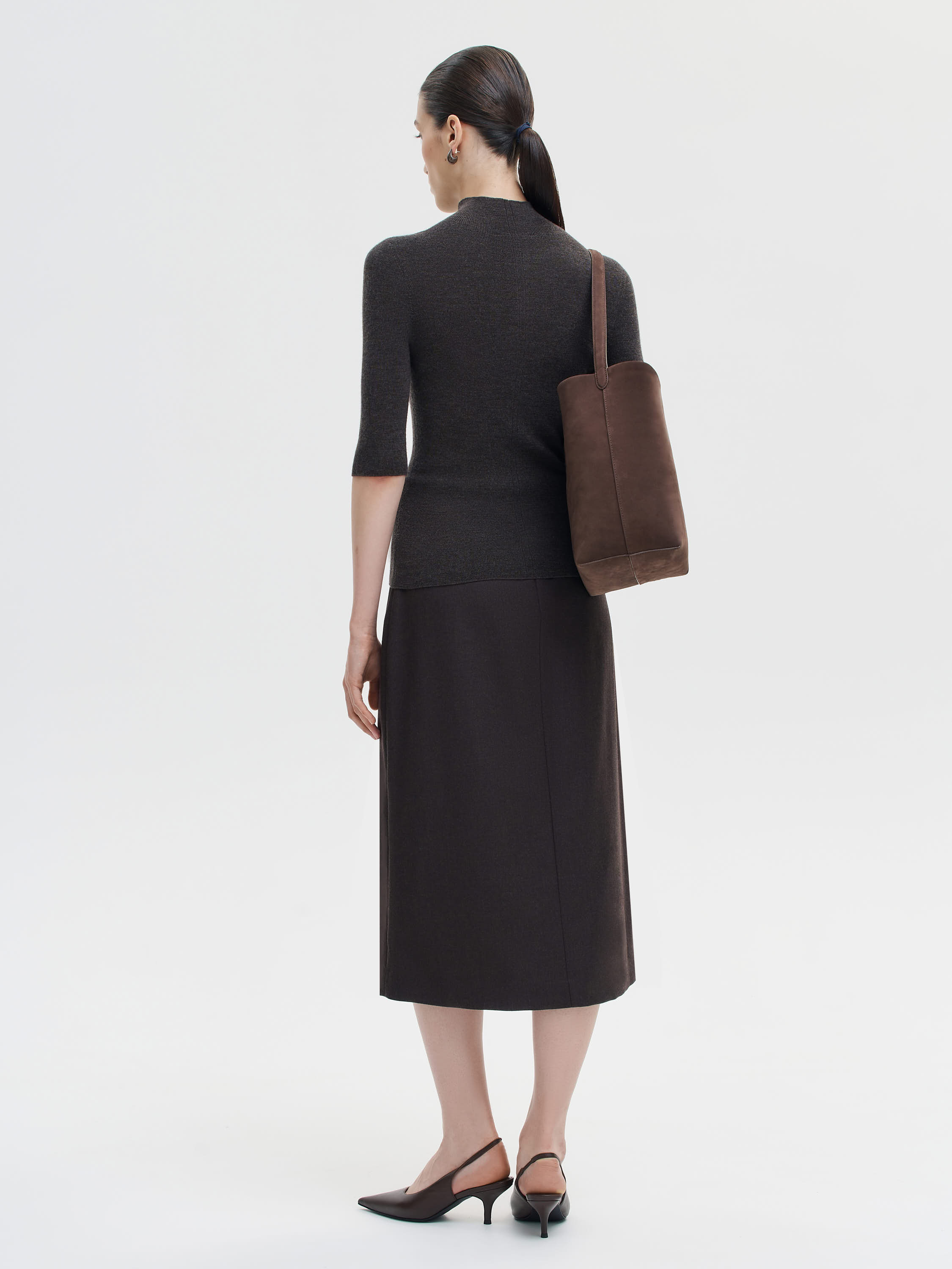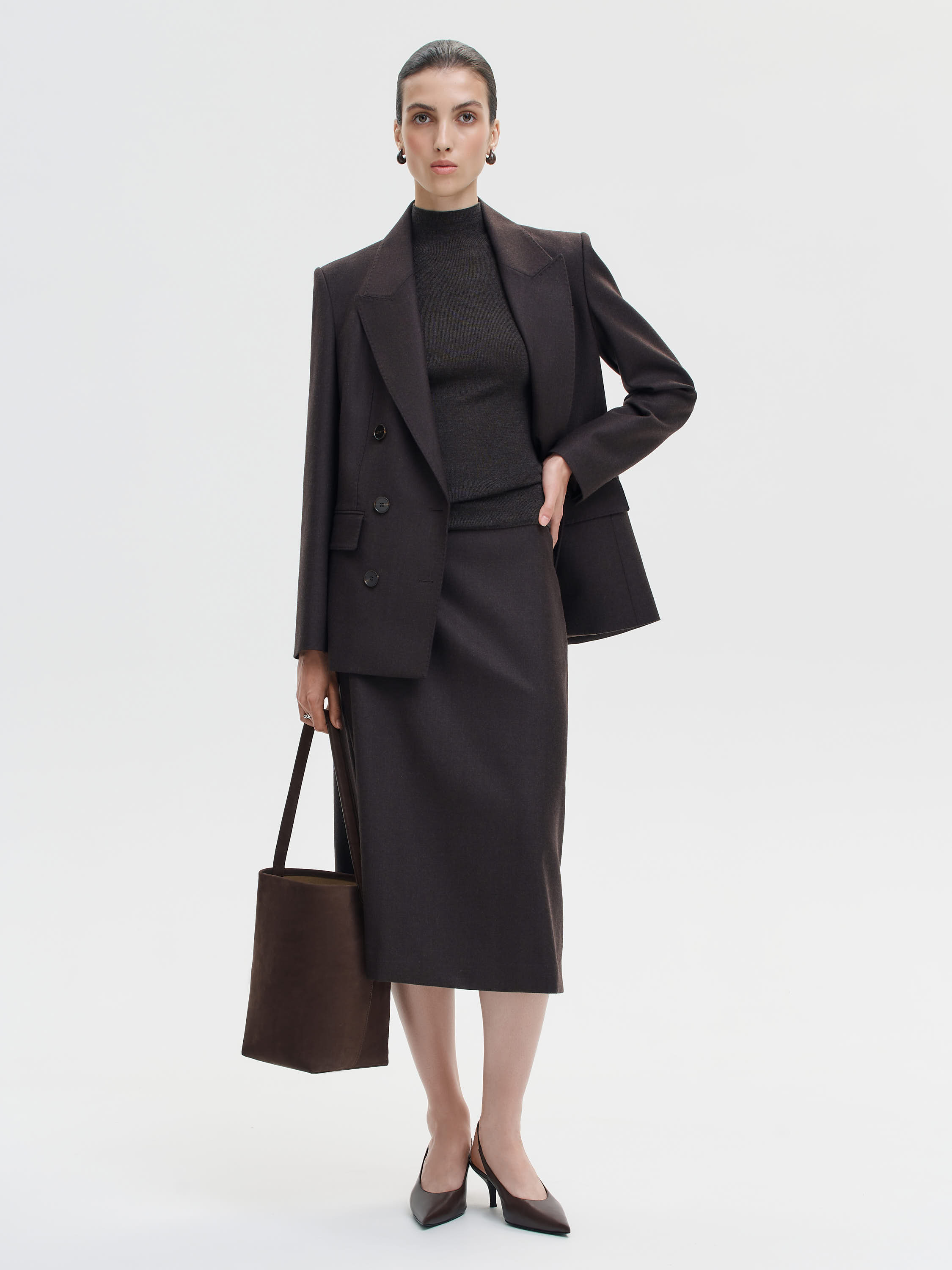 Сдержанная, точная по крою юбка длины миди, выполненная из гладкой костюмной шерсти. Прямой силуэт подчеркивает линию бедер, оставаясь при этом свободным в движении. Посадка на талии мягкая и комфортная, без утяжки, без лишних деталей. Отсутствие швов спереди и лаконичная отделка позволяют выстраивать чистые, сбалансированные образы как с тонким трикотажем, так и с мужскими рубашками, жакетами или пальто. Ткань обладает плотной, но пластичной структурой: не просвечивает, держит форму, дает нужное ощущение защищенности и собранности.