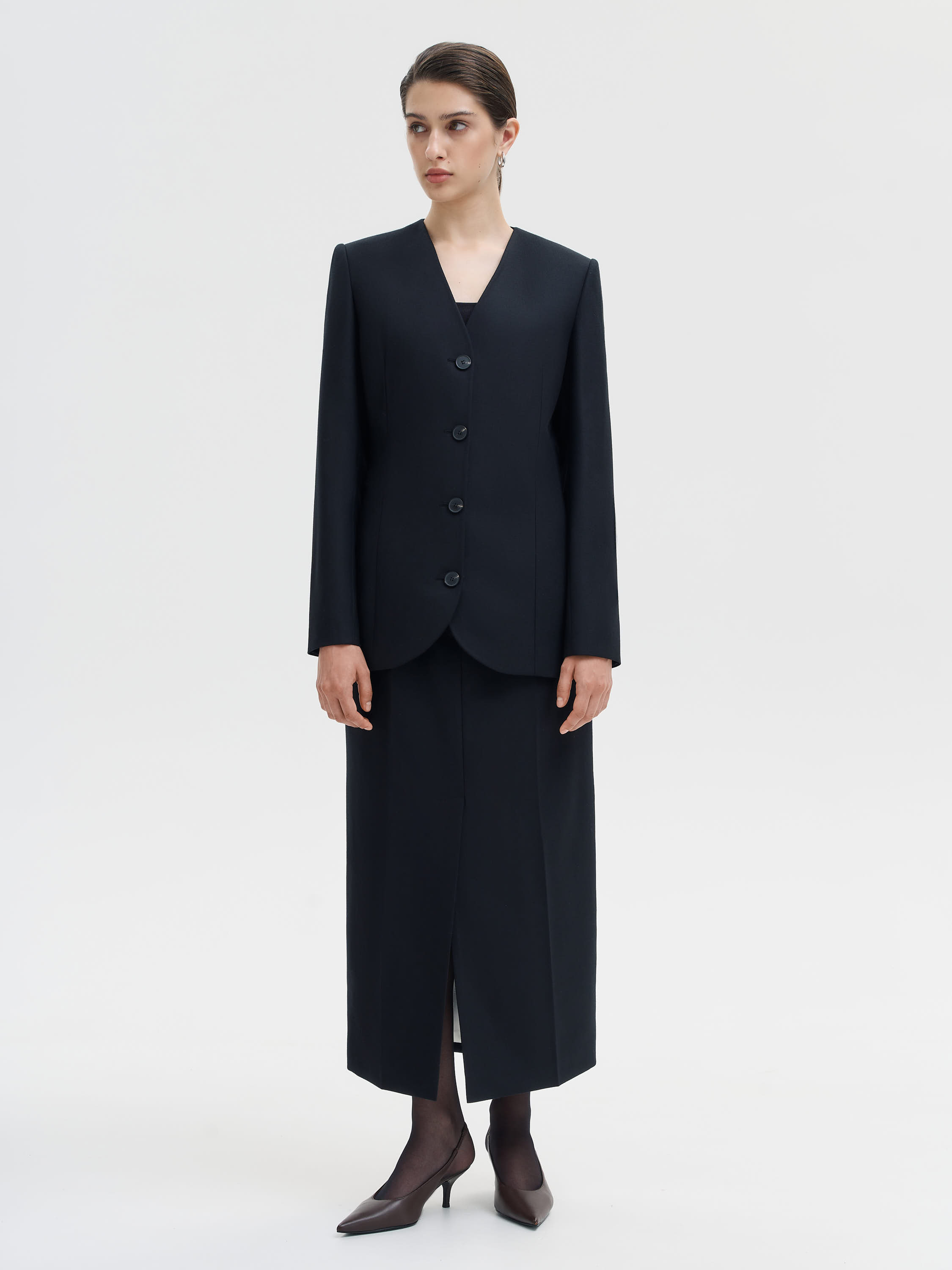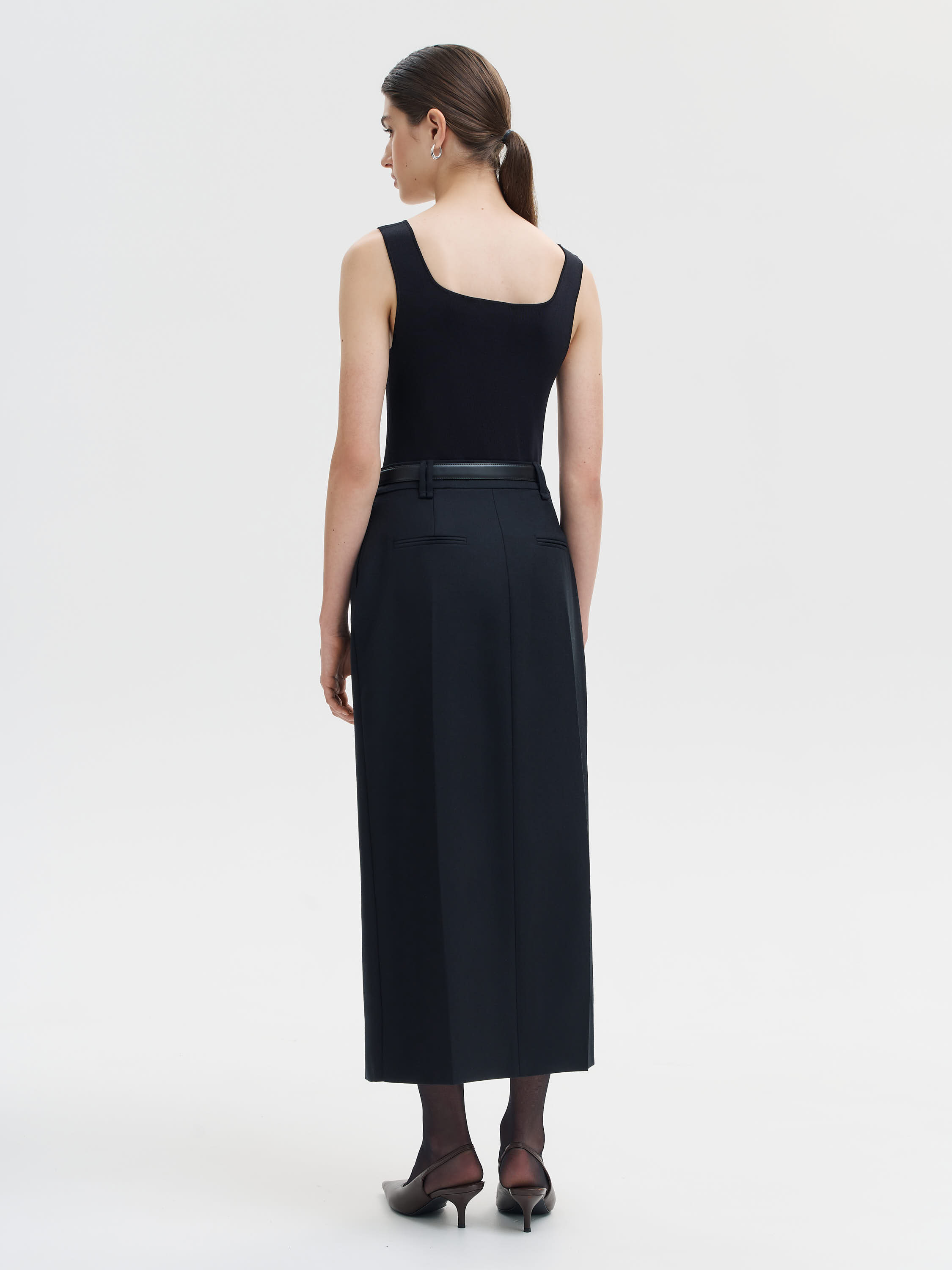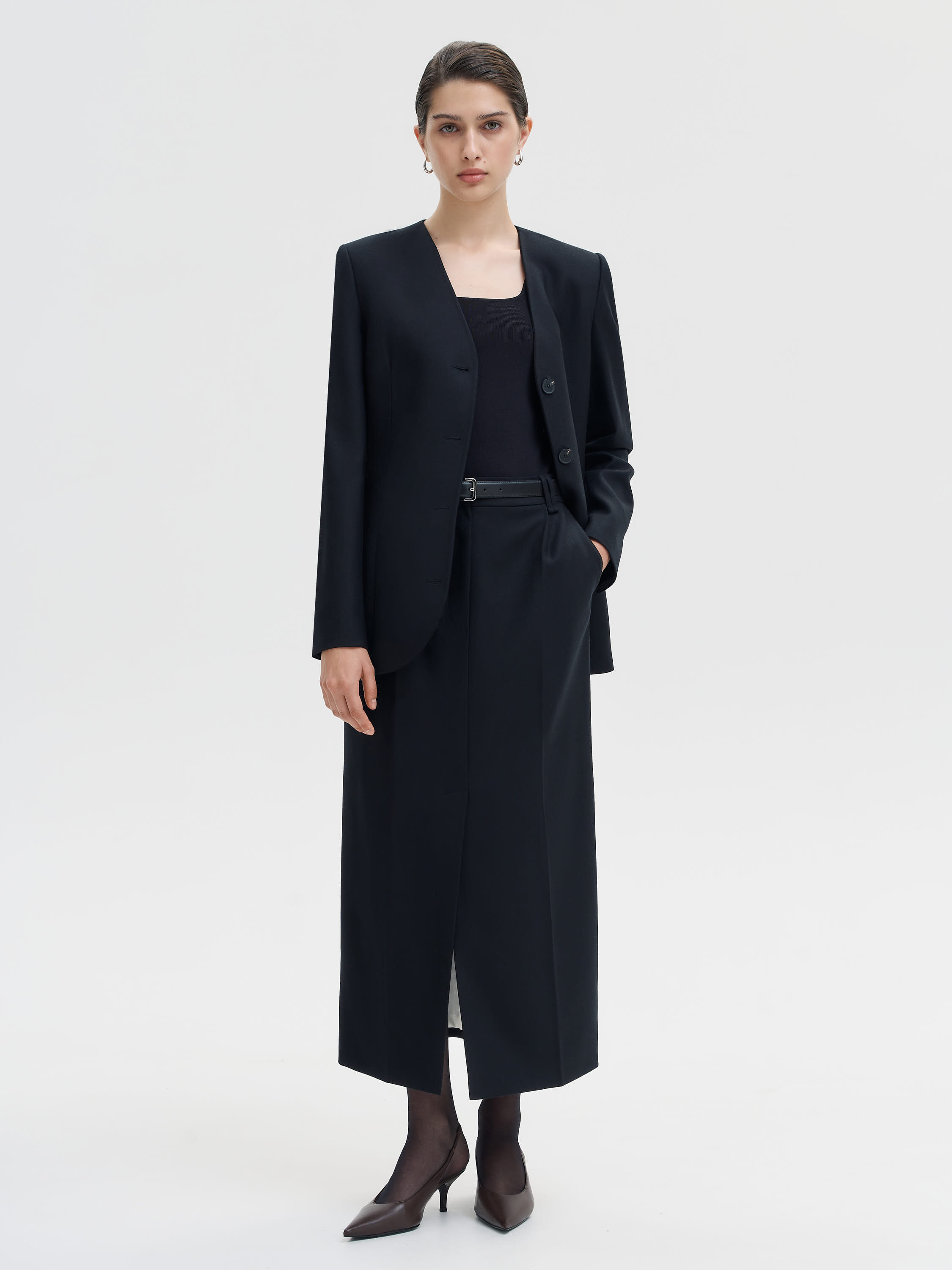 Лаконичная юбка длины миди из чистой шерсти. Чистые линии, продуманный крой и графичная длина — основа современного образа. Юбка выполнена из плотной шерсти с гладкой поверхностью, хорошо держит форму и создает вертикаль силуэта. Центральный шов с разрезом спереди добавляет удобства в движении и подчеркивает геометрию кроя. Лаконичный пояс со шлевками позволяет сочетать модель с ремнем. Юбка сочетается с жакетом из того же материала, но столь же выразительна и в соло с трикотажем, шелковыми блузами или структурными топами.