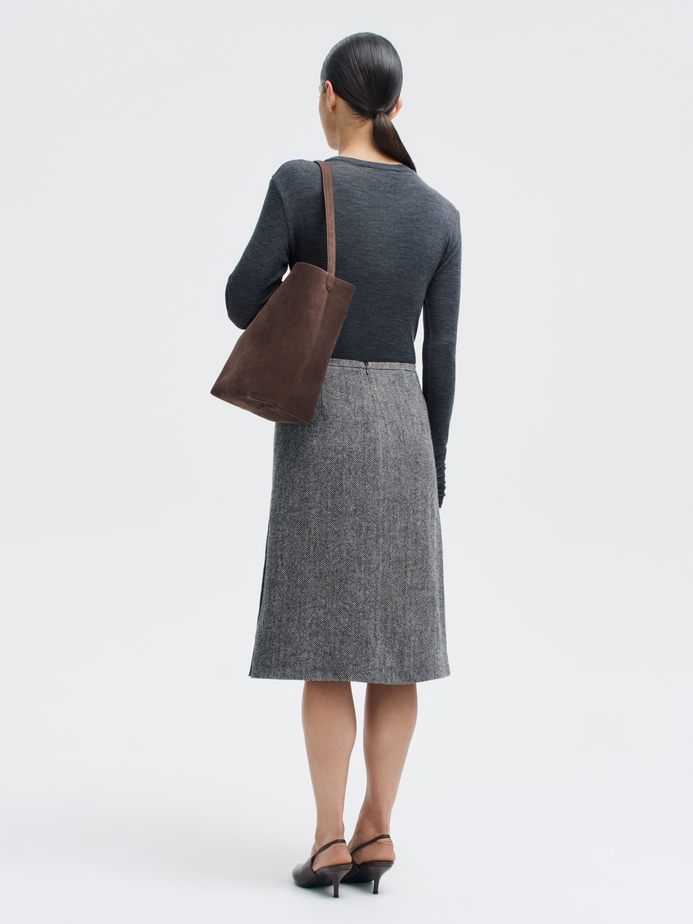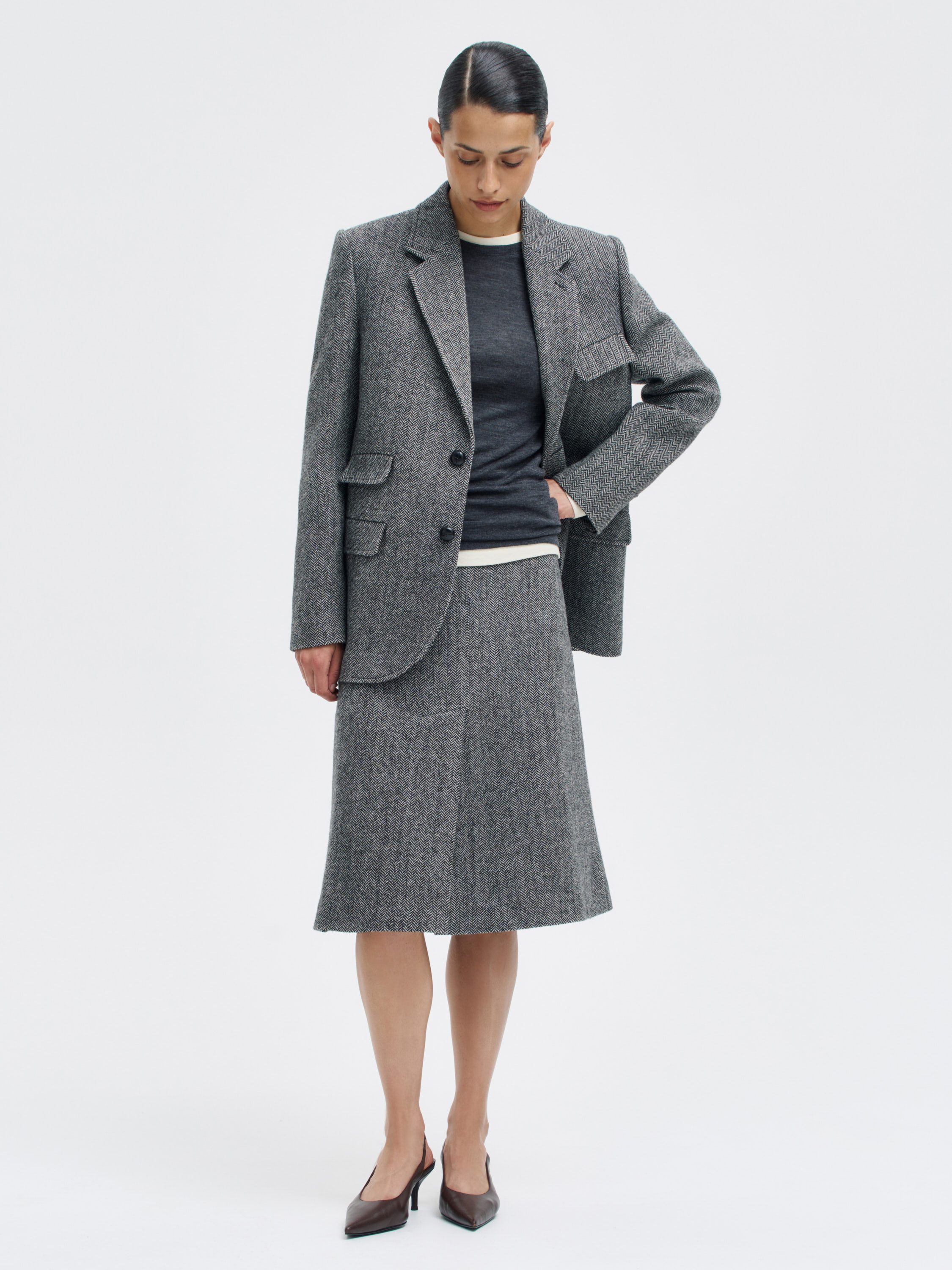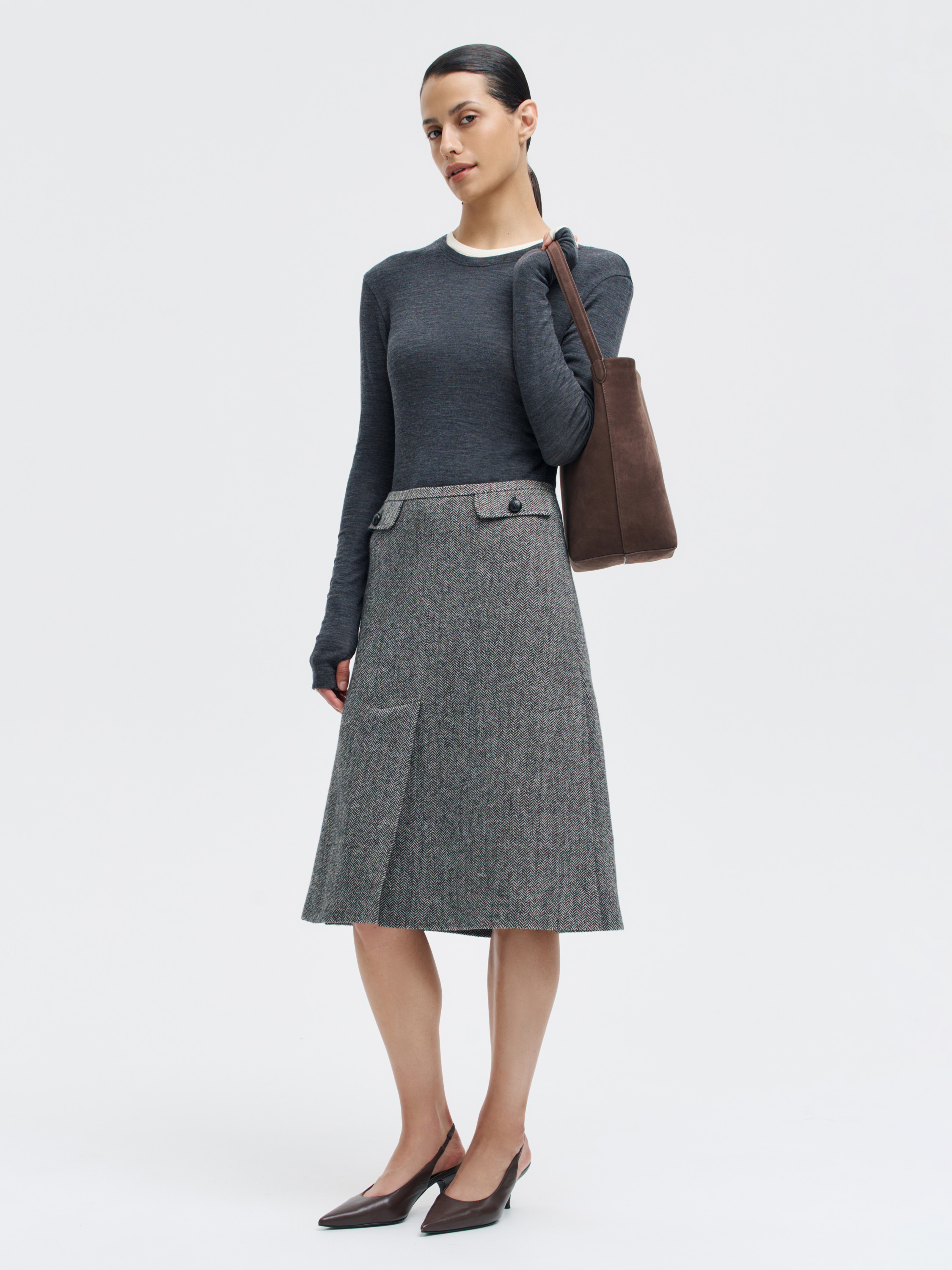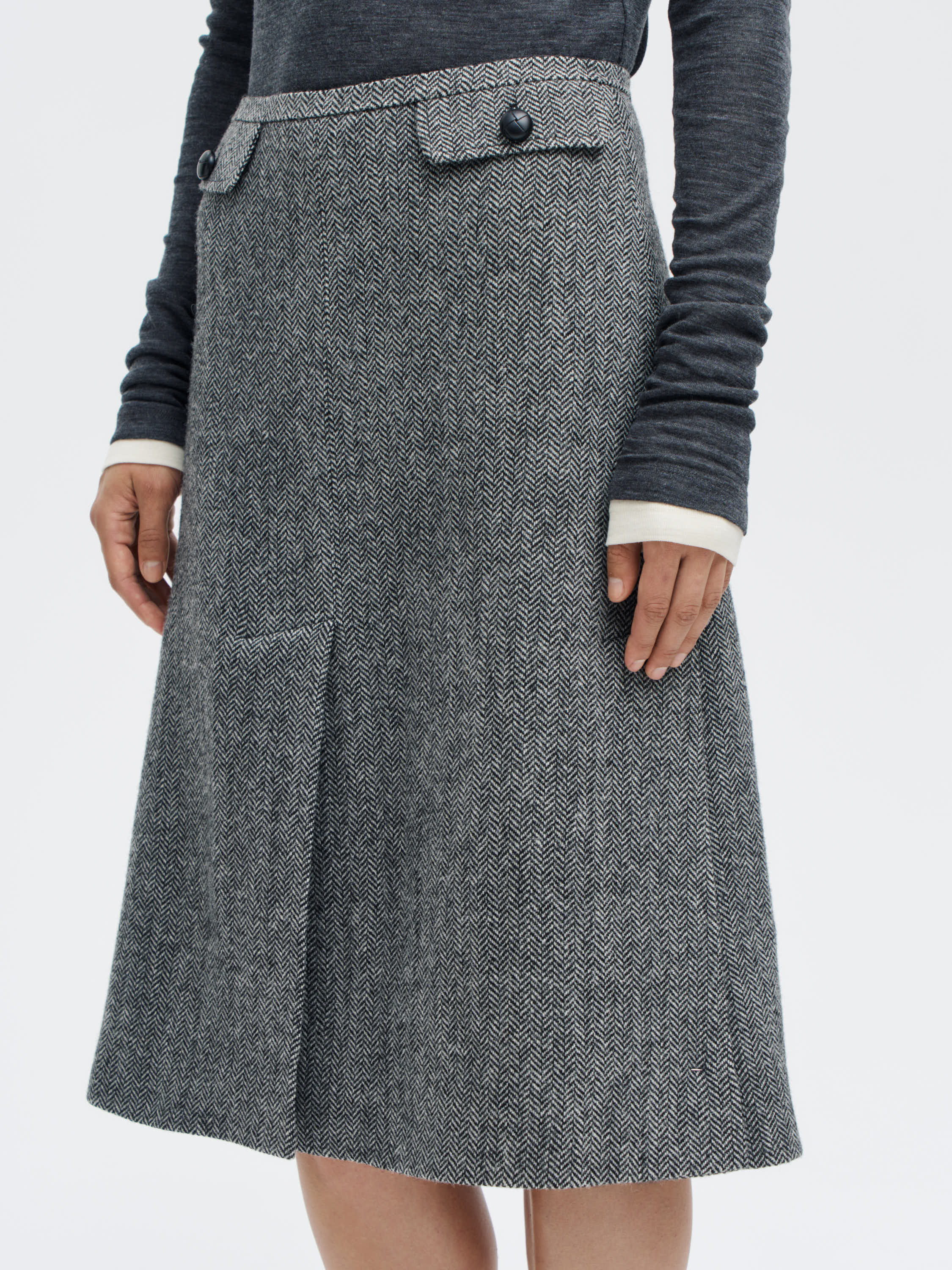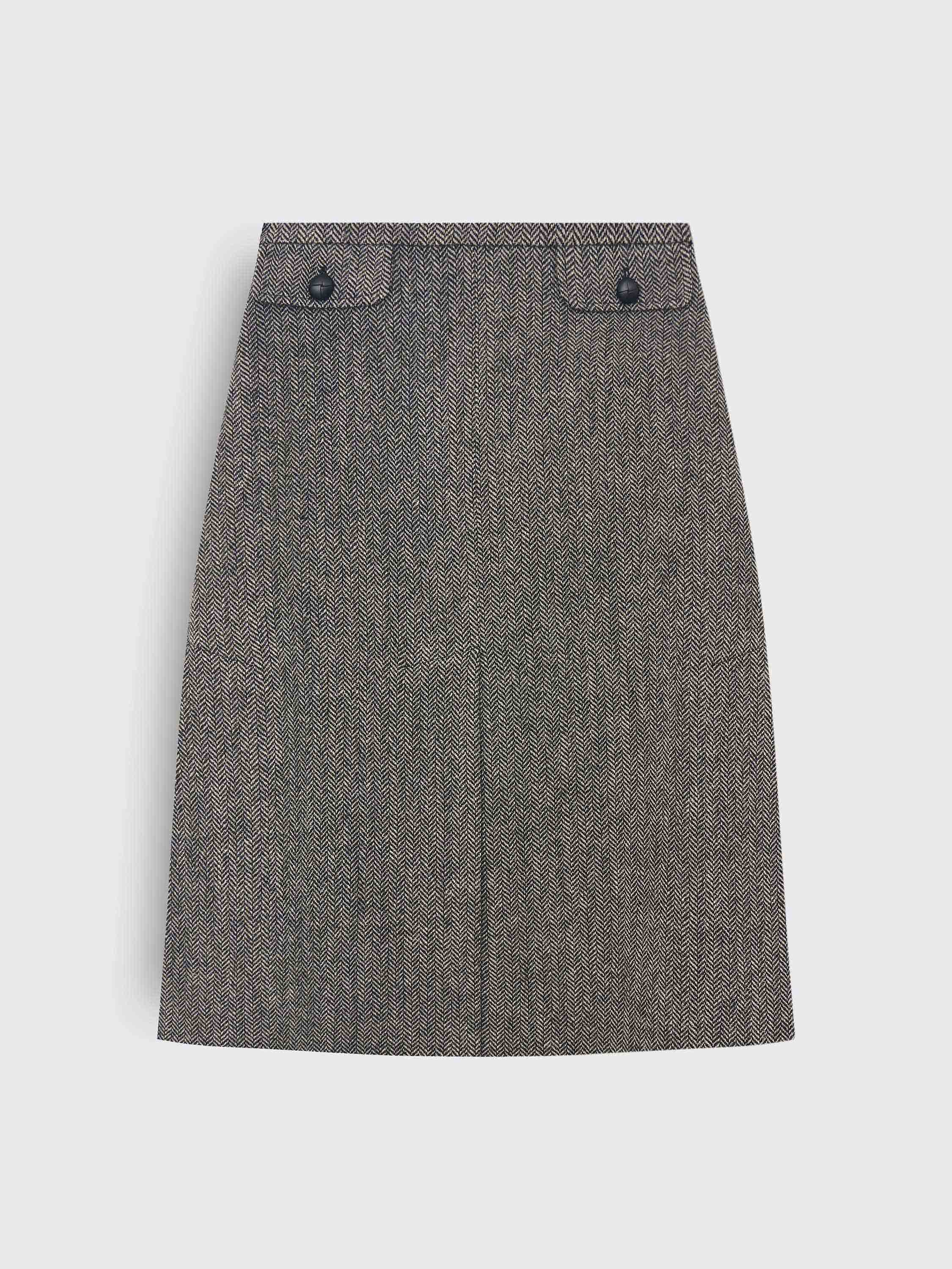 Юбка миди из 100% шерсти с выразительным твидовым переплетением. Модель выполнена из плотной, тактильной ткани с характерным рисунком «елочка» — она хорошо держит форму, при этом остается комфортной в носке и не перегревает. Слегка расклешенный силуэт с мягкими складками обеспечивает свободу движений и подчеркивает архитектуру кроя. Детали в духе ретро — широкие клапаны с пуговицами и аккуратный шов по центру — добавляют образу сдержанную графику. Юбка будет уместна и в офисной стилистике, и в расслабленных повседневных образах с трикотажем или рубашками.