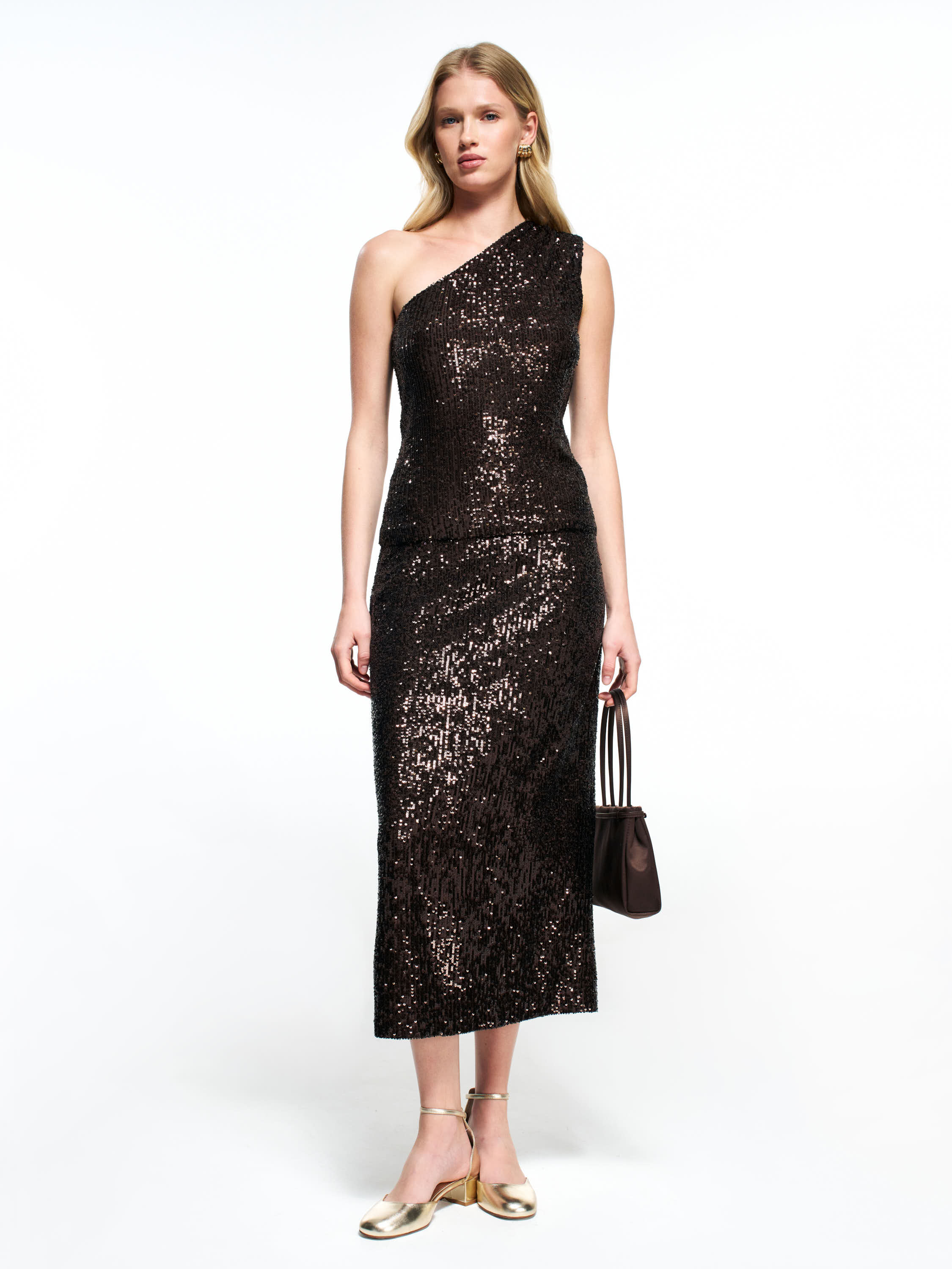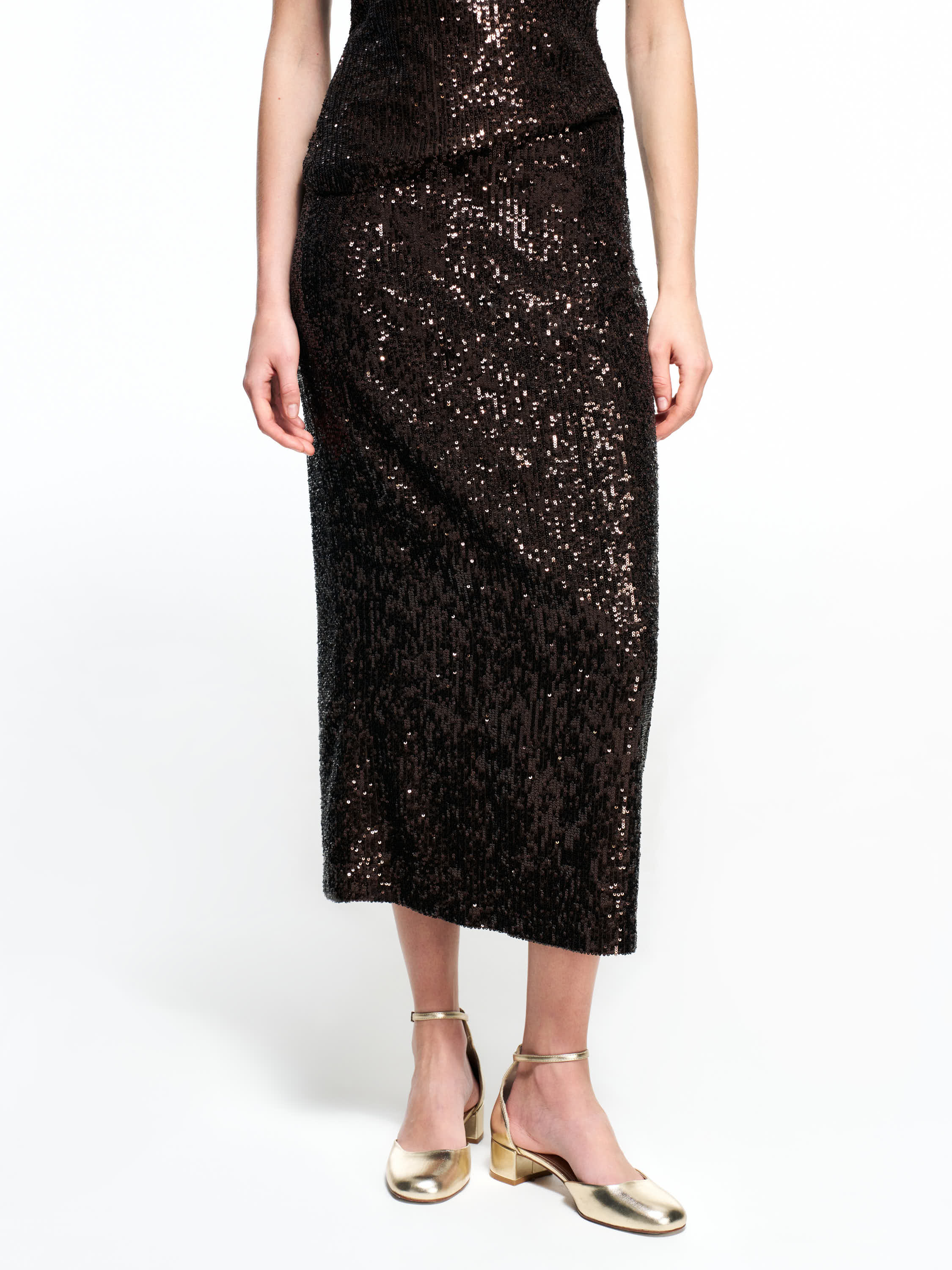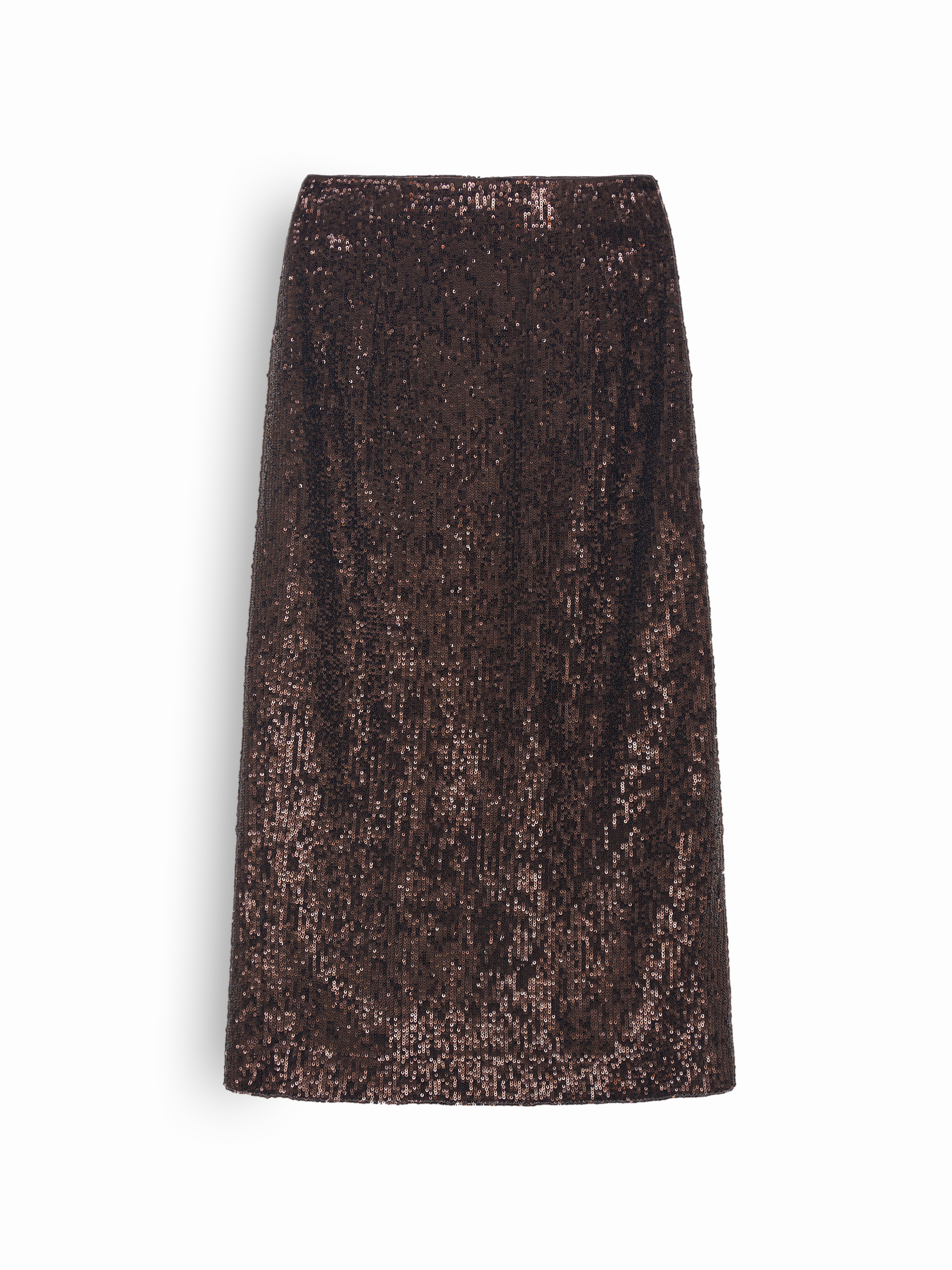 Юбка миди с полной вышивкой пайетками — акцентная модель с ровным силуэтом и чистой вертикалью. Полотно плотное, гибкое, создает выразительную игру блеска при движении. Посадка прямая, с аккуратным прилеганием по талии и бедрам без жесткости. Длина миди визуально вытягивает силуэт и делает модель уместной для вечерних выходов. Юбка сочетается с топами из той же группы, лаконичными блузами и жакетами строгого кроя, формируя собранные праздничные комплекты.