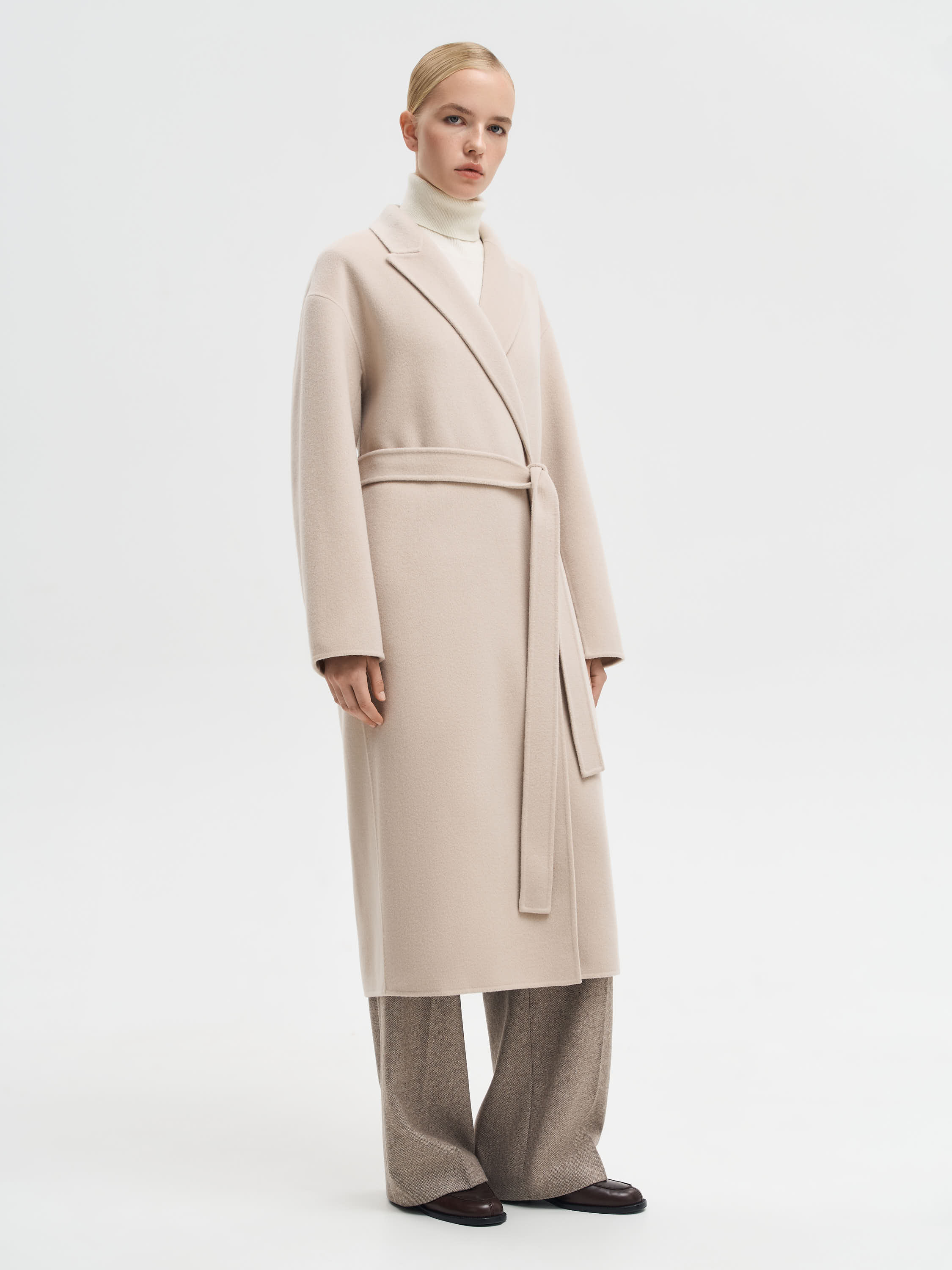 Пальто с запахом из плотного полотна на основе шерсти мериноса с добавлением кашемира и полиэстера. Материал устойчив к деформациям, при этом сохраняет мягкость и тактильное тепло, а благодаря шерстяной основе хорошо держит форму. Классический крой дополнен широким поясом, позволяющим подчеркнуть талию или оставить силуэт свободным. Английский воротник придает модели сдержанную элегантность, а длина миди делает ее универсальной для разных комплектов. Пальто гармонично вписывается в деловой и повседневный гардероб, сочетаясь с платьями, брюками и трикотажем, и подходит как для городской носки, так и для более собранных образов.