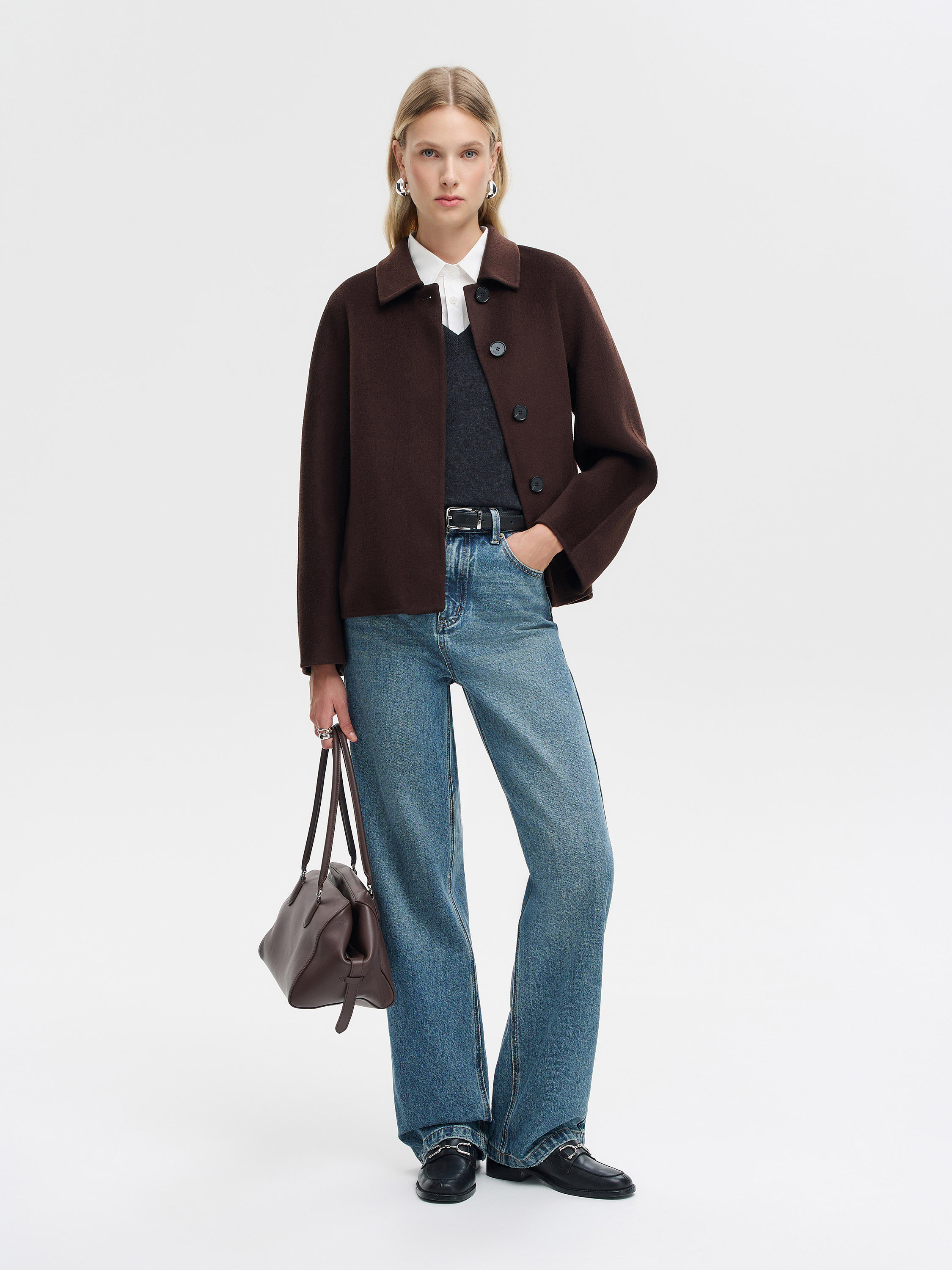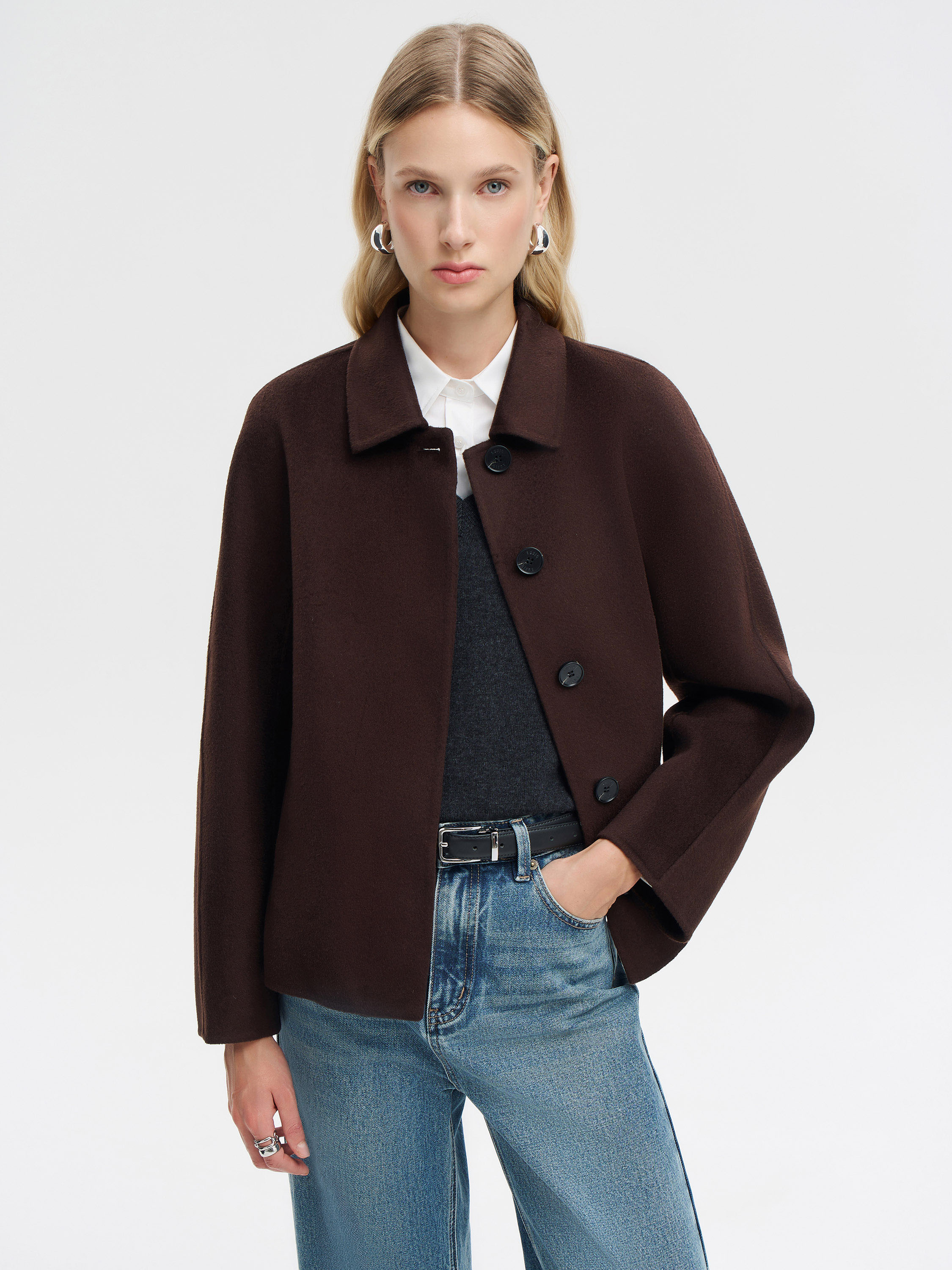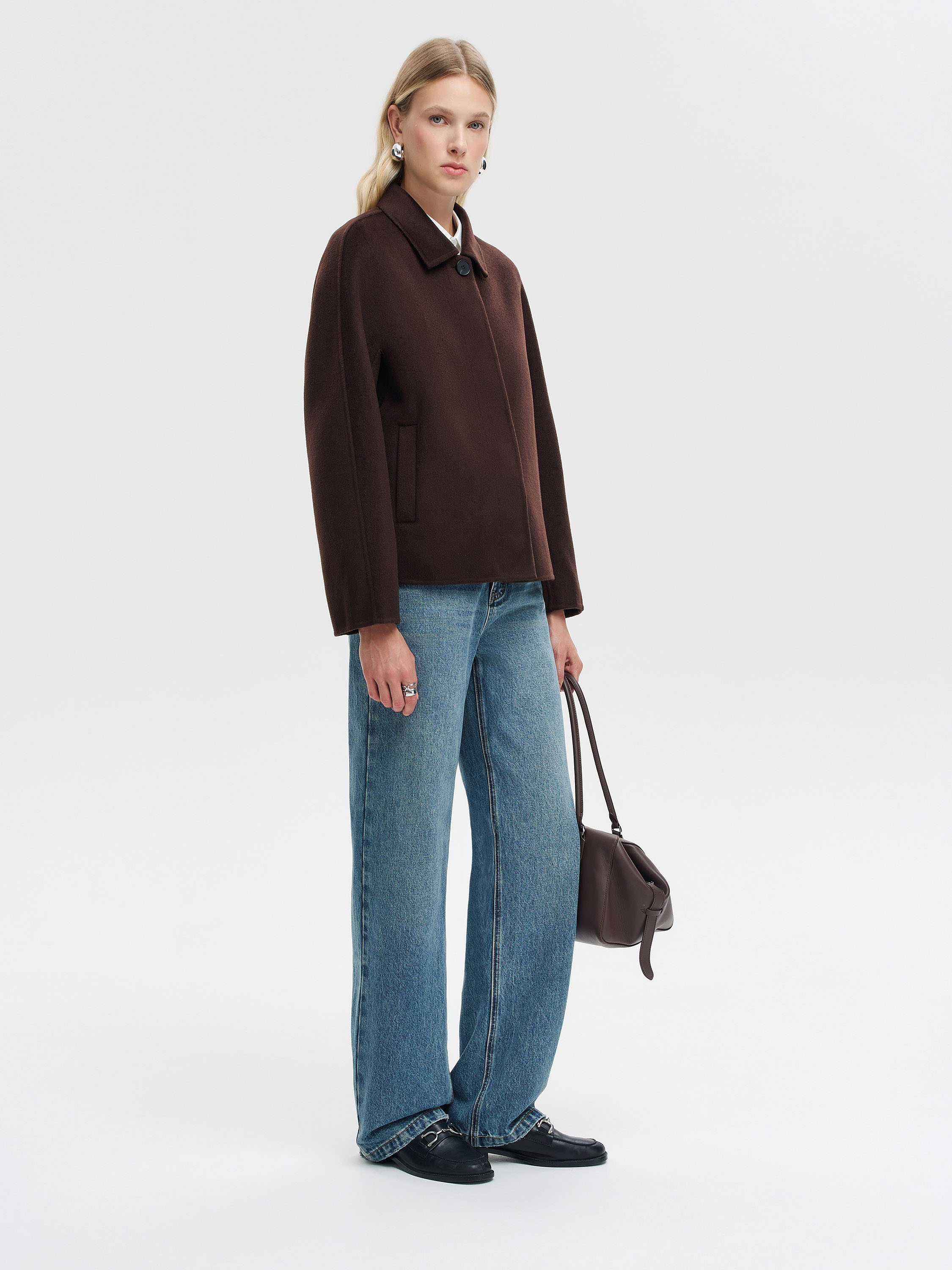 Укороченное пальто из шерсти и кашемира с лаконичным дизайном и аккуратным силуэтом. Материал с высоким содержанием шерсти и добавлением кашемира отличается мягкой фактурой, комфортным теплом и благородным внешним видом. Крой прямой, с классическим отложным воротником, скрытой застежкой на пуговицы и боковыми прорезными карманами. Длина до линии бедра делает модель универсальной: пальто гармонично вписывается как в повседневные ансамбли с джинсами и трикотажем, так и в более строгие комплекты с брюками и рубашками.