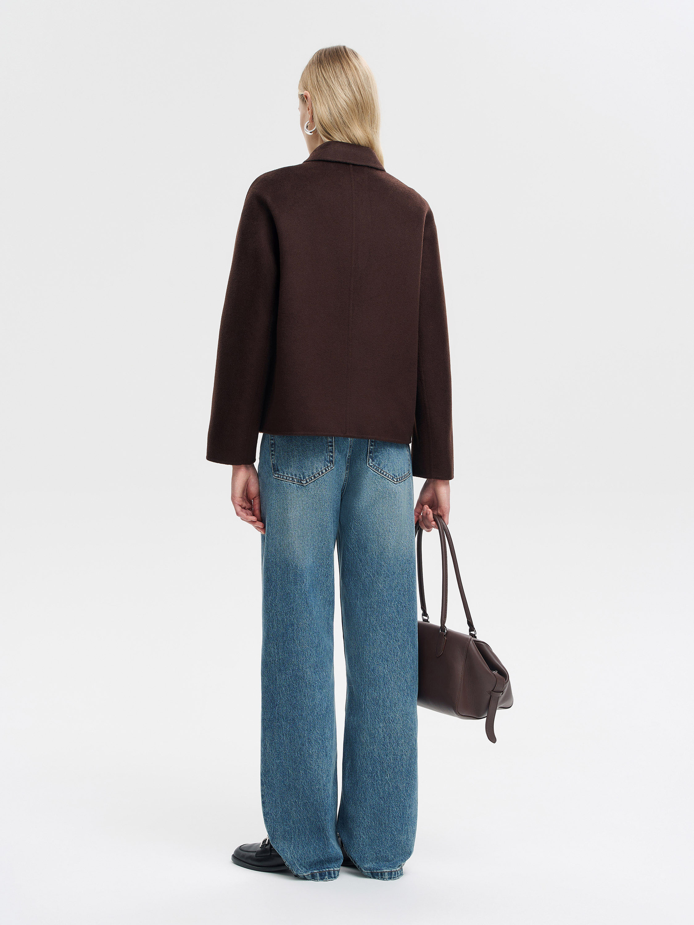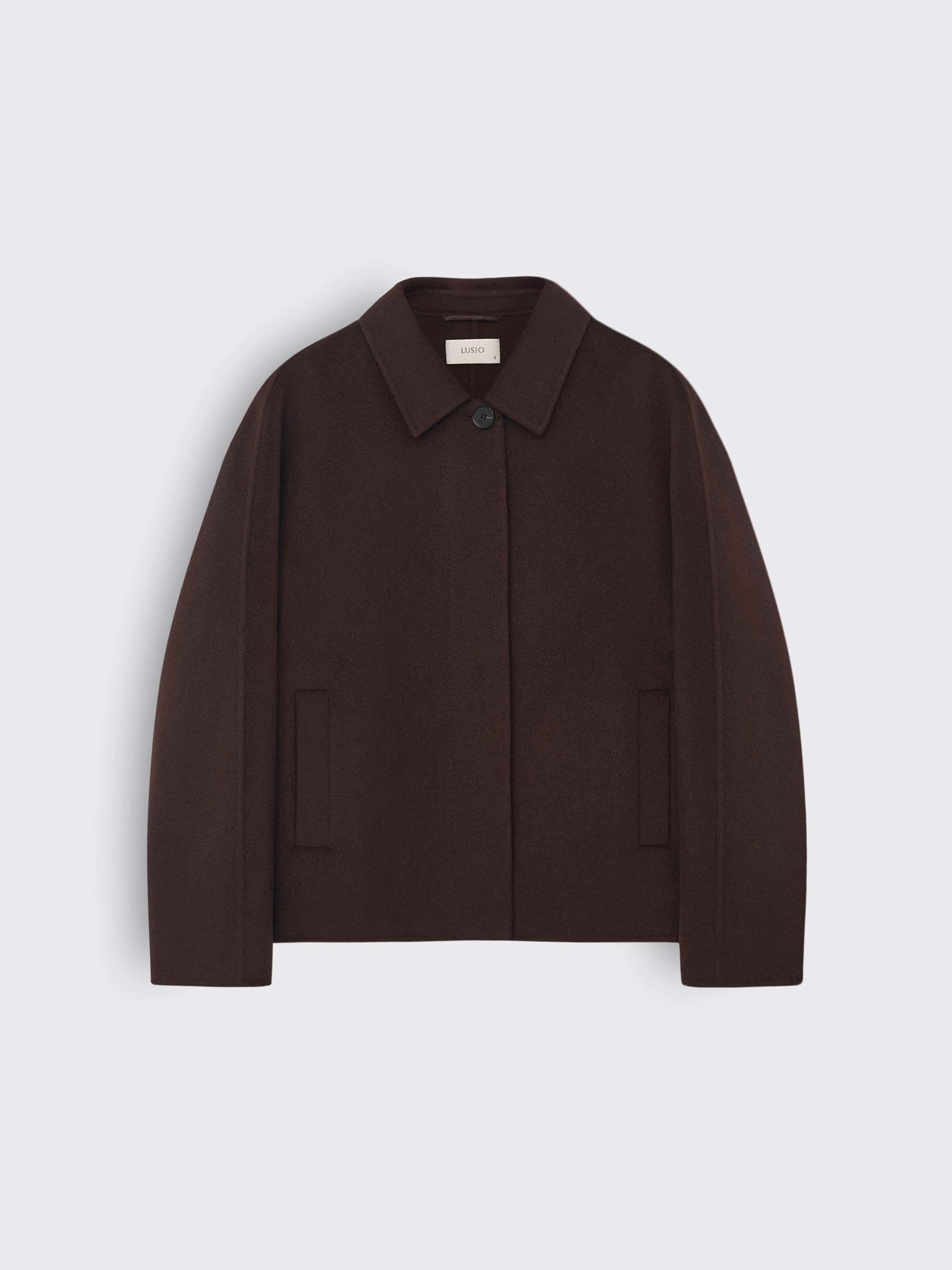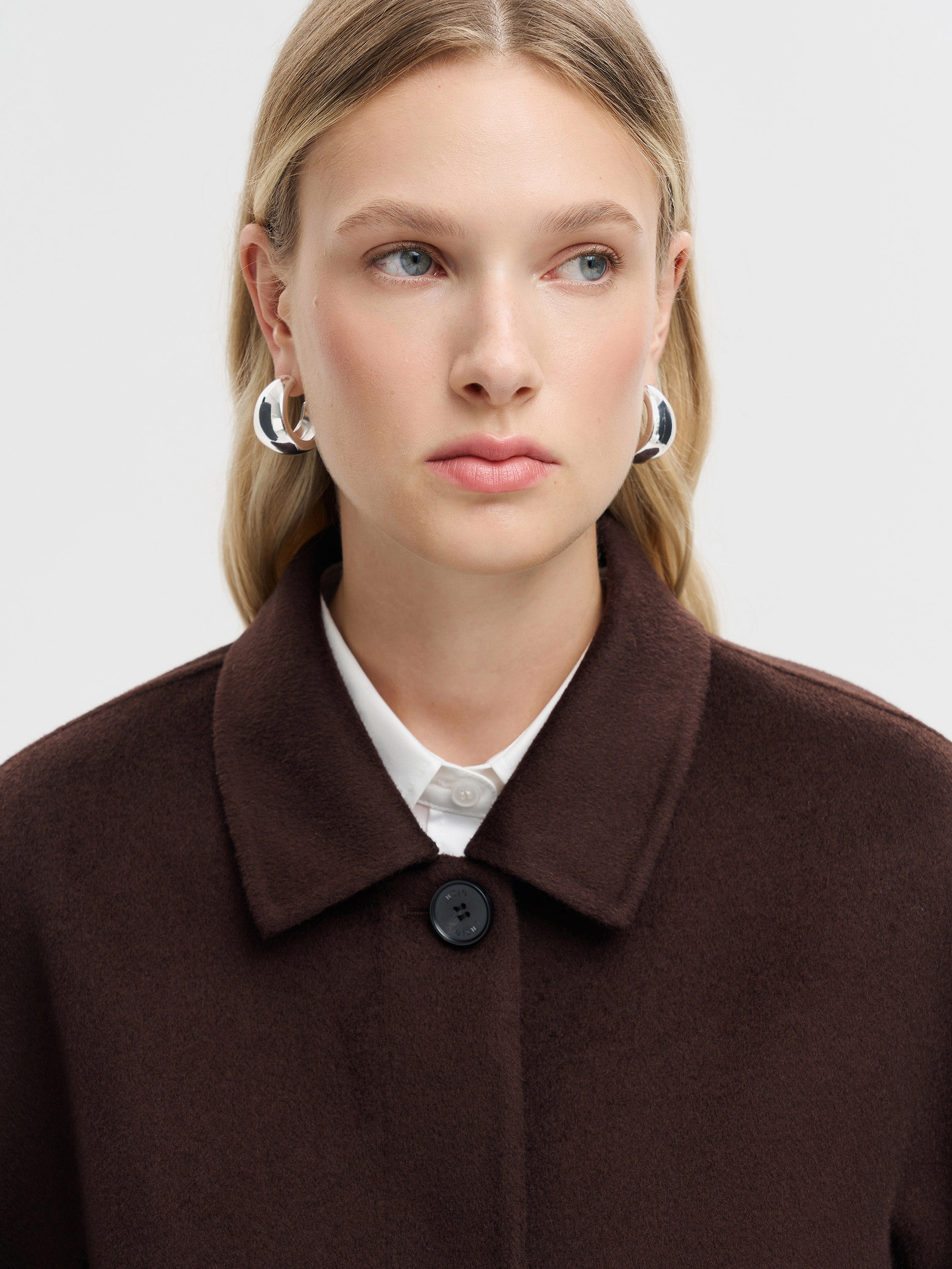 Укороченное пальто из шерсти и кашемира с лаконичным дизайном и аккуратным силуэтом. Материал с высоким содержанием шерсти и добавлением кашемира отличается мягкой фактурой, комфортным теплом и благородным внешним видом. Крой прямой, с классическим отложным воротником, скрытой застежкой на пуговицы и боковыми прорезными карманами. Длина до линии бедра делает модель универсальной: пальто гармонично вписывается как в повседневные ансамбли с джинсами и трикотажем, так и в более строгие комплекты с брюками и рубашками.