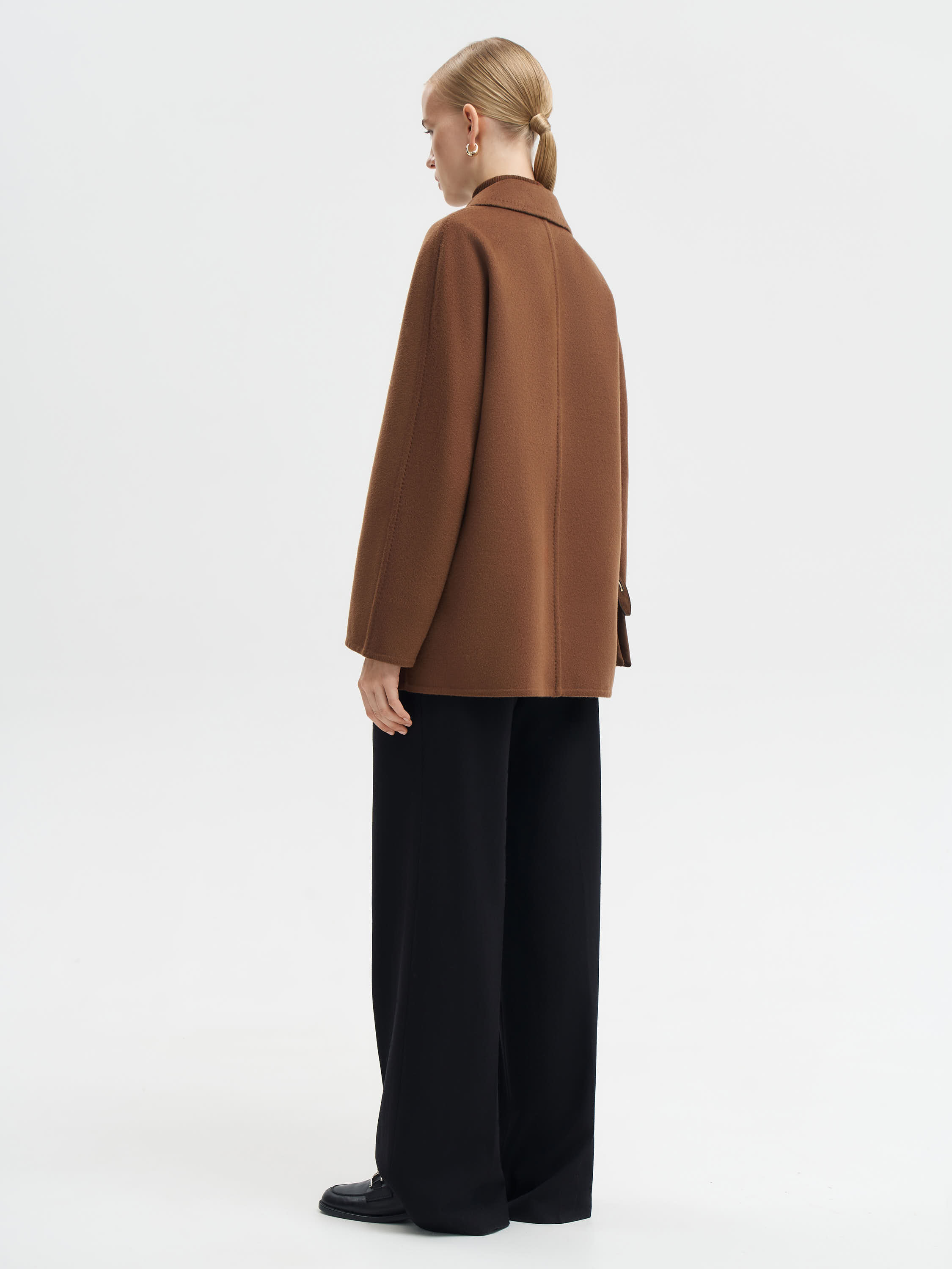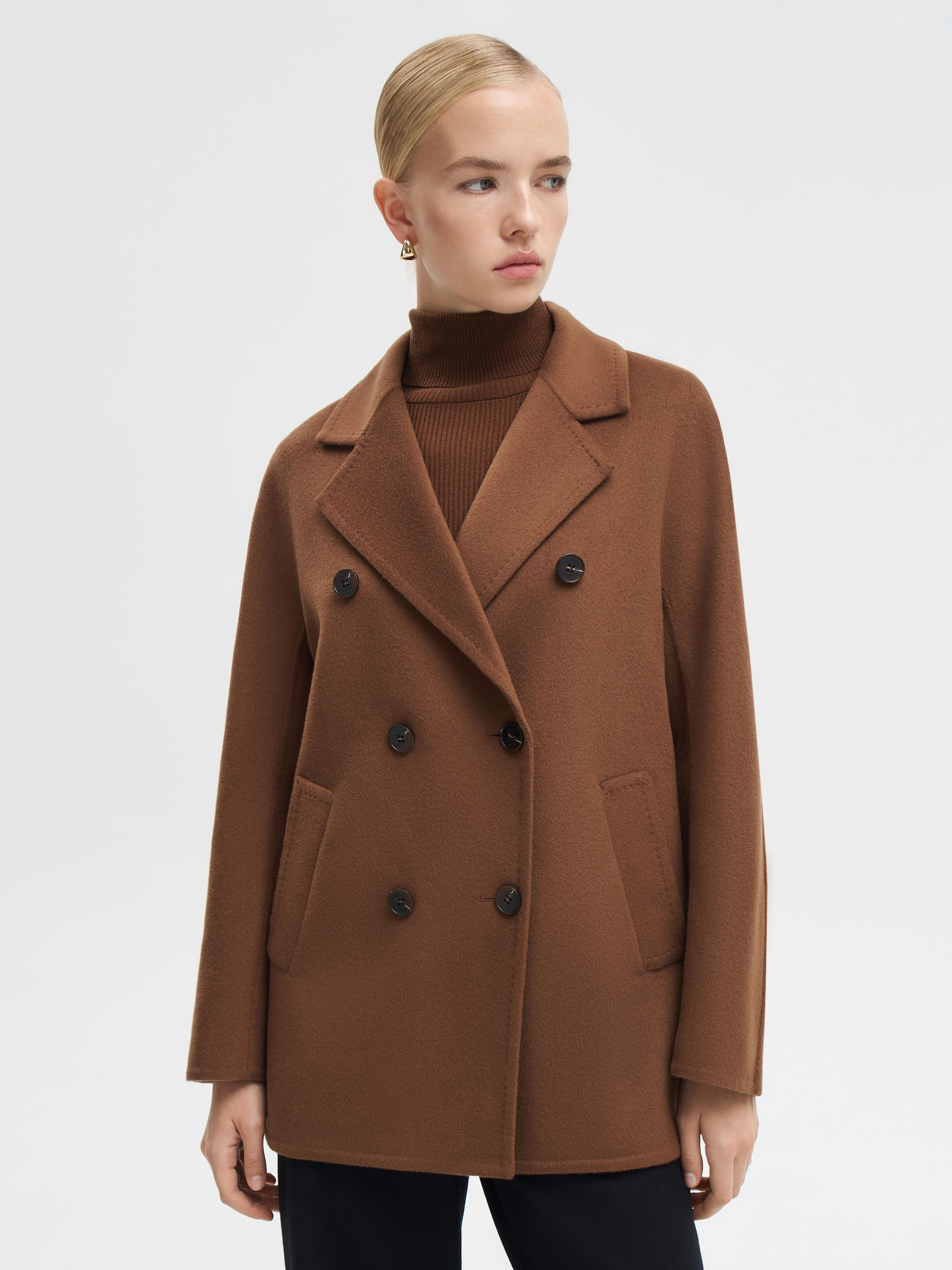 Пальто двубортного кроя из шерсти с добавлением шелка. Плотное полотно сохраняет форму и при этом отличается мягкостью и пластичностью. Классические лацканы и аккуратные прорезные карманы подчеркивают лаконичный характер модели, а средняя длина делает ее универсальной для повседневных и деловых комплектов. Четкие линии силуэта сочетаются с комфортной посадкой, позволяя пальто оставаться базовой и в то же время выразительной частью гардероба.