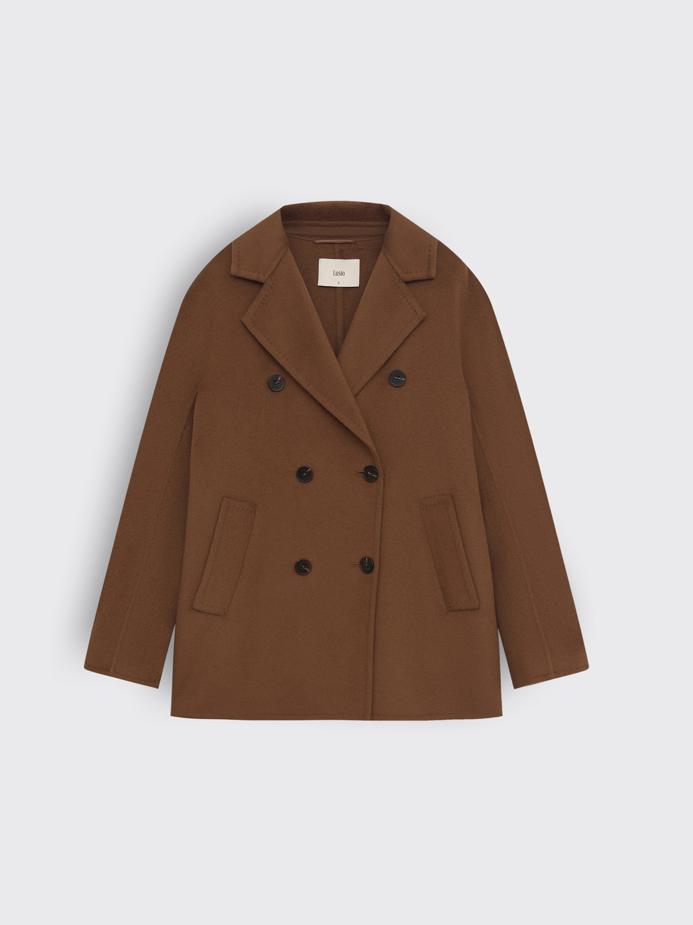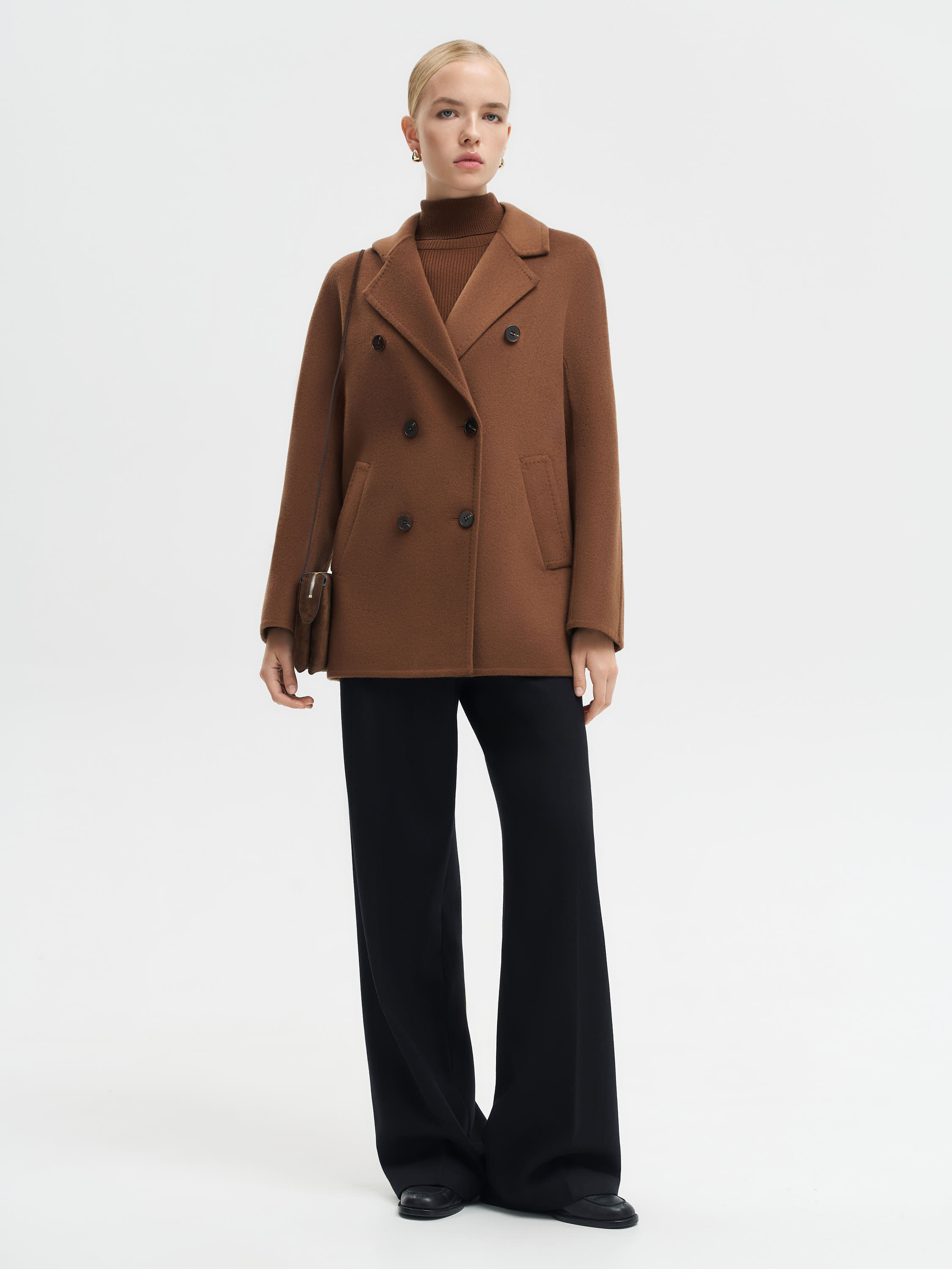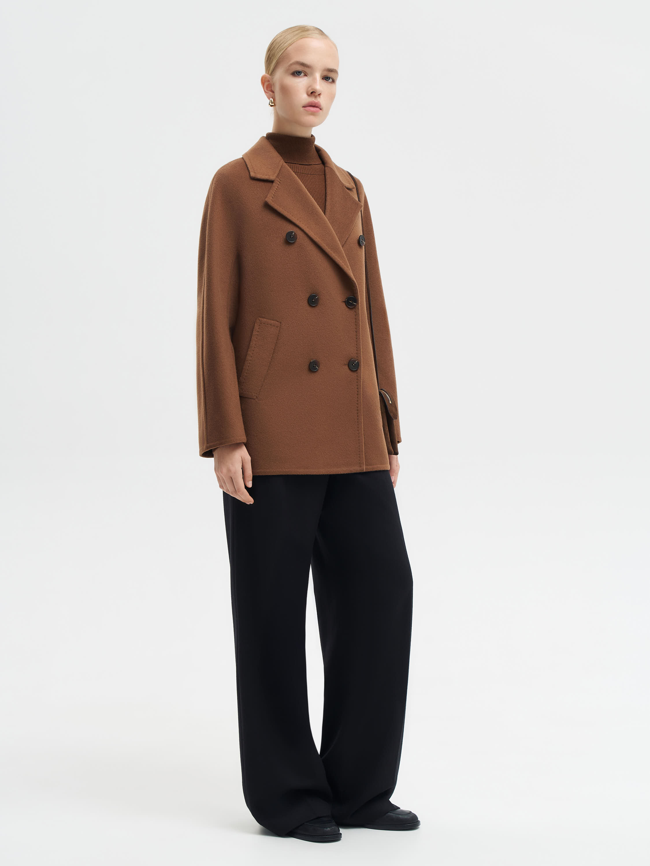 Пальто двубортного кроя из шерсти с добавлением шелка. Плотное полотно сохраняет форму и при этом отличается мягкостью и пластичностью. Классические лацканы и аккуратные прорезные карманы подчеркивают лаконичный характер модели, а средняя длина делает ее универсальной для повседневных и деловых комплектов. Четкие линии силуэта сочетаются с комфортной посадкой, позволяя пальто оставаться базовой и в то же время выразительной частью гардероба.