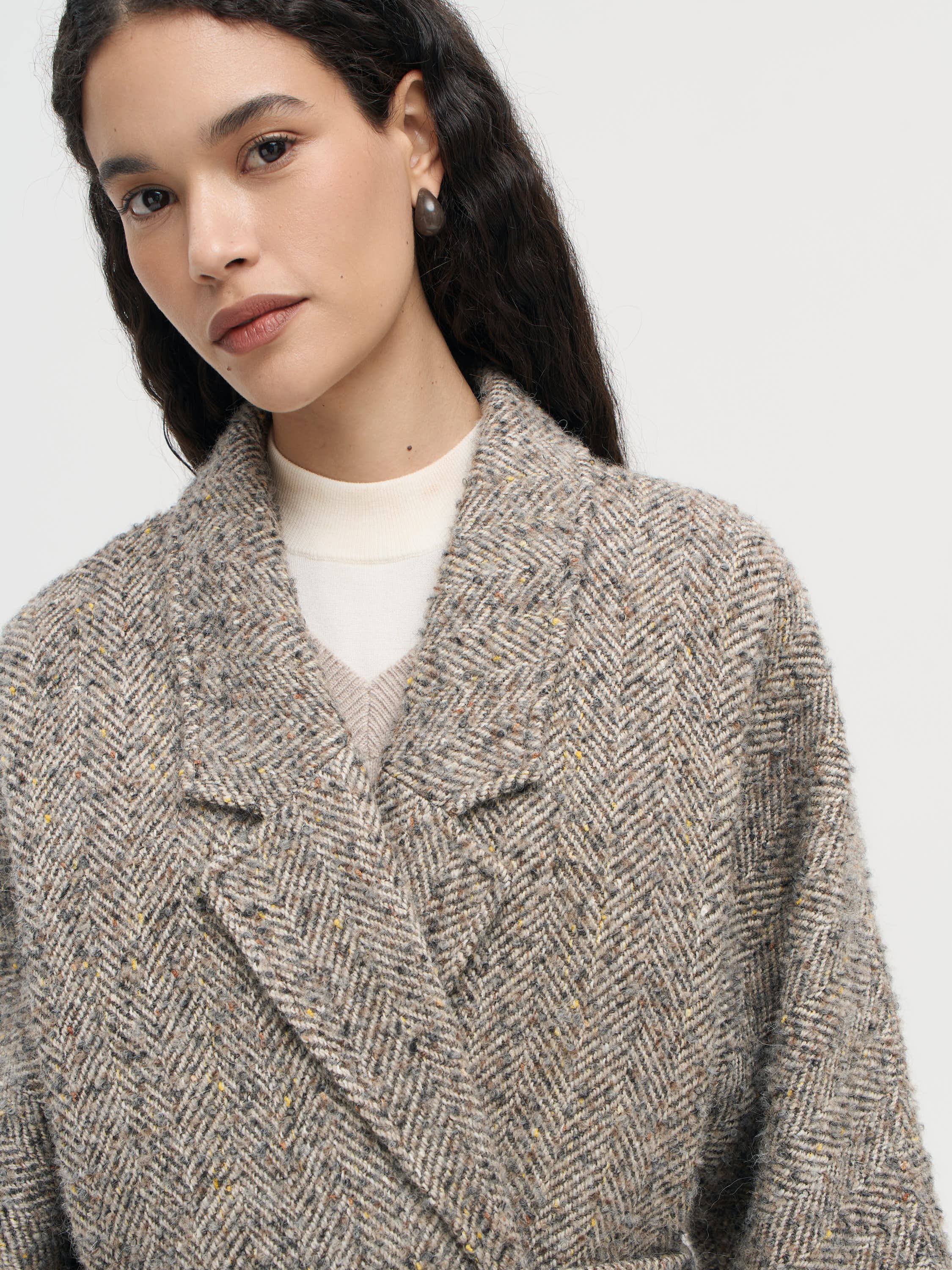 Пальто прямого кроя из теплого смесового твида с высоким содержанием шерсти и добавлением альпаки. Плотное полотно с выразительным плетением «елочка» сохраняет тепло, дышит и приятно ощущается на коже, а вискоза в составе придает ткани мягкость. Модель выполнена на подкладке, с классическим отложным воротником и узкими лацканами. Съемный пояс из той же ткани позволяет варьировать посадку и акцентировать талию, а свободная линия плеч и прямые рукава обеспечивают комфортное прилегание и свободу движения. Нейтральная гамма и лаконичный силуэт делают пальто универсальным элементом для повседневных и деловых образов, подходящим для многослойных комбинаций с жакетами, свитерами и платьями.