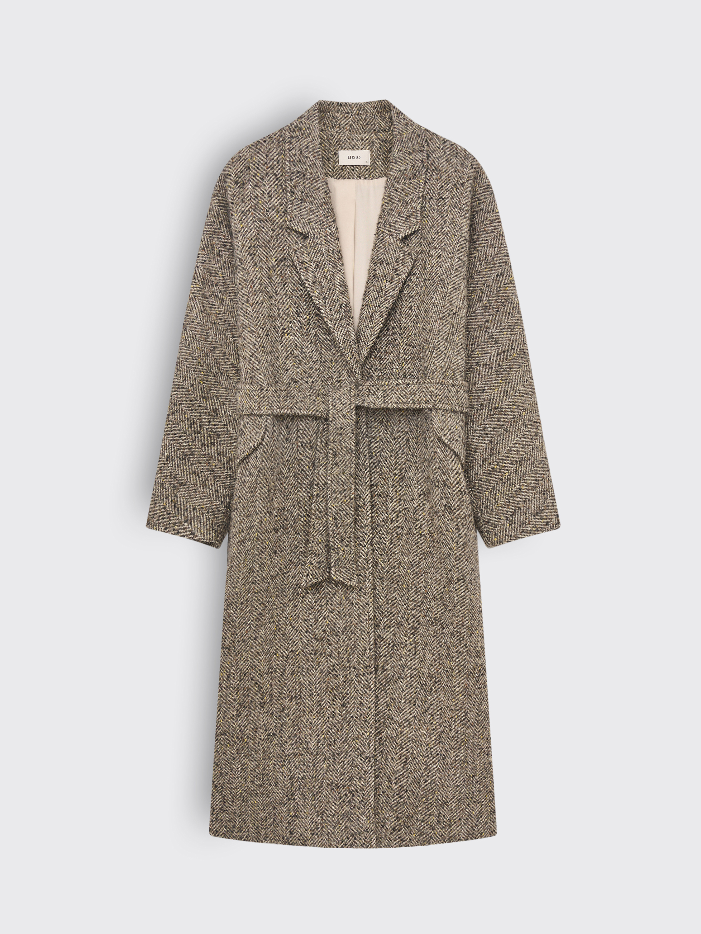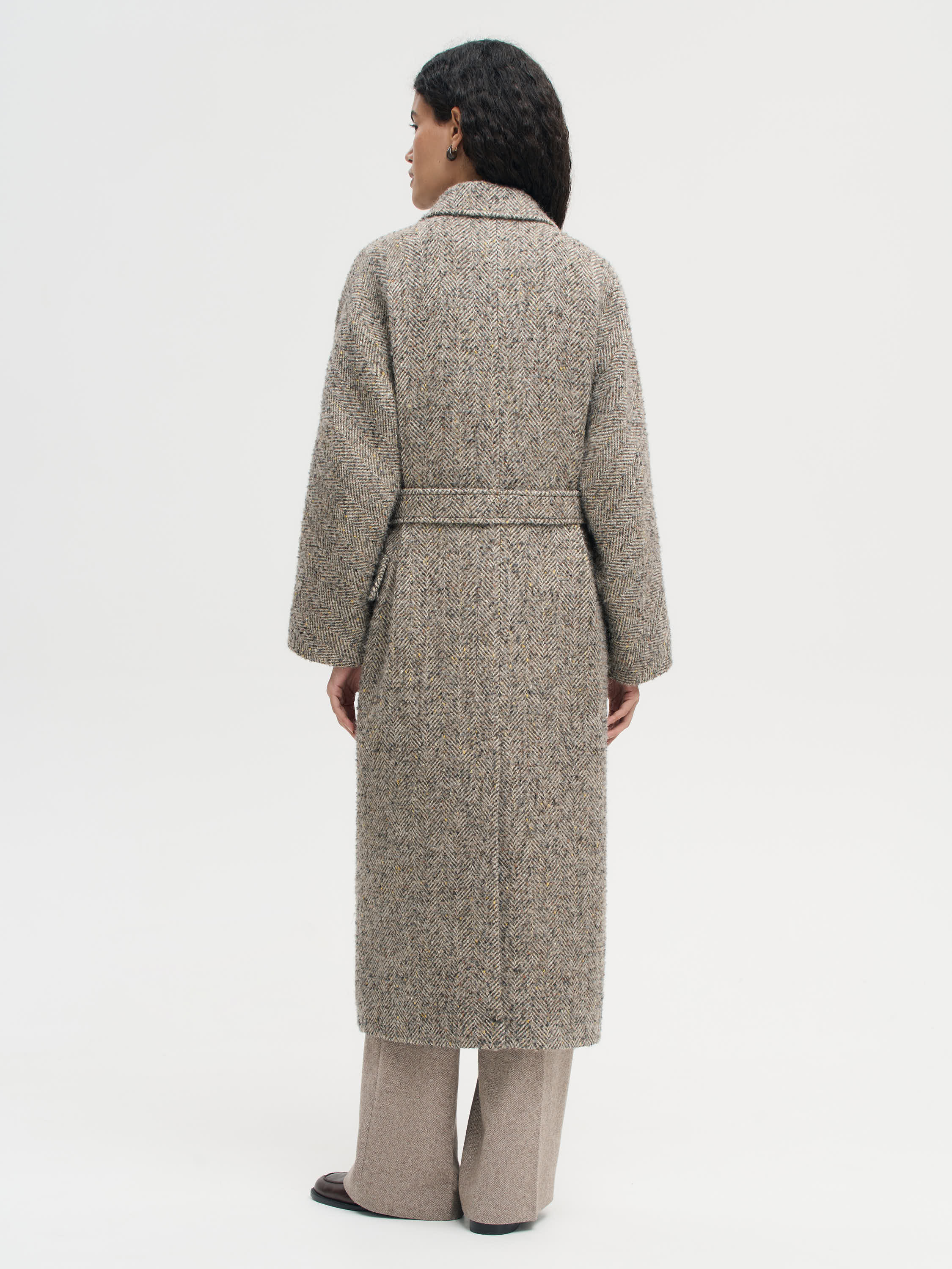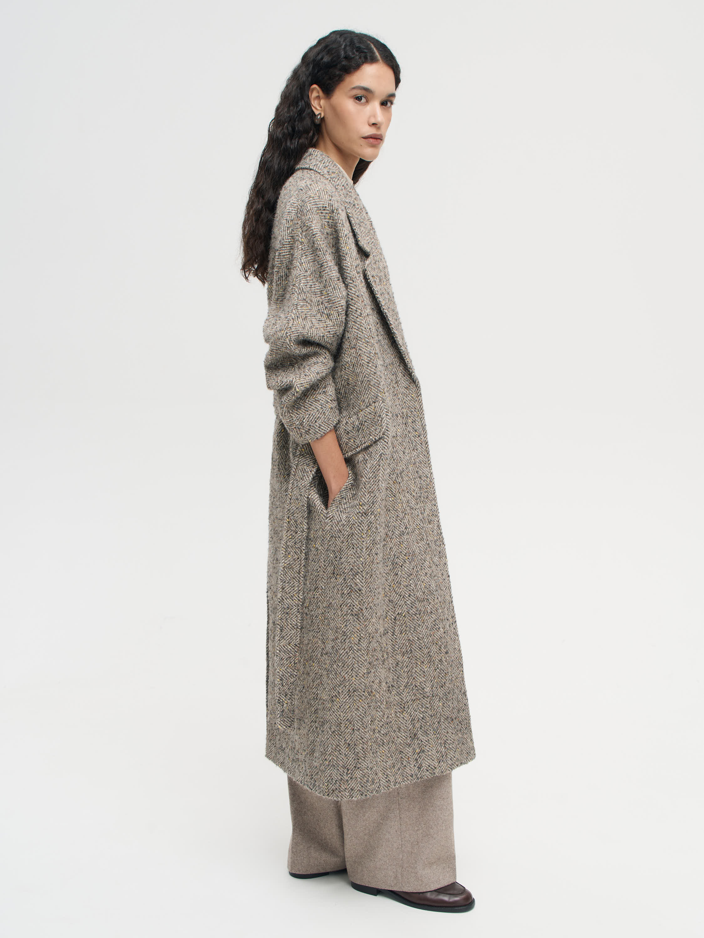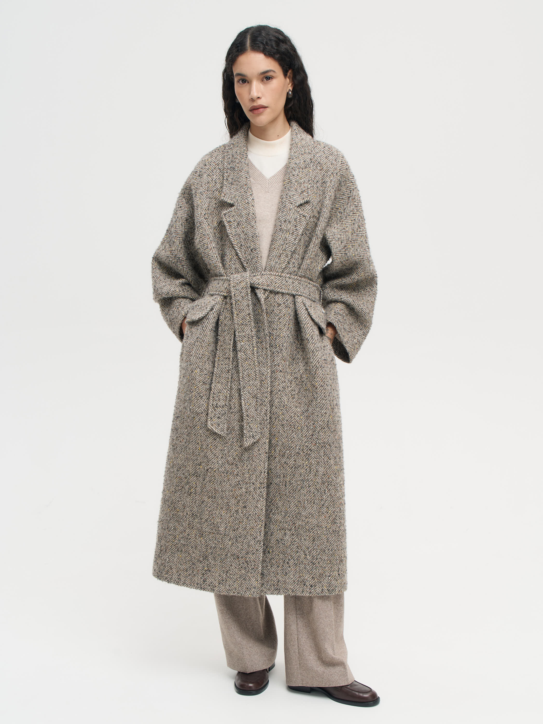 Пальто прямого кроя из теплого смесового твида с высоким содержанием шерсти и добавлением альпаки. Плотное полотно с выразительным плетением «елочка» сохраняет тепло, дышит и приятно ощущается на коже, а вискоза в составе придает ткани мягкость. Модель выполнена на подкладке, с классическим отложным воротником и узкими лацканами. Съемный пояс из той же ткани позволяет варьировать посадку и акцентировать талию, а свободная линия плеч и прямые рукава обеспечивают комфортное прилегание и свободу движения. Нейтральная гамма и лаконичный силуэт делают пальто универсальным элементом для повседневных и деловых образов, подходящим для многослойных комбинаций с жакетами, свитерами и платьями.