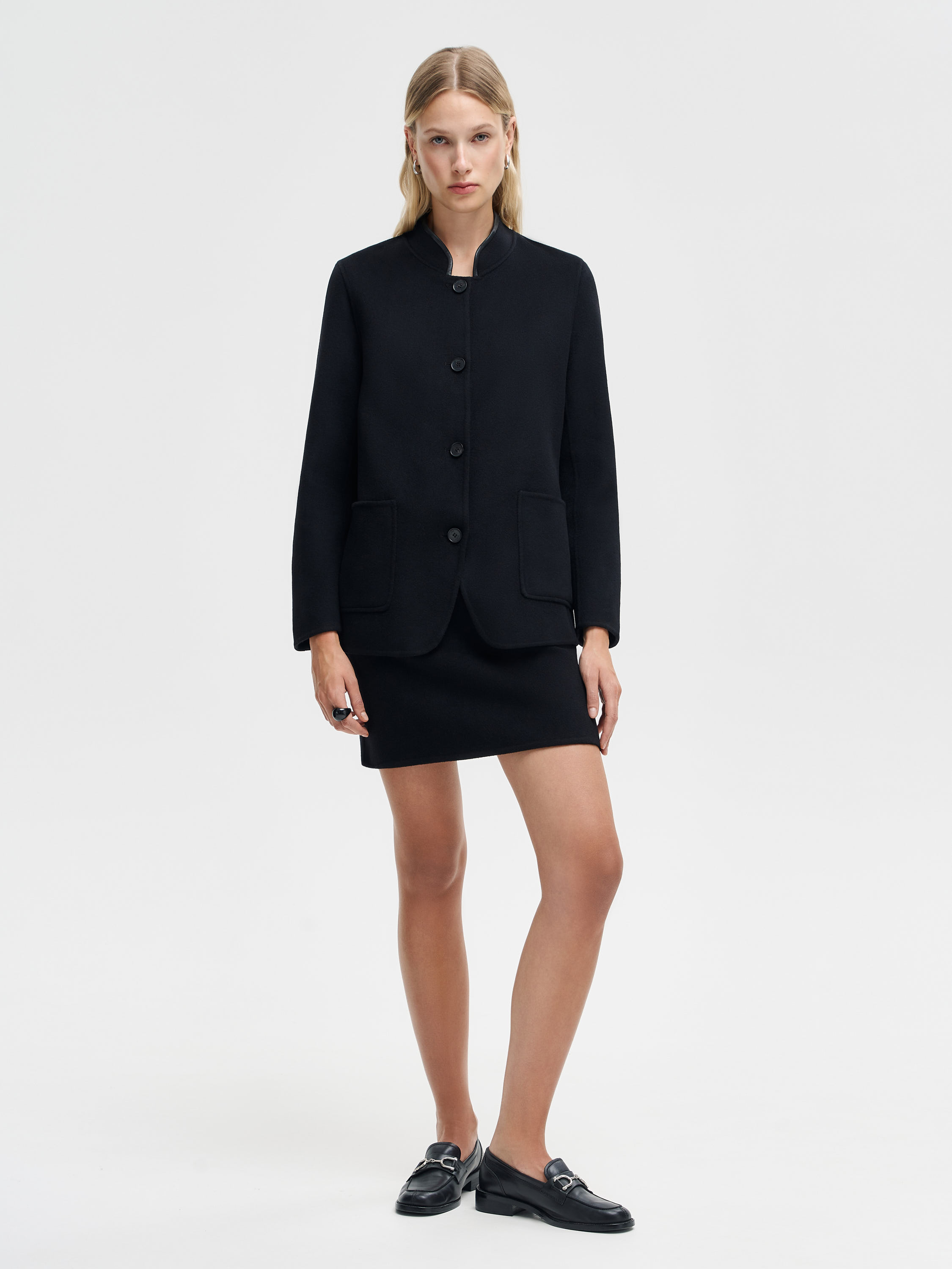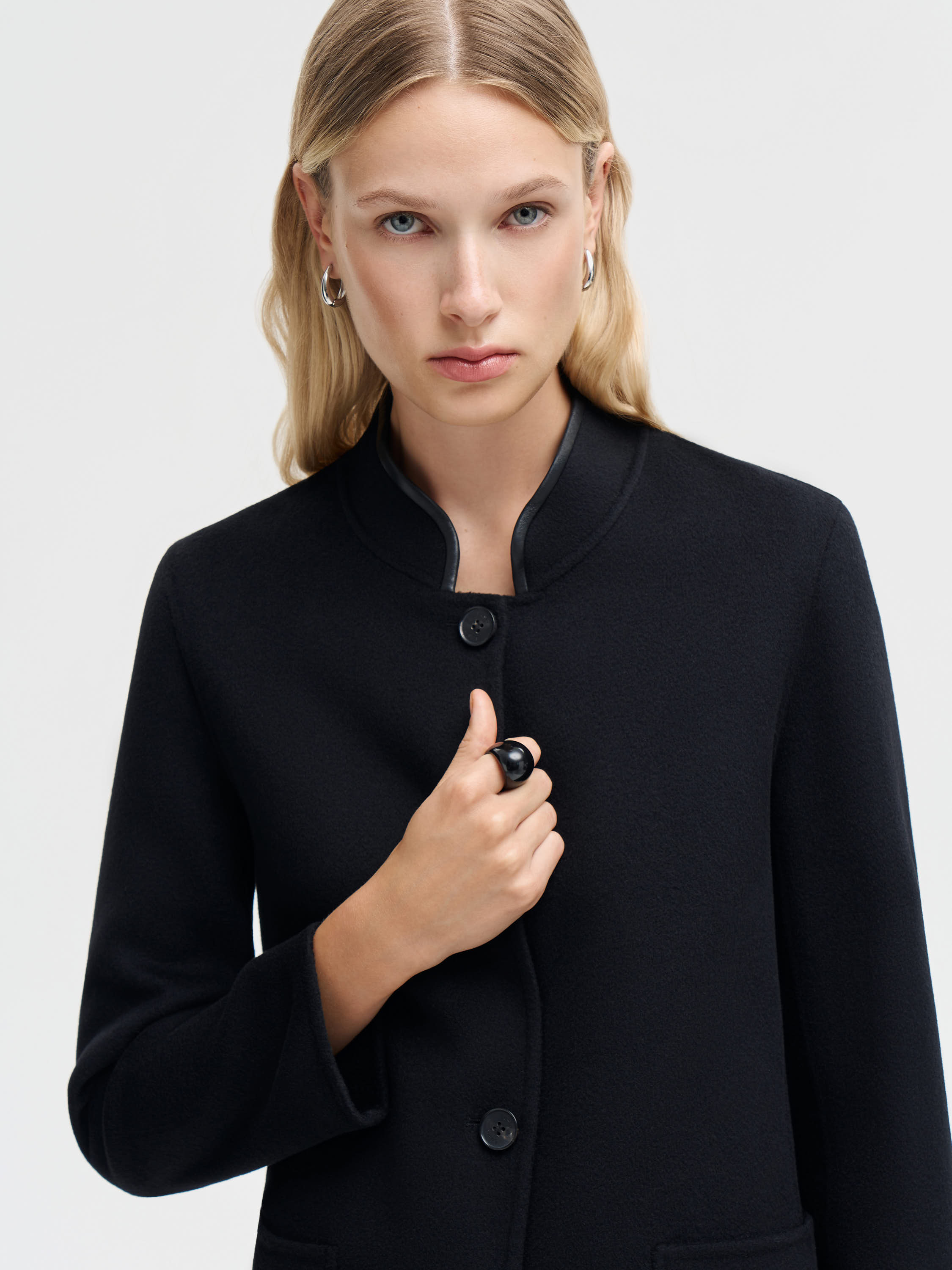 Пальто прямого кроя из мягкой, плотной ткани на основе шерсти мериноса с добавлением кашемира. Материал держит форму, но при этом пластичен и комфортен в движении, обладает деликатной, гладкой фактурой. Модель выполнена с аккуратным воротником-стойкой и застежкой на четыре крупные пуговицы. Передние накладные карманы со слегка закругленными уголками подчеркивают геометрию силуэта. Благодаря минималистичному дизайну пальто легко интегрируется в разные образы: с брюками, юбками, платьями, в паре с лоферами, ботильонами или высокими сапогами. Можно носить как верхний слой поверх тонкого джемпера, рубашки или объемного трикотажа.