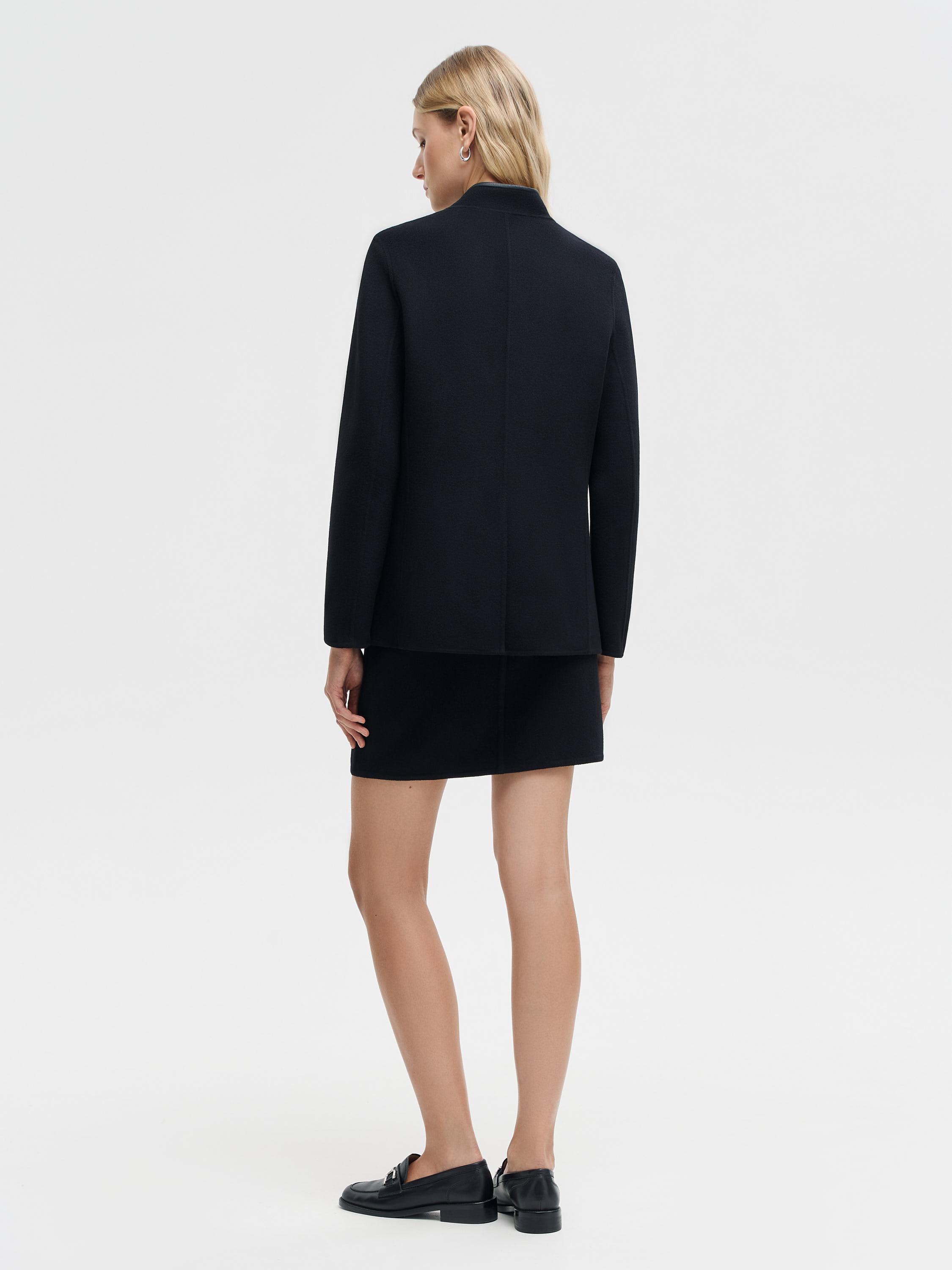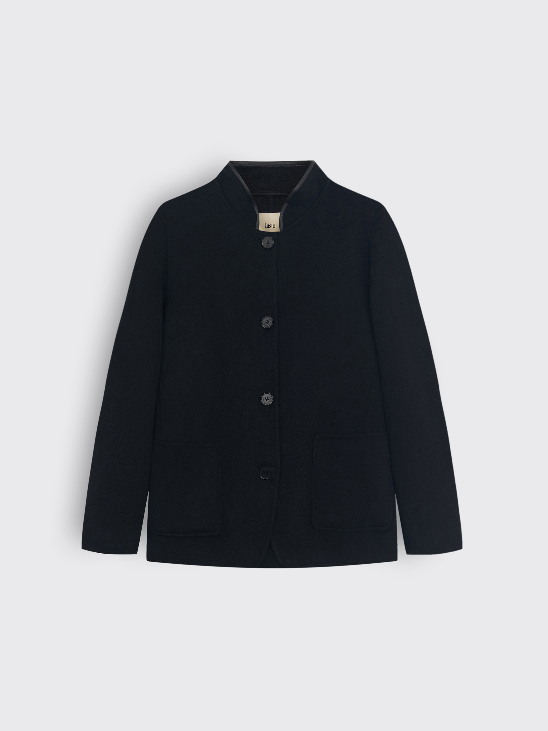 Пальто прямого кроя из мягкой, плотной ткани на основе шерсти мериноса с добавлением кашемира. Материал держит форму, но при этом пластичен и комфортен в движении, обладает деликатной, гладкой фактурой. Модель выполнена с аккуратным воротником-стойкой и застежкой на четыре крупные пуговицы. Передние накладные карманы со слегка закругленными уголками подчеркивают геометрию силуэта. Благодаря минималистичному дизайну пальто легко интегрируется в разные образы: с брюками, юбками, платьями, в паре с лоферами, ботильонами или высокими сапогами. Можно носить как верхний слой поверх тонкого джемпера, рубашки или объемного трикотажа.