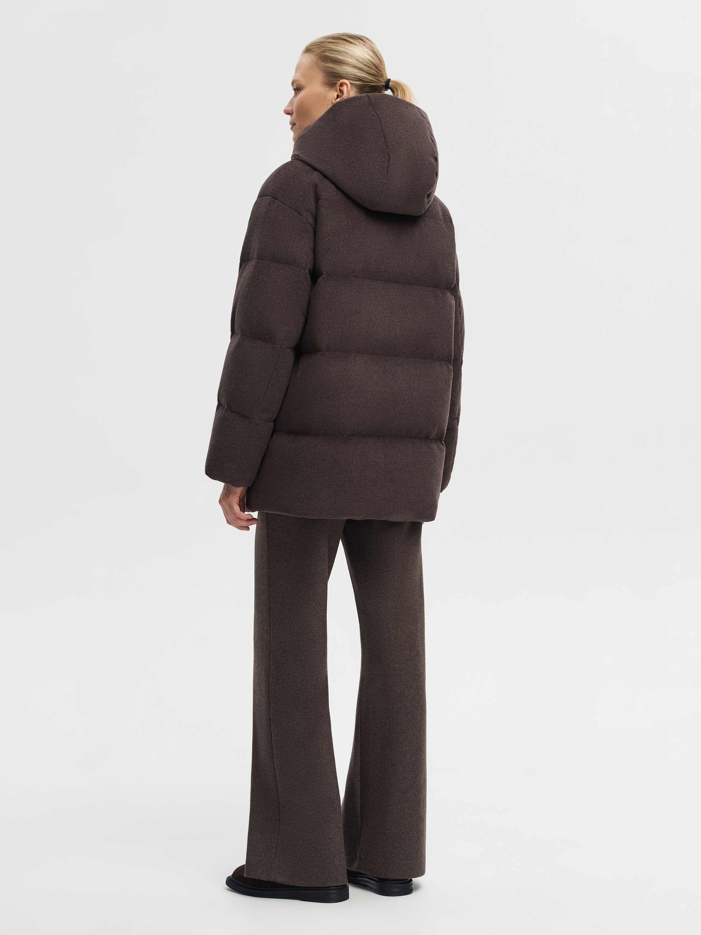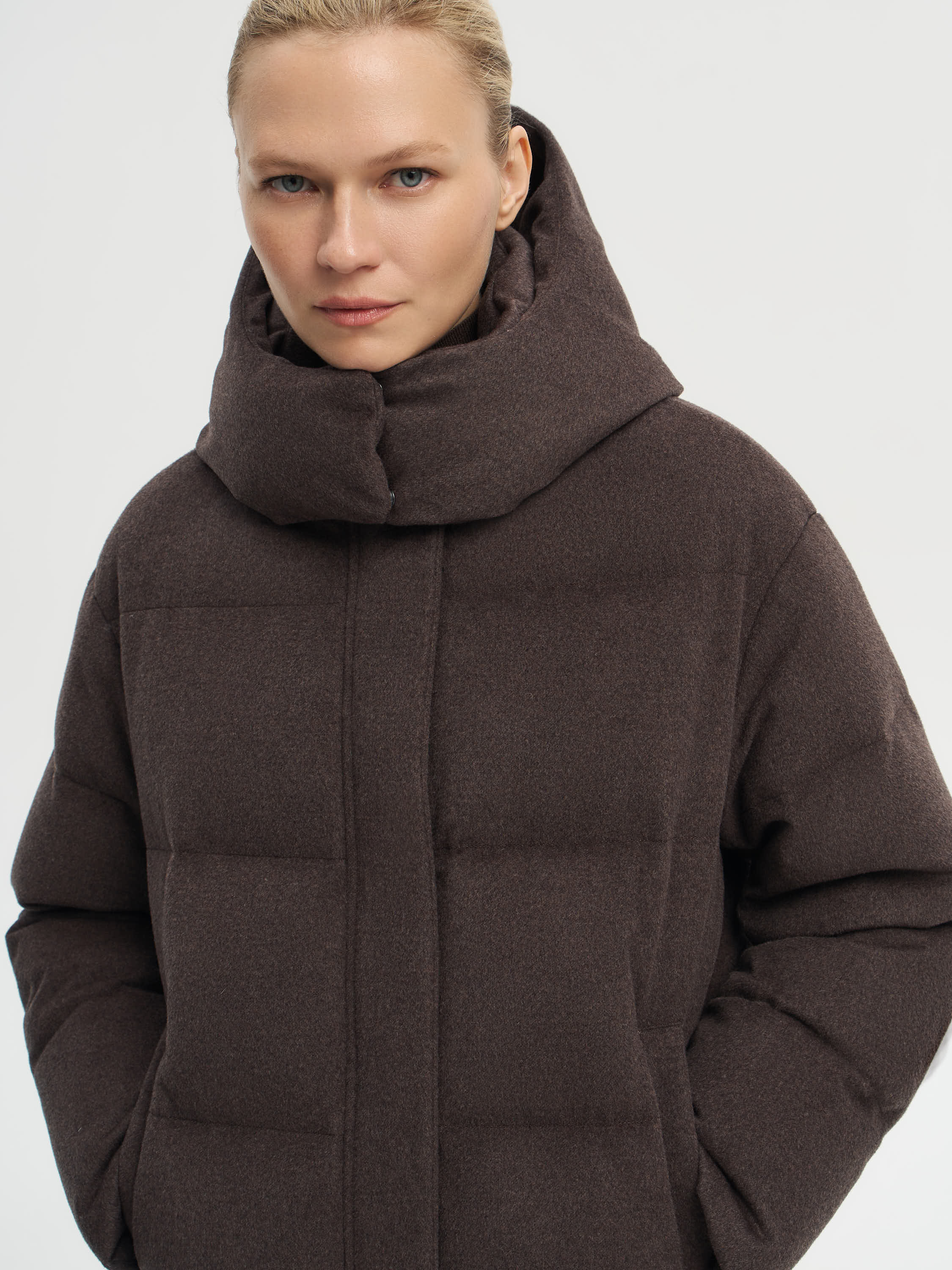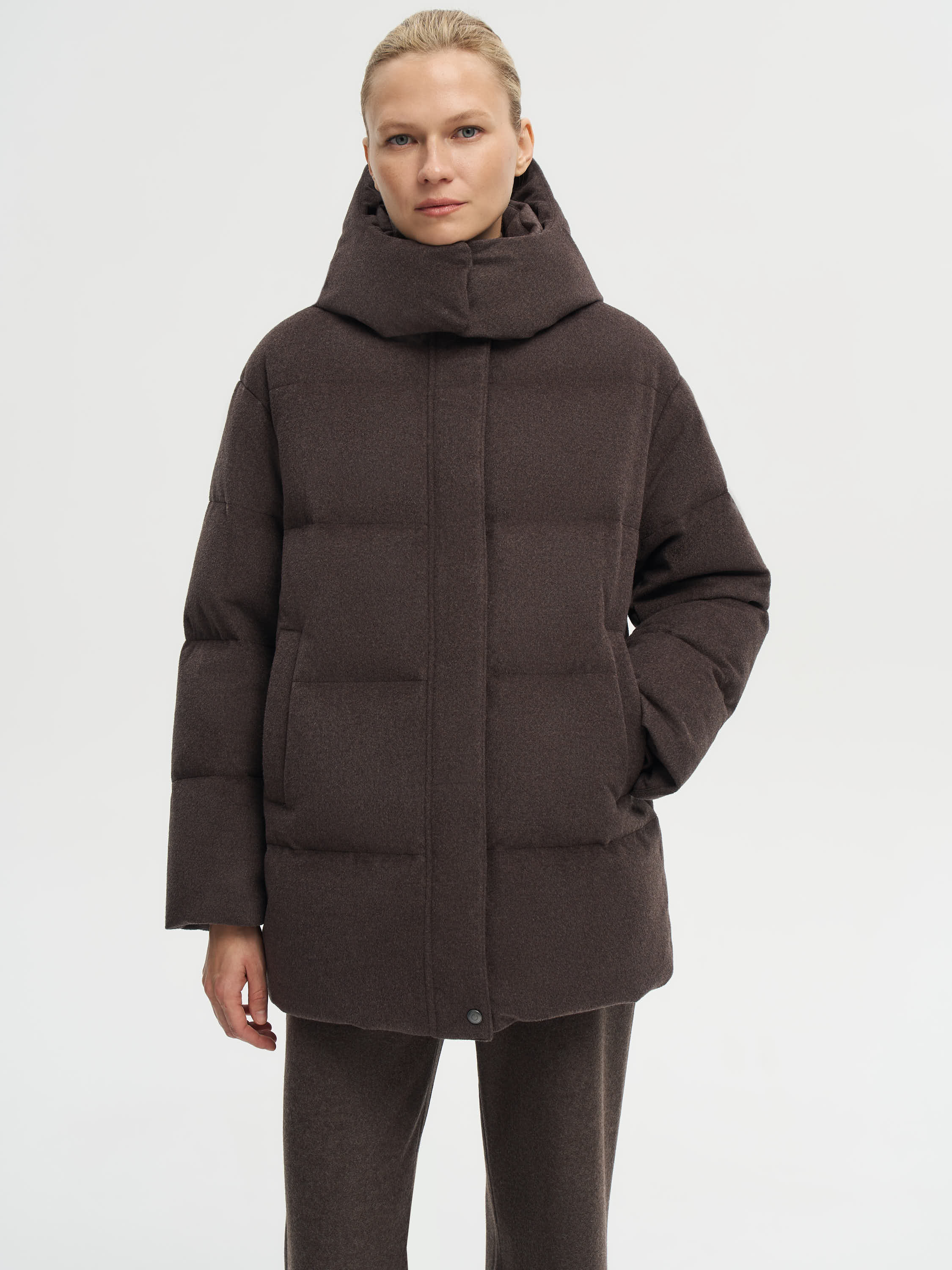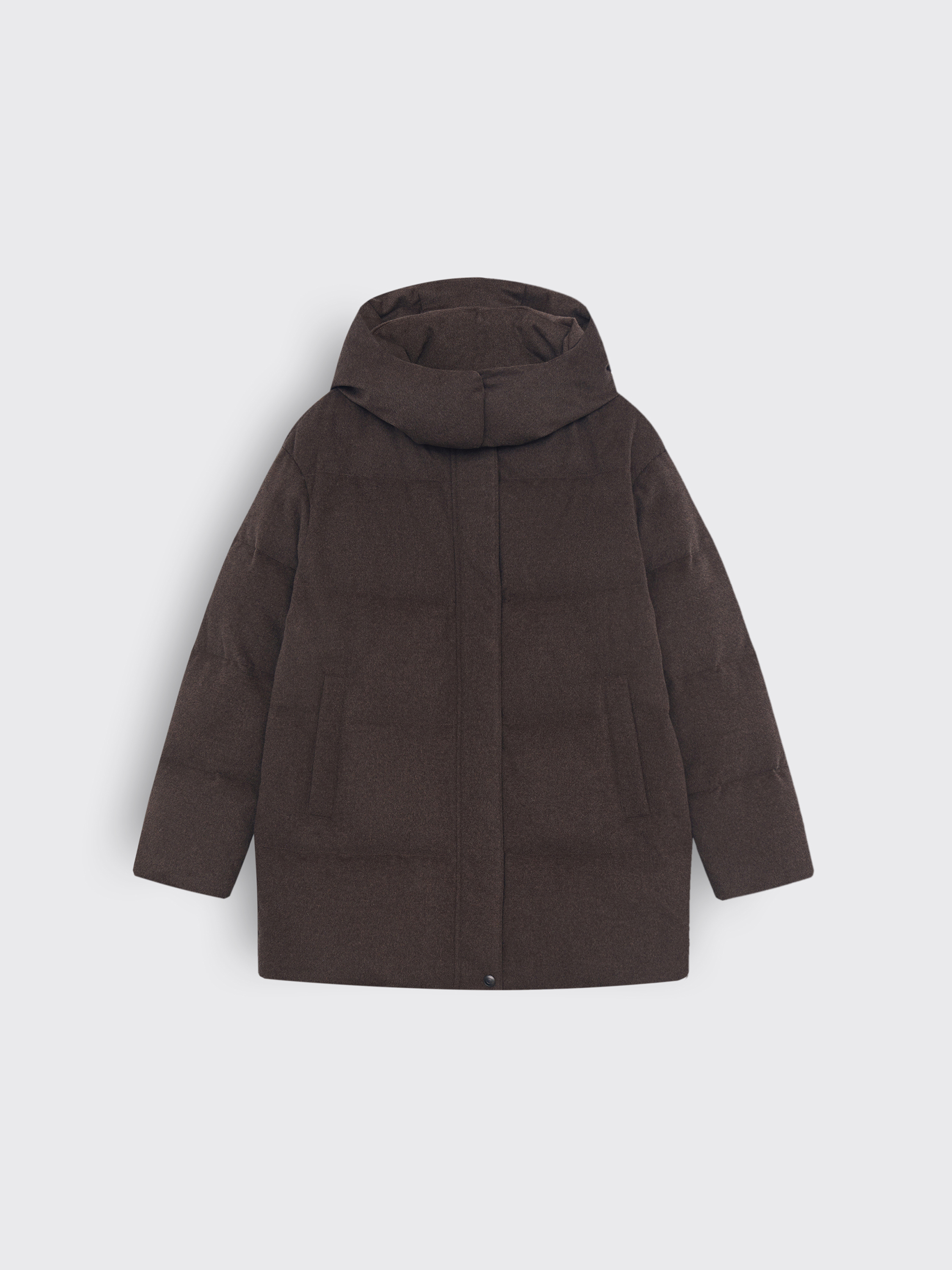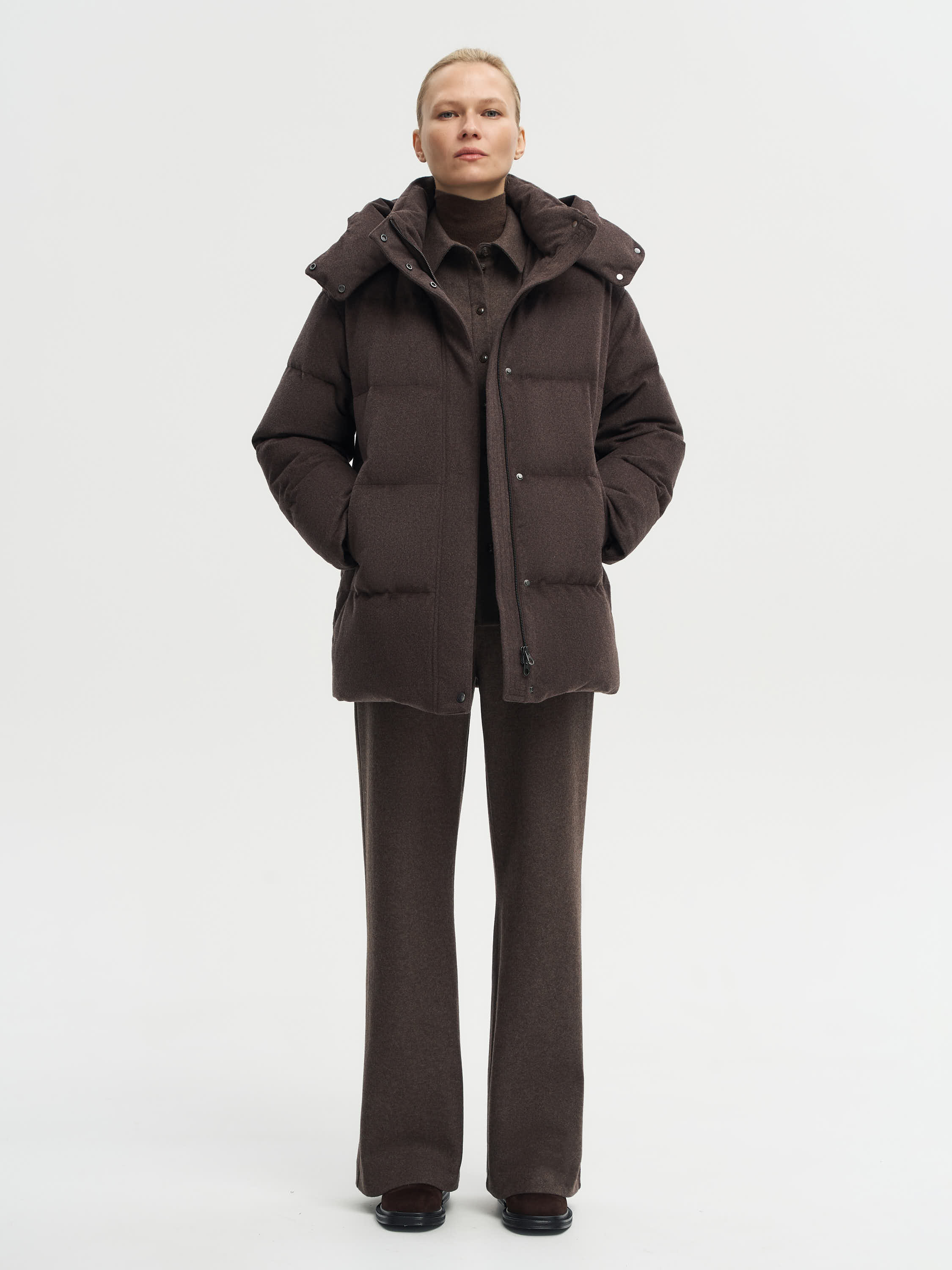 Пуховик глубокого шоколадного оттенка выполнен из ткани с добавлением 90% шерсти мериноса и 10% шелка. Такая структура придает материалу мягкость, благородный блеск и устойчивость к складкам, сохраняя гладкую фактуру. Верх обработан по технологии Storm System: мембранное покрытие защищает от ветра и влаги, сохраняя воздухопроницаемость. Объемная стежка равномерно распределяет наполнитель из пуха и пера белой утки с высоким индексом Fill Power 750. Модель дополнена высоким воротником, съемным капюшоном и практичными боковыми карманами. Лаконичный крой и универсальный оттенок делают пуховик функциональным решением как для повседневных, так и для городских образов.