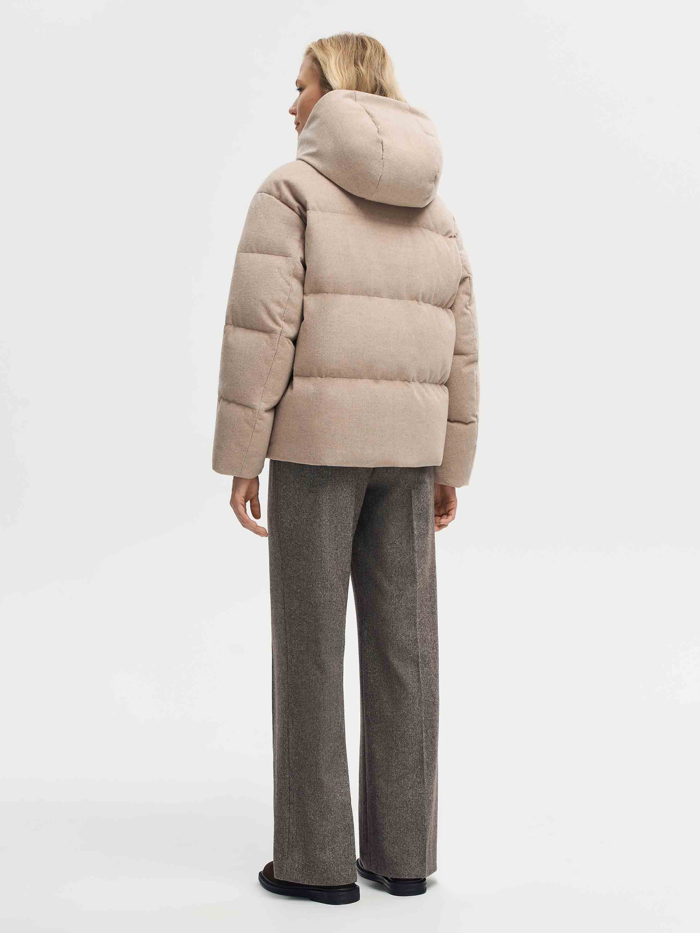 Пуховик из ткани на основе мериносовой шерсти с добавлением шелка. Верх выполнен из смеси 90% шерсти и 10% шелка, обладающей мягкостью, блеском и устойчивостью к складкам. Технология Storm System с мембраной обеспечивает водо- и ветронепроницаемость. Наполнитель из пуха и пера белой утки сохраняет тепло при легком весе. Крой прямой, с объемным капюшоном и вертикальными прорезными карманами, застежка на молнию дополнена планкой на кнопках. Универсальный дизайн делает модель уместной в разных образах.