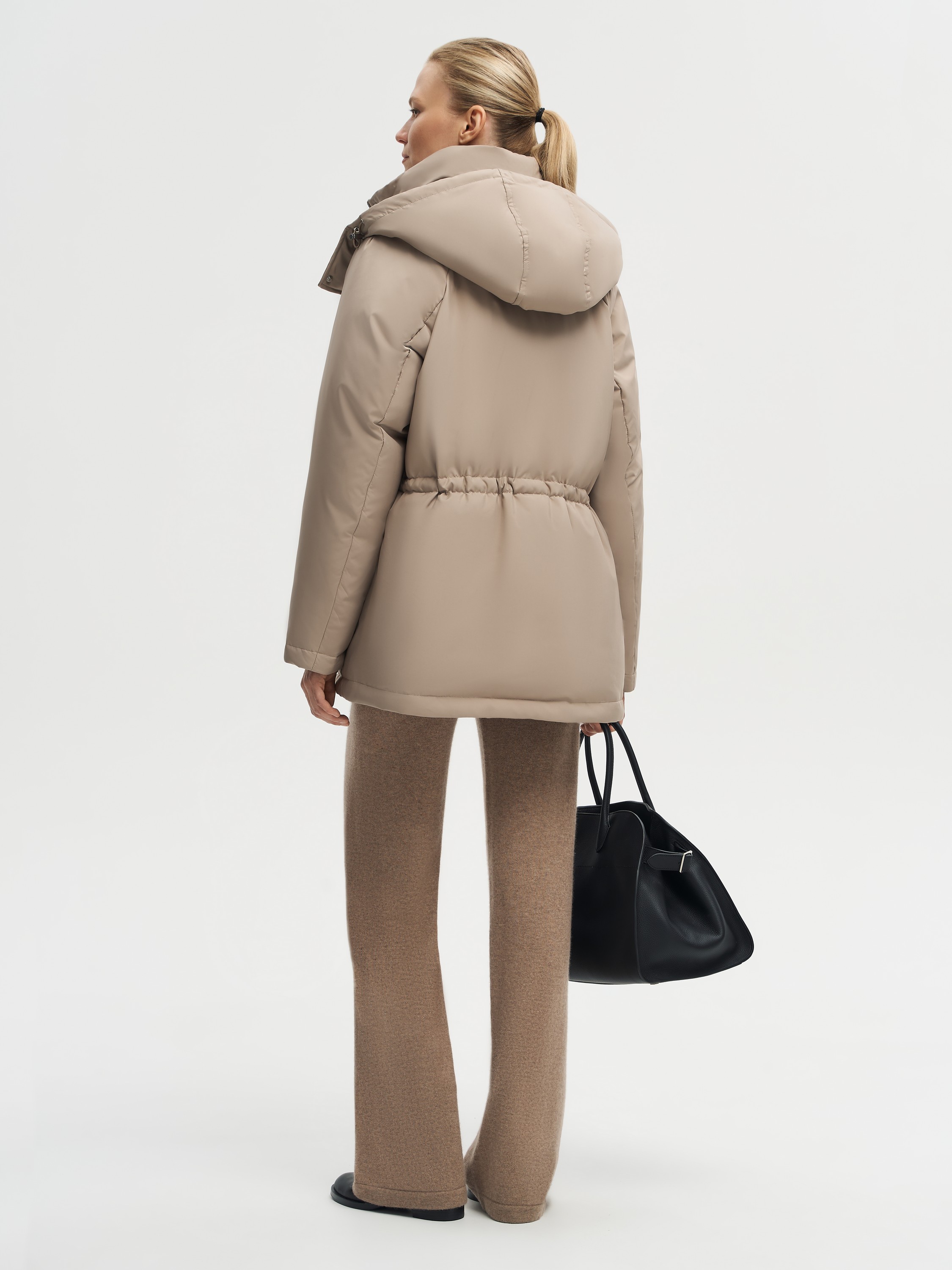 Пуховик прямого кроя с наполнителем из пуха и пера белой утки, который обеспечивает надежную теплоизоляцию при легком весе. Верх выполнен из 100% полиэстера с технологией пуховых пакетов, что делает ткань воздухонепроницаемой и защищающей от влаги. Модель дополнена объемным капюшоном со шнурками, рукавами реглан для свободы движений и вместительными прорезными карманами. Застежка на молнию скрыта планкой, что помогает удерживать тепло. Лаконичный дизайн делает пуховик универсальным решением для повседневного гардероба.