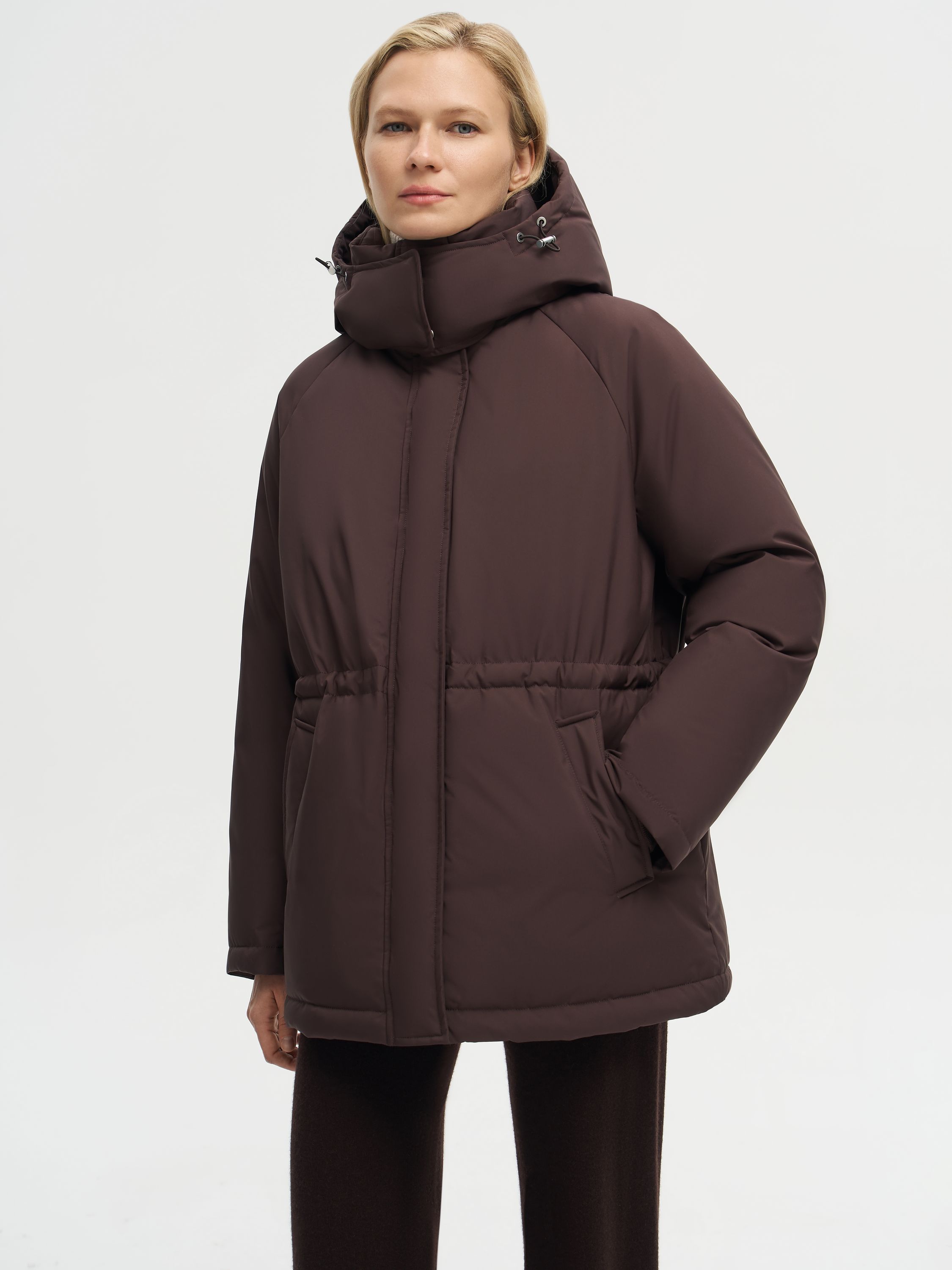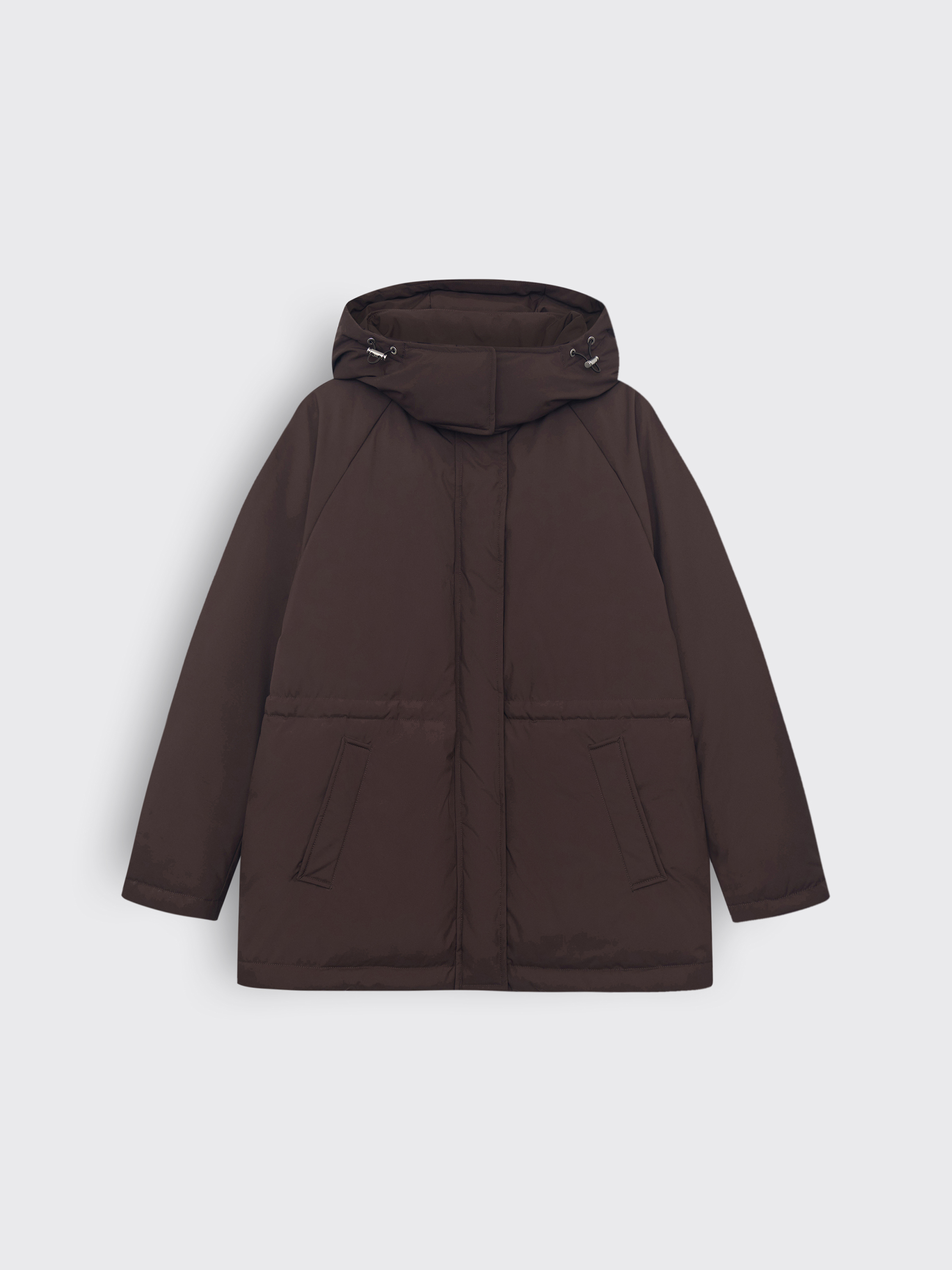 Пуховик прямого кроя с наполнителем из пуха и пера белой утки, который обеспечивает надежную теплоизоляцию при легком весе. Верх выполнен из 100% полиэстера с технологией пуховых пакетов, что делает ткань воздухонепроницаемой и защищающей от влаги. Модель дополнена объемным капюшоном со шнурками, рукавами реглан для свободы движений и вместительными прорезными карманами. Застежка на молнию скрыта планкой, что помогает удерживать тепло. Лаконичный дизайн делает пуховик универсальным решением для повседневного гардероба.