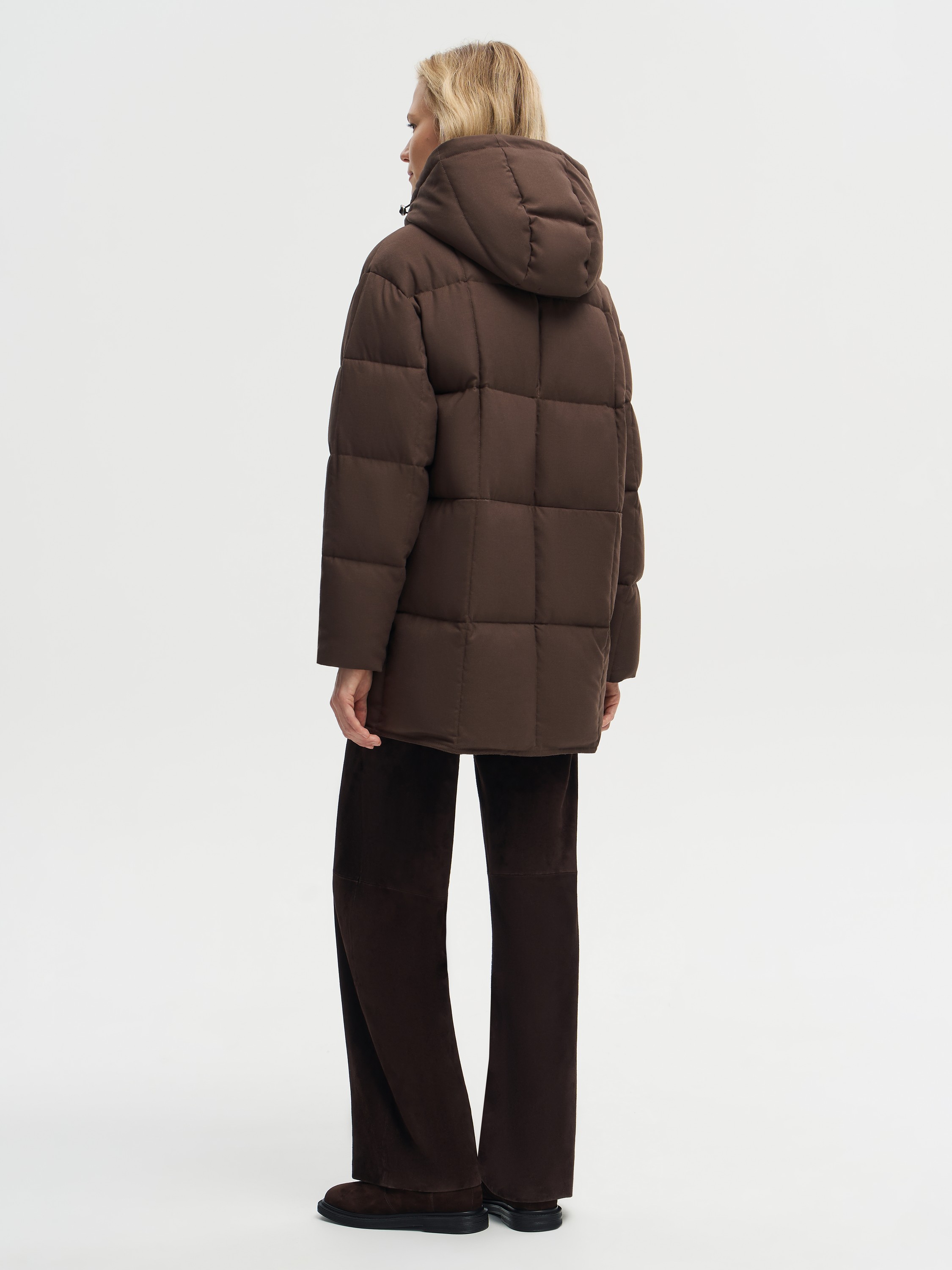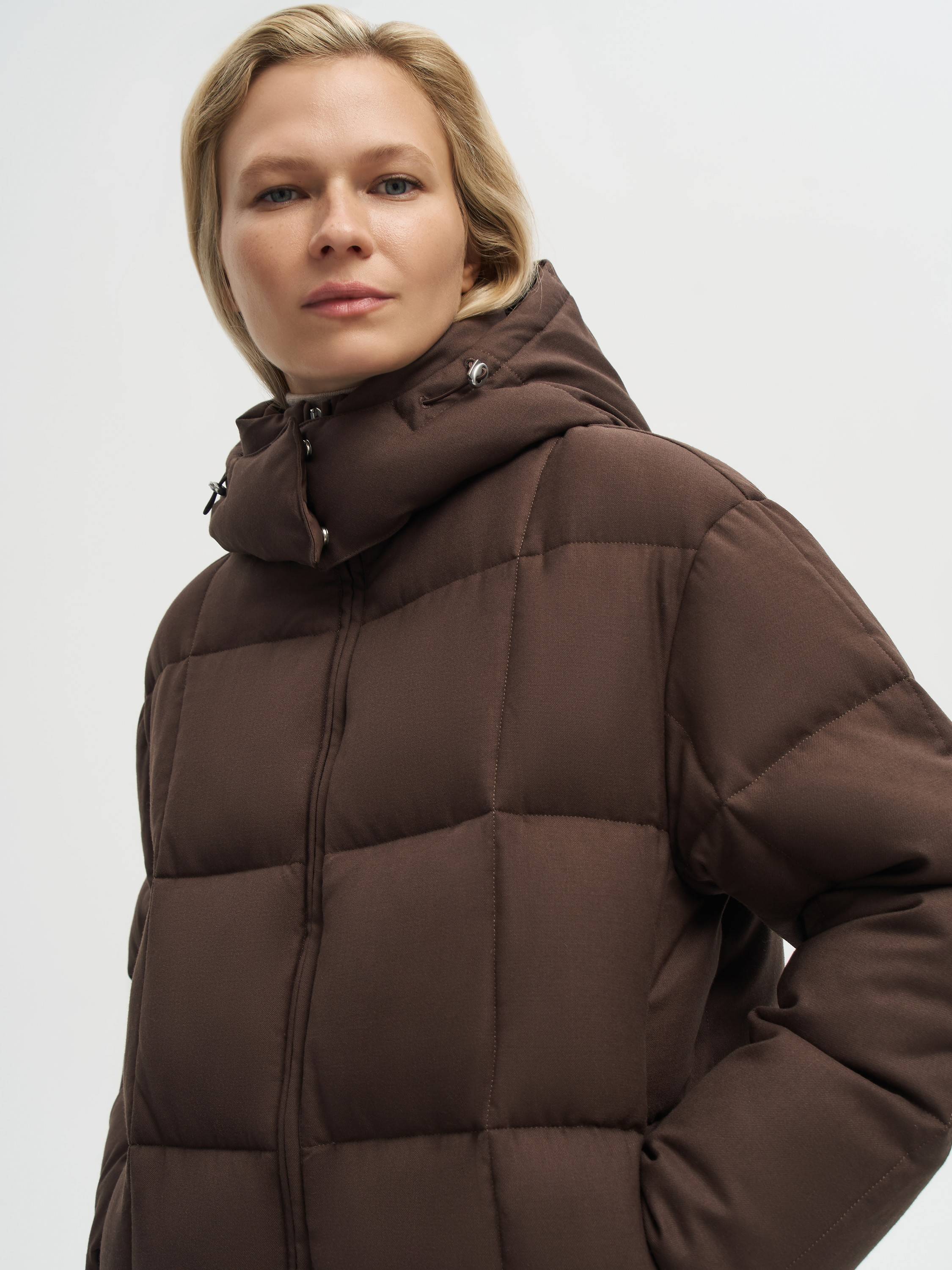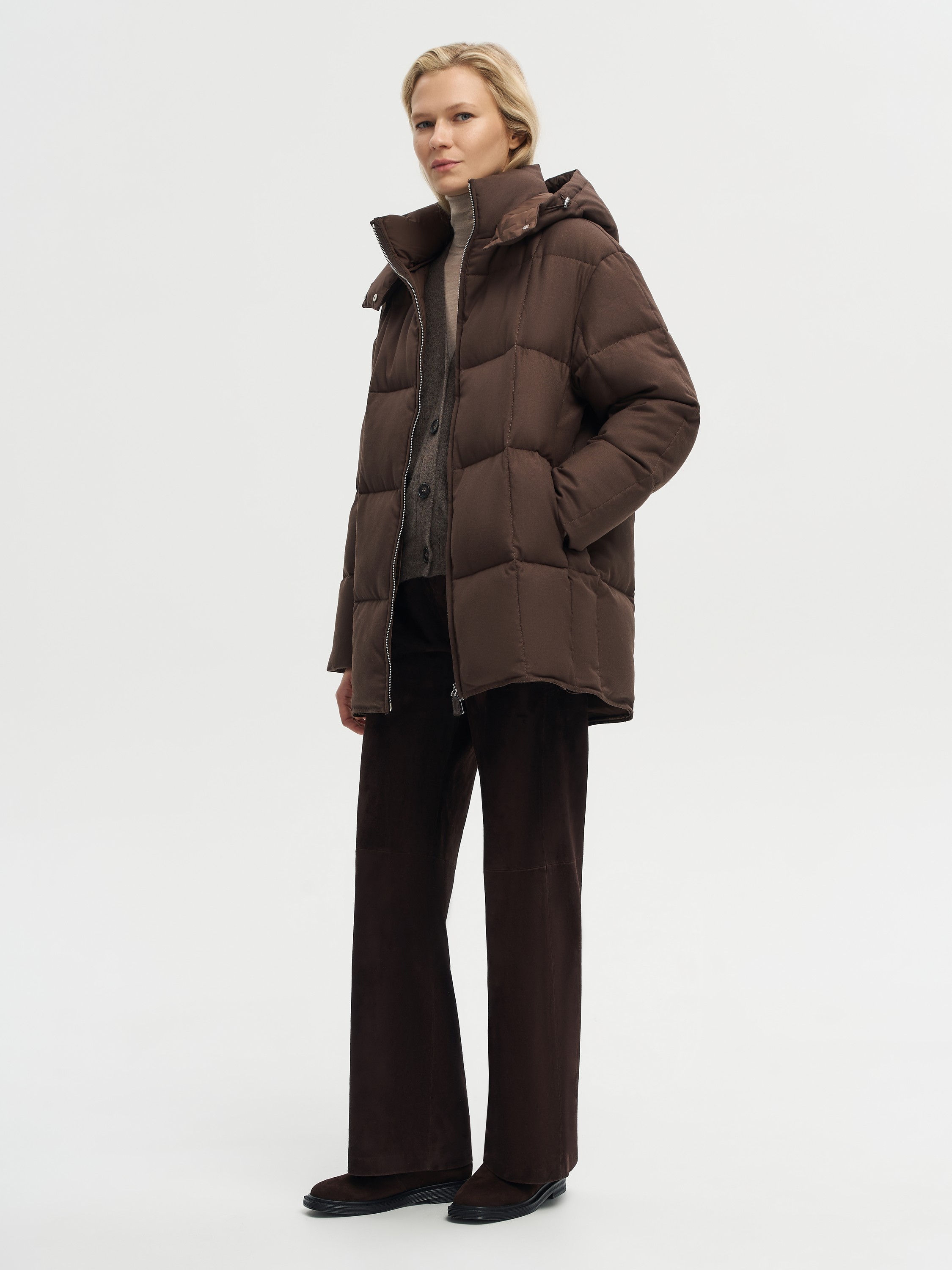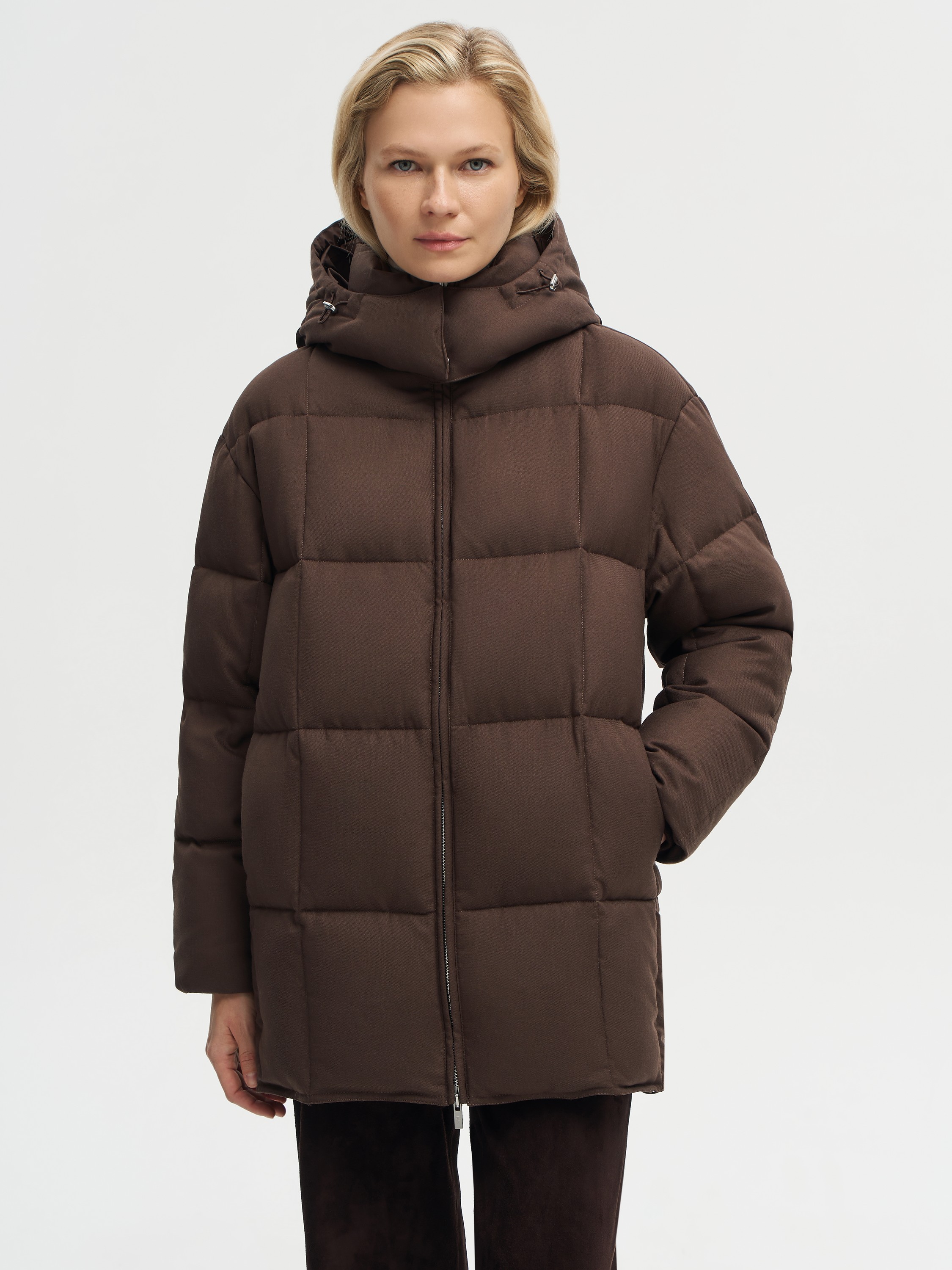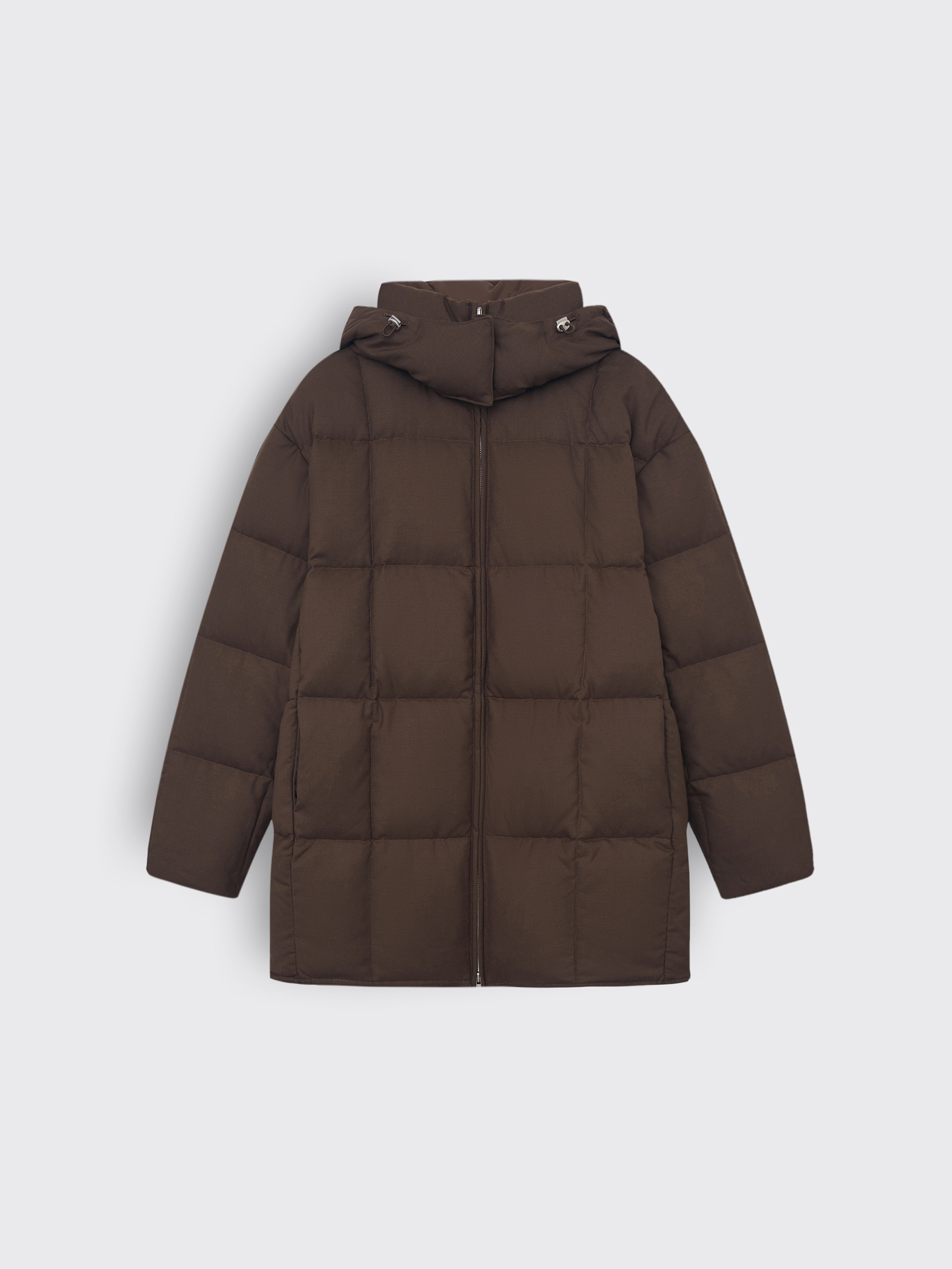 Пуховик прямого кроя с наполнителем из пуха и пера белой утки, который обеспечивает надежную теплоизоляцию при легком весе. Верх выполнен из смешанной ткани с высоким содержанием шерсти: материал мягкий на ощупь, пластичный и стойкий к износу. Объемный капюшон регулируется шнурками и защищает от ветра, а скрытая застежка на молнию сохраняет тепло. Лаконичный дизайн подчеркивает универсальность модели: пуховик гармонично вписывается в повседневные комплекты с джинсами и трикотажем и подходит для более собранных городских образов.