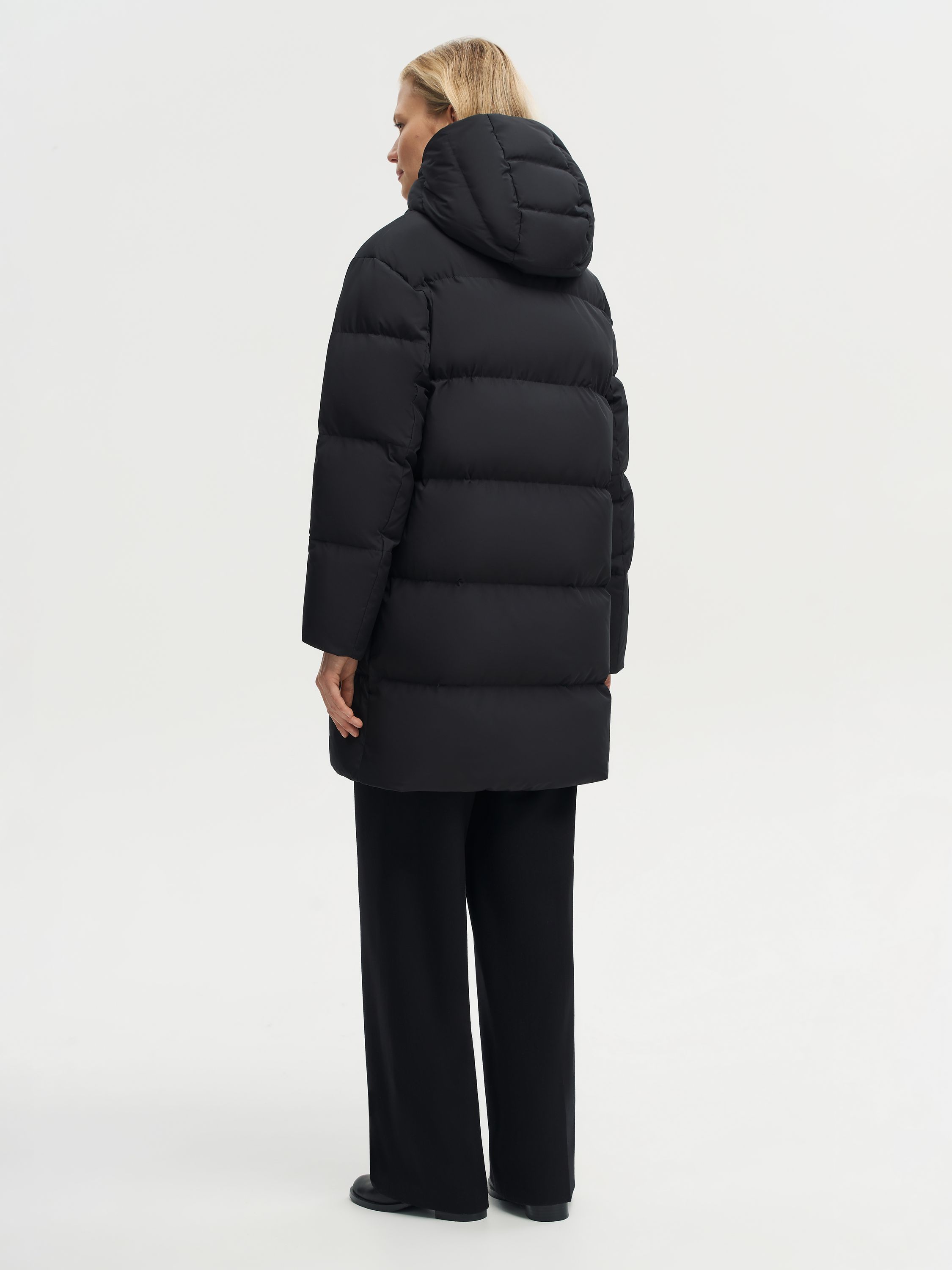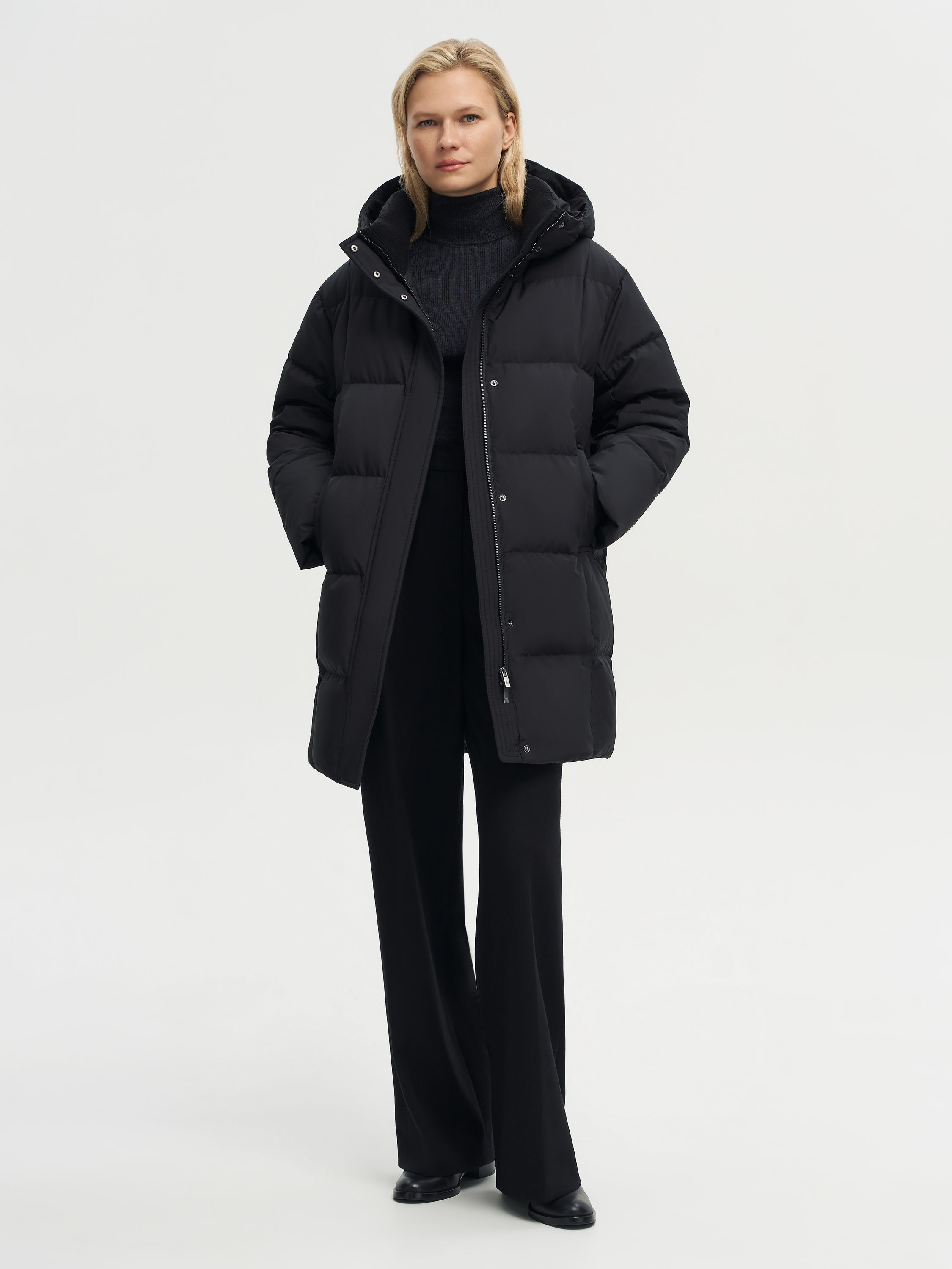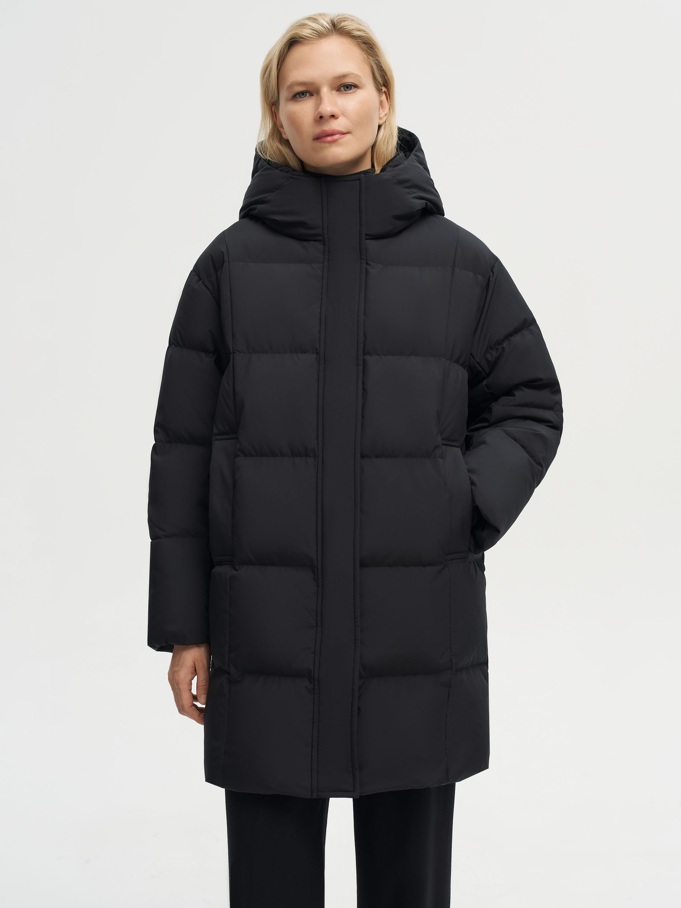 Пуховик с капюшоном и прямым силуэтом выполнен из полиэстера с использованием технологии пуховых пакетов, которые препятствуют миграции наполнителя и усиливают защиту от влаги и ветра. В качестве утеплителя используется пух и перо белой утки с высоким индексом Fill Power 750 — комбинация, которая сочетает легкость, объем и надежное сохранение тепла даже в мороз. Высокий воротник из шерсти мериноса мягко прилегает к шее, создавая дополнительный комфорт. Лаконичный крой и продуманные детали делают модель универсальной: она гармонично вписывается в повседневные ансамбли и городские образы.