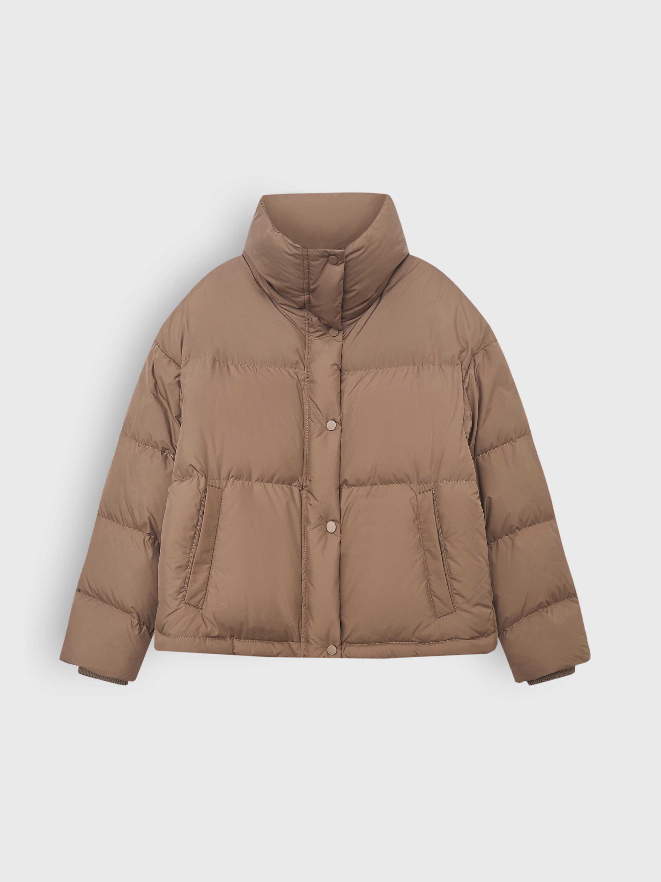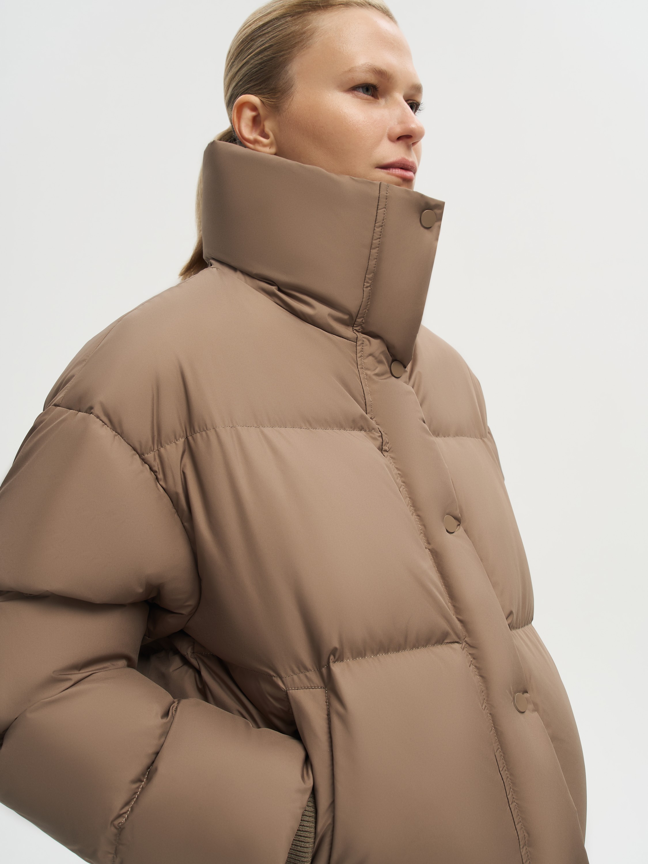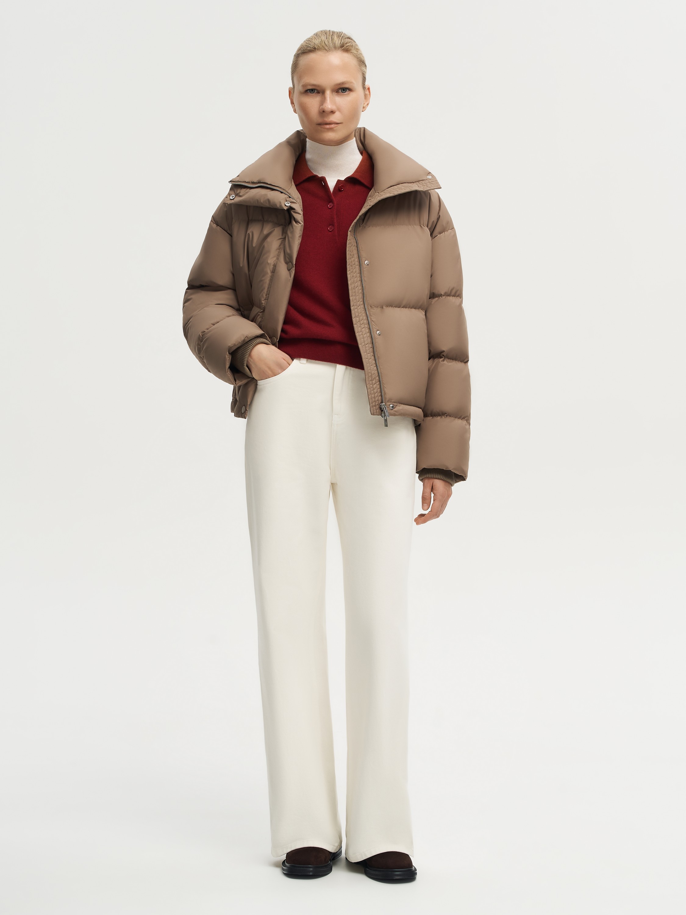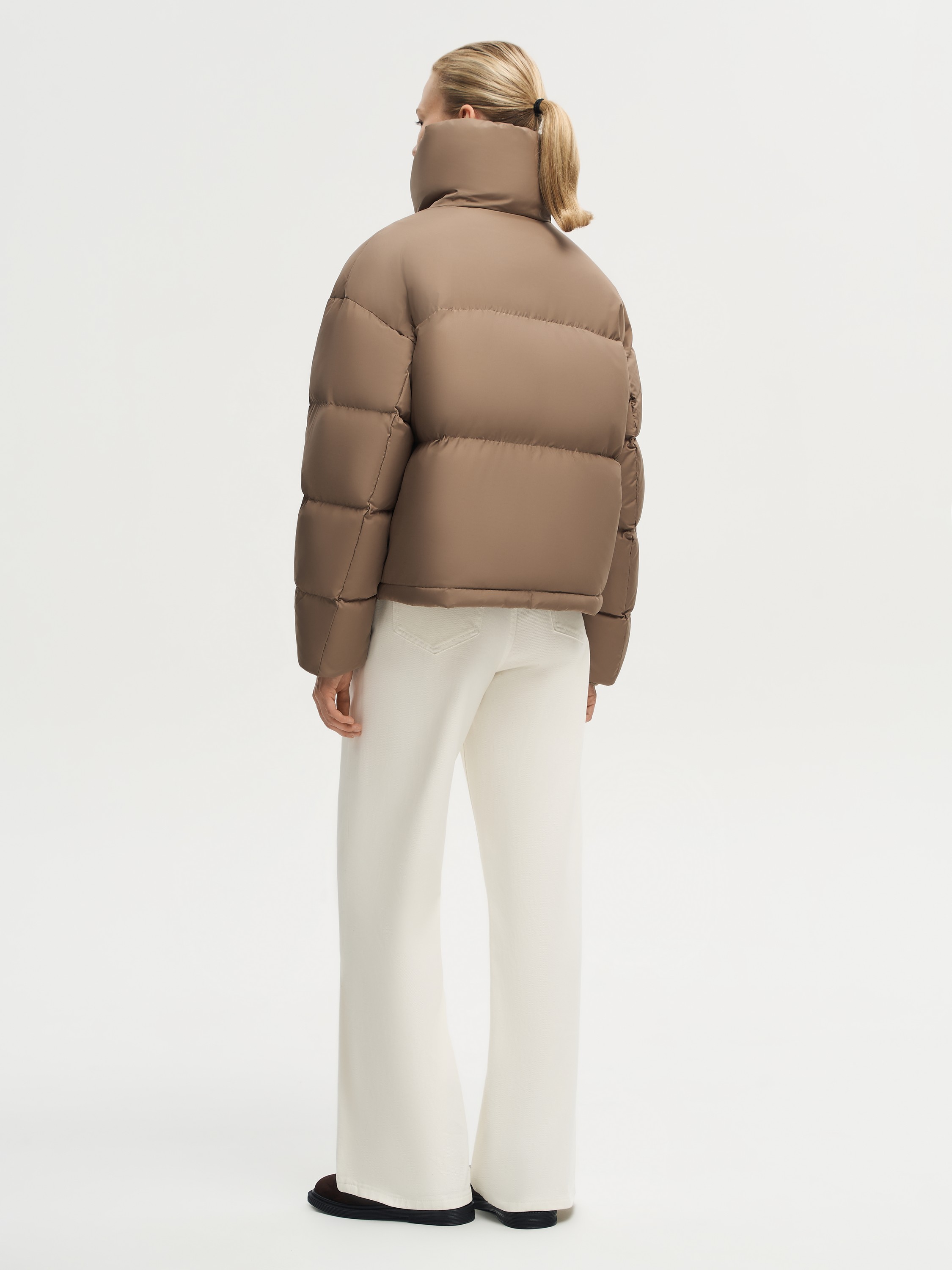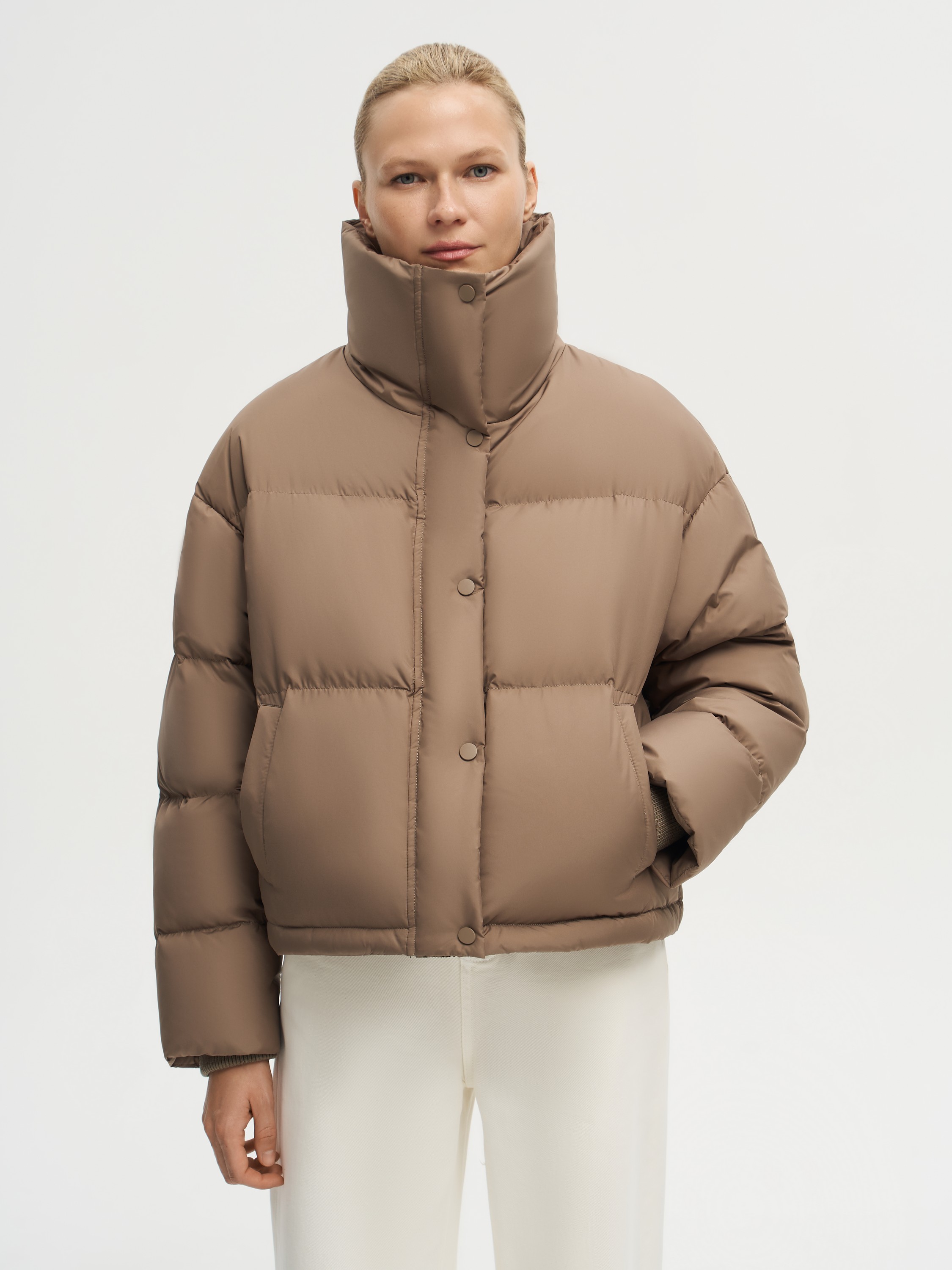 Укороченный пуховик с объемной стежкой выполнен из полиэстера с использованием технологии пуховых пакетов. Такая конструкция надежно фиксирует наполнитель и препятствует его миграции, одновременно защищая от ветра и влаги. Высокий воротник надежно прикрывает от холода, а боковые карманы добавляют практичности. Легкий и теплый наполнитель из пуха и пера белой утки с индексом Fill Power 750 обеспечивает комфорт даже в морозные дни. Лаконичный дизайн делает модель базовой вещью зимнего гардероба.