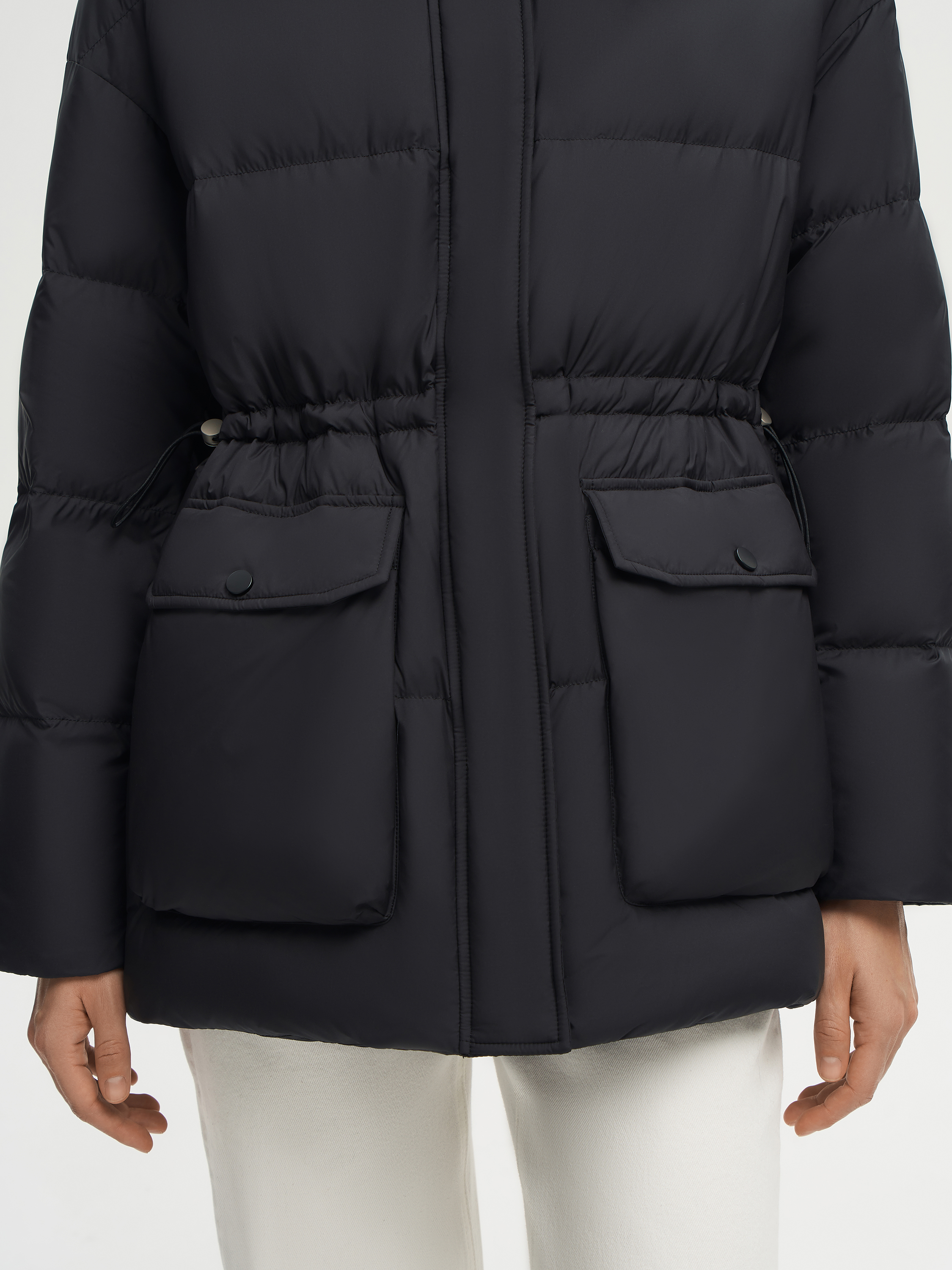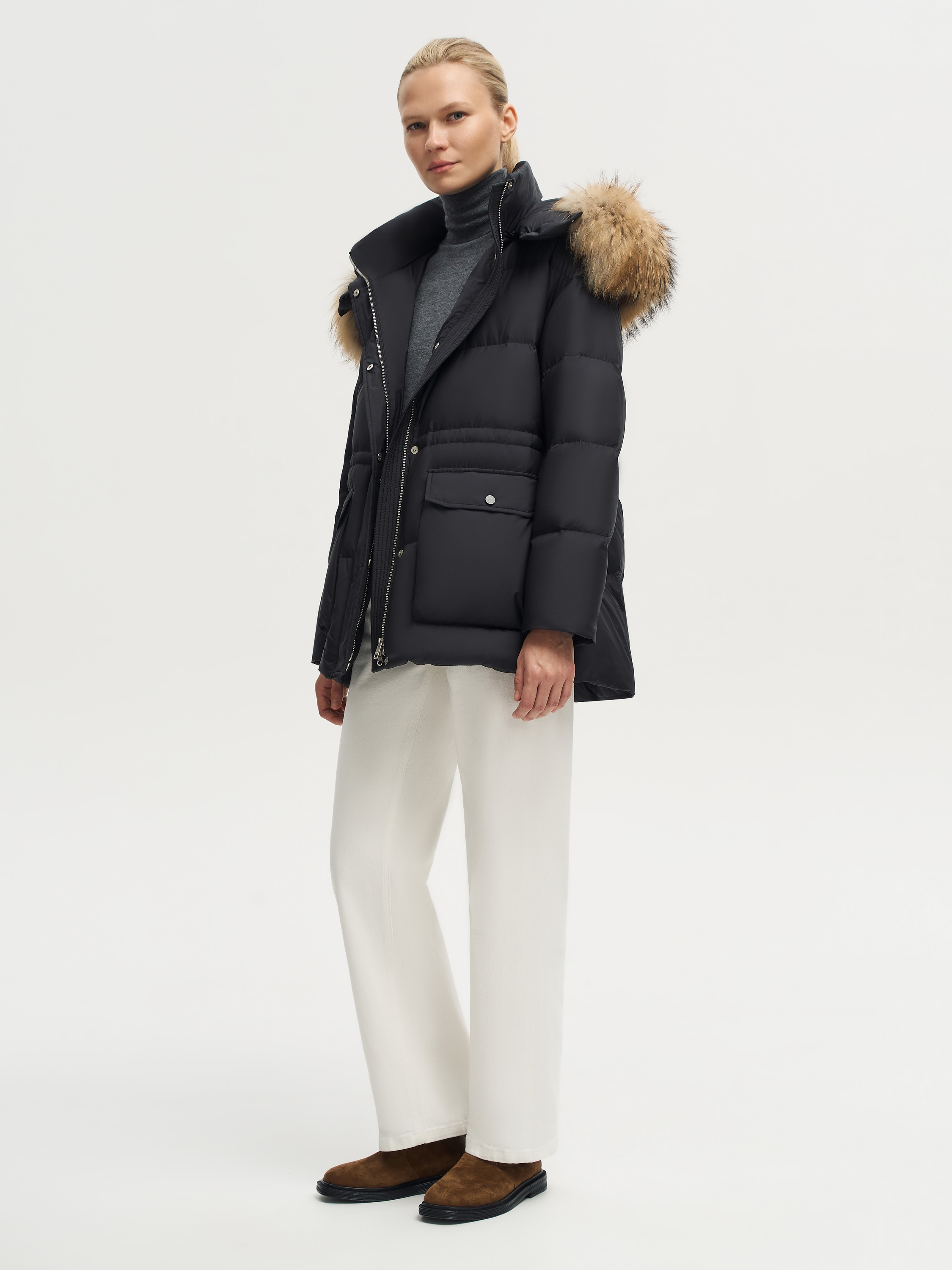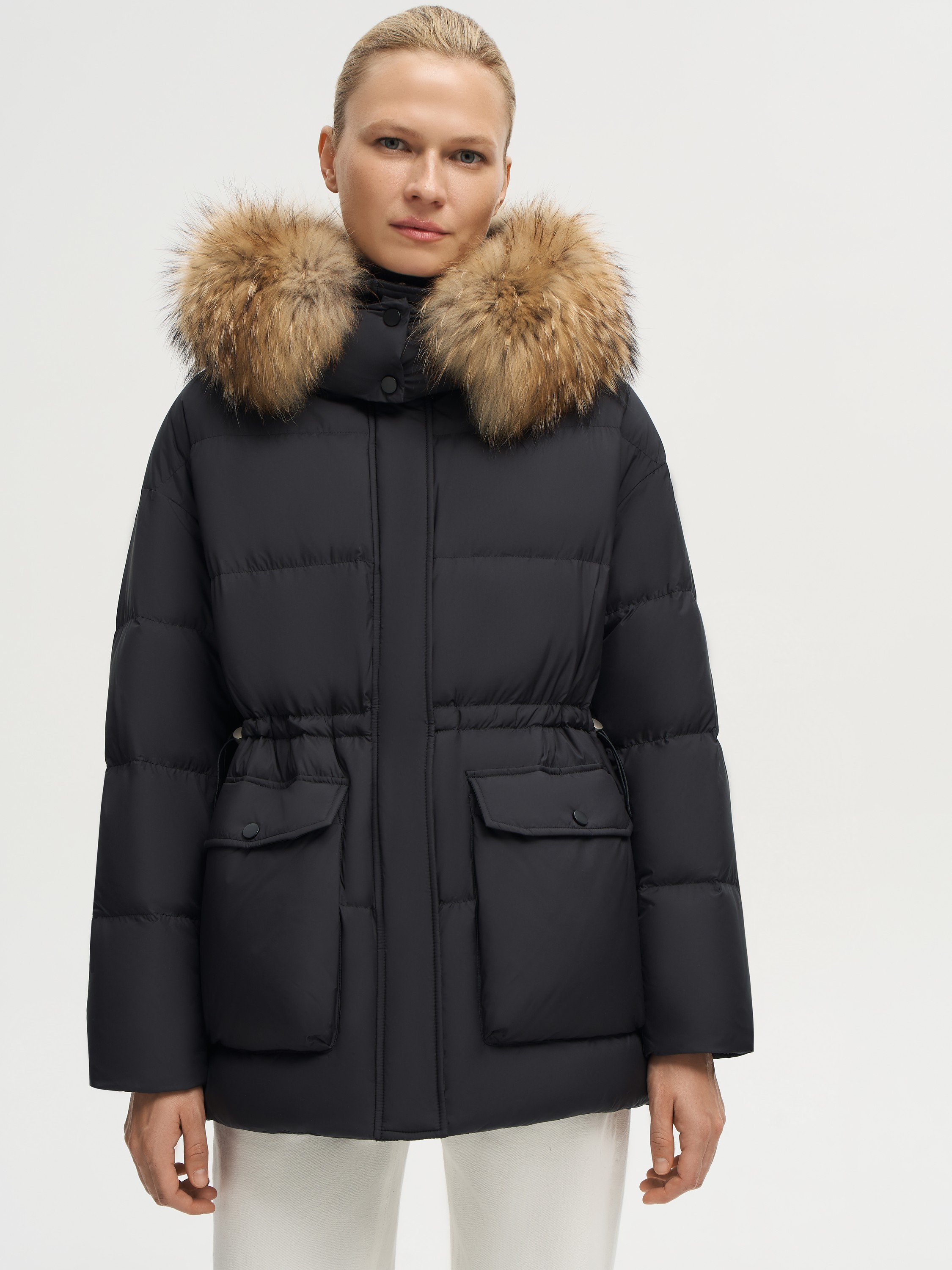 Пуховик с наполнителем из пуха и пера белой утки, обеспечивающим высокую теплоизоляцию при легком весе. Верх выполнен из 100% полиэстера — прочного и износостойкого материала, обработанного по технологии пуховых пакетов: структура ткани снижает миграцию пуха и обеспечивает защиту от ветра и влаги. Крой прямой, со скрытой застежкой на молнию и планку, фиксирующую тепло. Объемный капюшон декорирован натуральным мехом енота, который добавляет выразительности и защищает от холода. Большие накладные карманы подчеркивают функциональность модели. Пуховик рассчитан на холодный сезон, сохраняя баланс практичности и современного дизайна.