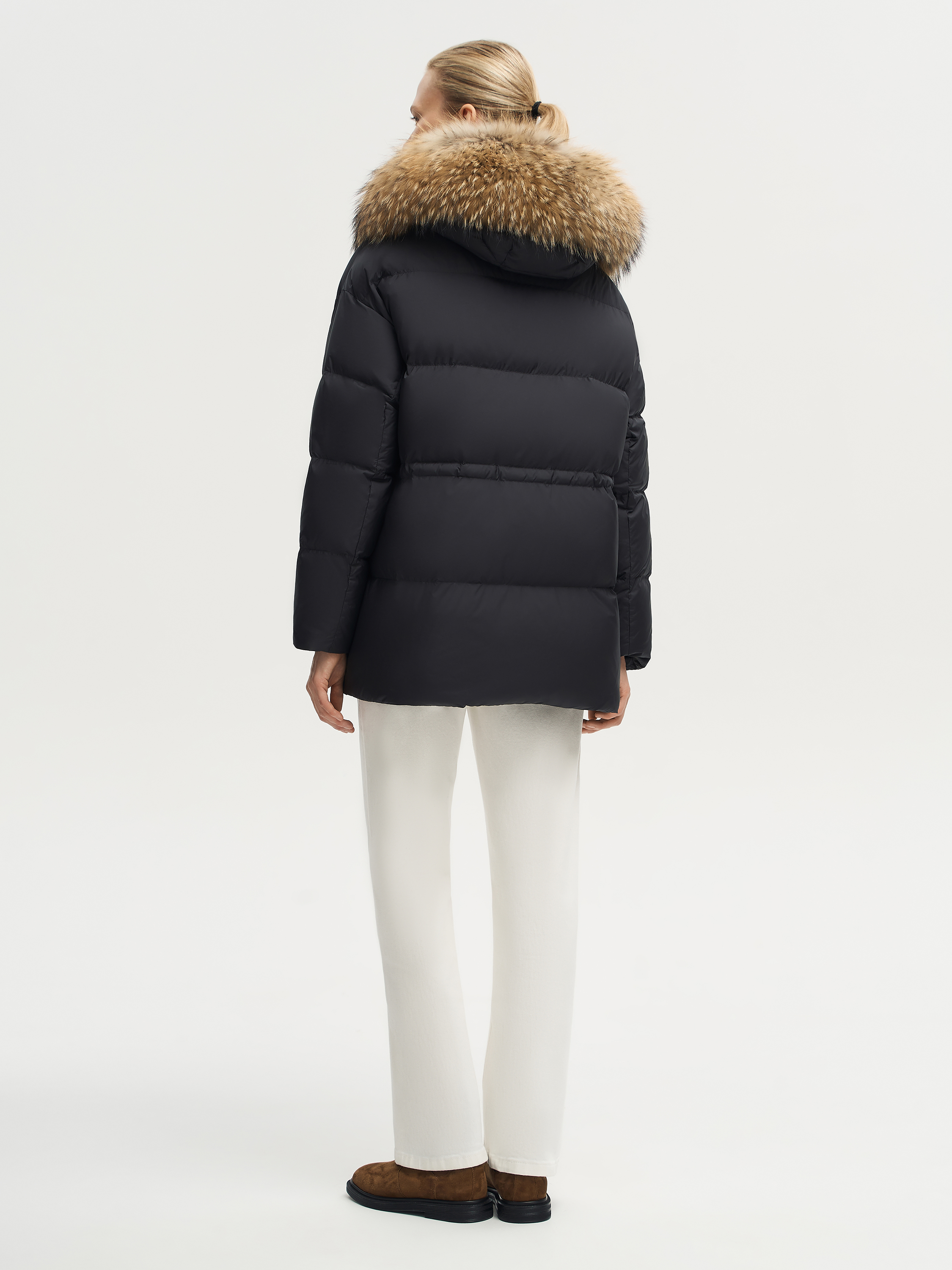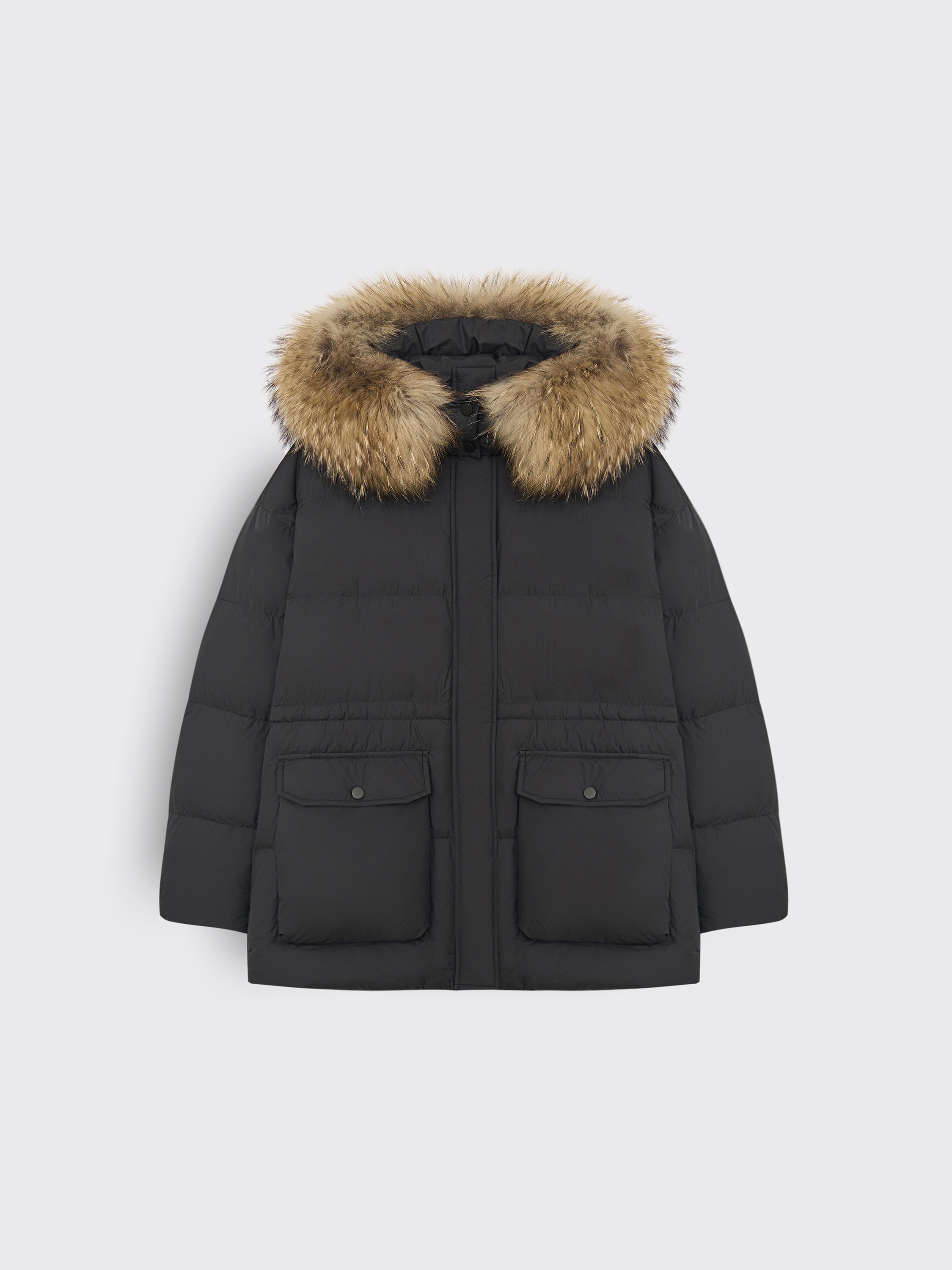 Пуховик с наполнителем из пуха и пера белой утки, обеспечивающим высокую теплоизоляцию при легком весе. Верх выполнен из 100% полиэстера — прочного и износостойкого материала, обработанного по технологии пуховых пакетов: структура ткани снижает миграцию пуха и обеспечивает защиту от ветра и влаги. Крой прямой, со скрытой застежкой на молнию и планку, фиксирующую тепло. Объемный капюшон декорирован натуральным мехом енота, который добавляет выразительности и защищает от холода. Большие накладные карманы подчеркивают функциональность модели. Пуховик рассчитан на холодный сезон, сохраняя баланс практичности и современного дизайна.