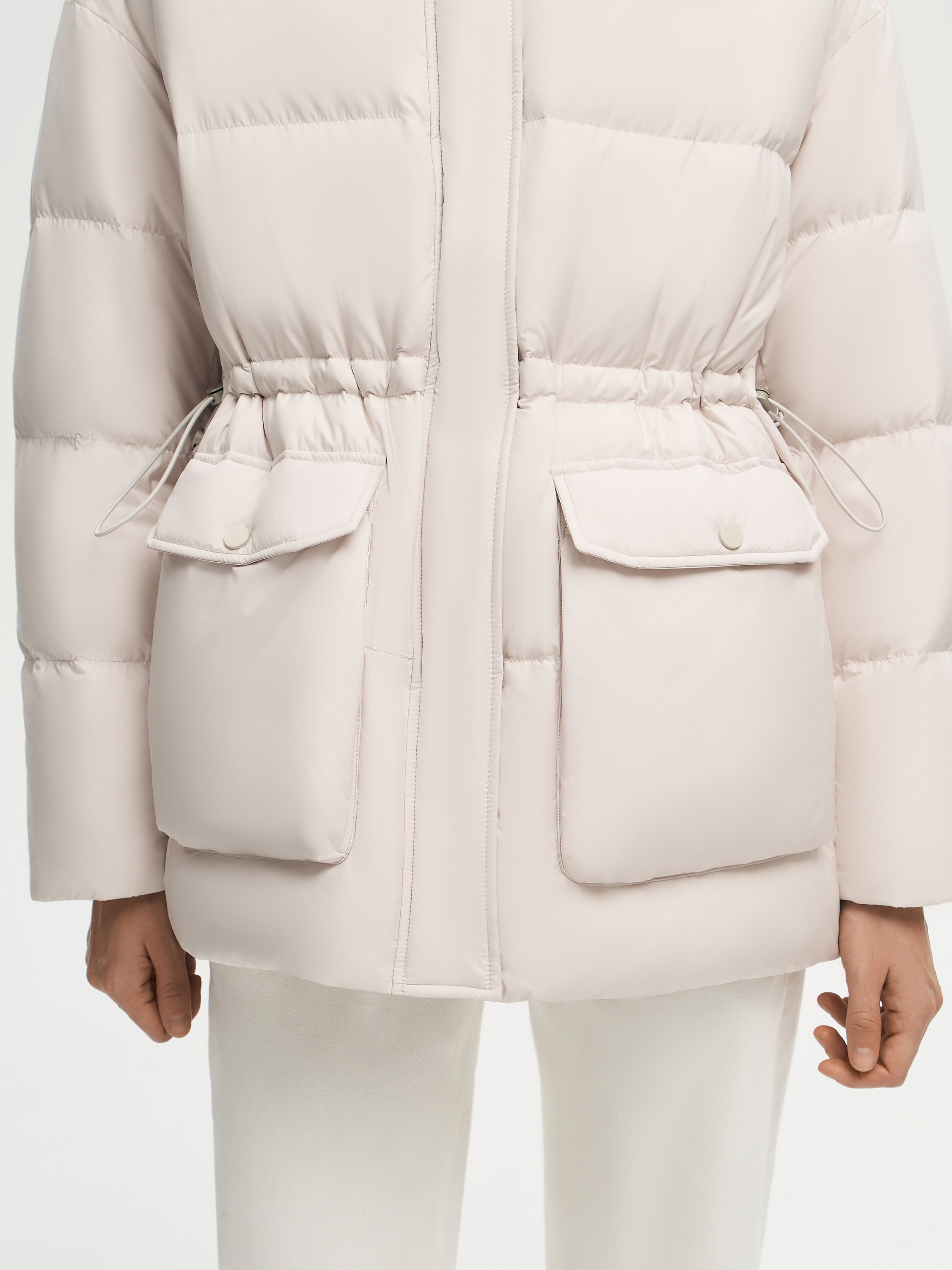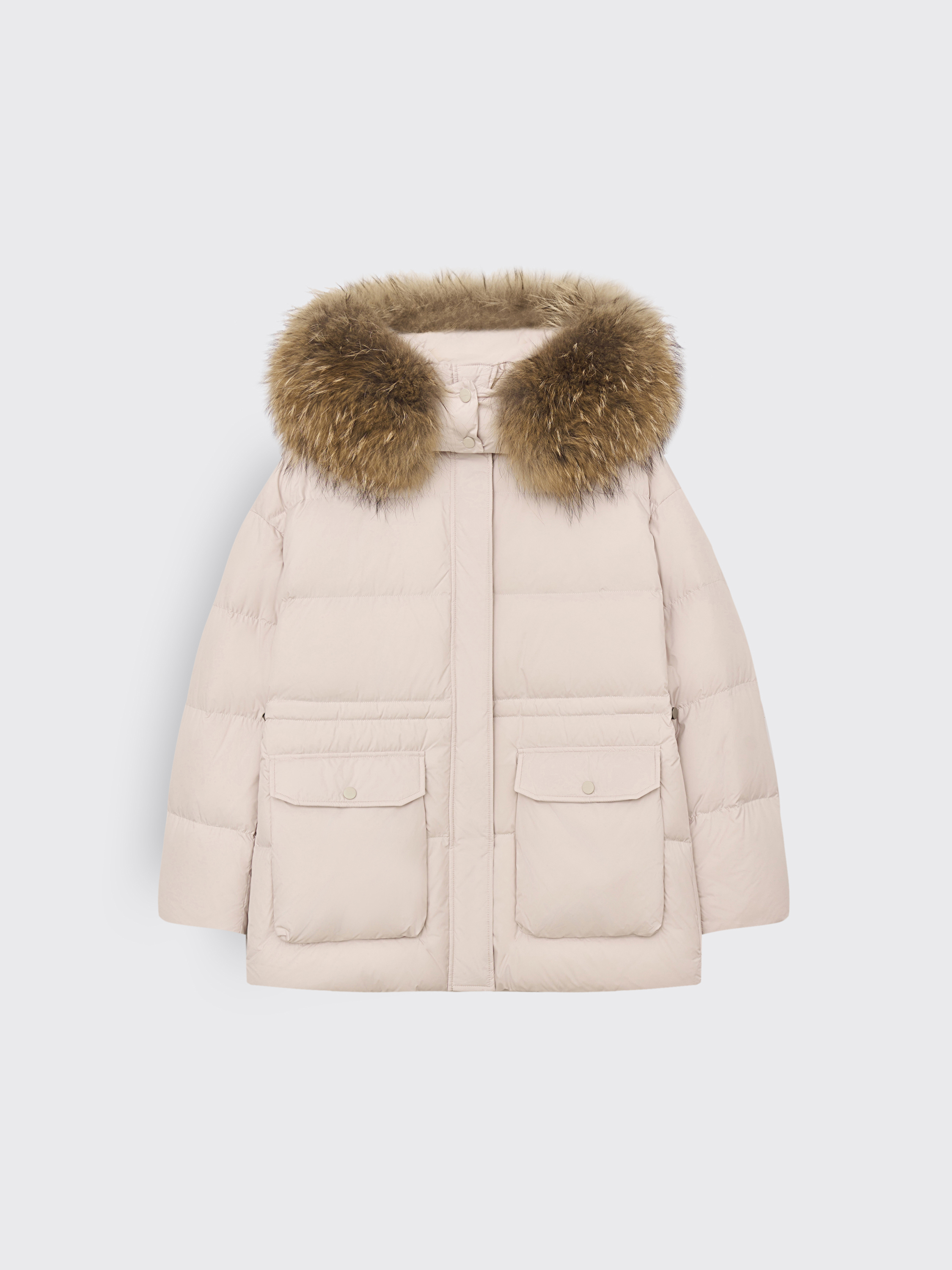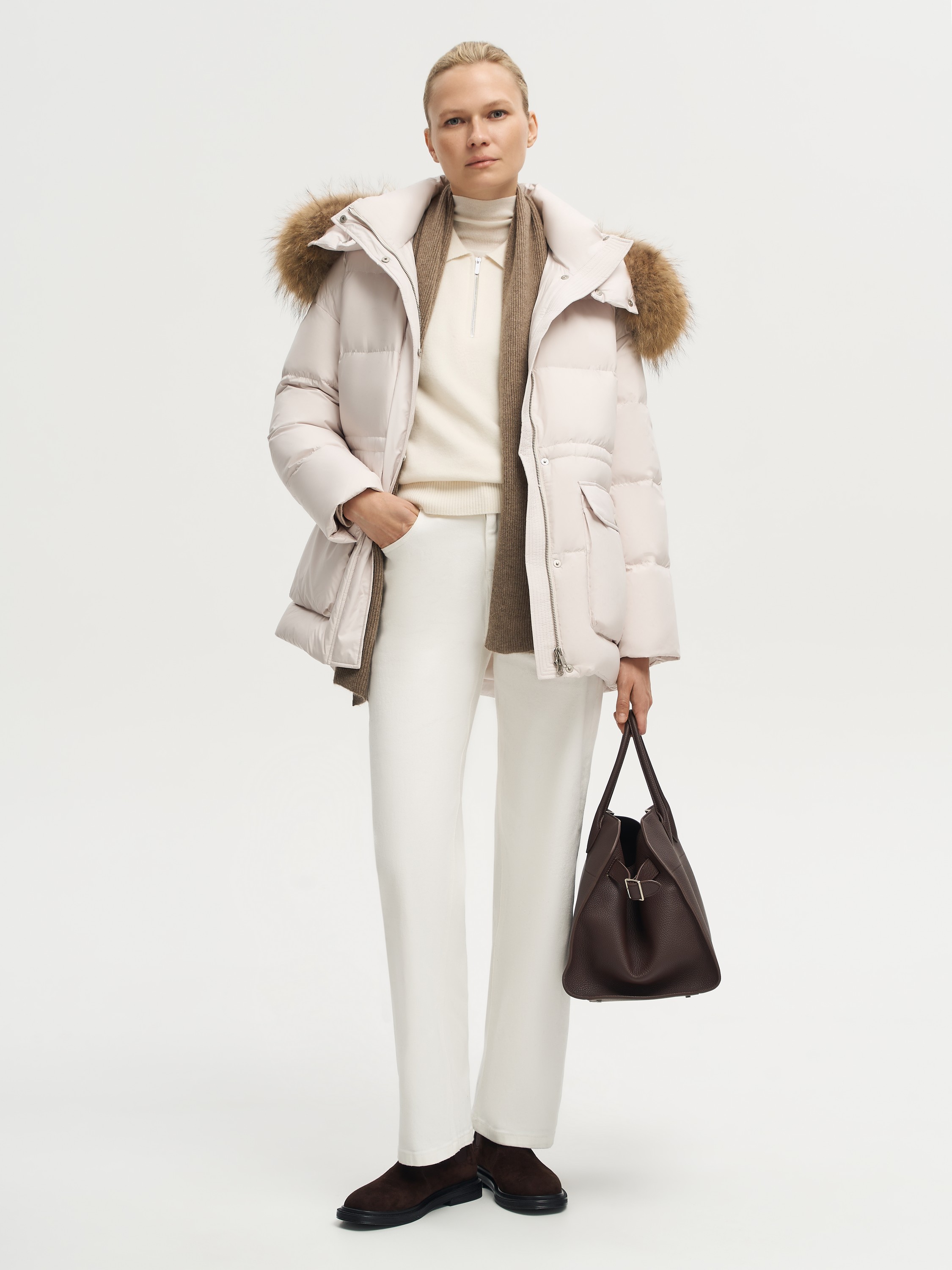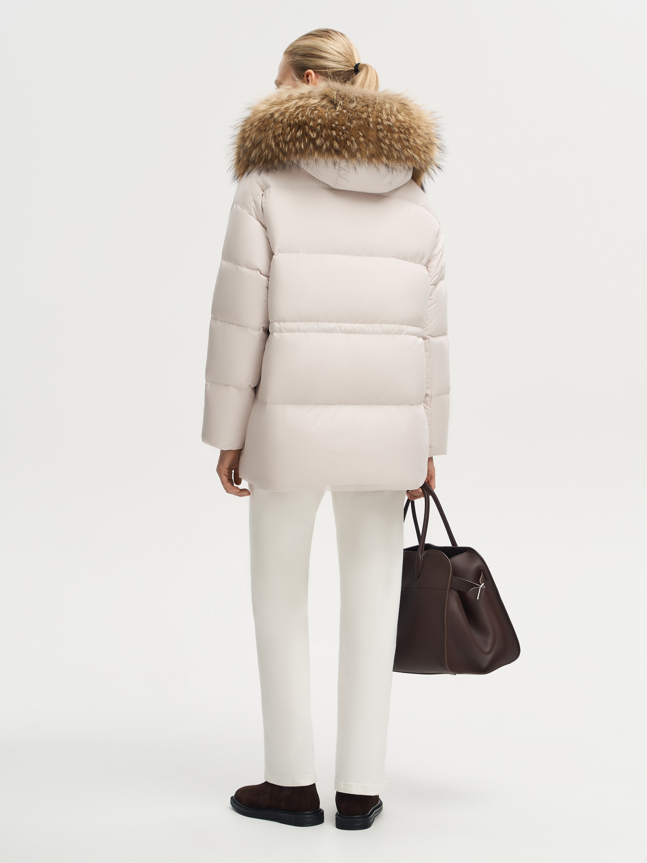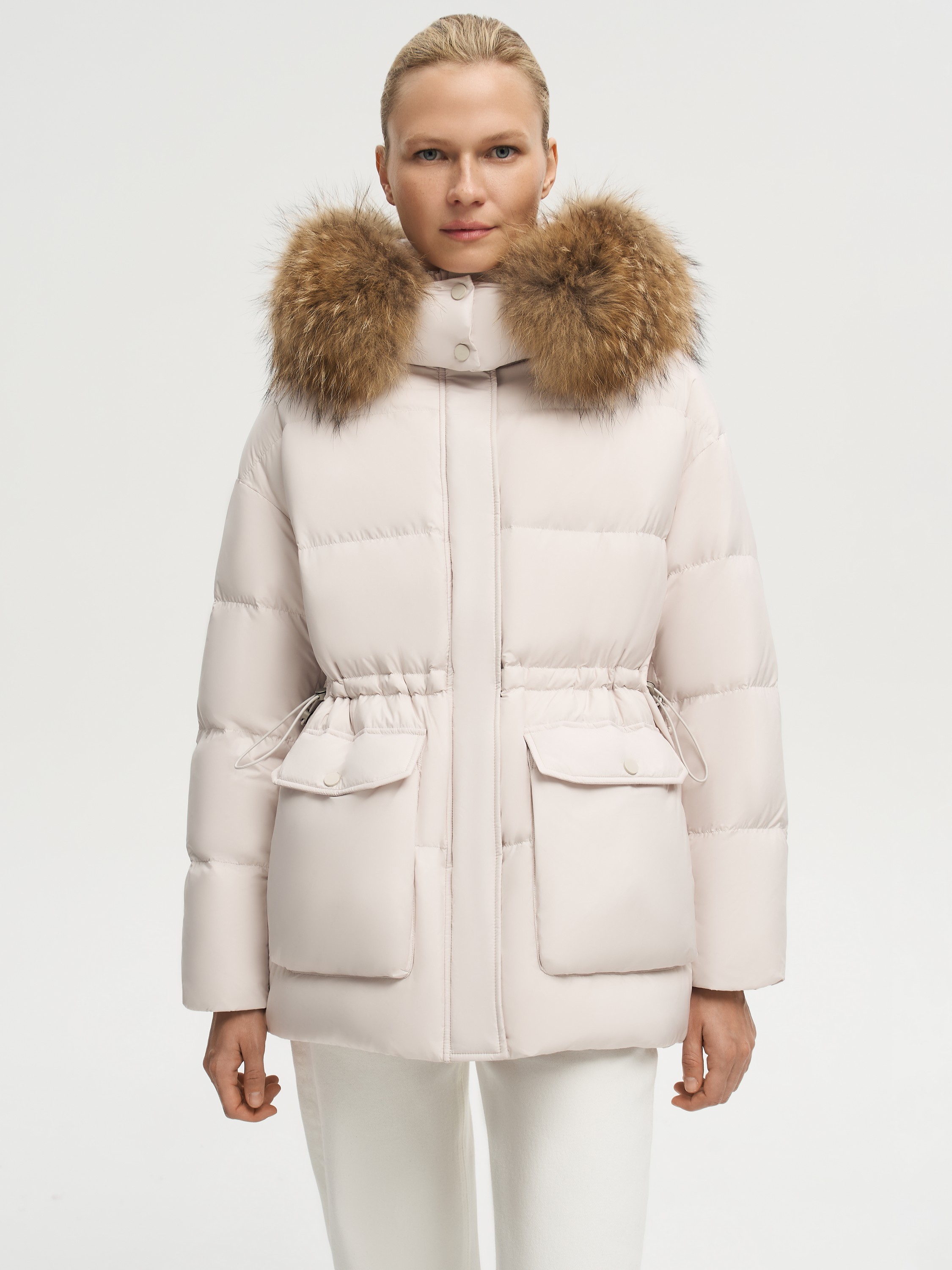 Пуховик с наполнителем из пуха и пера белой утки, обеспечивающим высокую теплоизоляцию при легком весе. Верх выполнен из 100% полиэстера — прочного и износостойкого материала, обработанного по технологии пуховых пакетов: структура ткани снижает миграцию пуха и обеспечивает защиту от ветра и влаги. Крой прямой, со скрытой застежкой на молнию и планку, фиксирующую тепло. Объемный капюшон декорирован натуральным мехом енота, который добавляет выразительности и защищает от холода. Большие накладные карманы подчеркивают функциональность модели. Пуховик рассчитан на холодный сезон, сохраняя баланс практичности и современного дизайна.