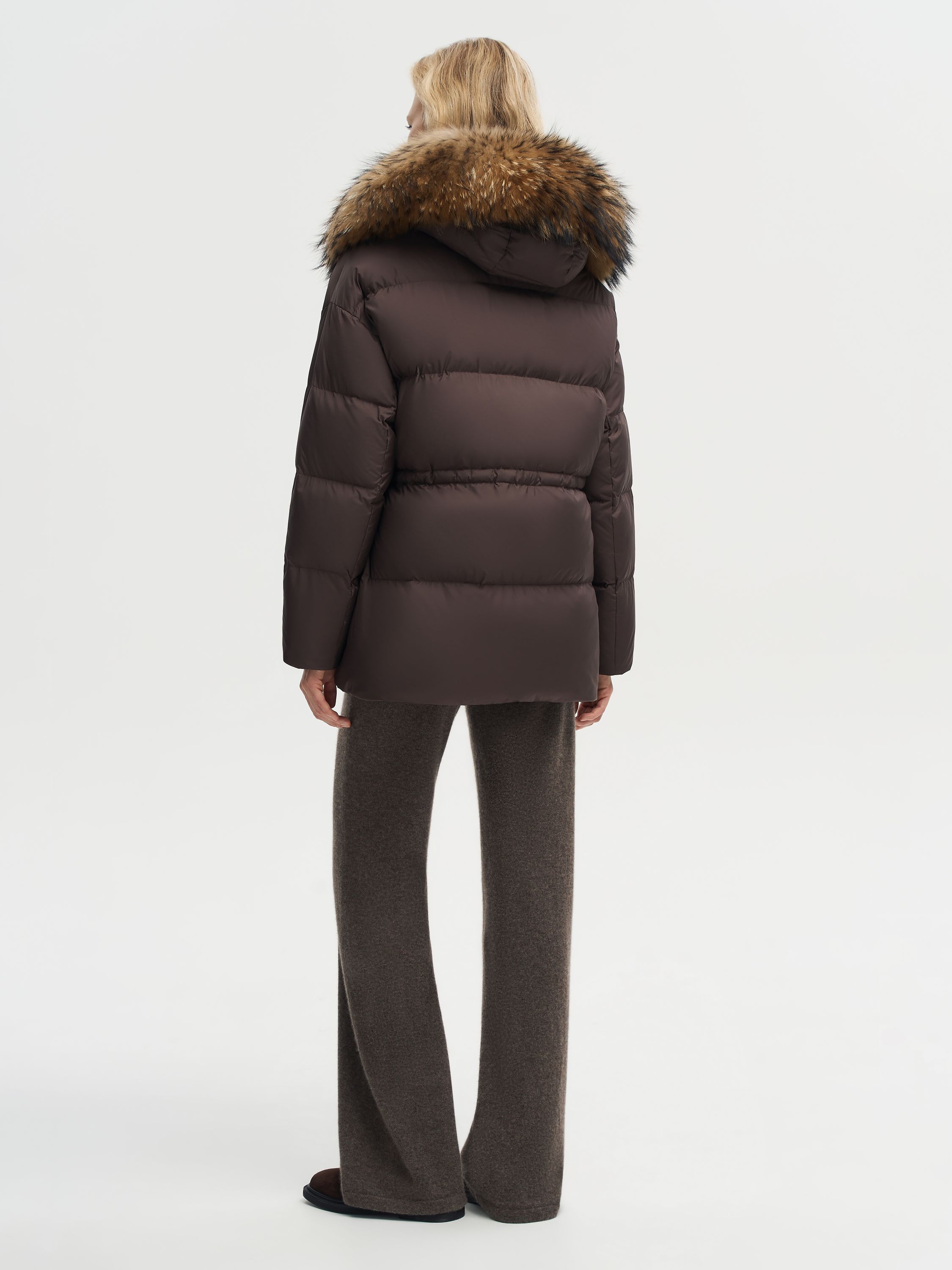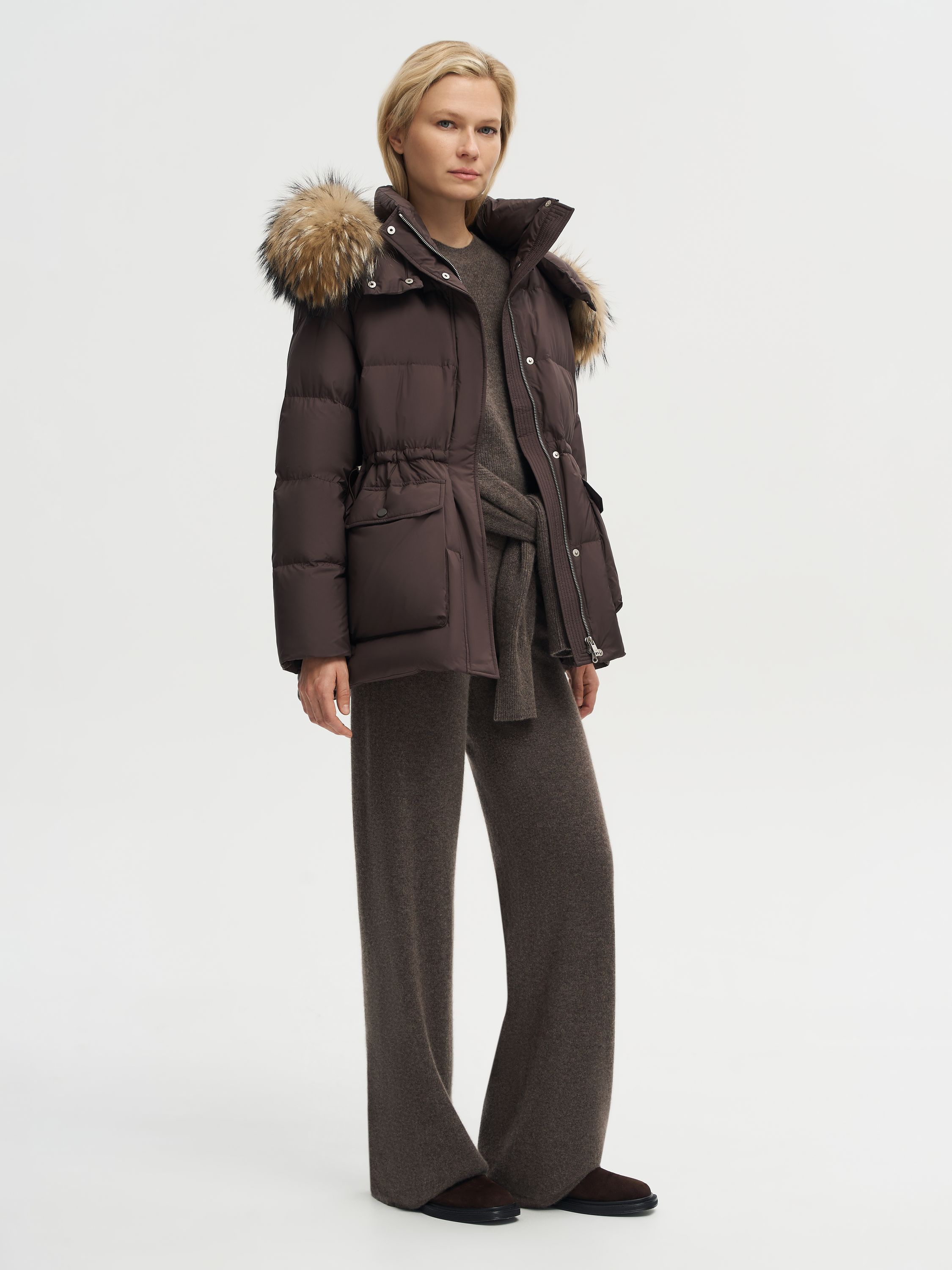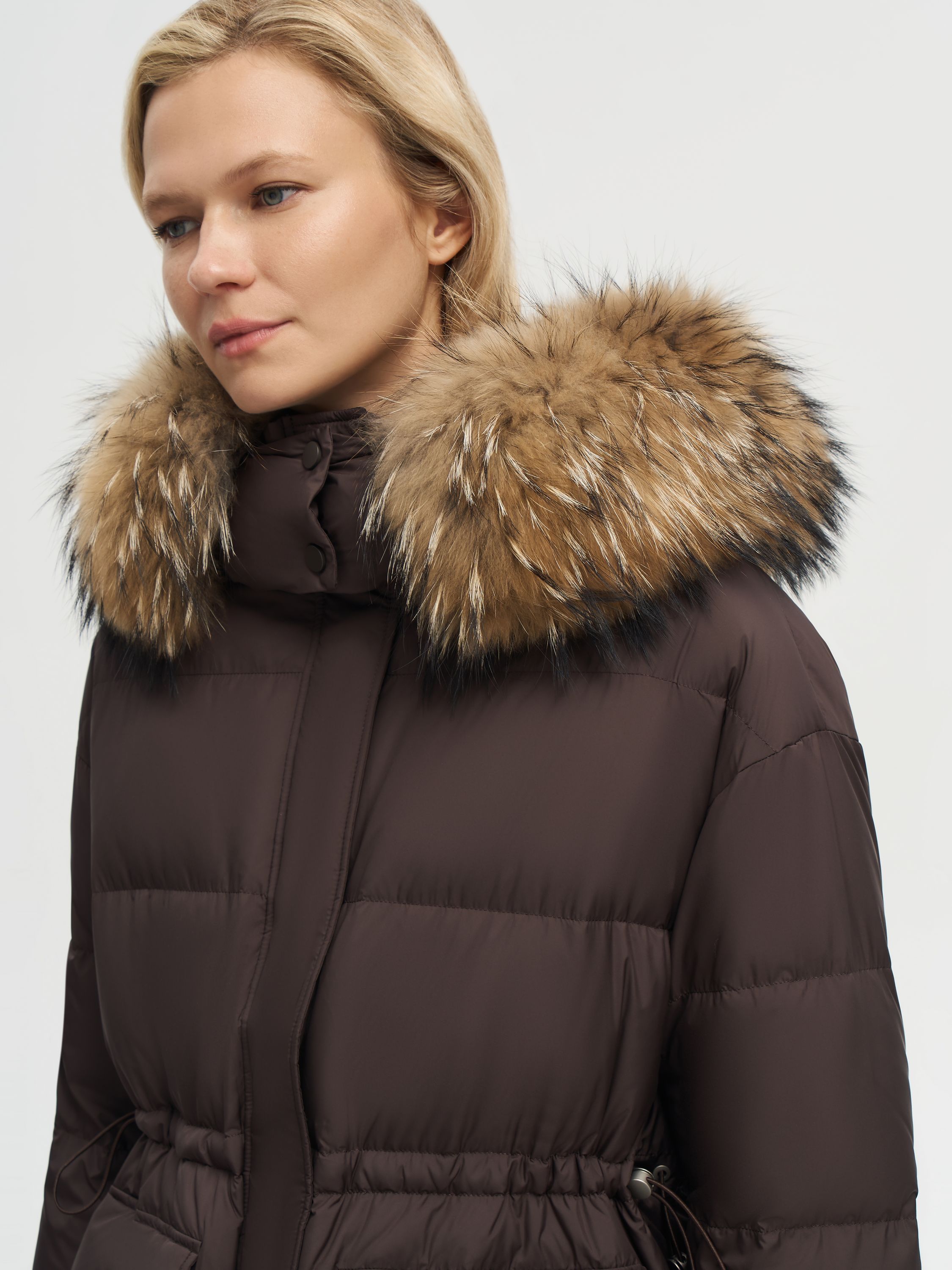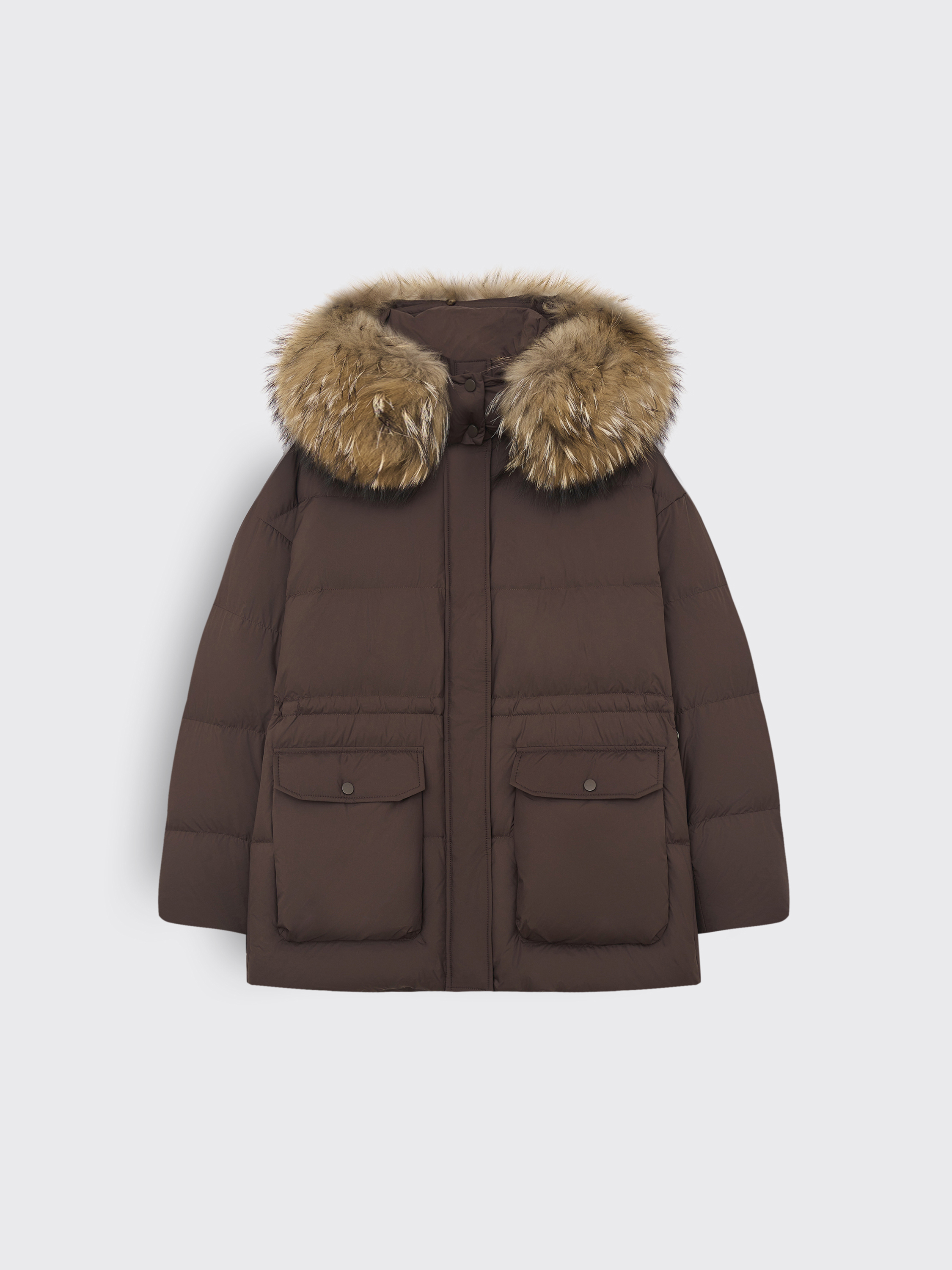 Пуховик с наполнителем из пуха и пера белой утки, обеспечивающим высокую теплоизоляцию при легком весе. Верх выполнен из 100% полиэстера — прочного и износостойкого материала, обработанного по технологии пуховых пакетов: структура ткани снижает миграцию пуха и обеспечивает защиту от ветра и влаги. Крой прямой, со скрытой застежкой на молнию и планку, фиксирующую тепло. Объемный капюшон декорирован натуральным мехом енота, который добавляет выразительности и защищает от холода. Большие накладные карманы подчеркивают функциональность модели. Пуховик рассчитан на холодный сезон, сохраняя баланс практичности и современного дизайна.
