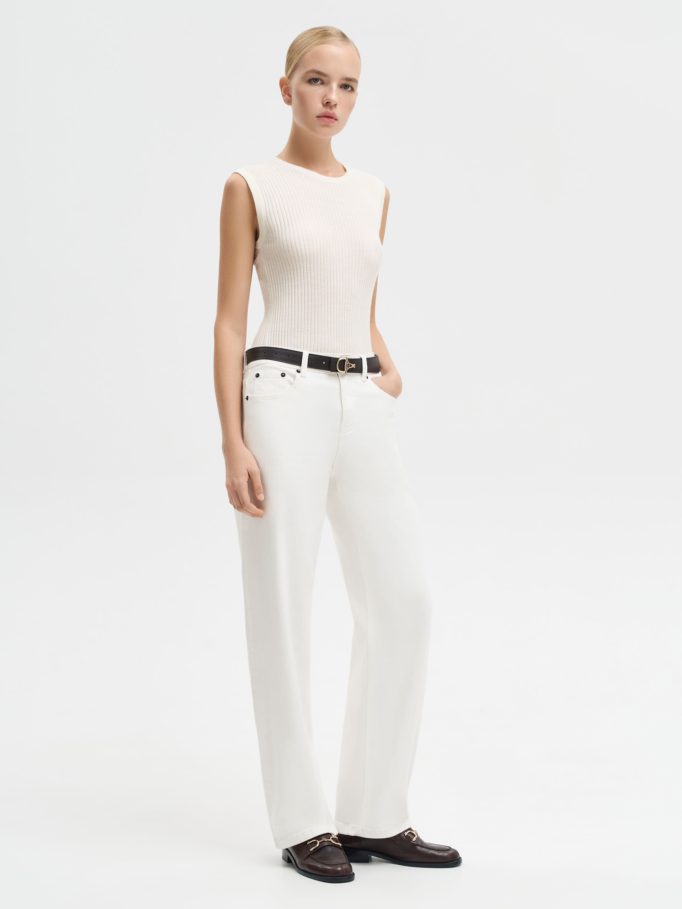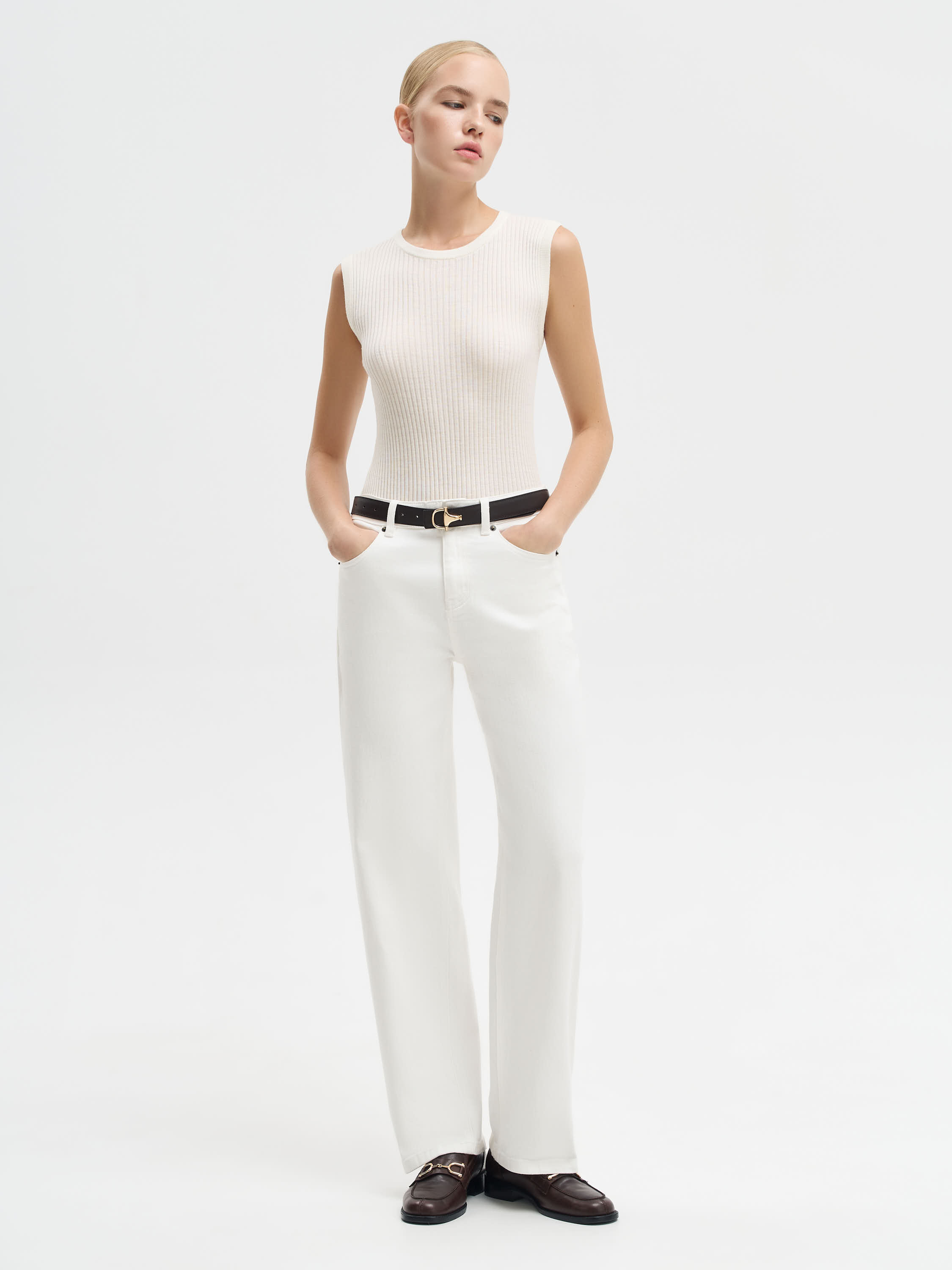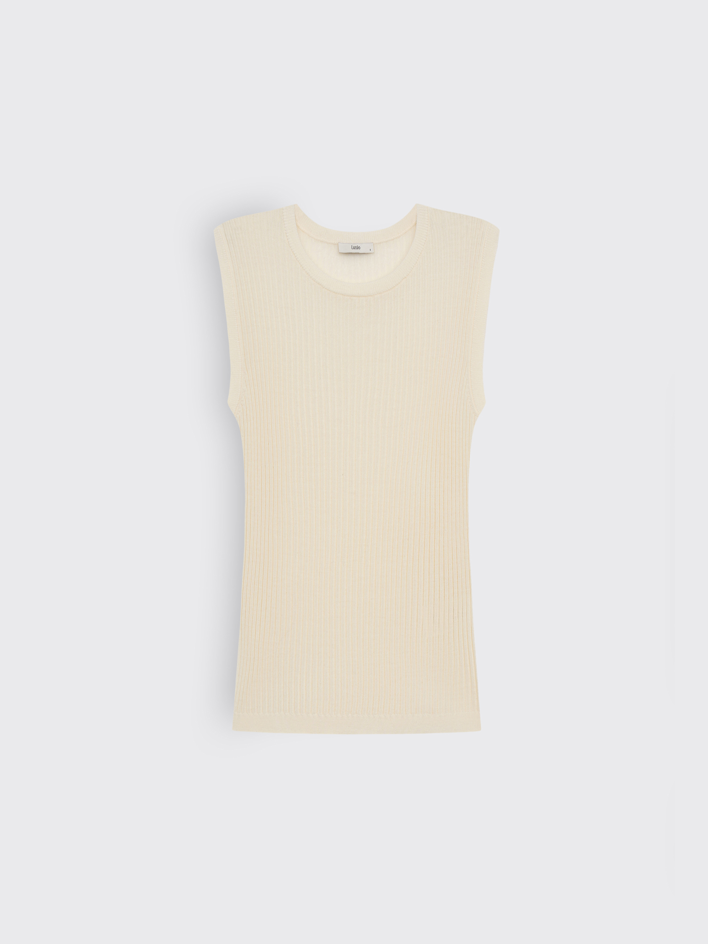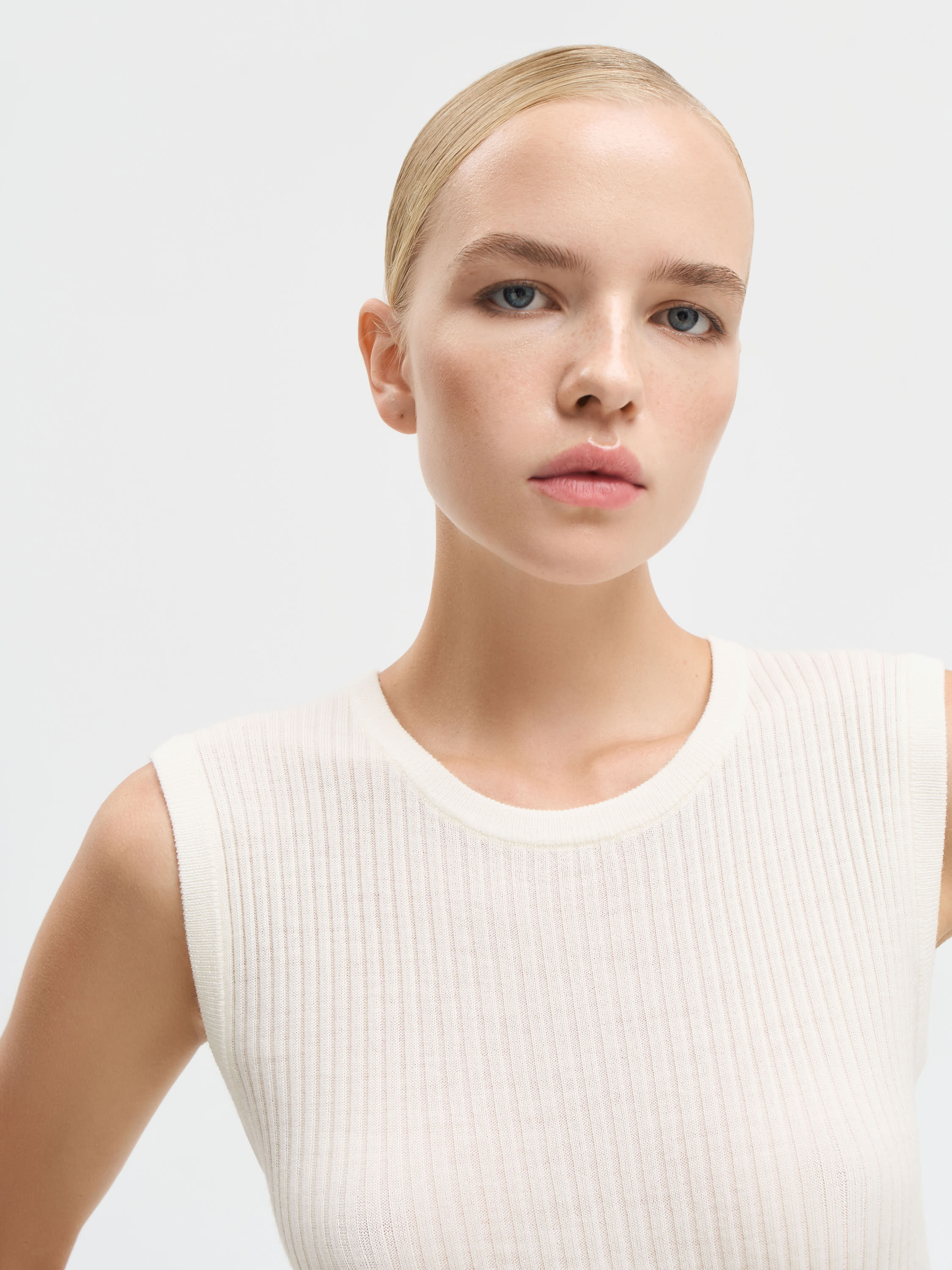 Топ без рукавов из тонкой шерсти мериноса отличается мягкостью и пластичностью полотна, которое комфортно прилегает к телу и сохраняет тепло. Вязка в рубчик добавляет эластичности и помогает изделию держать форму при носке. Прямой крой с круглым вырезом подчеркивает лаконичность силуэта, а продуманная посадка делает модель универсальной основой гардероба. Такой топ можно носить самостоятельно в теплое время года или использовать как первый слой в многослойных комплектах с жакетами, жилетами и кардиганами.