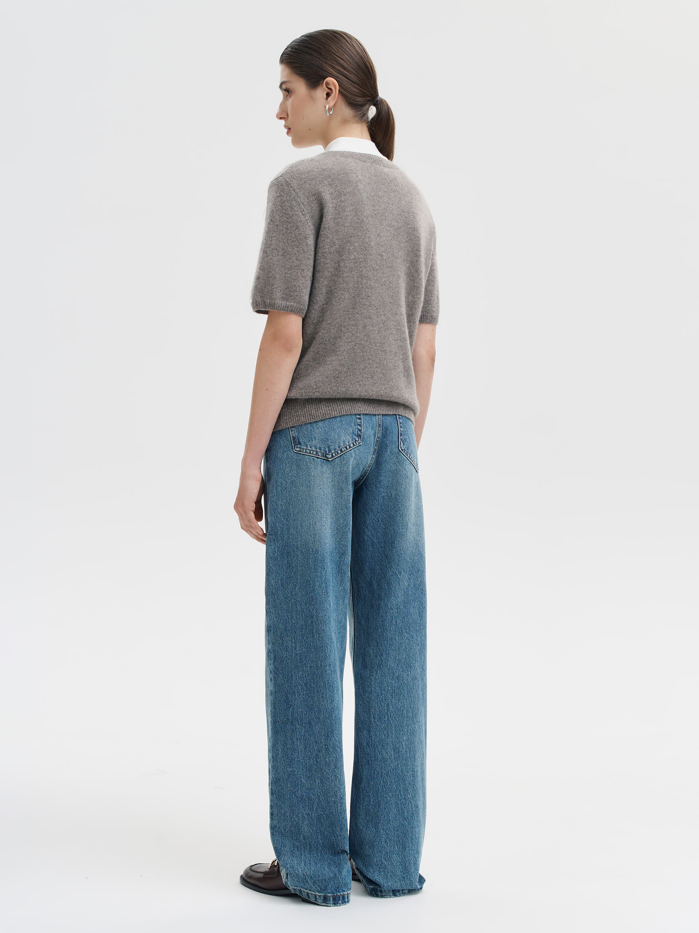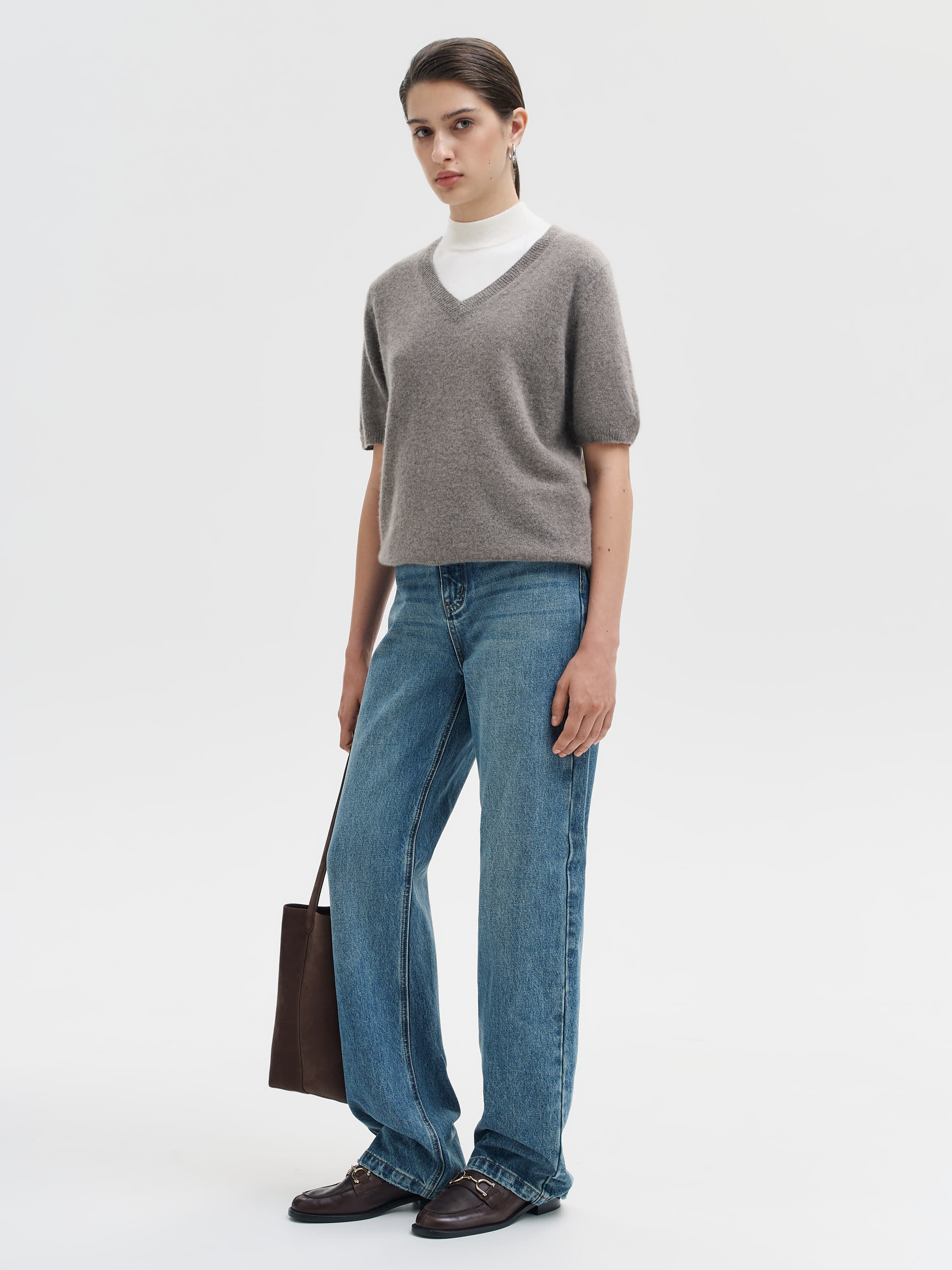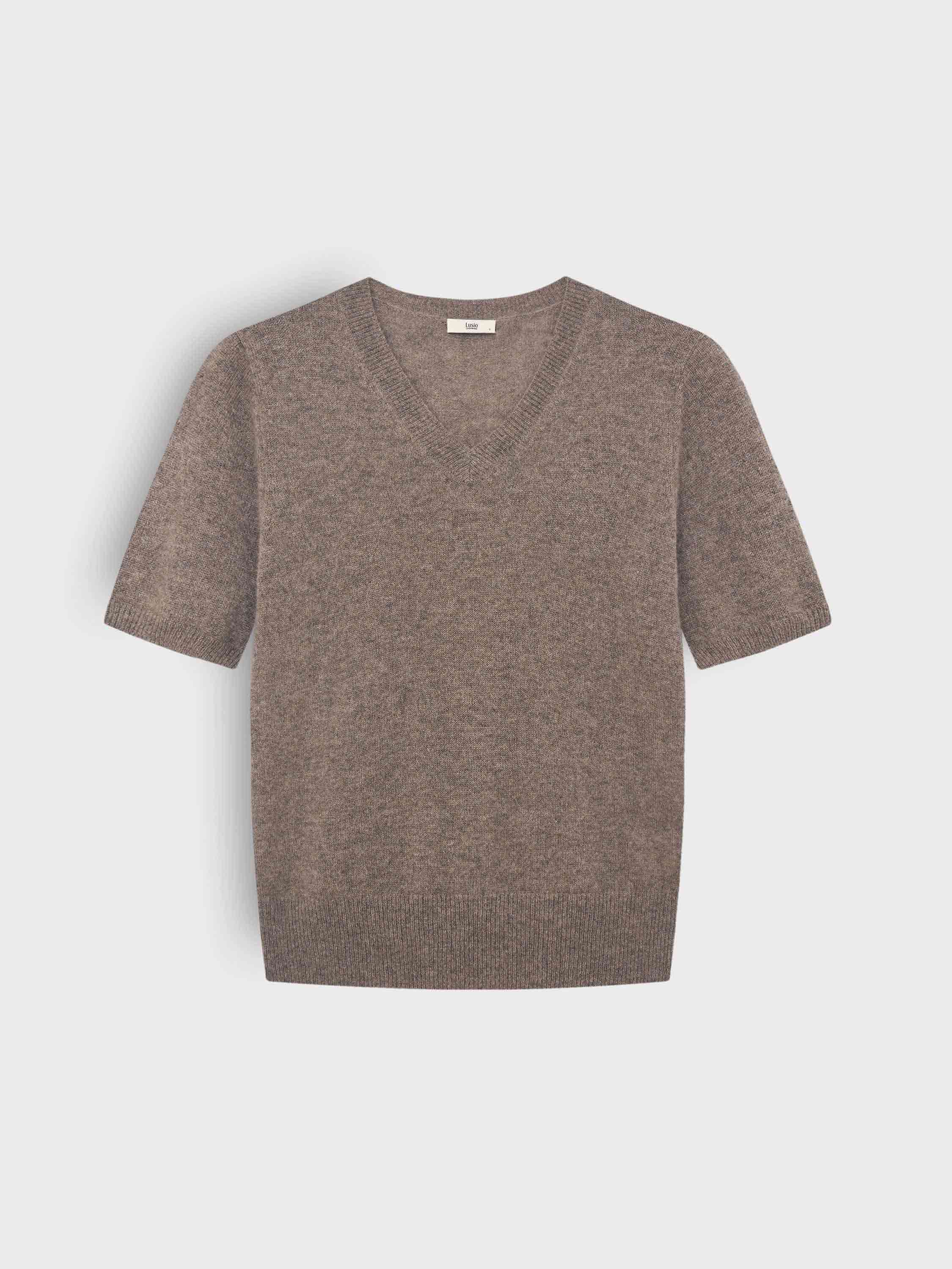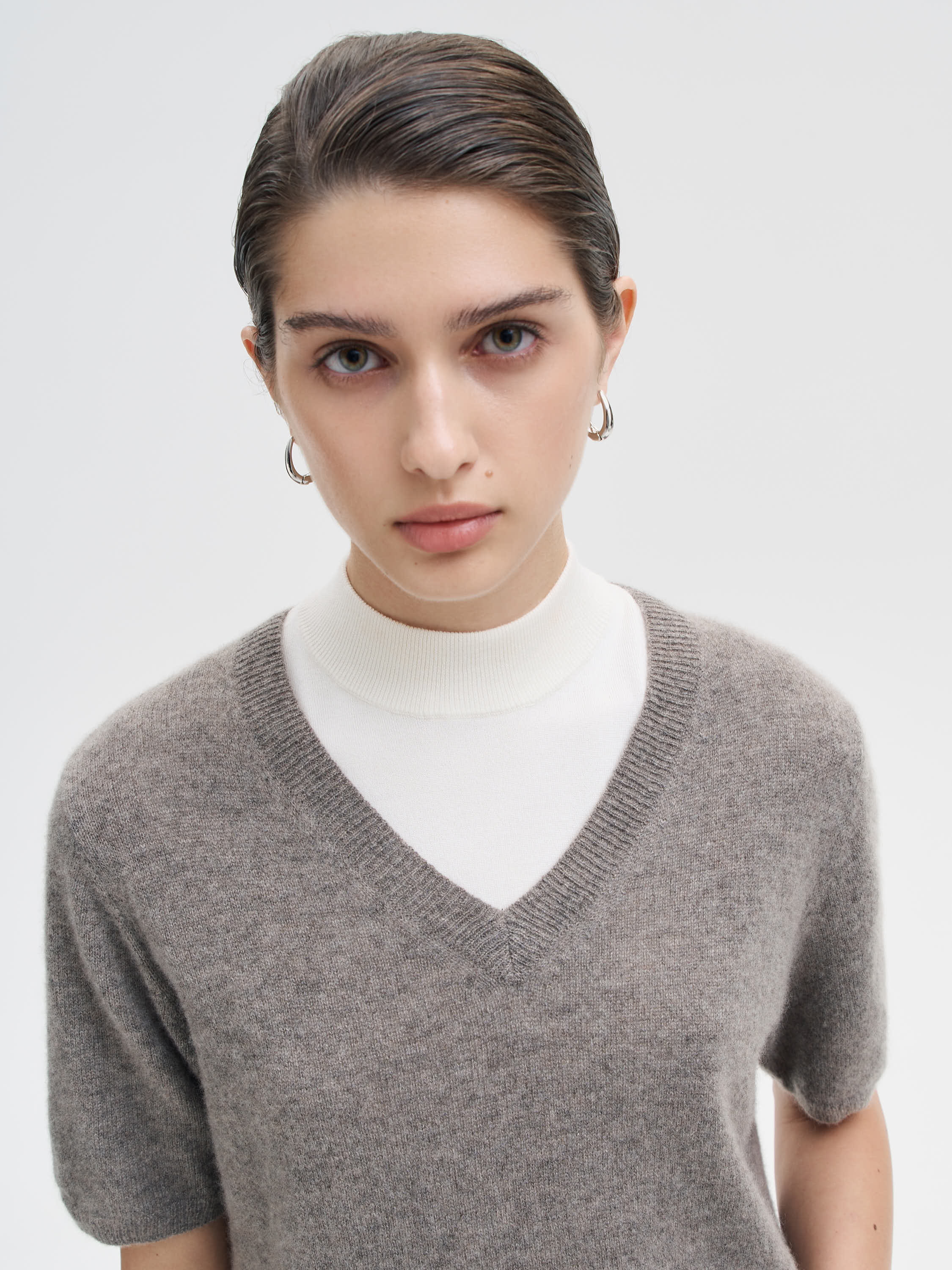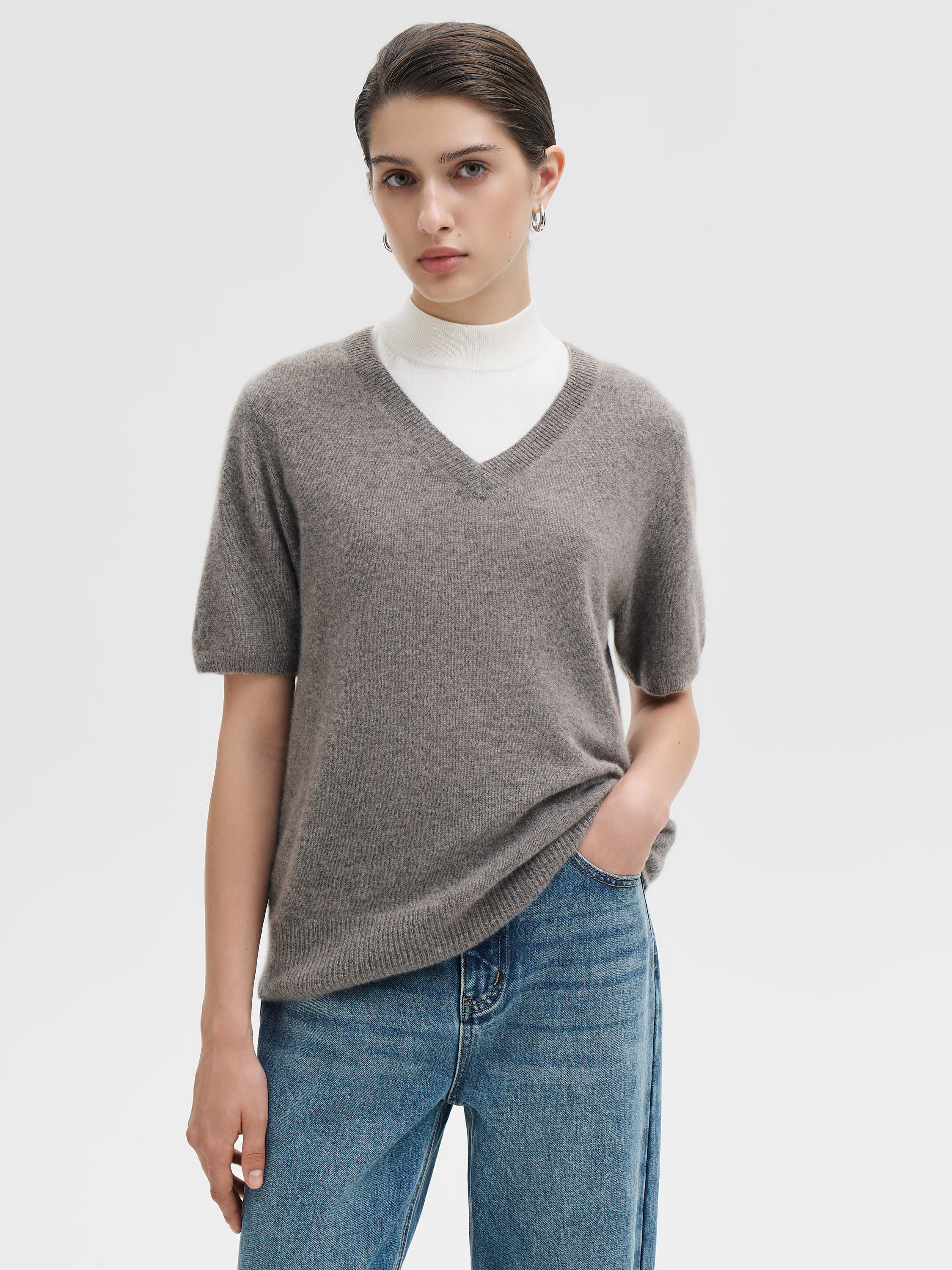 Топ из чистого кашемира с мягкой, рассеянной фактурой и расслабленным силуэтом. Тонкая, пластичная пряжа комфортна к телу и сохраняет тепло при легкости самой модели. Глубокий V-образный вырез создает вытянутый силуэт и легко адаптируется под многослойность с водолазками, рубашками, футболками. Короткий рукав и укороченная длина сбалансированы за счет плотной резинки по низу, благодаря которой топ аккуратно садится по фигуре. Сложный светлый оттенок делает модель универсальной и мягко освежает лицо. Работает и как базовый элемент, и как самостоятельный акцент в образе.