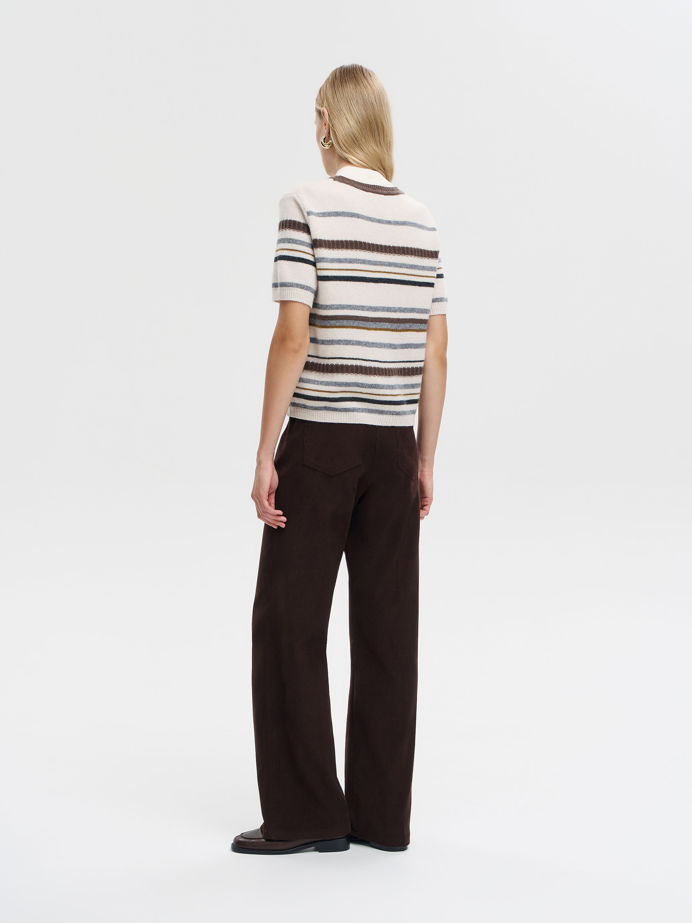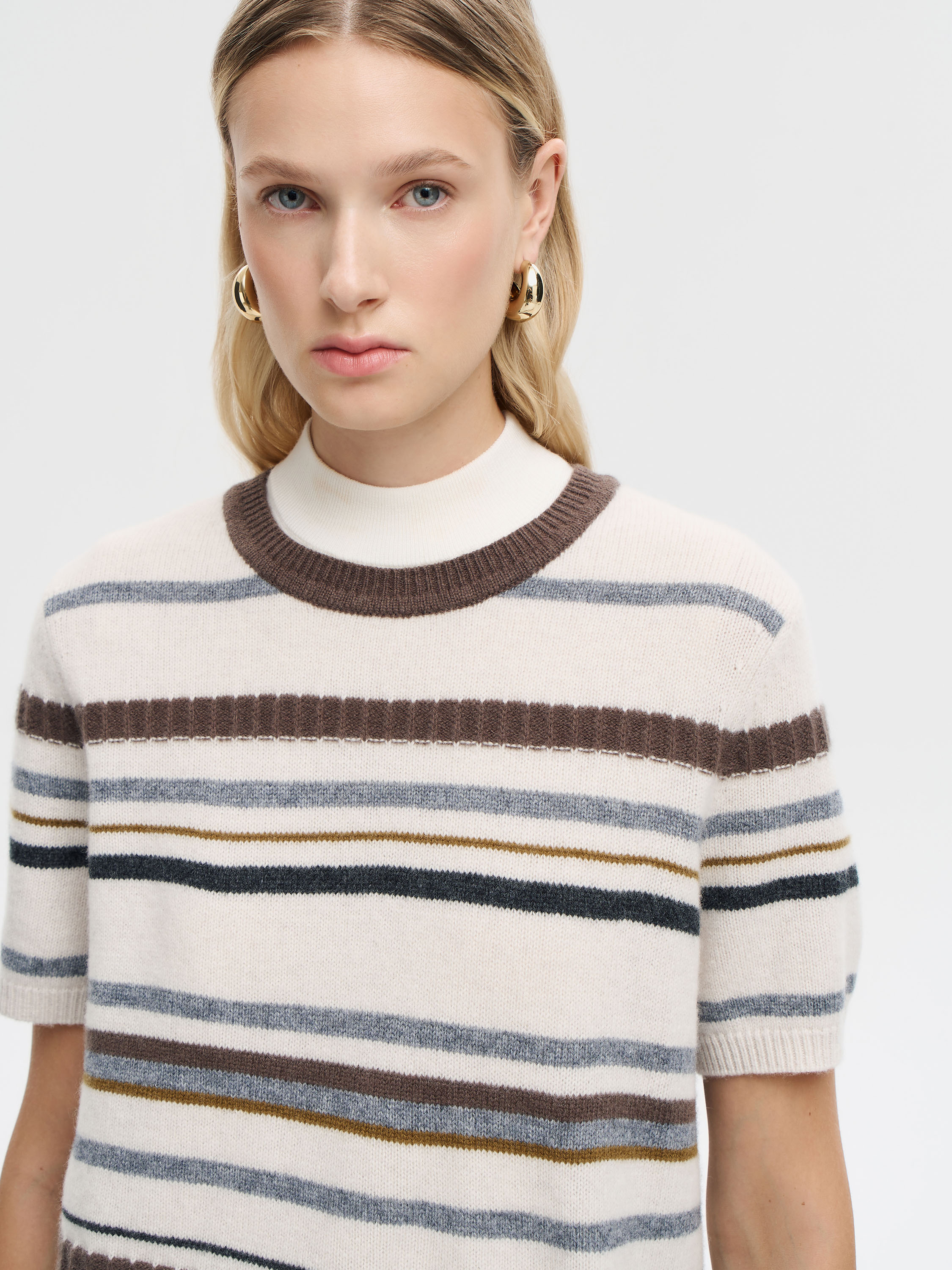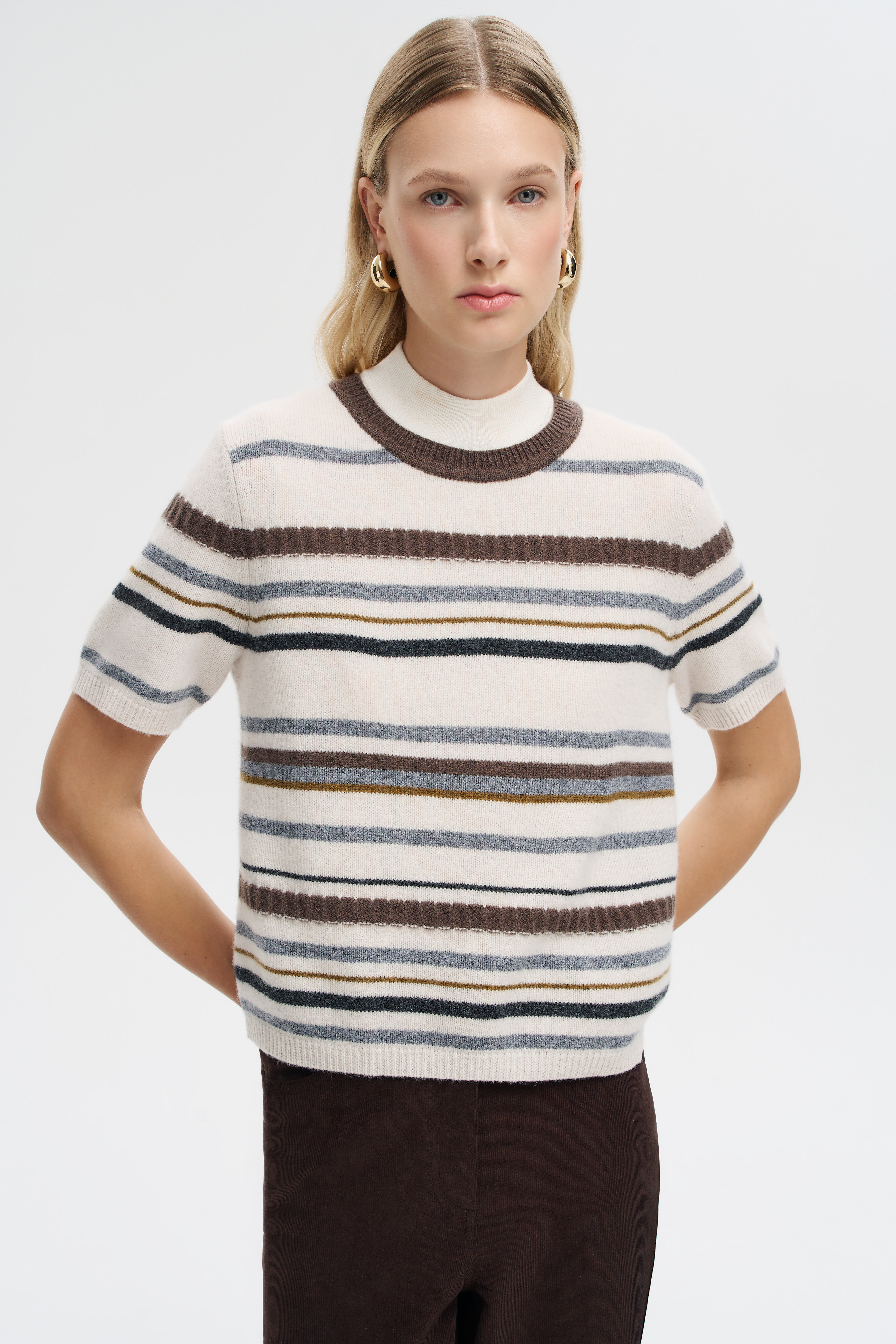 Топ из мягкой шерсти мериноса с тонкой вязкой и приятной тактильностью. Материал дышащий и пластичный, обеспечивает комфорт в носке и легкое тепло. Крой прямой, с короткими рукавами и круглым вырезом, дополненным аккуратной резинкой. Контрастные полосы формируют ритмичный рисунок, придавая модели графичность и современный характер. Топ легко вписывается в повседневные образы с брюками или джинсами, а также гармонично сочетается с жакетами и кардиганами в многослойных комплектах.