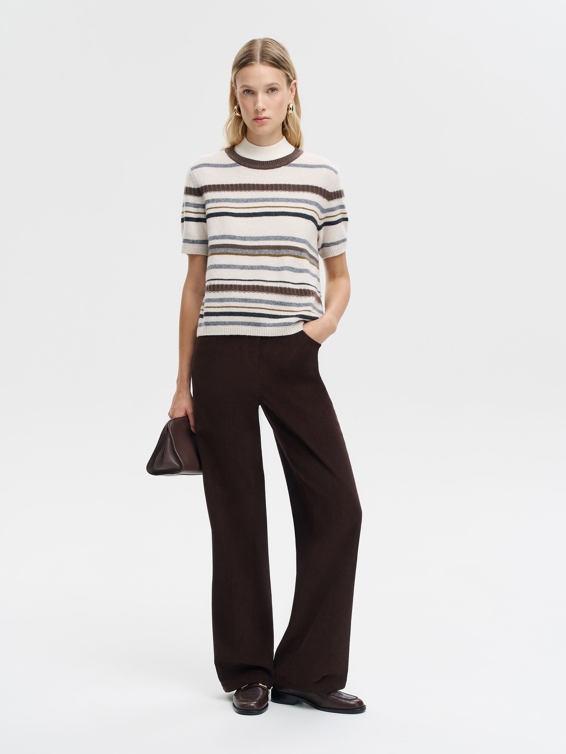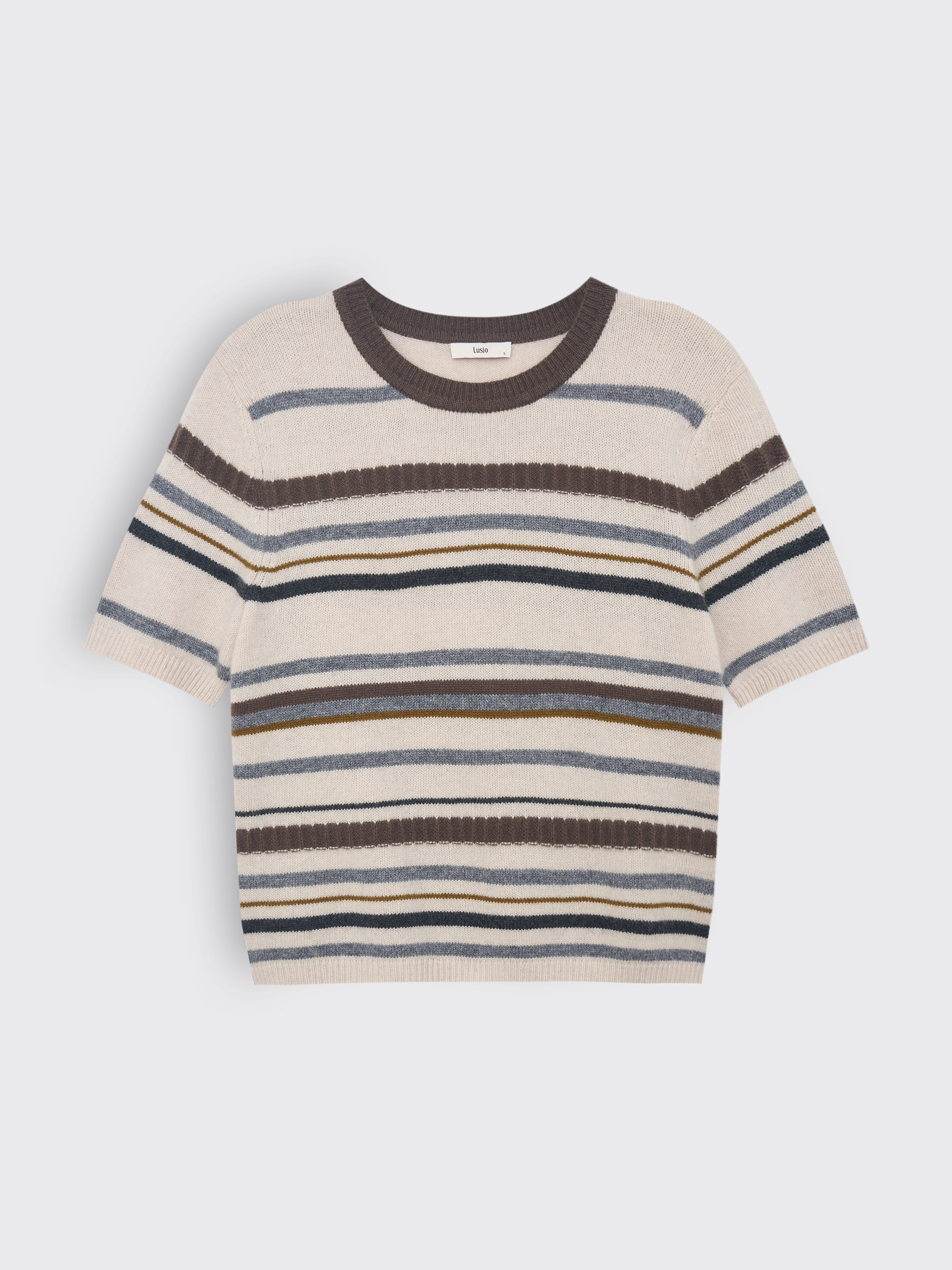 Топ из мягкой шерсти мериноса с тонкой вязкой и приятной тактильностью. Материал дышащий и пластичный, обеспечивает комфорт в носке и легкое тепло. Крой прямой, с короткими рукавами и круглым вырезом, дополненным аккуратной резинкой. Контрастные полосы формируют ритмичный рисунок, придавая модели графичность и современный характер. Топ легко вписывается в повседневные образы с брюками или джинсами, а также гармонично сочетается с жакетами и кардиганами в многослойных комплектах.
