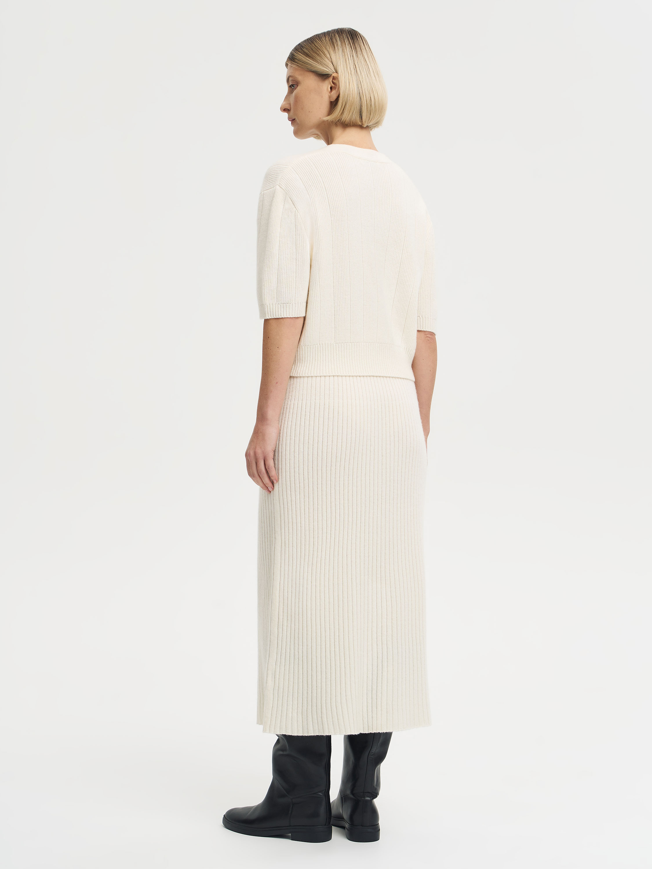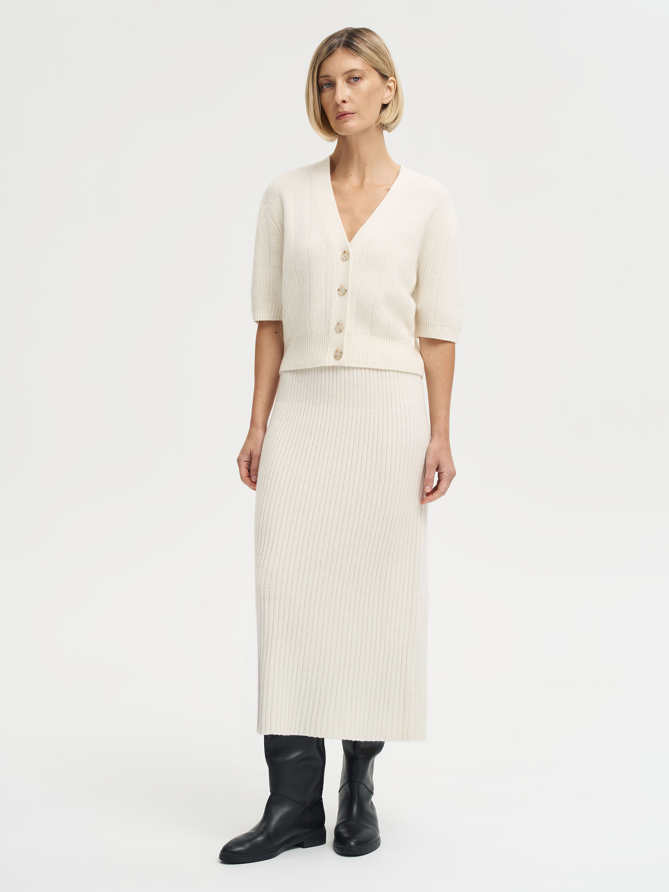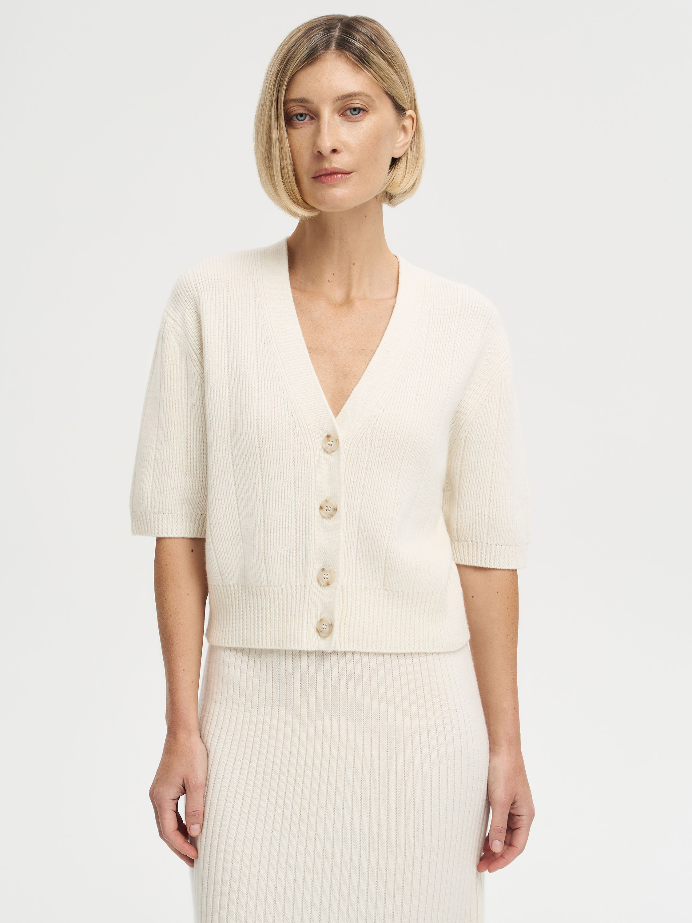 Топ из шерсти мериноса и кашемира — современная интерпретация классического трикотажа. Мягкое полотно с вертикальной вязкой создает комфортную посадку и подчеркивает естественные линии силуэта. Укороченная длина и рукава до локтя делают модель универсальной: ее можно носить как самостоятельную вещь или как часть комплекта с юбкой из той же пряжи. Аккуратный V-образный вырез и крупные пуговицы добавляют лаконичному дизайну выразительности. Благодаря сбалансированному составу топ сохраняет форму, приятен к телу и подходит для многослойных образов в межсезонье.