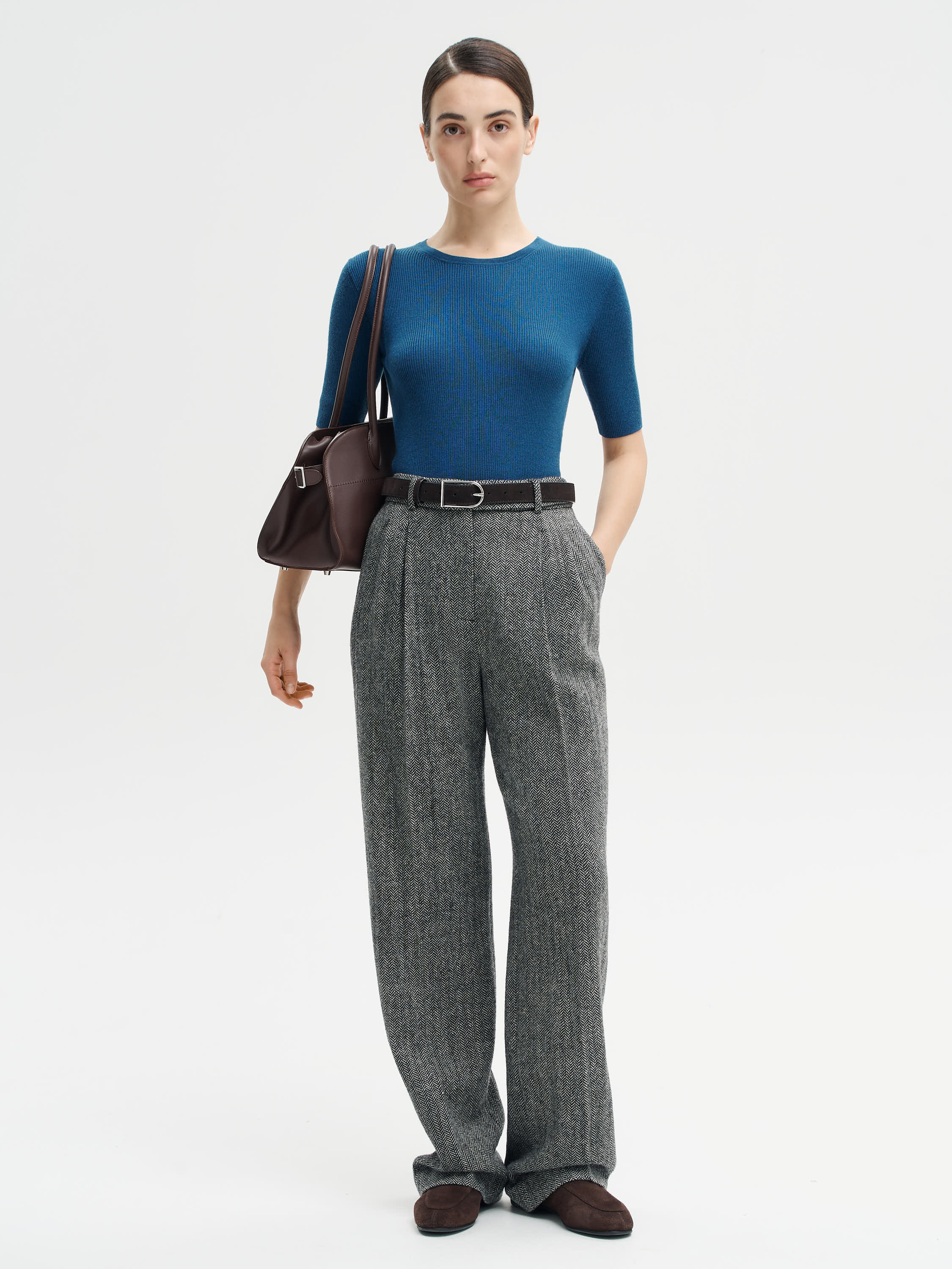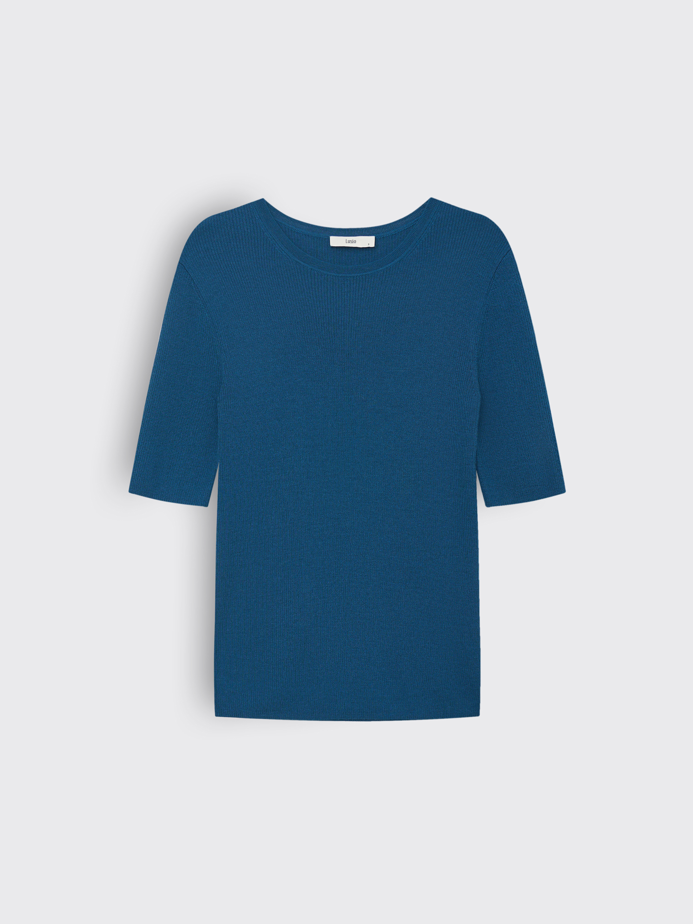 Топ из тонкой шерсти мериноса с добавлением шелка обладает мягкой, эластичной фактурой и комфортной посадкой. Материал дышащий, с естественным теплом и приятной тактильностью, подходит для носки в течение всего сезона. Крой прямой, с круглым вырезом и рукавами до локтя, которые формируют аккуратный силуэт. Края обработаны чисто и лаконично, без утяжеляющих деталей. Модель универсальна: ее можно носить как самостоятельный элемент с брюками или юбками, а также сочетать с жакетами и кардиганами в многослойных комплектах.