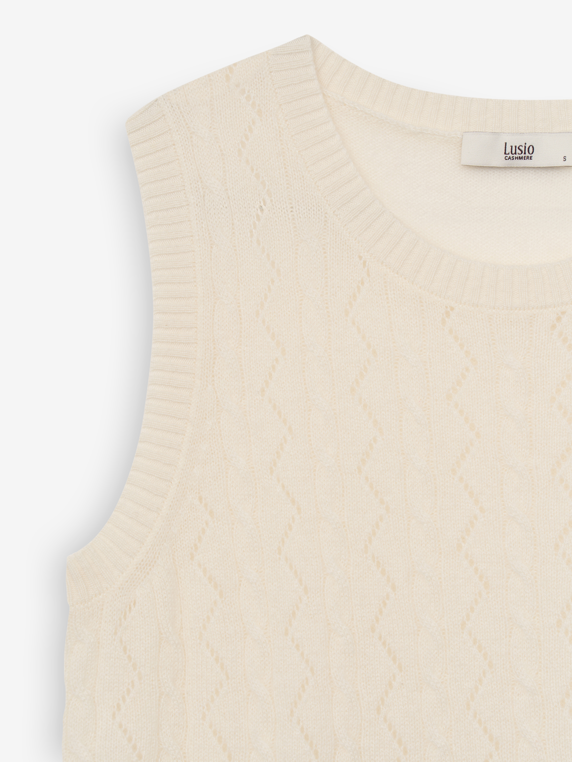 Жилет из 100% кашемира выполнен в лаконичном силуэте без рукавов. Полотно мягкое, теплое, с характерной для кашемира пластичностью и аккуратным рельефным узором, который создает спокойный визуальный рисунок. Горловина и проймы оформлены плотной резинкой, формирующей чистую линию верха и устойчивый контур. Нижний край также выполнен резинкой, благодаря чему изделие ложится ровно и сохраняет форму. Модель подходит для комплектов с рубашками и тонкими джемперами, а также работает как самостоятельный топ в более легких сочетаниях.