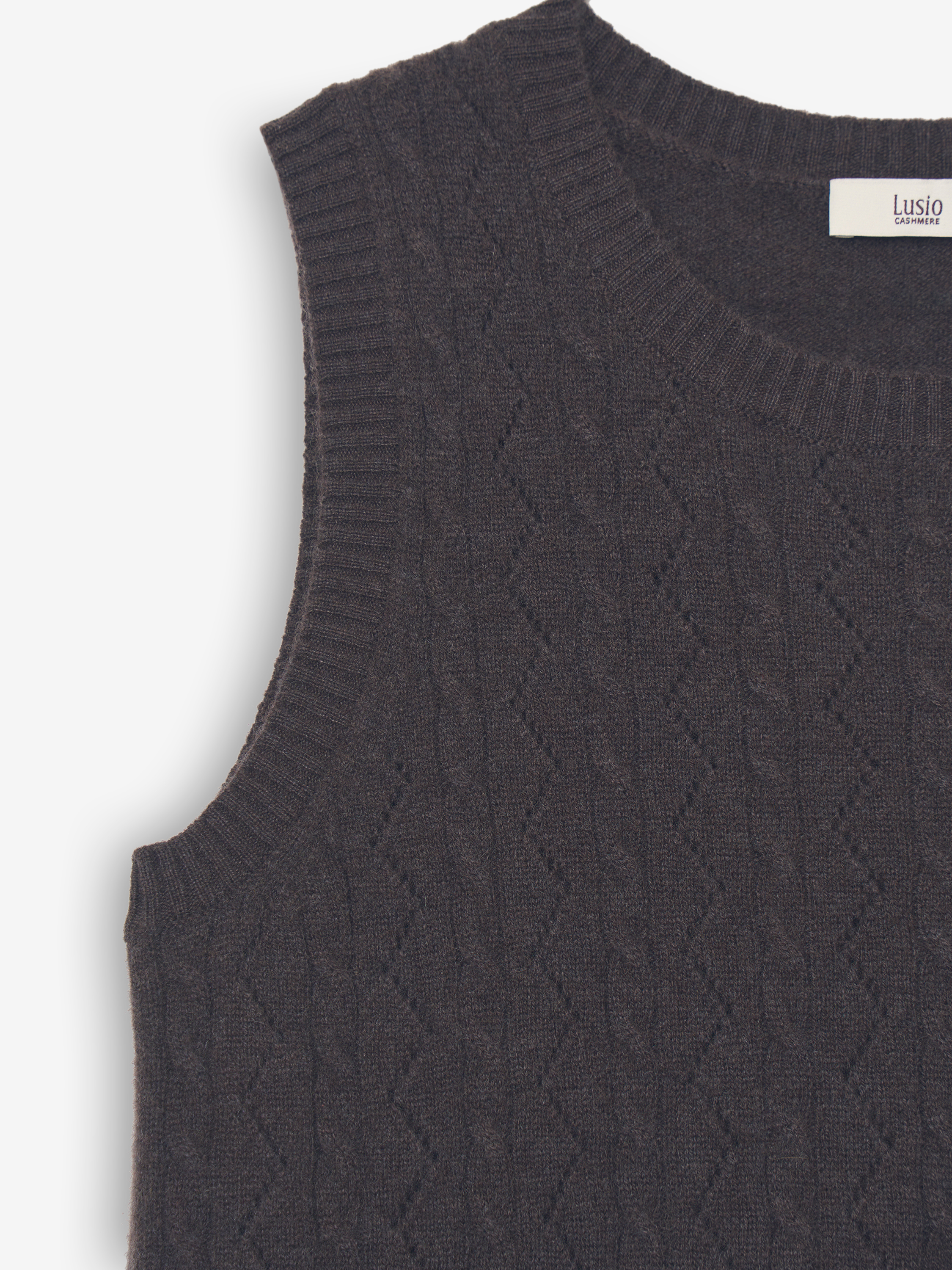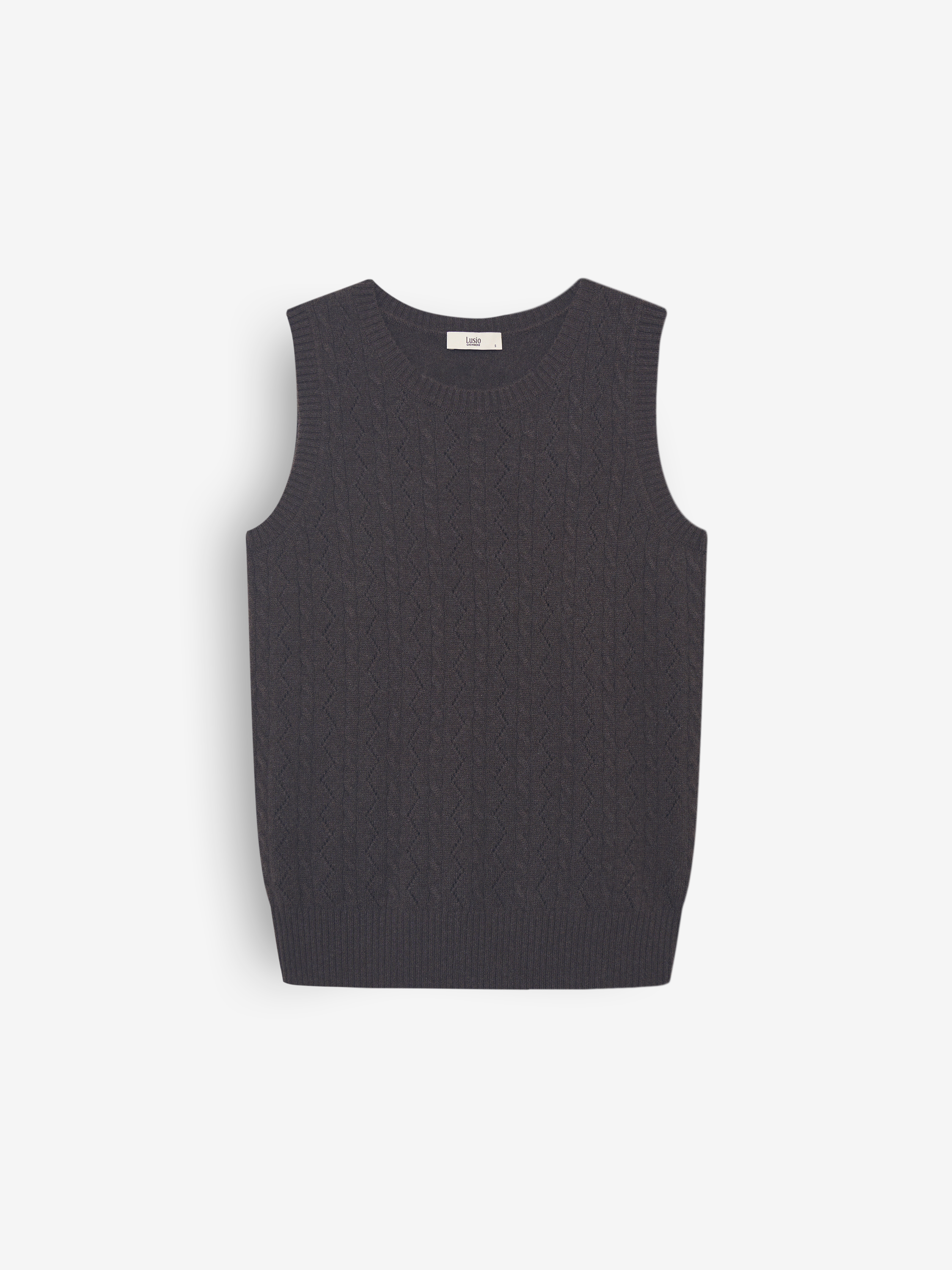Жилет из 100% кашемира выполнен в лаконичном силуэте без рукавов. Полотно мягкое, теплое, с характерной для кашемира пластичностью и аккуратным рельефным узором, который создает спокойный визуальный рисунок. Горловина и проймы оформлены плотной резинкой, формирующей чистую линию верха и устойчивый контур. Нижний край также выполнен резинкой, благодаря чему изделие ложится ровно и сохраняет форму. Модель подходит для комплектов с рубашками и тонкими джемперами, а также работает как самостоятельный топ в более легких сочетаниях.