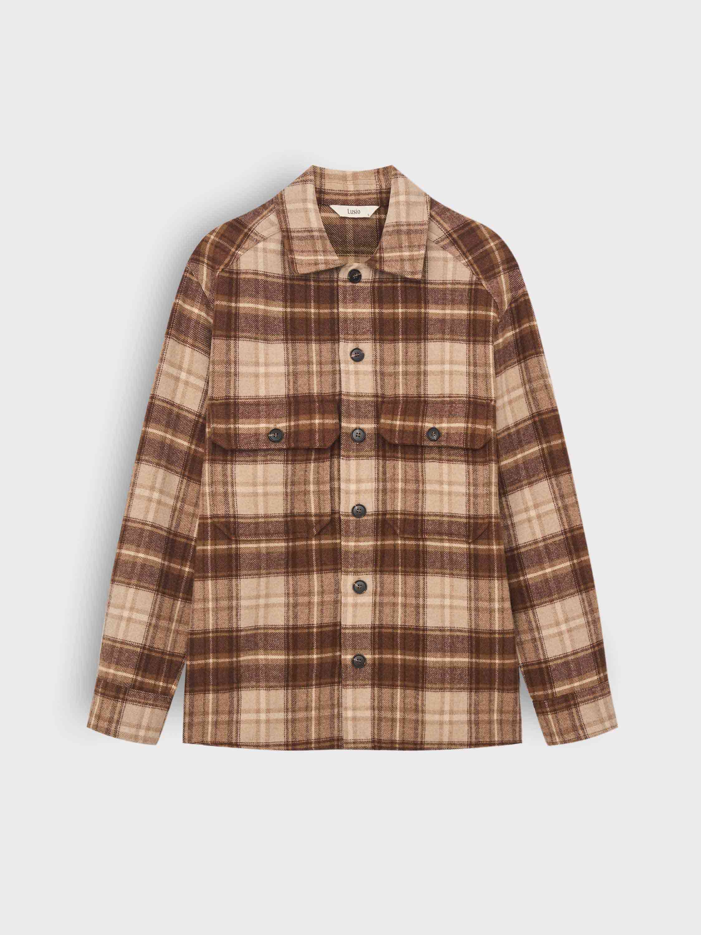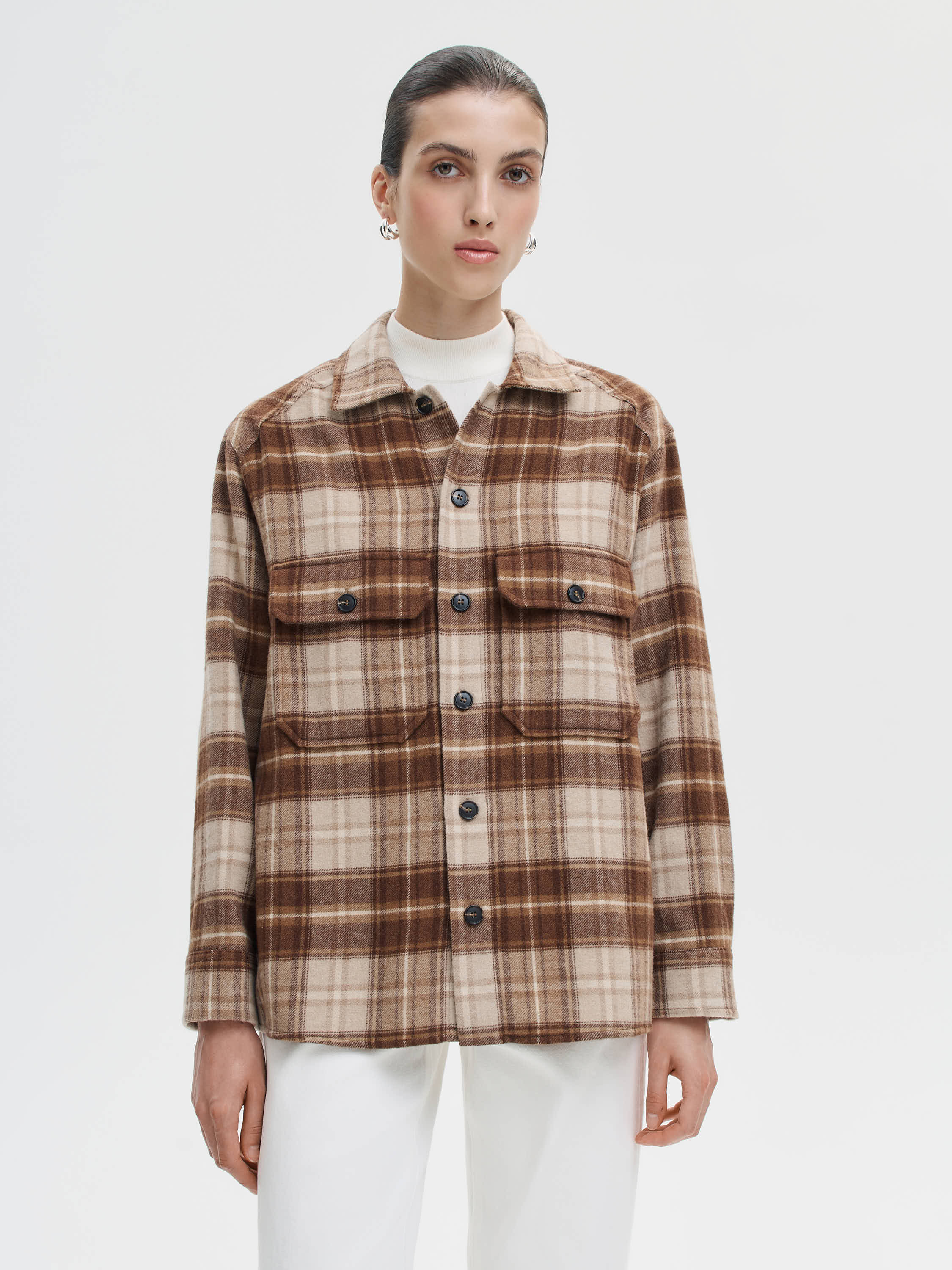 Рубашка прямого кроя с выразительным клетчатым рисунком. Материал — плотное смесовое полотно с добавлением шерсти — мягкое, теплое и устойчивое к износу. Вискоза в составе придают ткани гладкость, а полиэстер повышает практичность. Модель собрана на классических деталях: накладные карманы с клапанами, прямой подол и широкая планка на пуговицах. Посадка свободная, комфортная, подходит для соло-носки, и как верхний слой поверх тонкой водолазки или джемпера. Такой вариант работает как альтернатива легкой куртке — в городе, на выходные, в поездках.