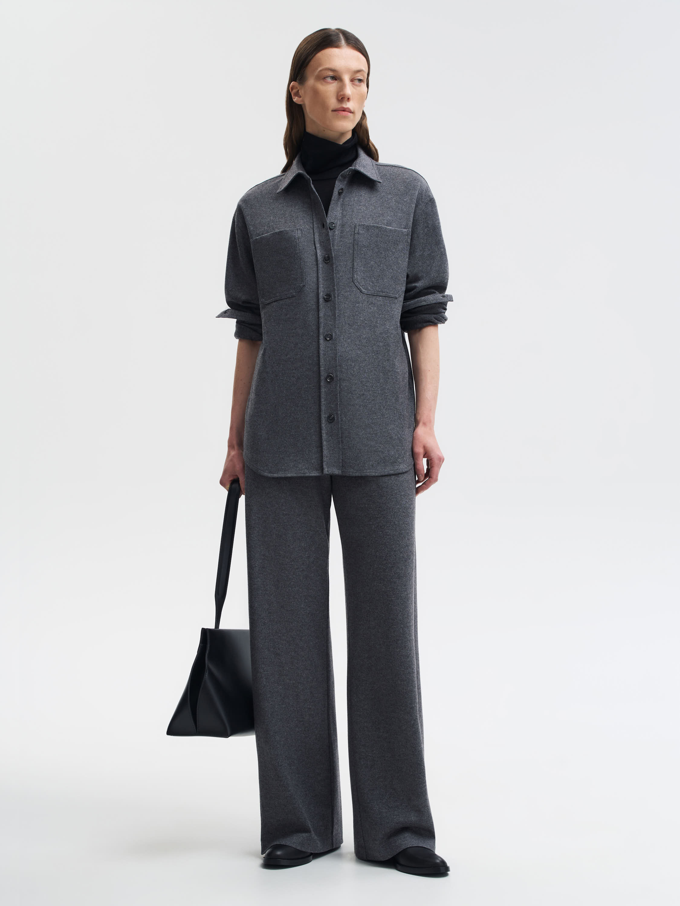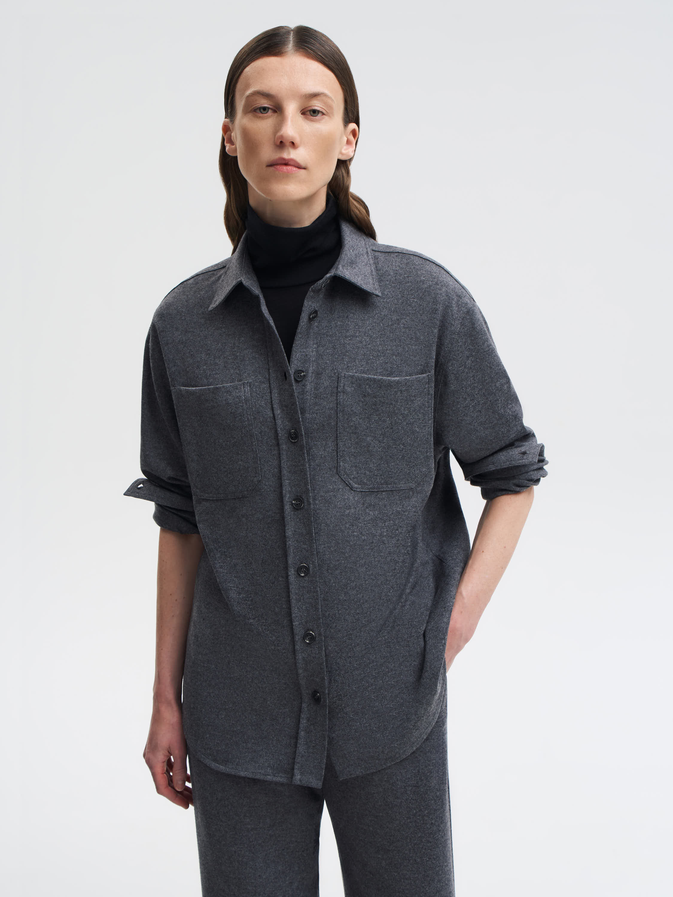 Рубашка выполнена из мягкой костюмной ткани с высоким содержанием шерсти. Материал приятен на ощупь, сохраняет тепло и форму, а небольшая доля нейлона добавляет износостойкости. Прямой крой с накладными карманами и плавной линией плеч делает модель универсальной — ее можно носить как самостоятельный слой или поверх футболки и водолазки. Продуманная структура ткани делает вещь комфортной в повседневной носке и подходящей для многослойных образов в холодный сезон.