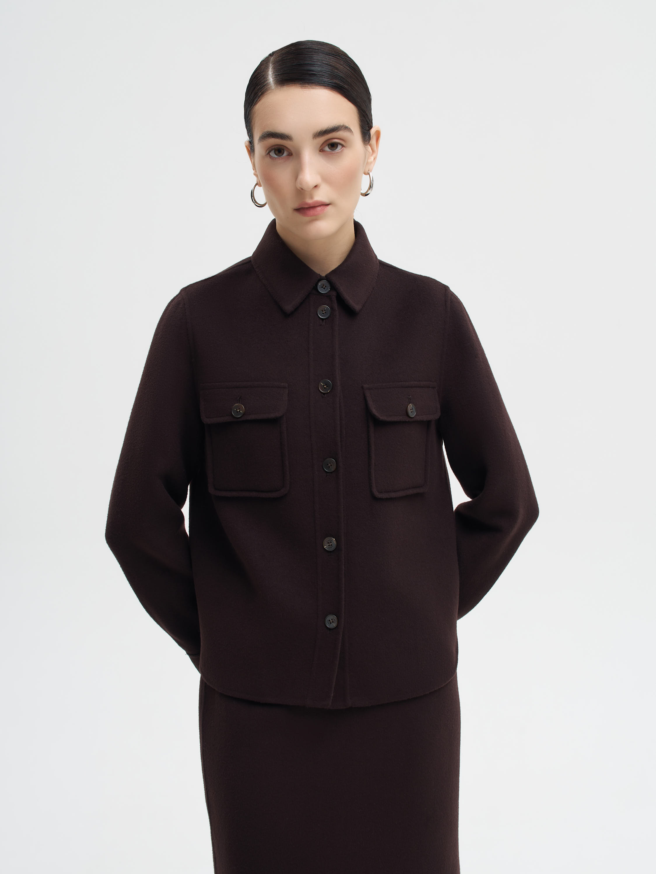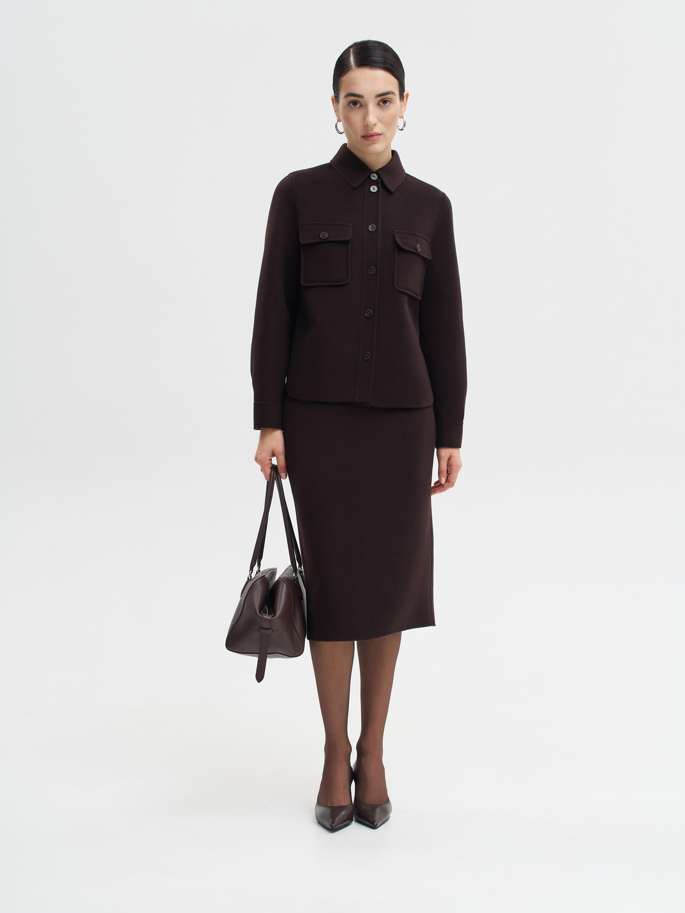Рубашка из чистой шерсти мериноса сочетает структуру классической модели с тактильной мягкостью трикотажа. Полотно тонкое, пластичное и теплое, комфортно при носке и хорошо держит форму. Прямой крой с аккуратным отложным воротником и застежкой на пуговицы дополнен накладными нагрудными карманами, подчеркивающими графичность силуэта. Длина до линии бедра делает модель универсальной: рубашку можно носить как самостоятельный верх с брюками или юбкой, а также использовать как легкий слой в сочетании с топами и водолазками.