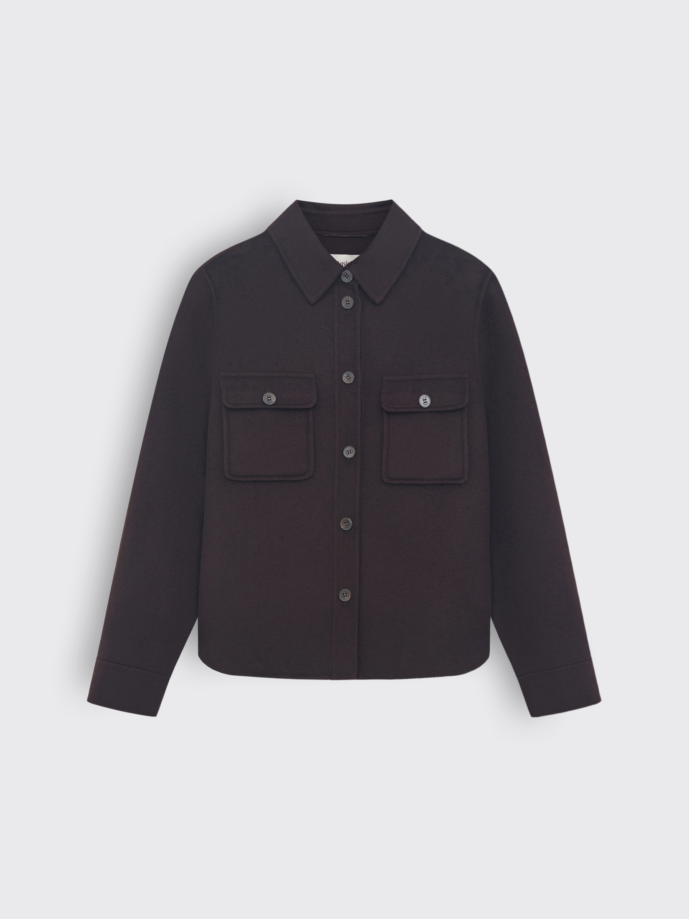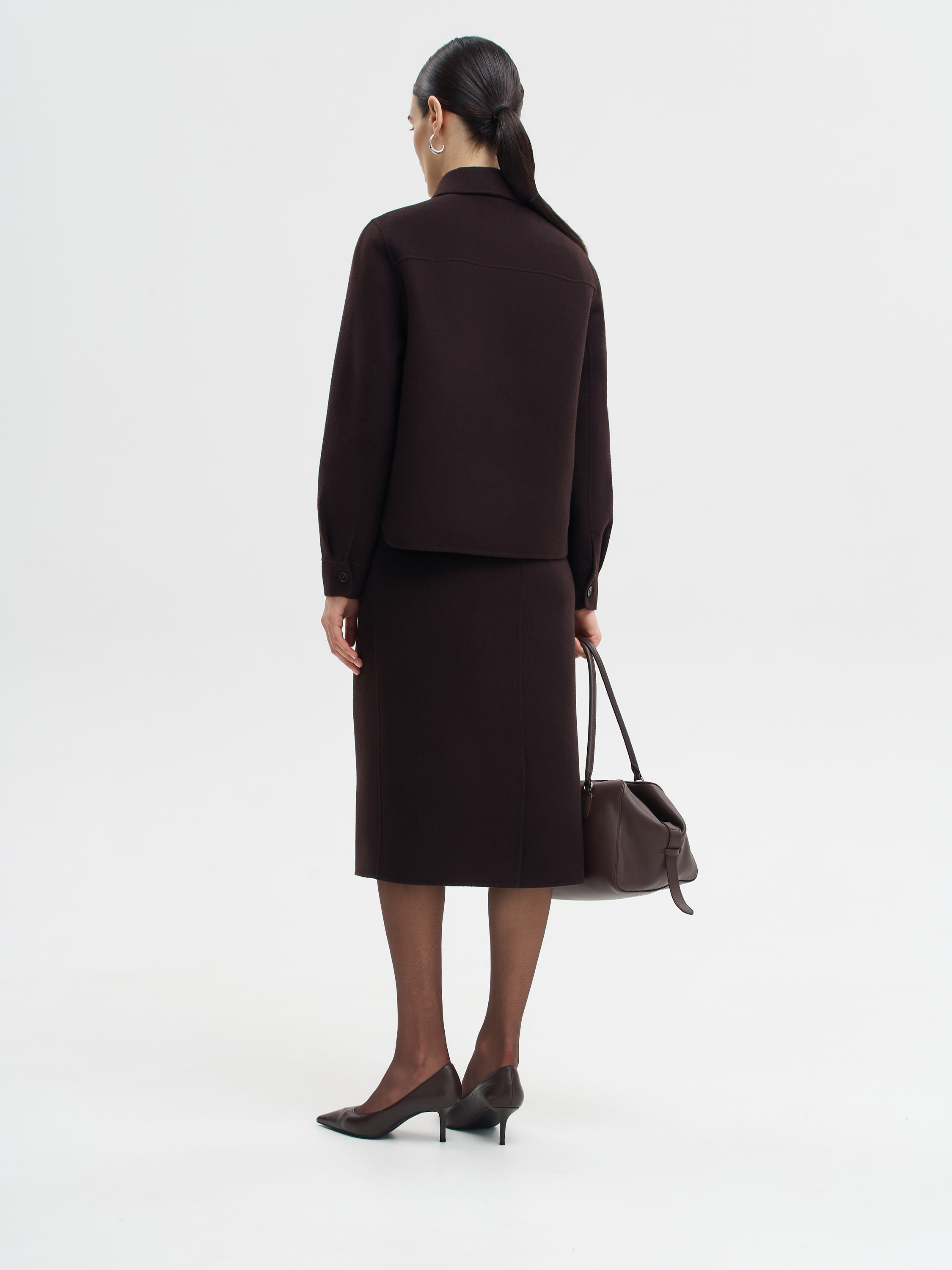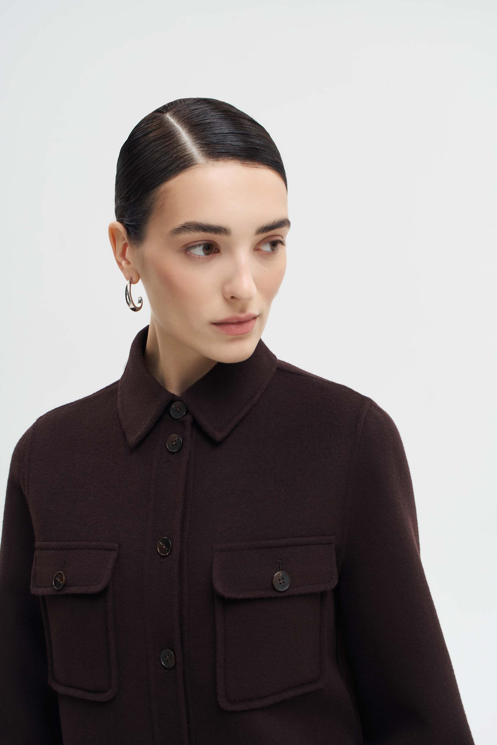 Рубашка из чистой шерсти мериноса сочетает структуру классической модели с тактильной мягкостью трикотажа. Полотно тонкое, пластичное и теплое, комфортно при носке и хорошо держит форму. Прямой крой с аккуратным отложным воротником и застежкой на пуговицы дополнен накладными нагрудными карманами, подчеркивающими графичность силуэта. Длина до линии бедра делает модель универсальной: рубашку можно носить как самостоятельный верх с брюками или юбкой, а также использовать как легкий слой в сочетании с топами и водолазками.