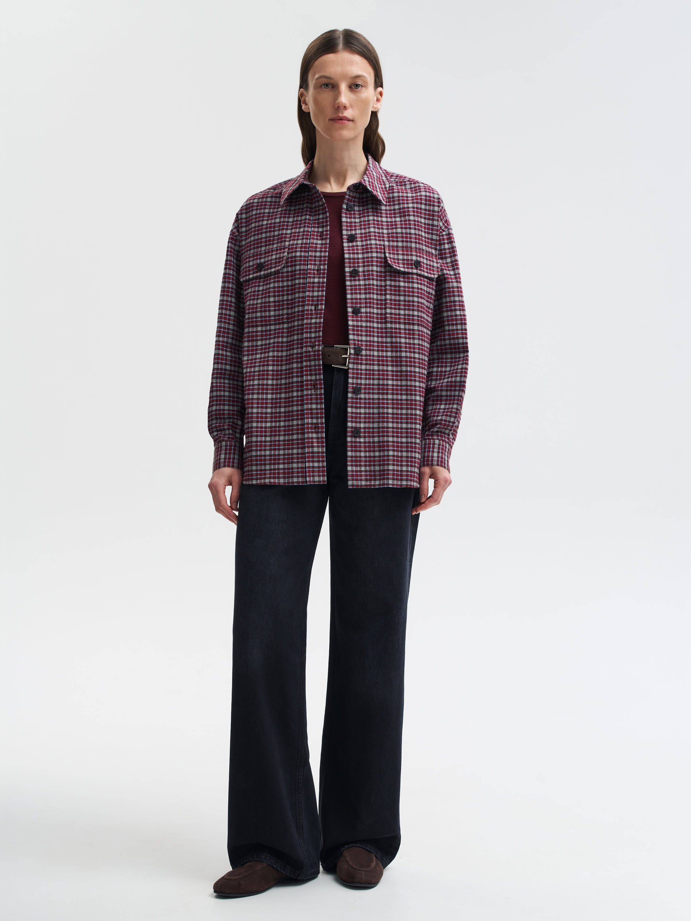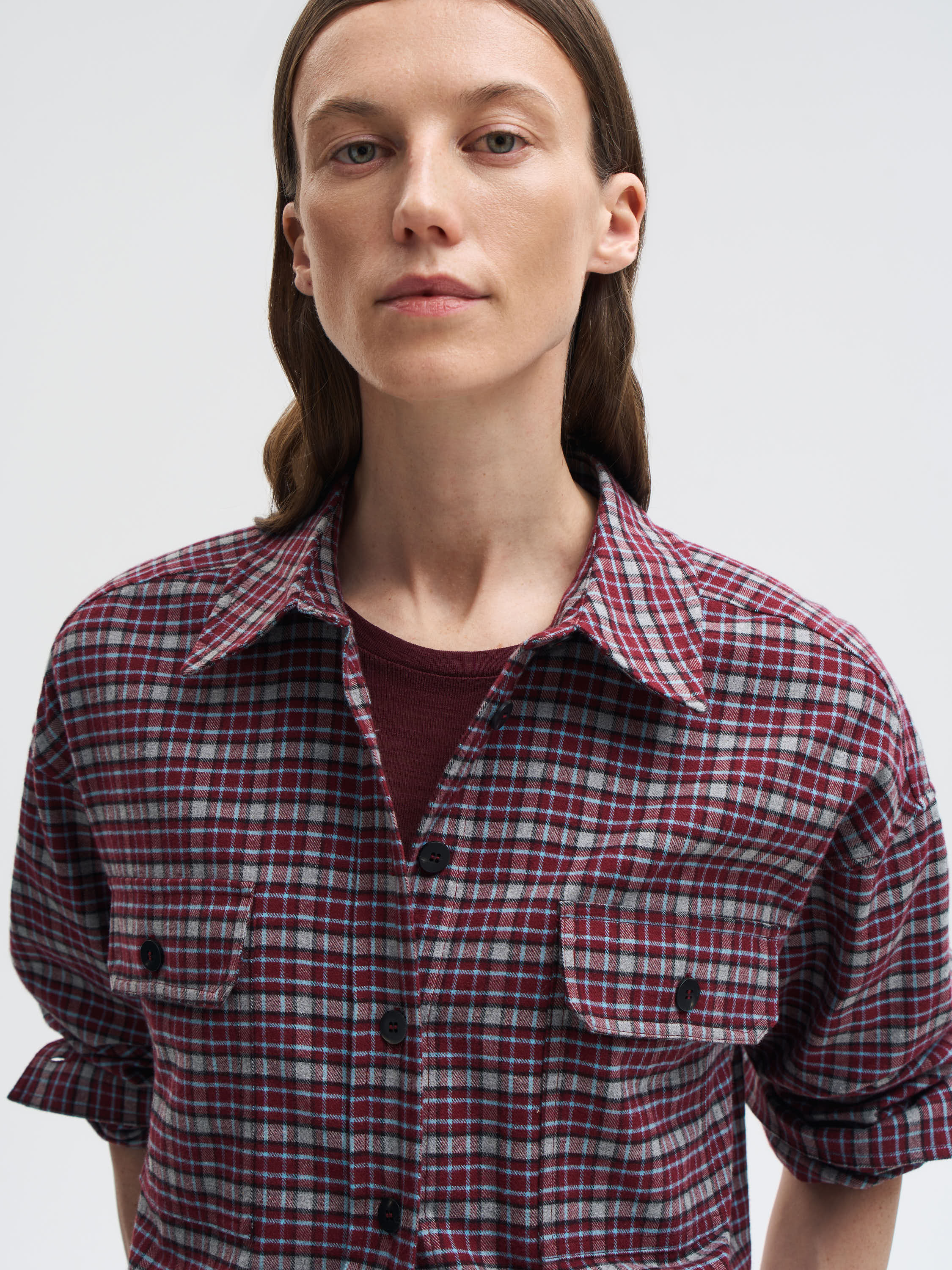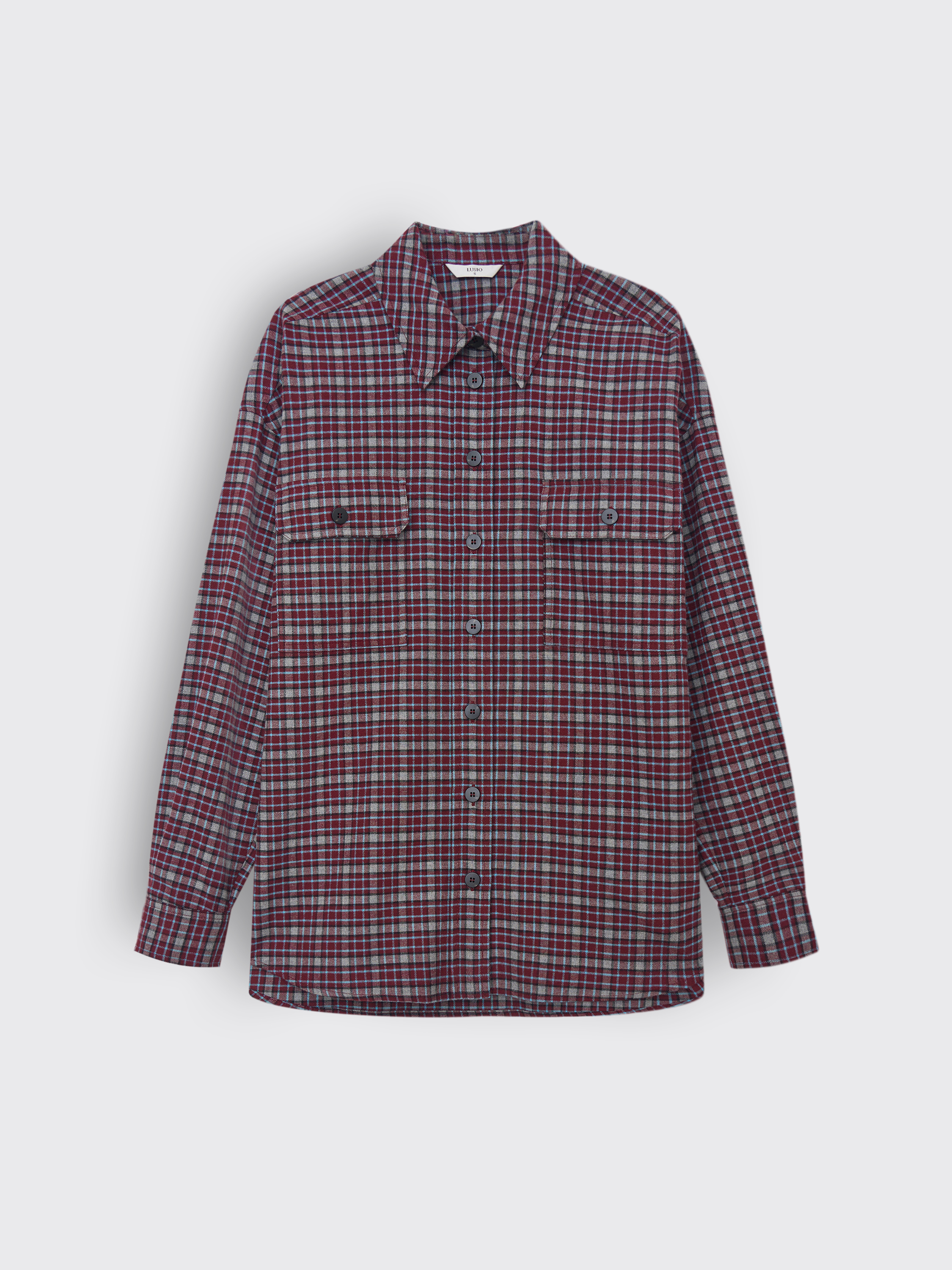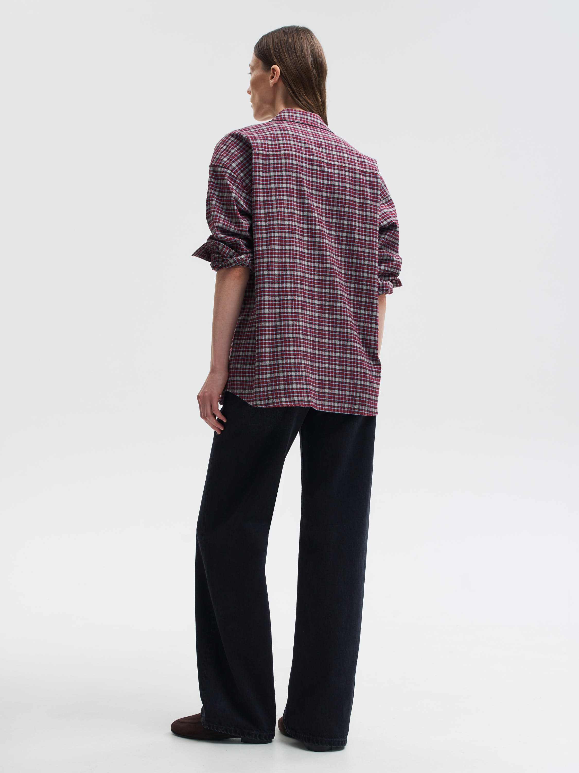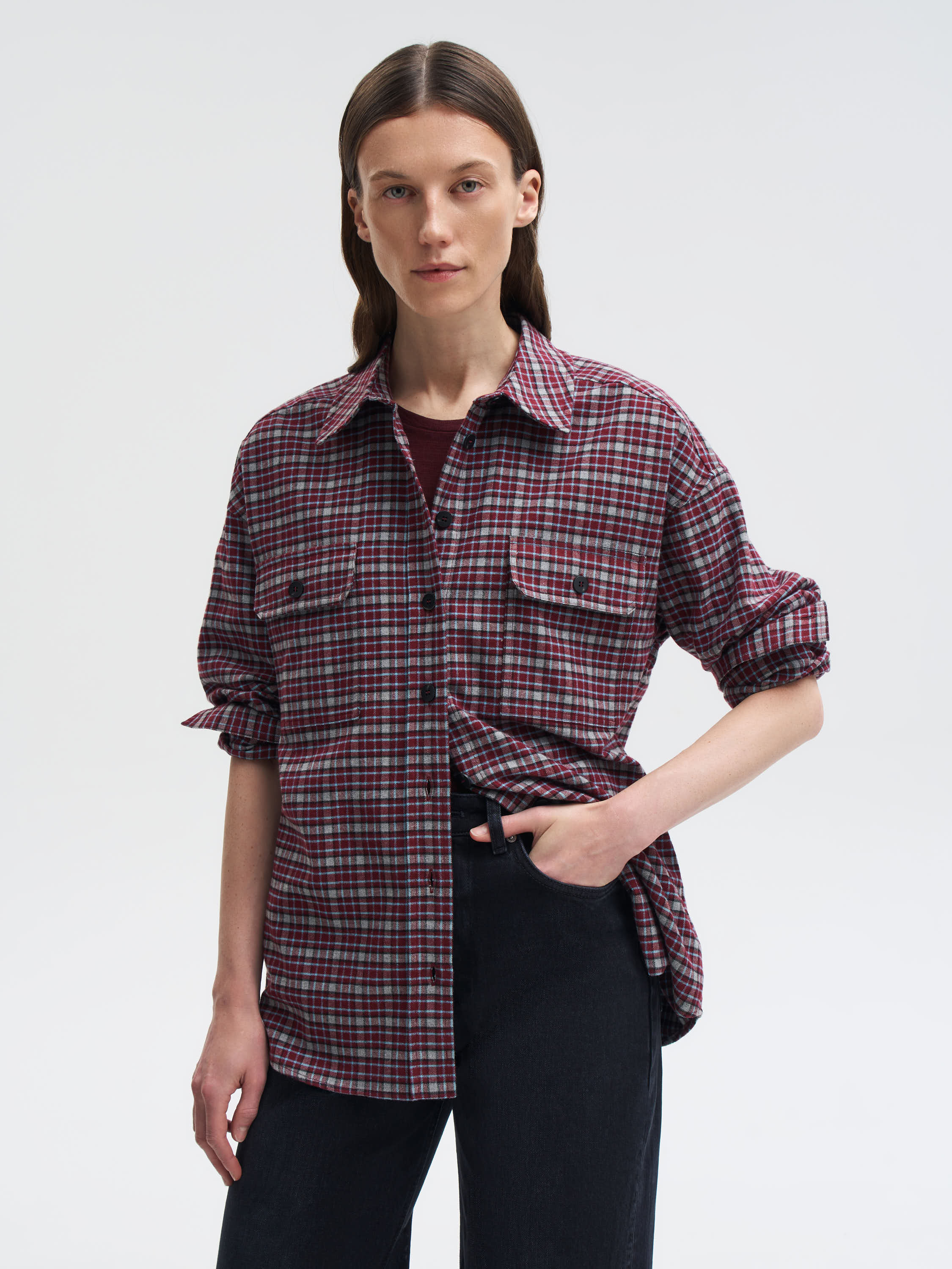Рубашка выполнена из мягкого хлопка — натуральный материал дышит, приятен к телу и комфортен в течение дня. Клетчатый рисунок в бордово-серой гамме придает модели графичность и характер, сохраняя при этом универсальность. Крой прямой, с классическим воротником, накладными карманами и манжетами на пуговицах. Благодаря плотности ткани рубашку можно носить как самостоятельный элемент или как легкую накидку поверх футболки и водолазки.