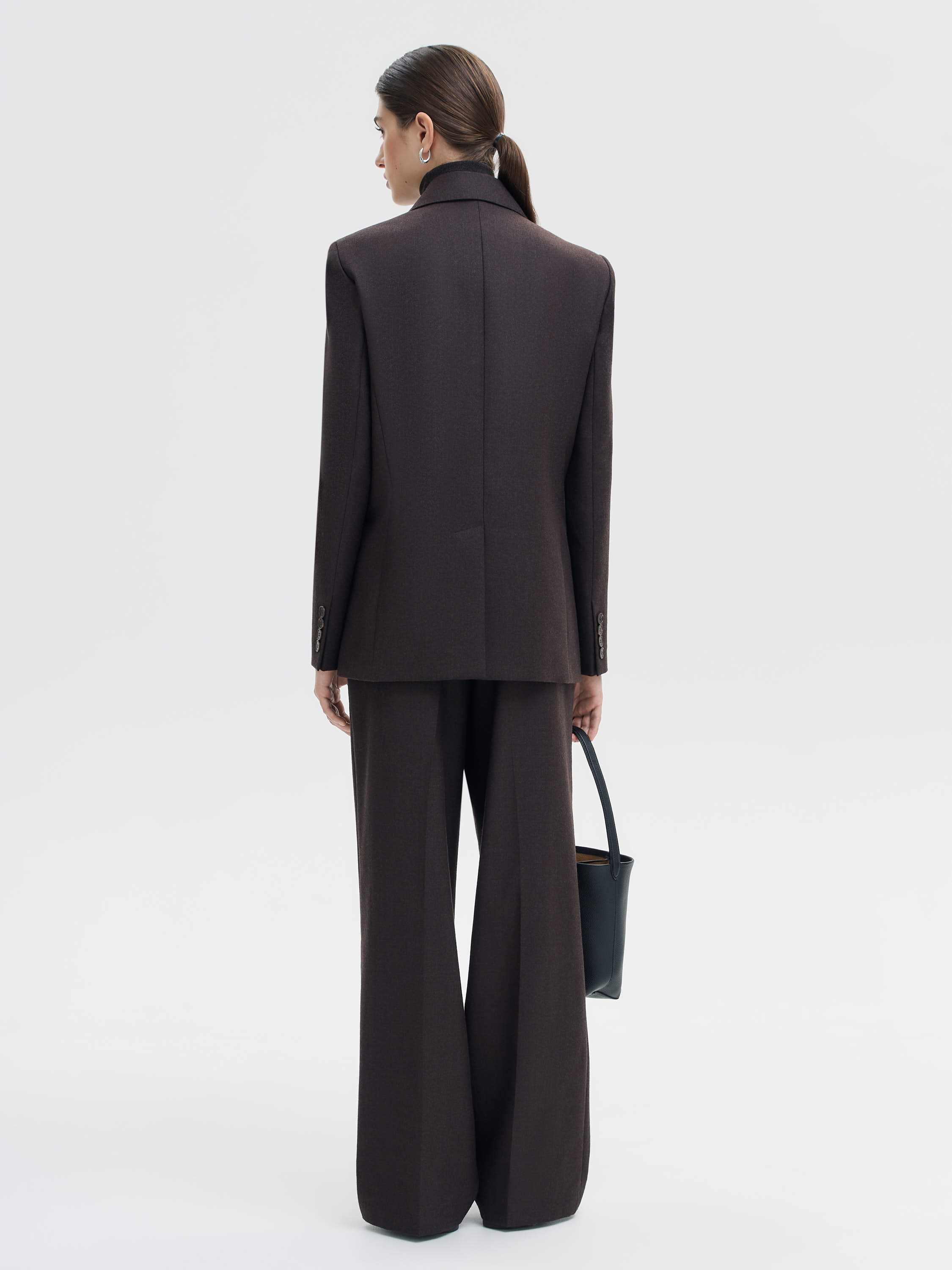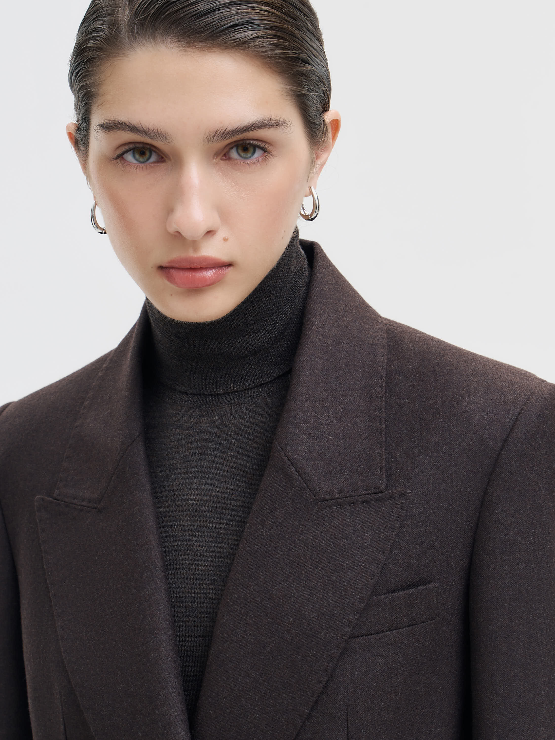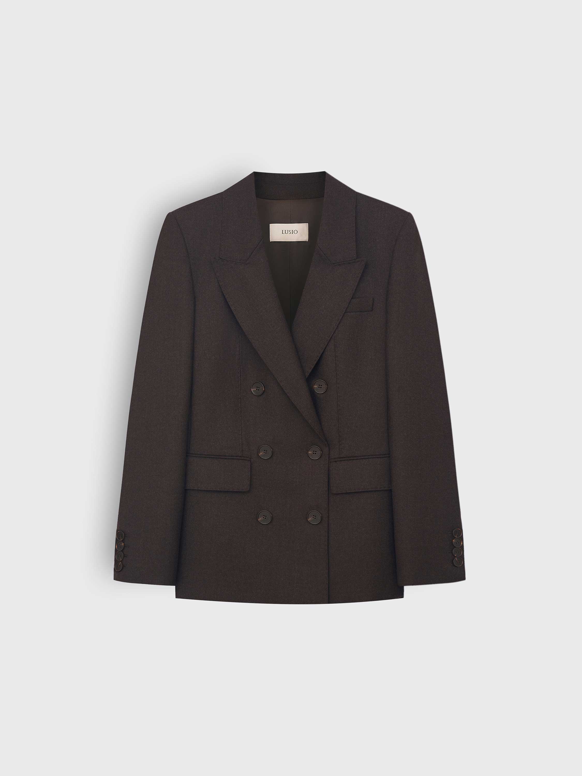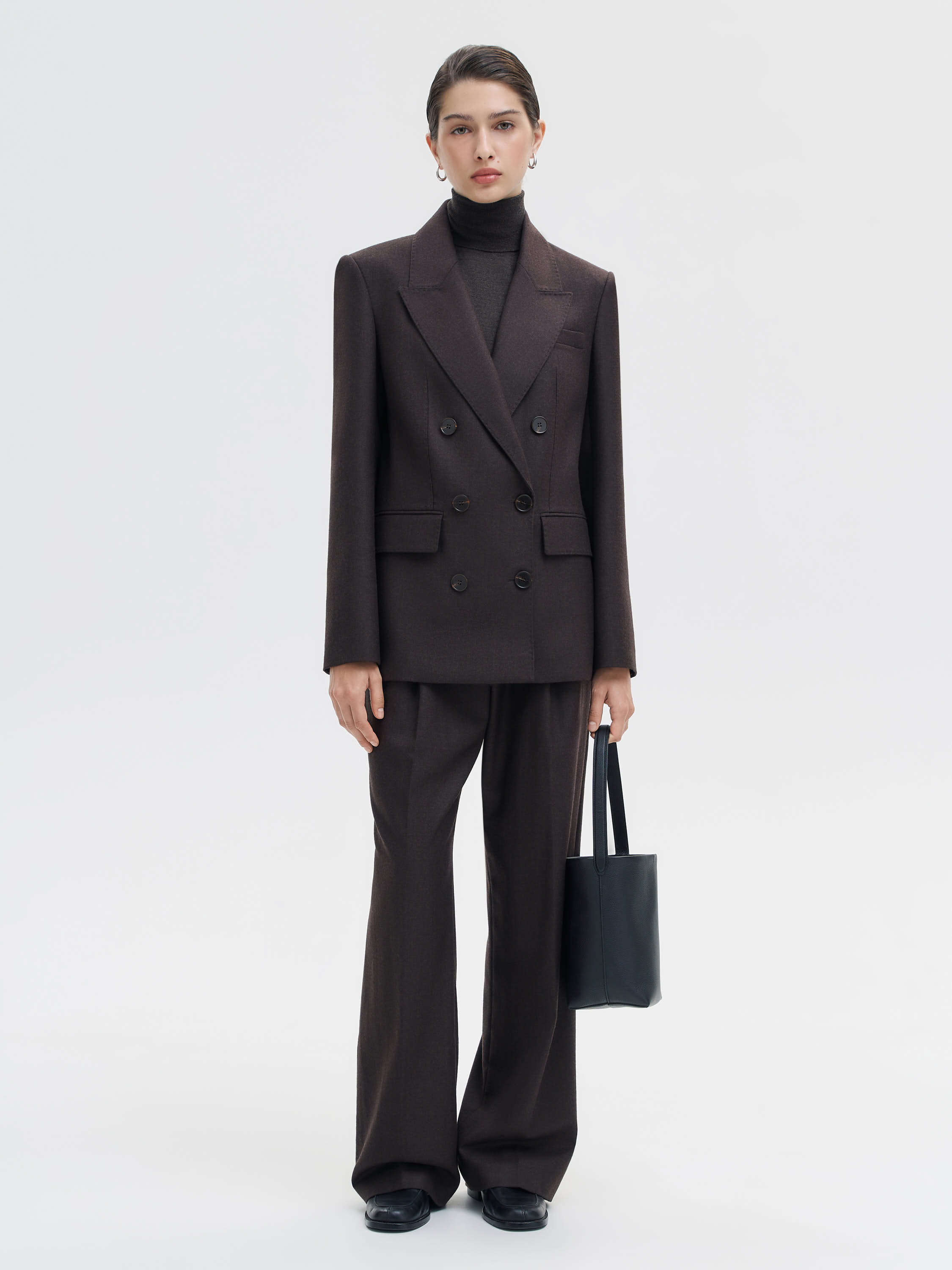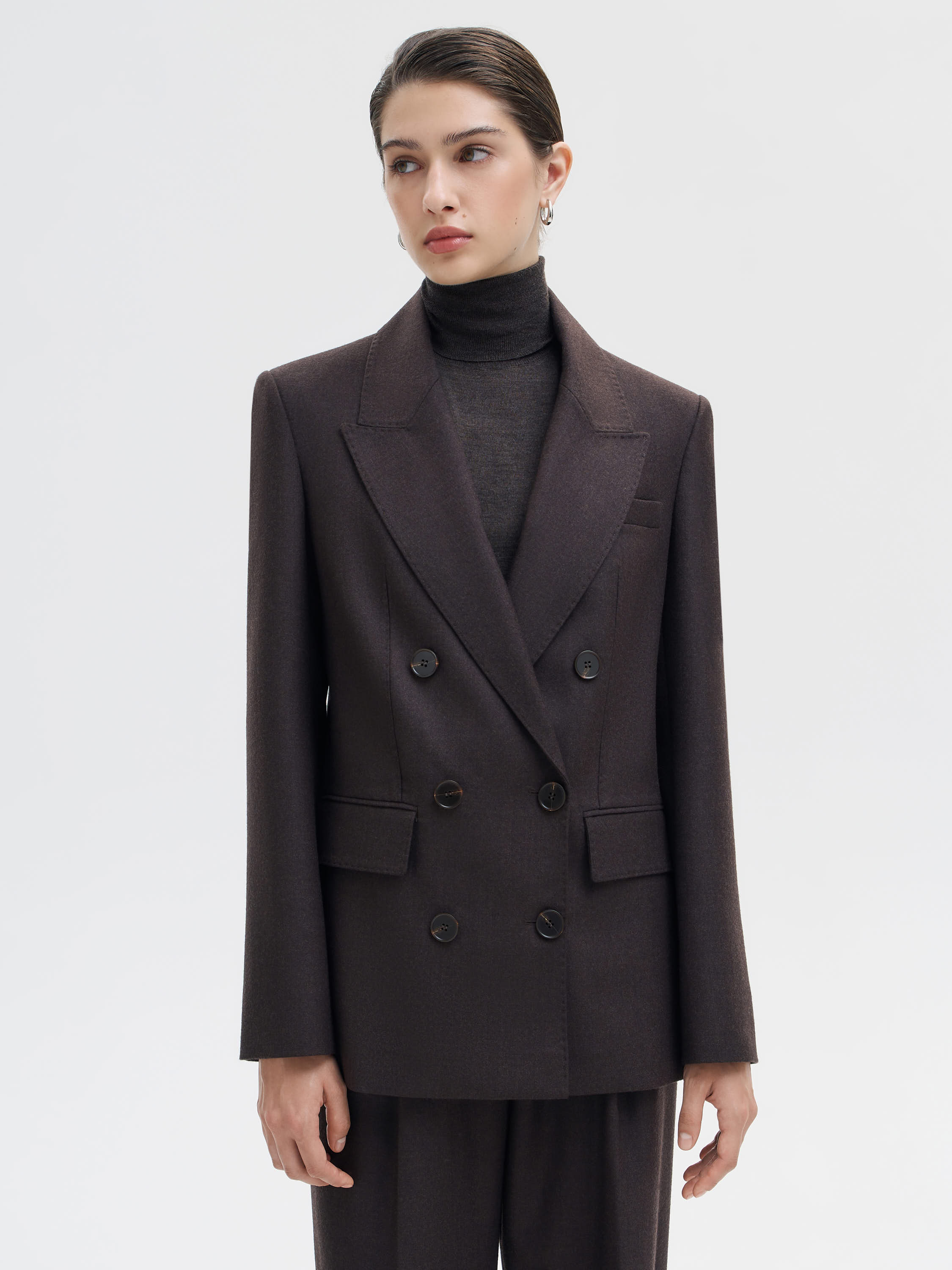 Двубортный жакет из 100% шерсти в глубокий темно-коричневый оттенок. Плотное костюмное полотно держит форму, дышит и комфортно ощущается в течение дня. Крой прямой, с акцентом на плечи и четкой линией силуэта. Узкие лацканы, прорезной нагрудный карман и клапаны на боковых карманах поддерживают строгую архитектуру модели. Застежка на две параллельные линии пуговиц придает образу собранность и завершенность. Жакет легко интегрируется в деловые комплекты с брюками или юбкой, а также работает в паре с джинсами и трикотажем в более расслабленном стиле.
